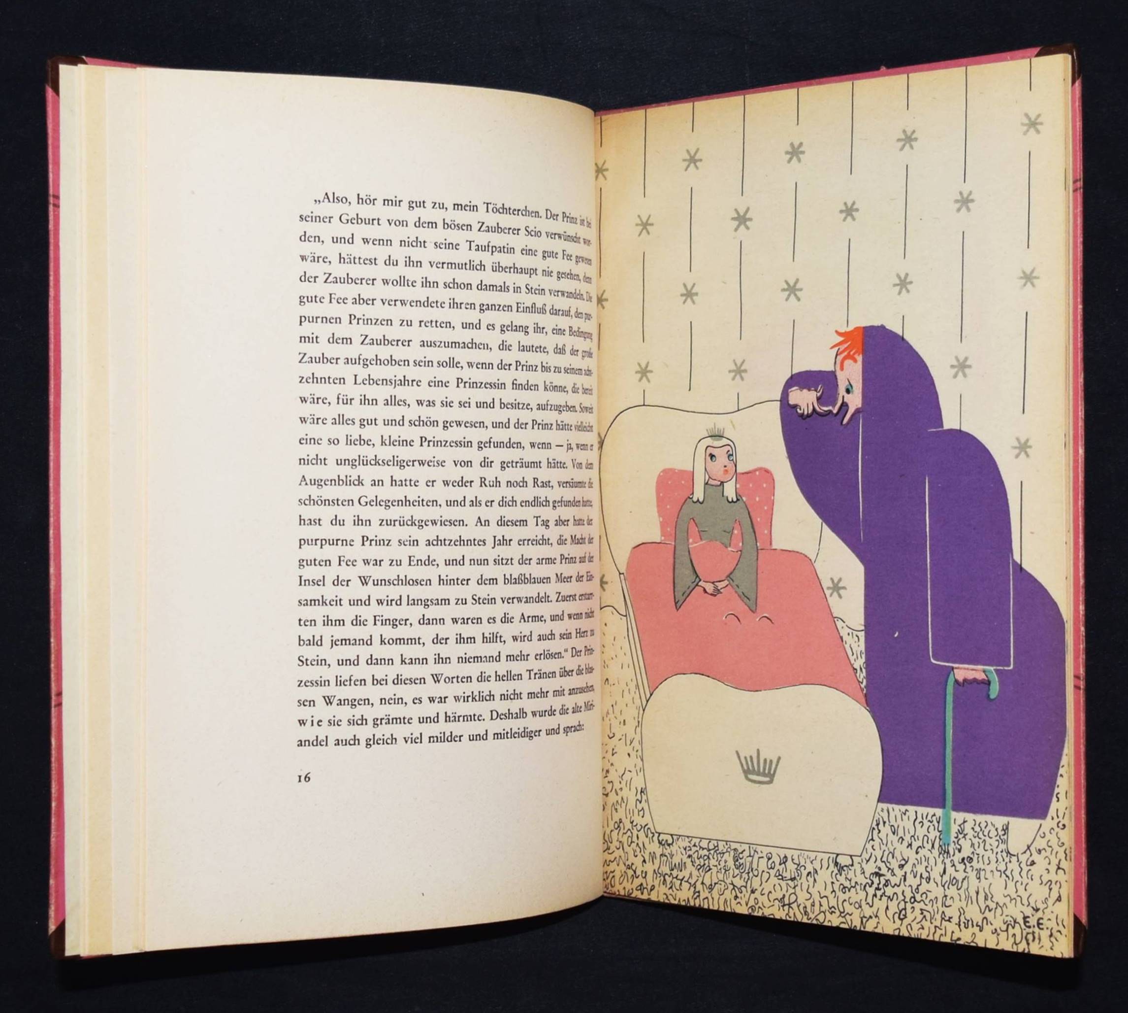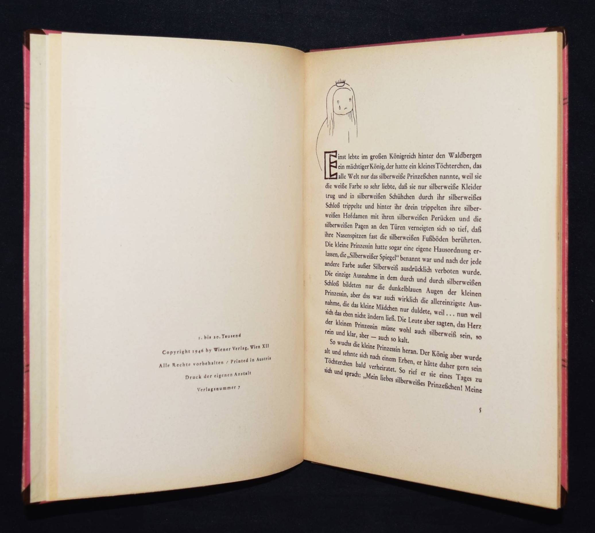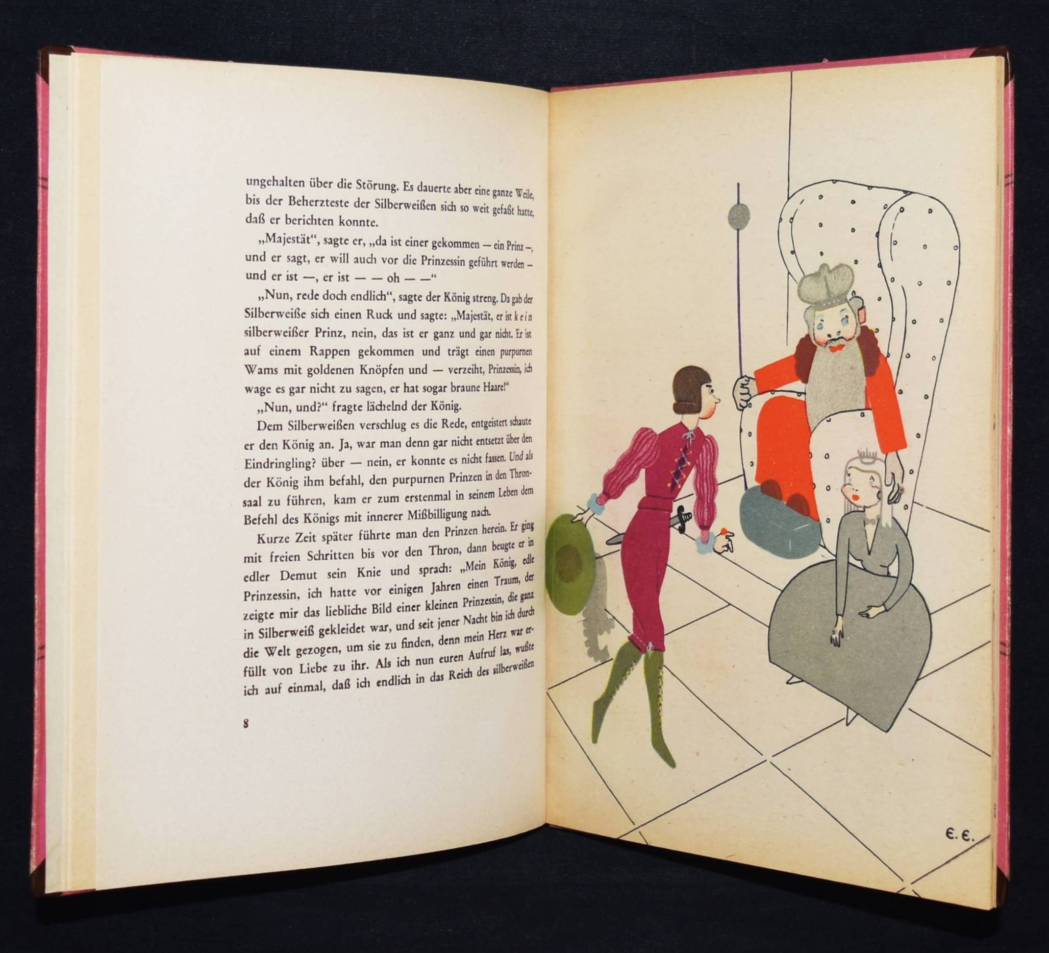 Nebehay, Steppa. Prinzessin Silberweiss. Wien, Wiener Verlag (1946). 4°. 36, (5) S. mit 8 farblithogr. Tafeln u. 2 Illustrationen im Text von Ef(timios) Eftimiadis. OHldr. mit silberfarb. Deckeltitel. Vgl. Muck II, 4900 (2. Ausgabe von 1948). – Erste Ausgabe des seltenen Wiener Märchenbilderbuchs mit außergewöhnlichen Illustrationen. – Mit eigenhändiger Widmung von S. Nebehay. – Die Autorin (1923-?) ist die Tochter des legendären Kunsthändlers Gustav Nebehay und die Schwester der bekannten Wiener Antiquare Christian M. und Ingo Nebehay.– Deckel etwas berieben, gutes Exemplar im seltenen Halbledereinband.
