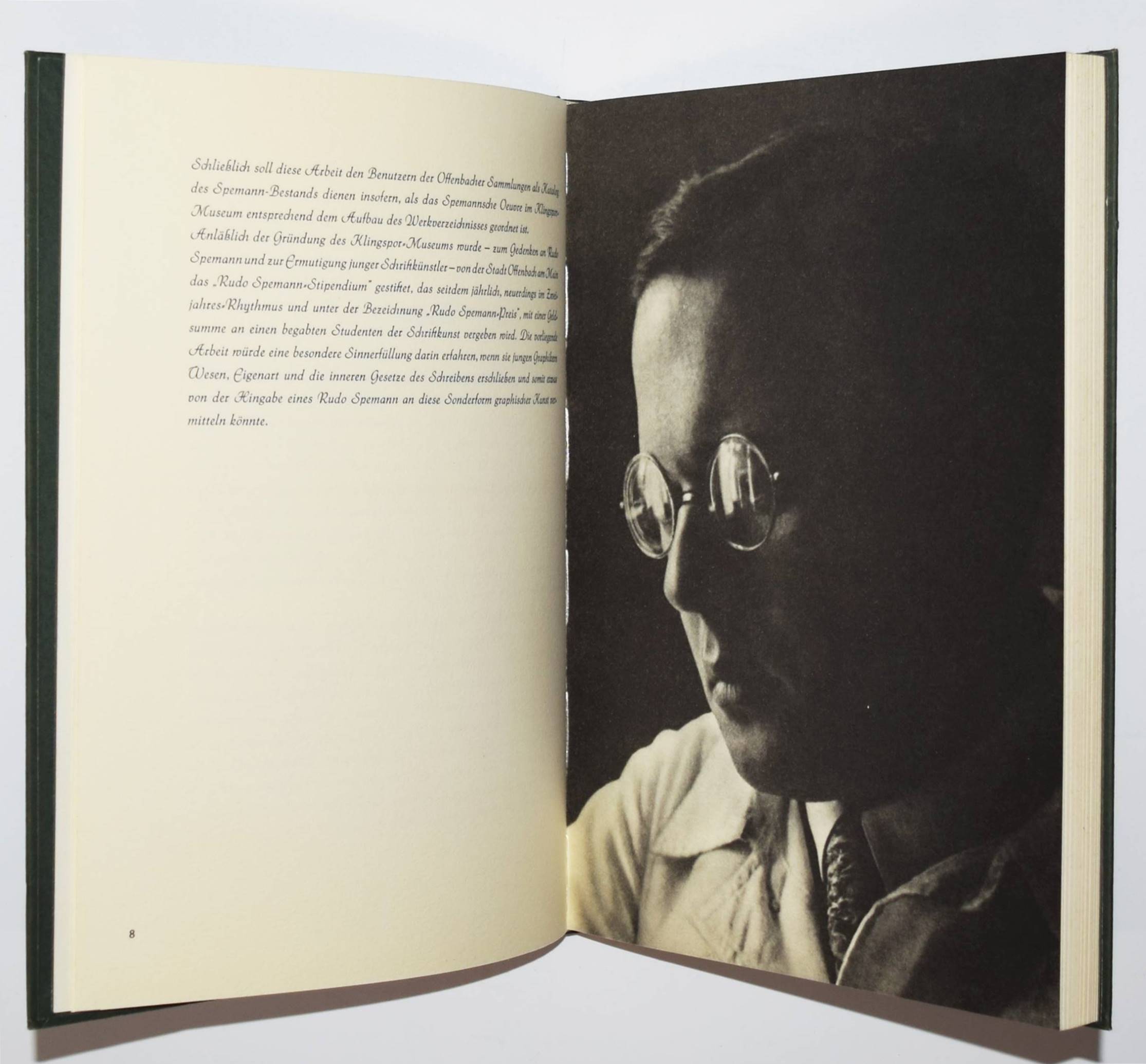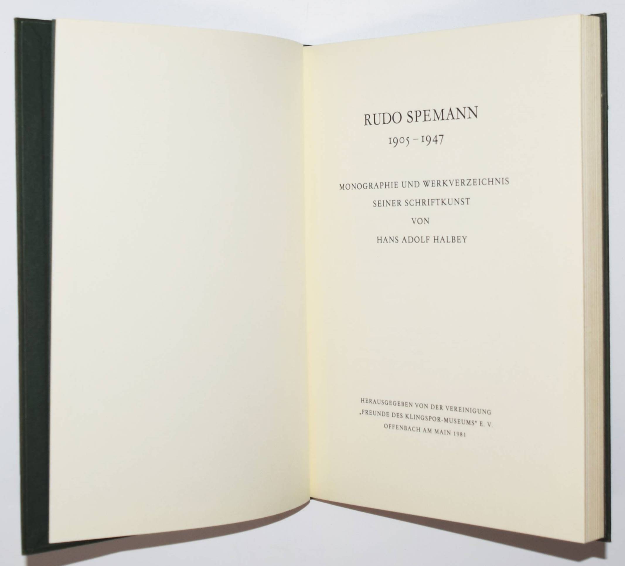 Halbey, Hans Adolf. Rudo Spemann, 1905-1947. Monographie und Werkverzeichnis seiner Schriftkunst. Offenbach am Main, Die Vereinigung „Freunde des Klingspor-Museums“ 1981. 4°. 137 S., [1] Bl. mit teils farb. Abb. und Schriftmustern. OPbd. Sehr gutes Exemplar.