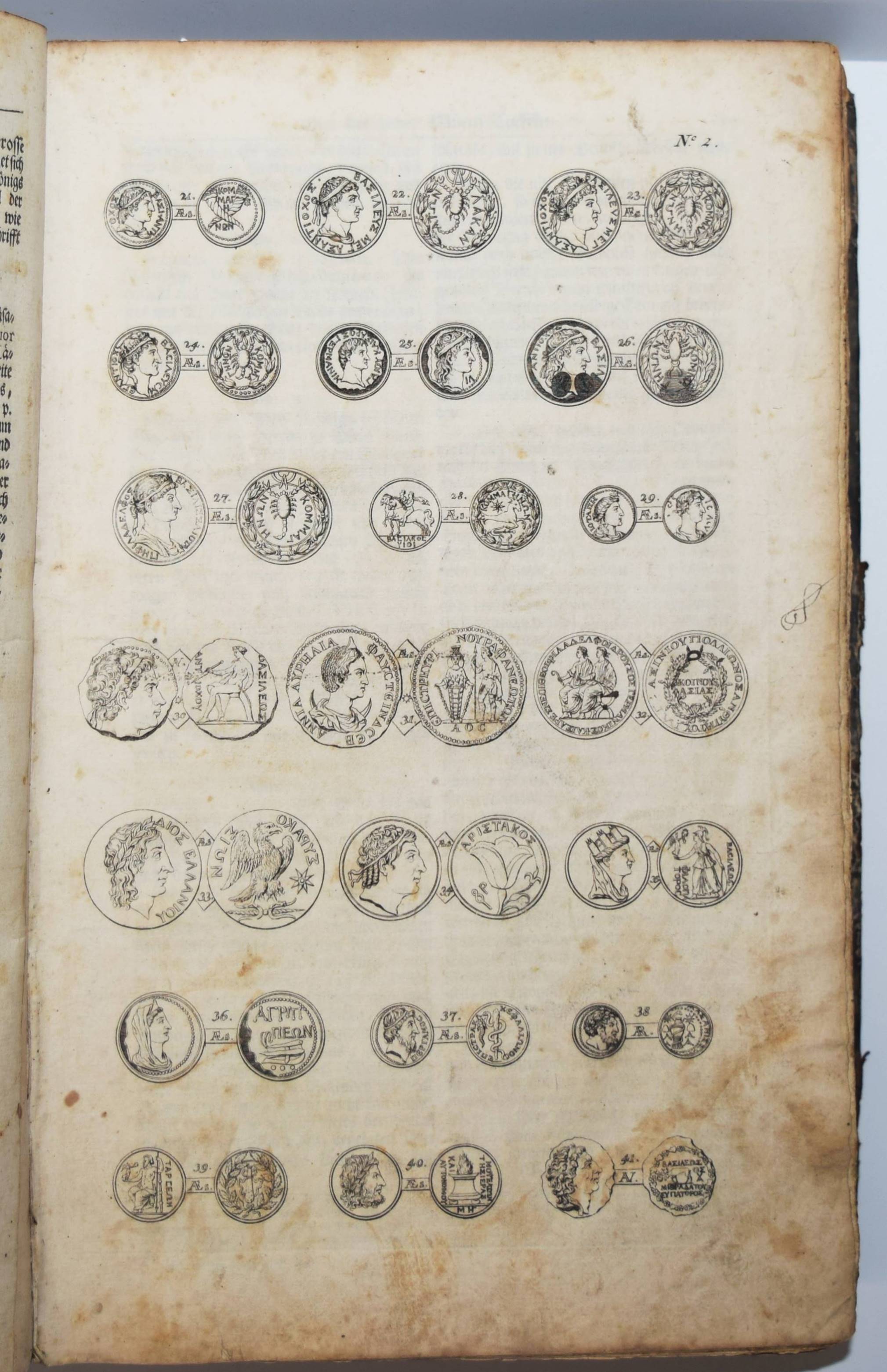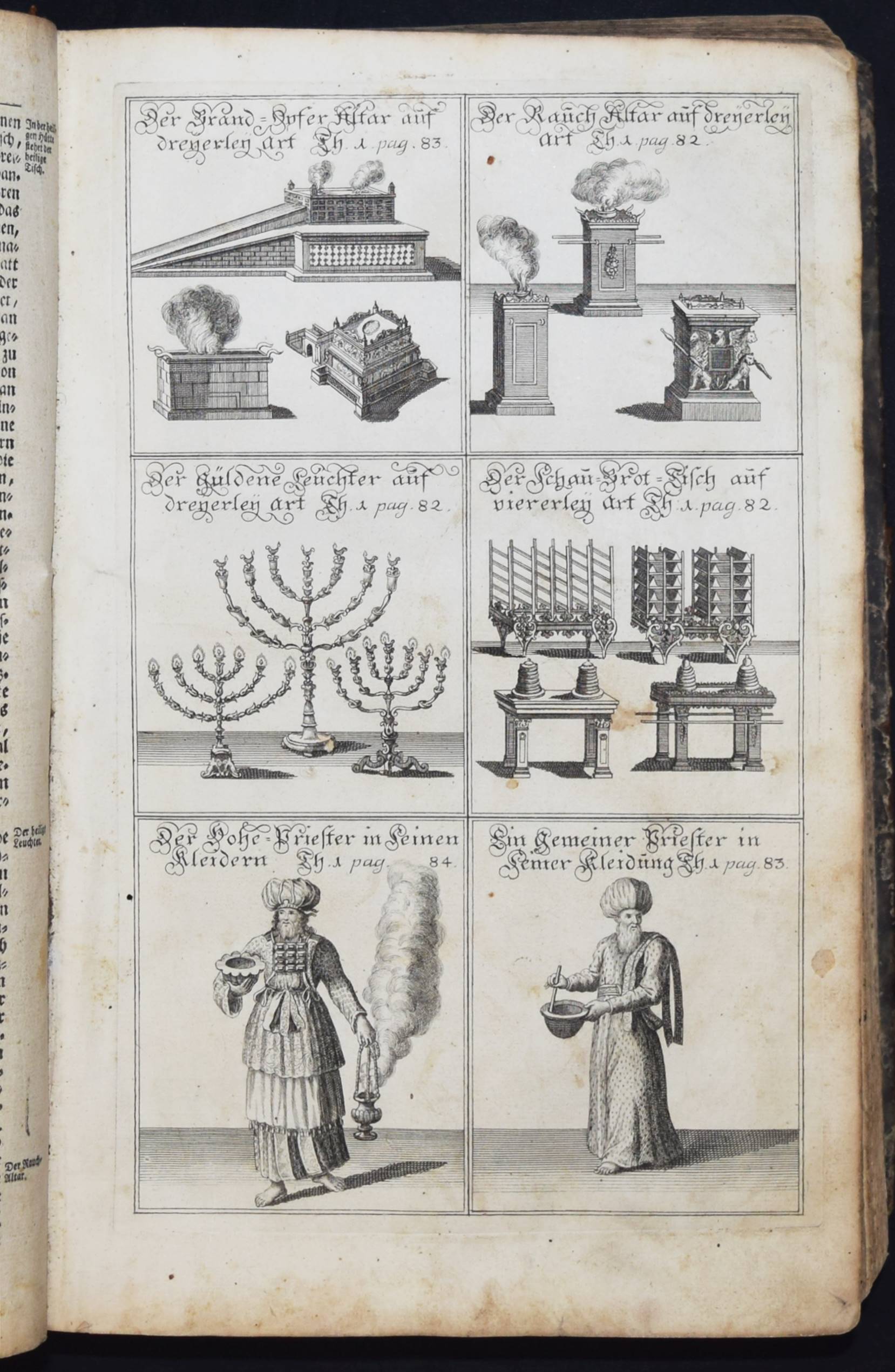 Flavius, Josephus. Sämmtliche Wercke. Als Zwantzig Bücher von den alten jüdischen Geschichten, Eines von seinem Leben, Zwey von dem alten Herkommen der Juden wider Apionem Grammaticum, und Eines von dem Märtyrer Tode der Maccabäer, Nebst einem Ueberbleibsel Der Rede Josphi an die Griechen von dem Ort, wo sich die abgeschiedene Seelen aufhalten, und der Auferstehung der Todten. … Mit vielen Anmerckungen, wie auch accuraten Registern versehen und ausgefertiget von Johann Friedrich Cotta. 3 Teile in 1 Band. Tübingen, J. G. Cotta 1735. Folio (37 x 24 cm.). [3] Bl., 28, 20, 736, 212, 178, 12, 34 S. mit Titel in Rot u. Schwarz, gestoch. Frontispiz, 1 gefalt. gestoch. Karte u. 8 (1 mehrfach gefalt.) Kupfertafeln. Halblederband des 19. Jahrhunderts. Graesse III, 482. VD 18, 14608499. Vgl. Fürst II, 122. – Erste Ausgabe der Übersetzung von Johann Friedrich Cotta (1764-1832). – Die schönen Kupfer zeigen neben der meist fehlenden Karte von Palästina, Jerusalem mit dem Salomonischen Tempel, die Stiftshütte, die schwebenden Gärten von Babylon, Elefanten, Schleuderer und Schildträger u. a. – Einband stärker berieben und bestoßen, durchgehend etwas fleckig, die Falttafel mit hinterlegten Ein- und Ausrissen im Rand, die Karte alt aufgezogen, insgesamt noch ordentliches Exemplar.