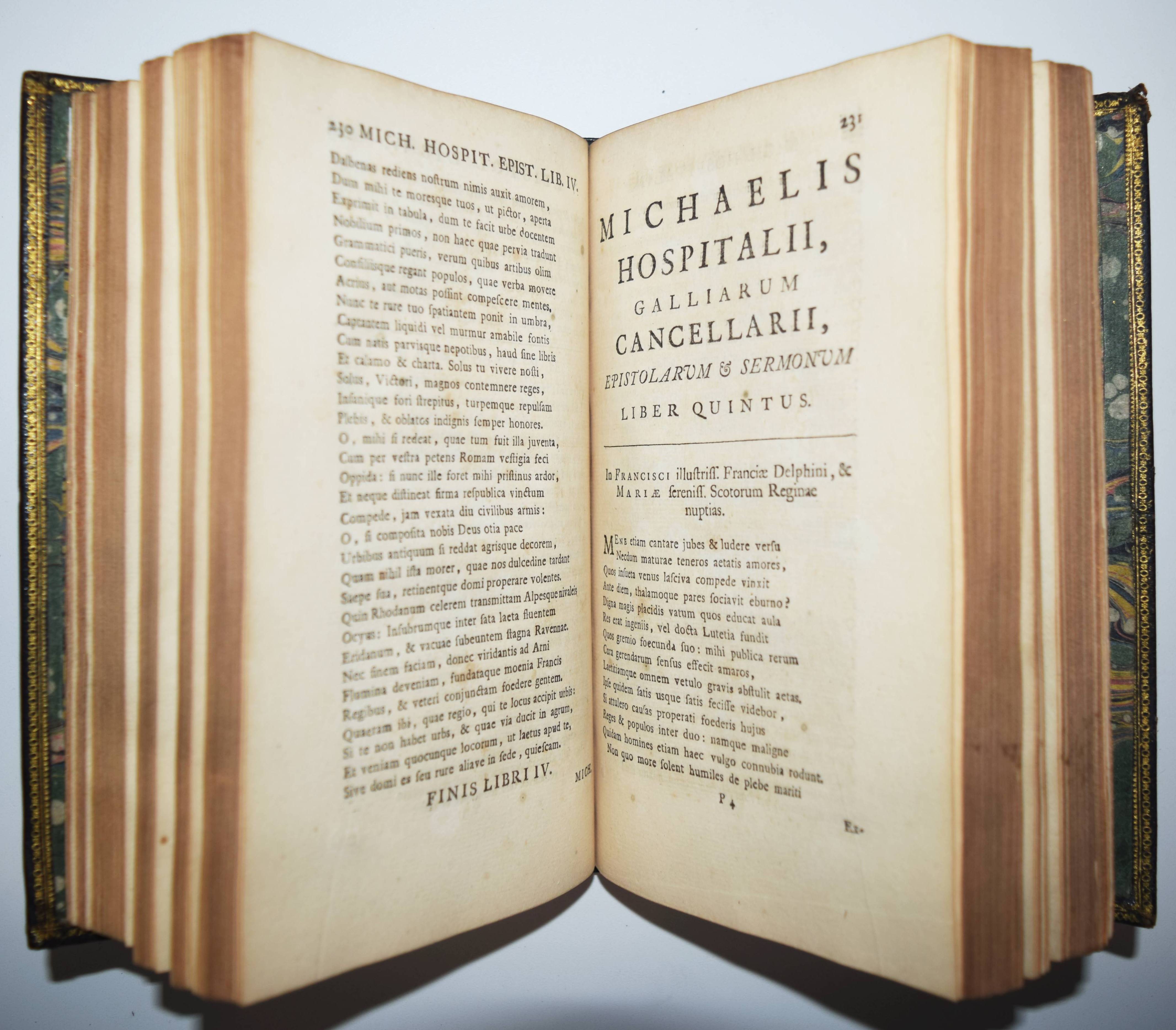 L’Hospital, Michel de. Carmina. Editio a prioribus diversa & auctior. 2 Teile in 1 Band. Amstelaedami (Amsterdam), B. Lakeman 1732. 8°. [10] Bl., 491, (12) S. mit gestoch. Frontispiz u. 1 gestoch. Vignette am Anfang von J. Wandelaar, gestoch. Titelvignette von P. Picart u. gestoch. Portrait von F. Bonneville. Späterer Ldr. mit goldgepr. Rückenschild, dekorativer Rückenverg., Deckelfiletten, Innenkantenverg. u. Goldschnitt. Schön gedruckte Ausgabe der „Epistolarum & Sermonum. Liber primus – septimus“; „Tumuli“ und „Mantissa carminum miscellaneorum“. – Der franz. Humanist, Jurist und Politiker Michel de l’Hospital (auch L’Hôpital, 1505-1573) wurde 1560 auf Anregung der Königsmutter Katharina von Medici zum Chancelier de France ernannt. – Modernes Exlibris, sehr schönes sauberes und dekorativ gebundenes Exemplar.