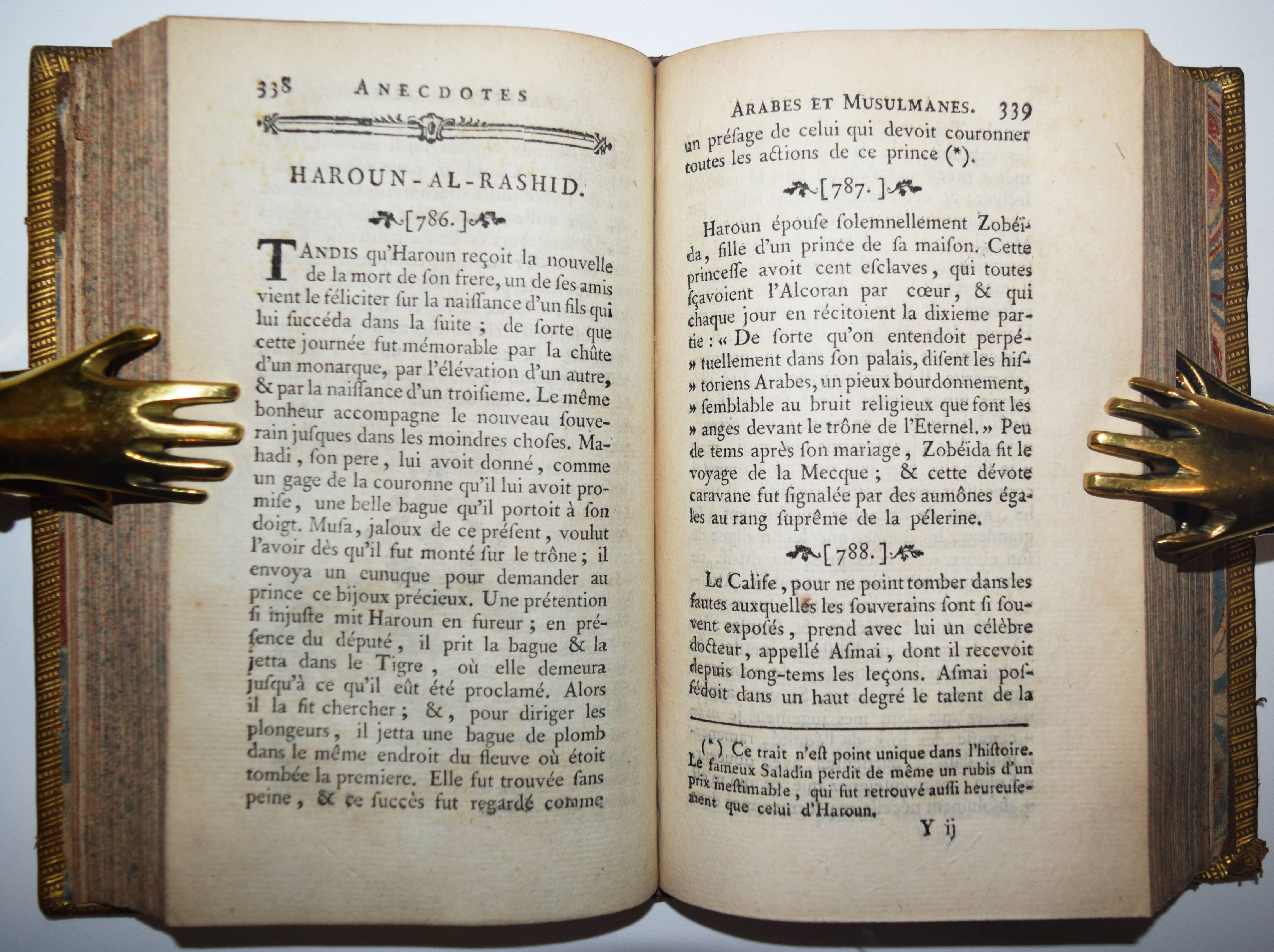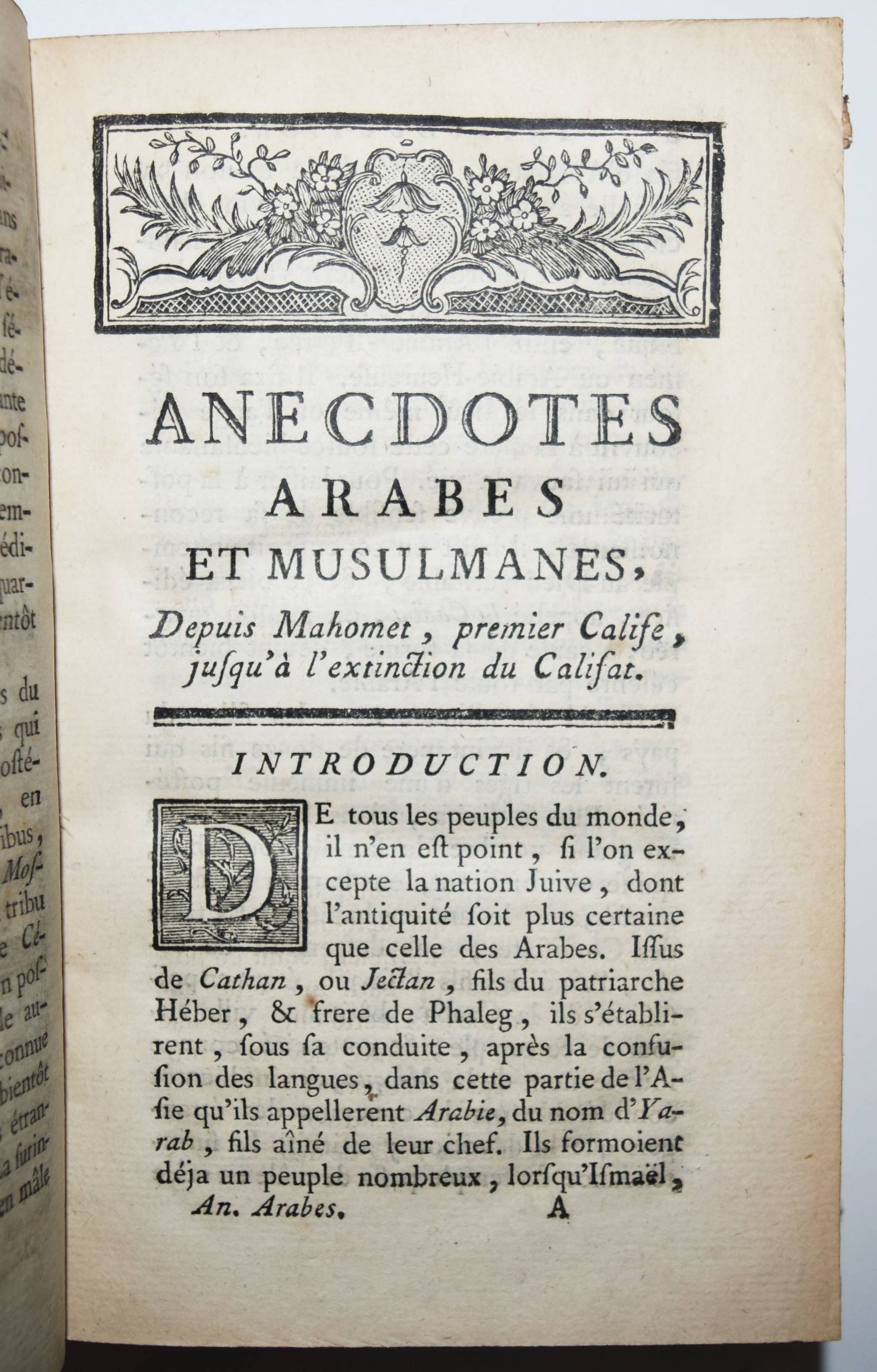 (Delacroix, Jean François de et Antoine Hornot). Anecdotes arabes et musulmanes, depuis l’an de J. C. 614, époque de l’établissement du Mahométisme en Arabie, par le faux prophète Mahomet. Jusqu’à l’extinction totale du Califat, en 1538. Paris, Vincent 1772. 8°. VI, 733 S., [1] Bl. Ldr. d. Zt. mit goldgepr. Rückensch., reicher floraler Rückenverg., goldgepr. Deckelfiletten u. Innenkantenverg. Barbier I, 179. Cioranescu 34176 (unter Hornot). – Erste Ausgabe. – Annalen des islamischen Gesamtstaates bis zu seiner Auflösung in Einzelstaaten und dem Erlöschen des ägyptischen Kalifats. – Zeitgenöss. u. modernes Exlibris, nahezu fleckenfreies und dekorativ gebundenes Exemplar.