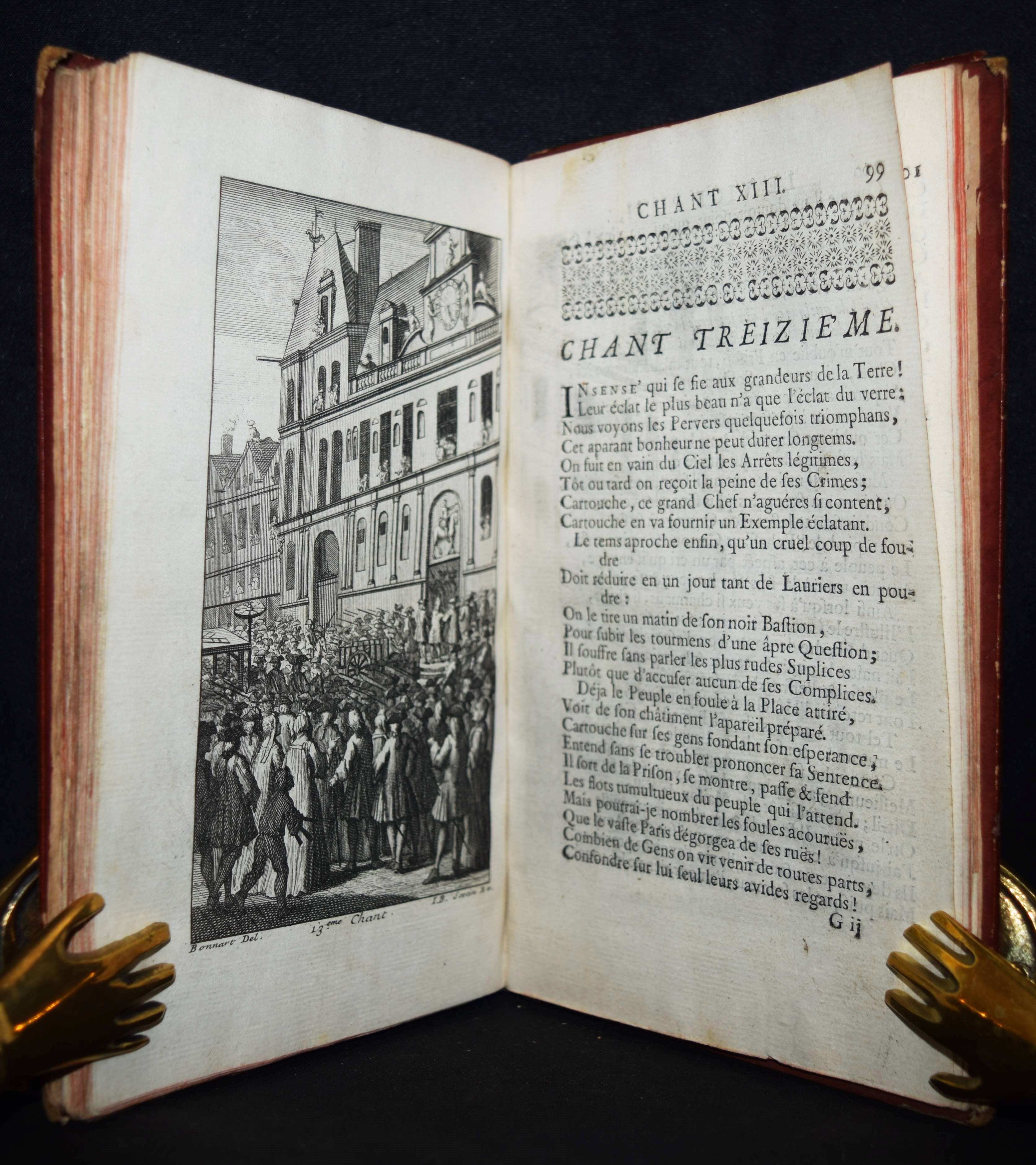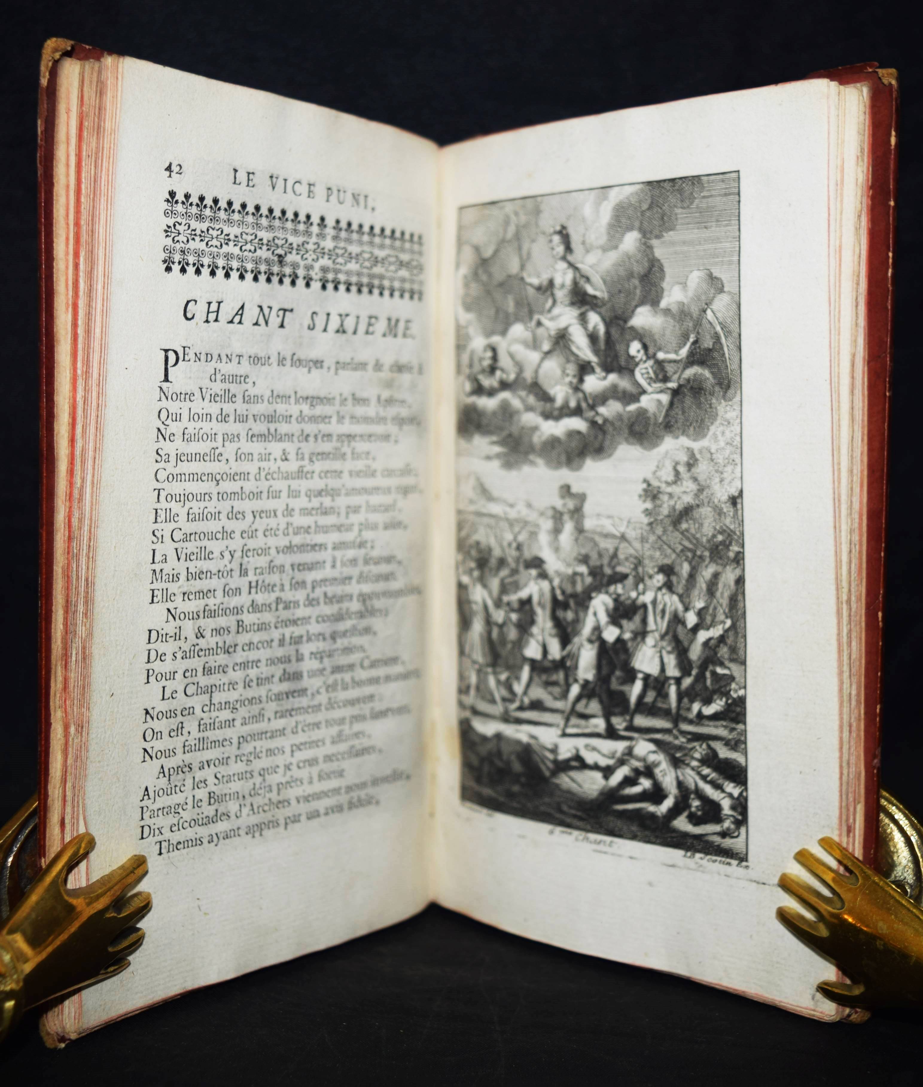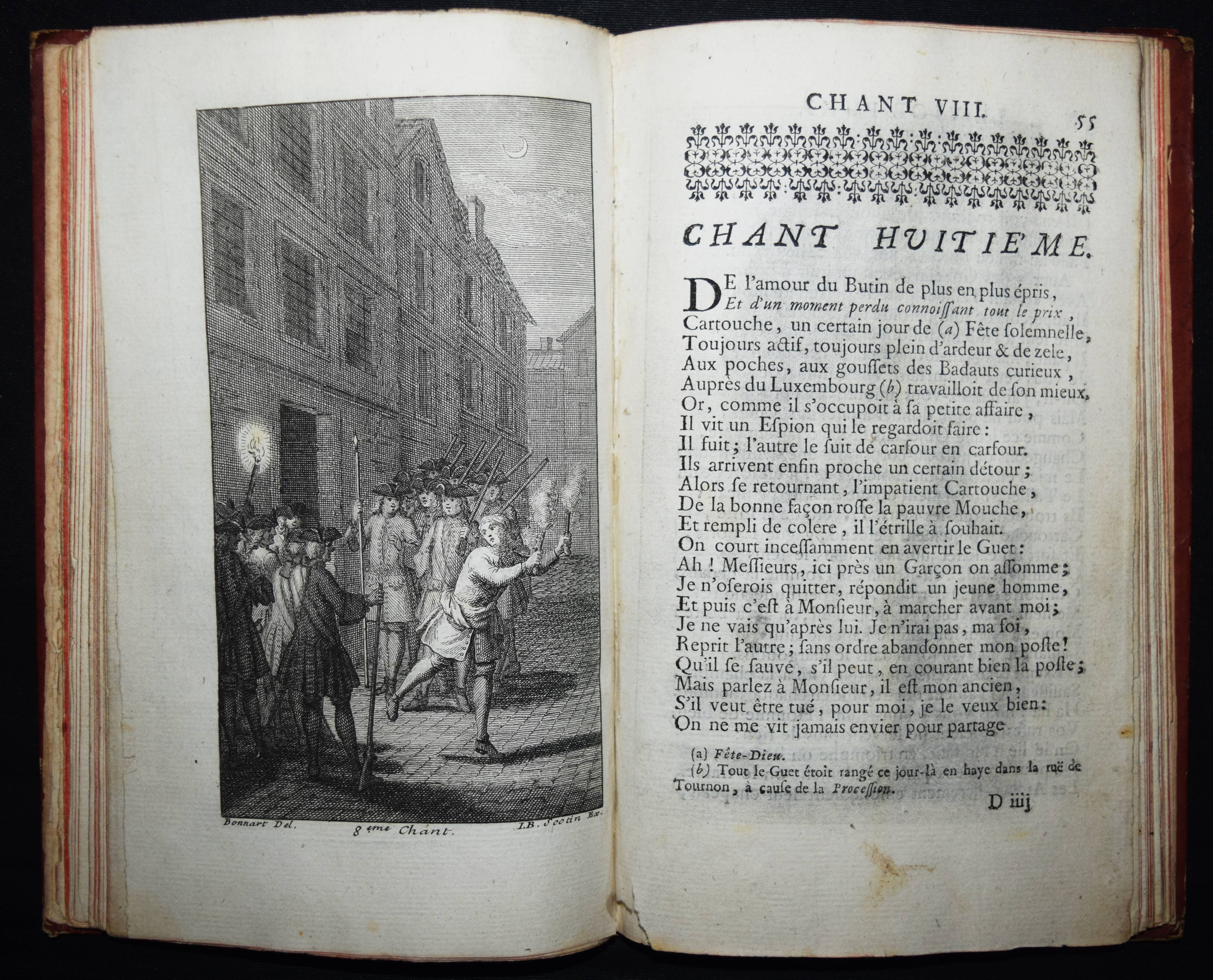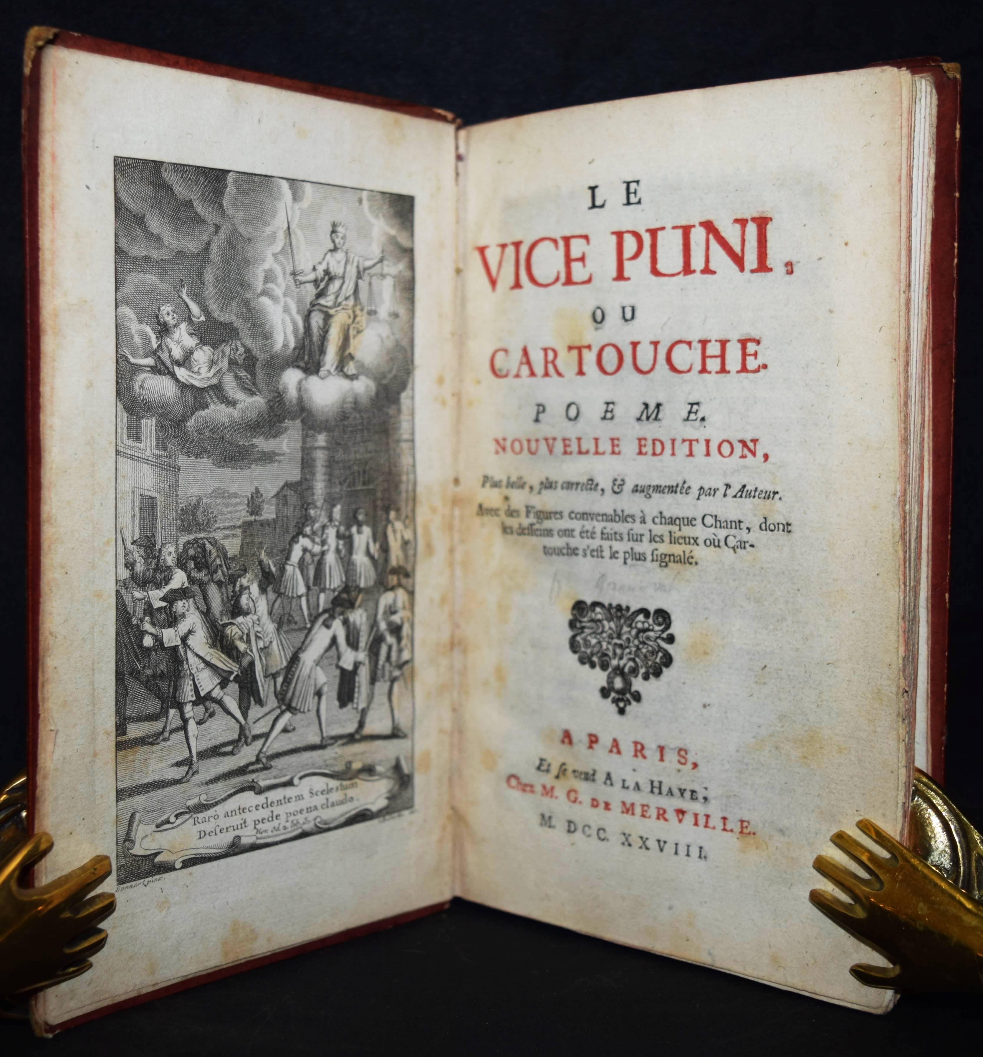 (Grandval, Nicolas Racot de). Le vice puni, ou Cartouche. Poème. Avec des figures convenables à chaque chant, dont les desseins ont été faits sur les lieux où Cartouche s’est le plus signalé. Nouvelle édition, plus belle, plus correcte, & augmentée par l’auteur. Paris, La Haye, M. G. de Merville 1728. 8°. [2] Bl., 119 S. mit 14 (statt 16) Kupfertafeln von Scotin nach Bonnart. Pbd. d. Zt. mit goldgepr. Rückentitel u. Linienverg. Barbier IV, 953. Cohen/Ricci 449. Gay III, 1328. – Erschien erstmals 1723. – Mit einem Wörterverzeichnis Argot-Französ. und Französ.-Argot (Gaunersprache). – Erst 1837 erschien der Name des Autors auf dem Titel. – In 13 Versen wird der bekannte Bandit und Gauner Cartouche (1693-1721) gepriesen, wobei der Autor die epische Gedichtform der Henriaden Voltaires parodiert. Cartouche war bei der Pariser Bevölkerung und auch beim Adel durchaus beliebt, da er seine Gaunereien nie ohne geistreichen Witz ausführte. Zeitweise arbeitete er sogar als Spitzel für die Pariser Polizei. Trotzdem wurde er inhaftiert und hingerichtet. – Rücken restauriert und etwas berieben, zwei Tafeln fehlen, sonst gut erhalten und nahezu fleckenfrei.