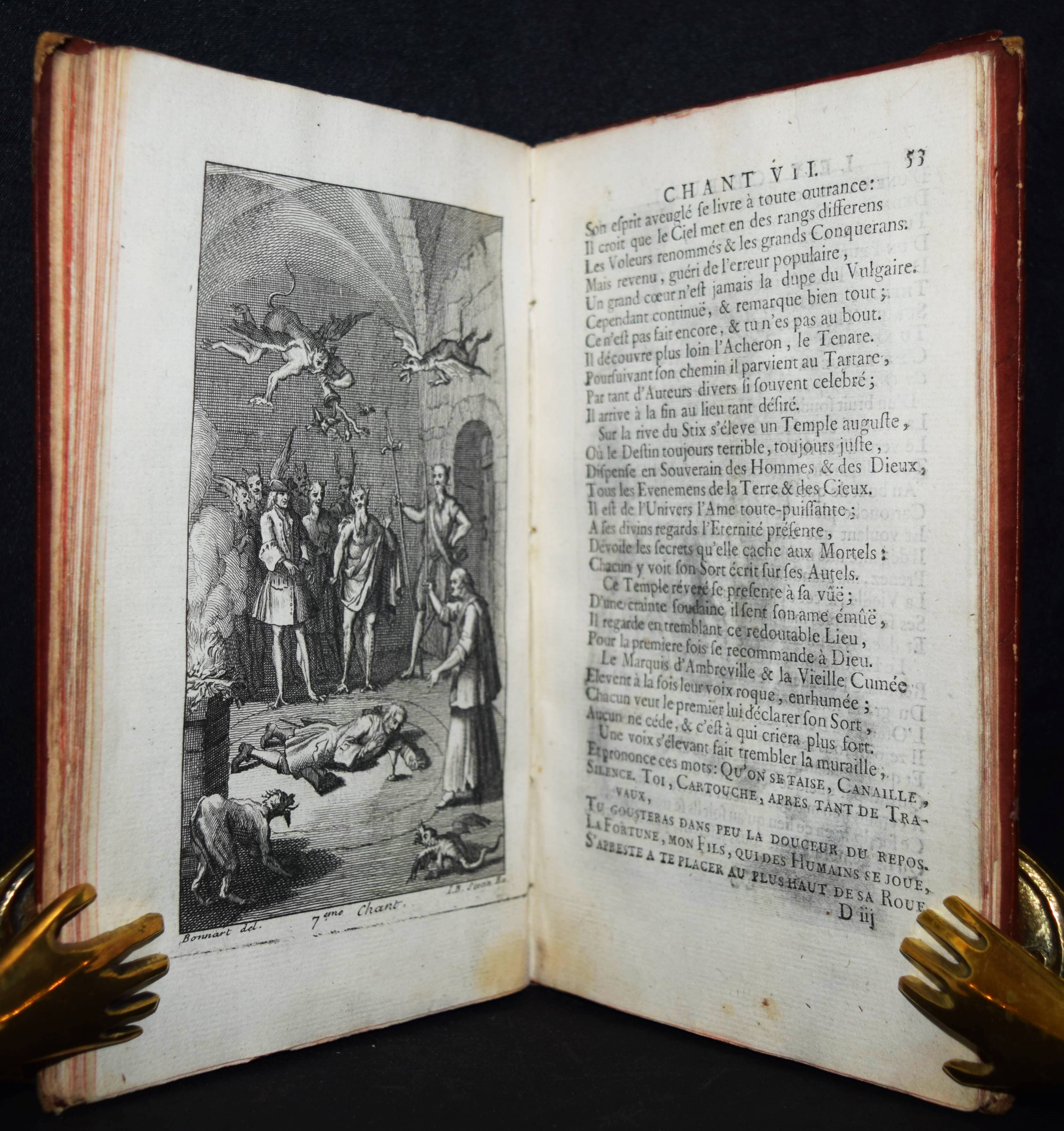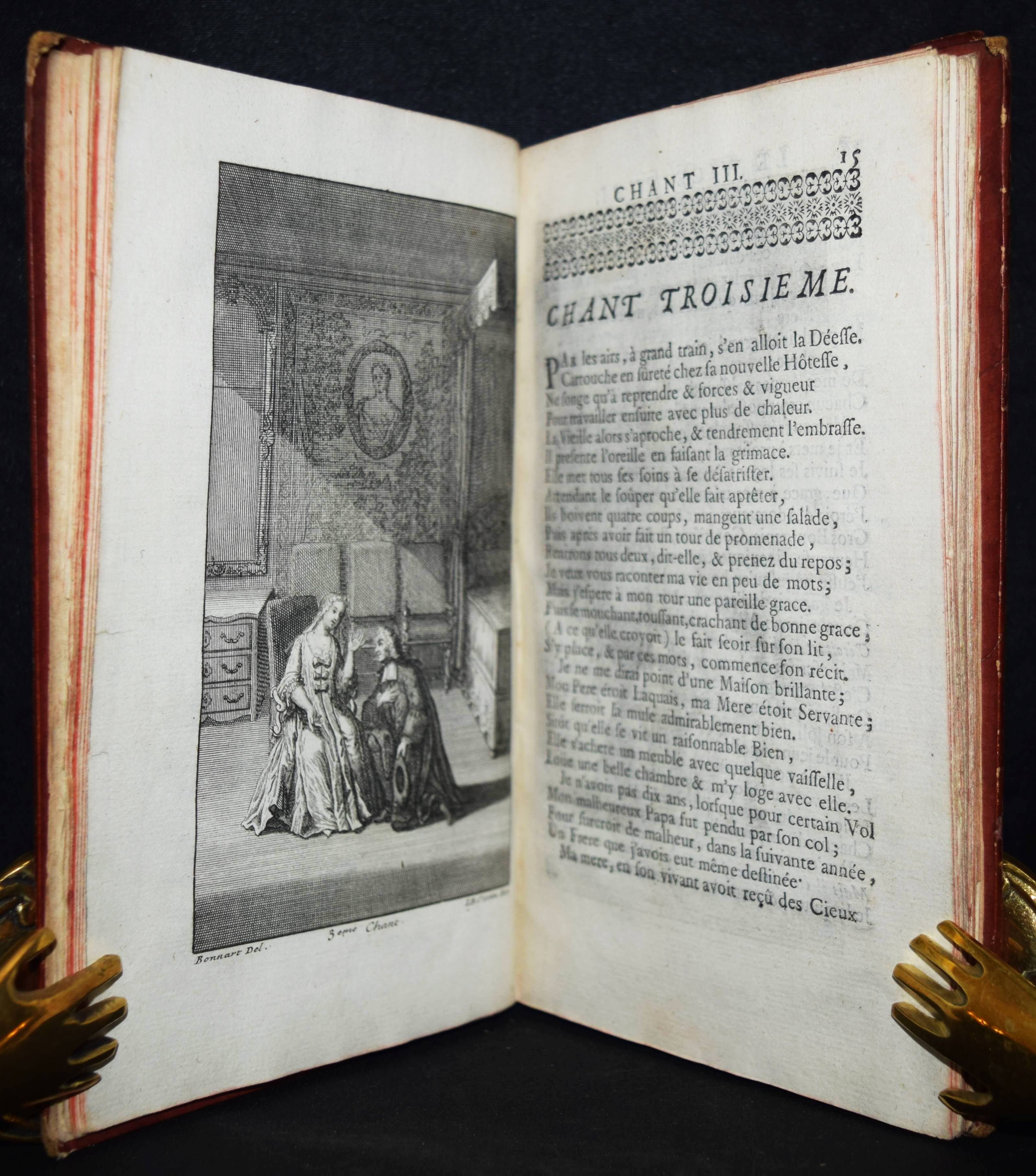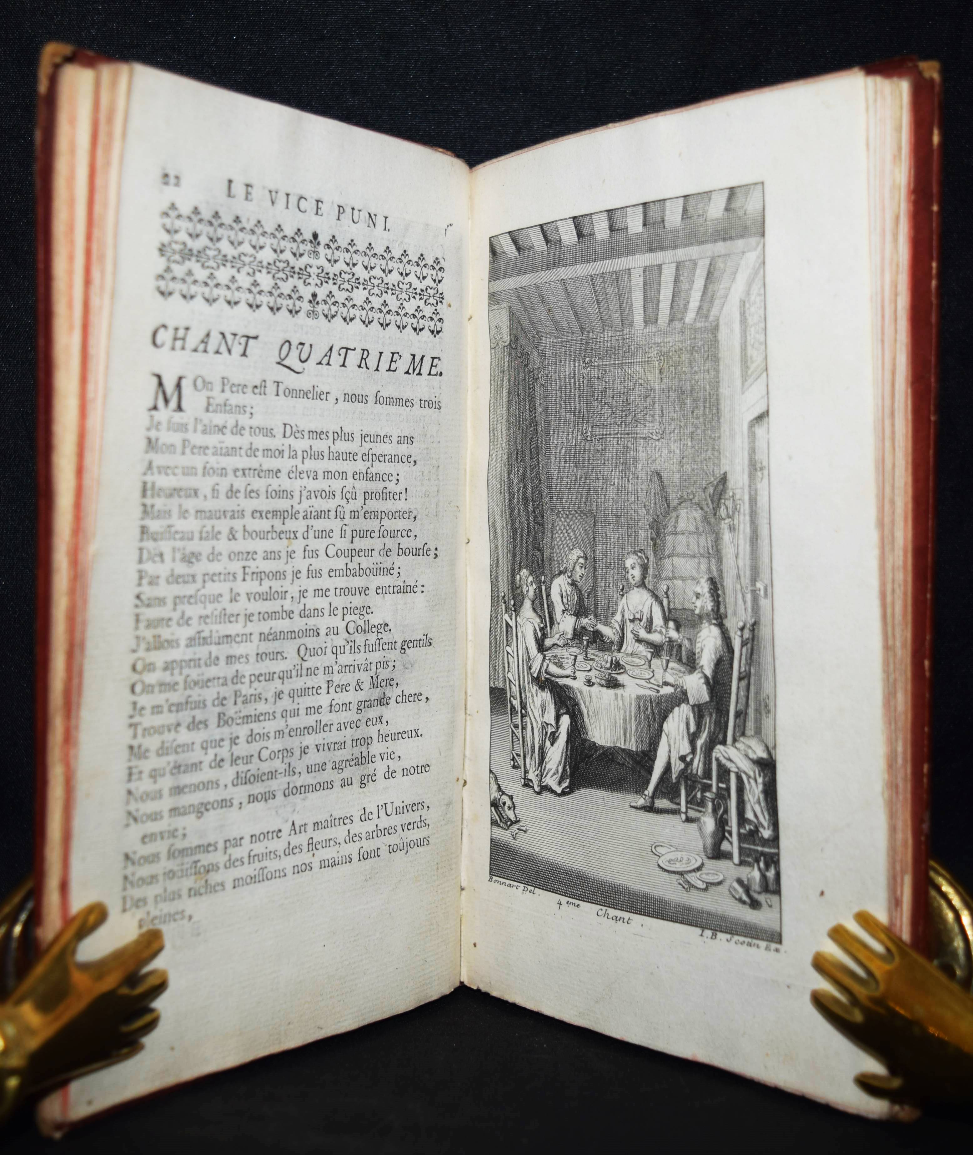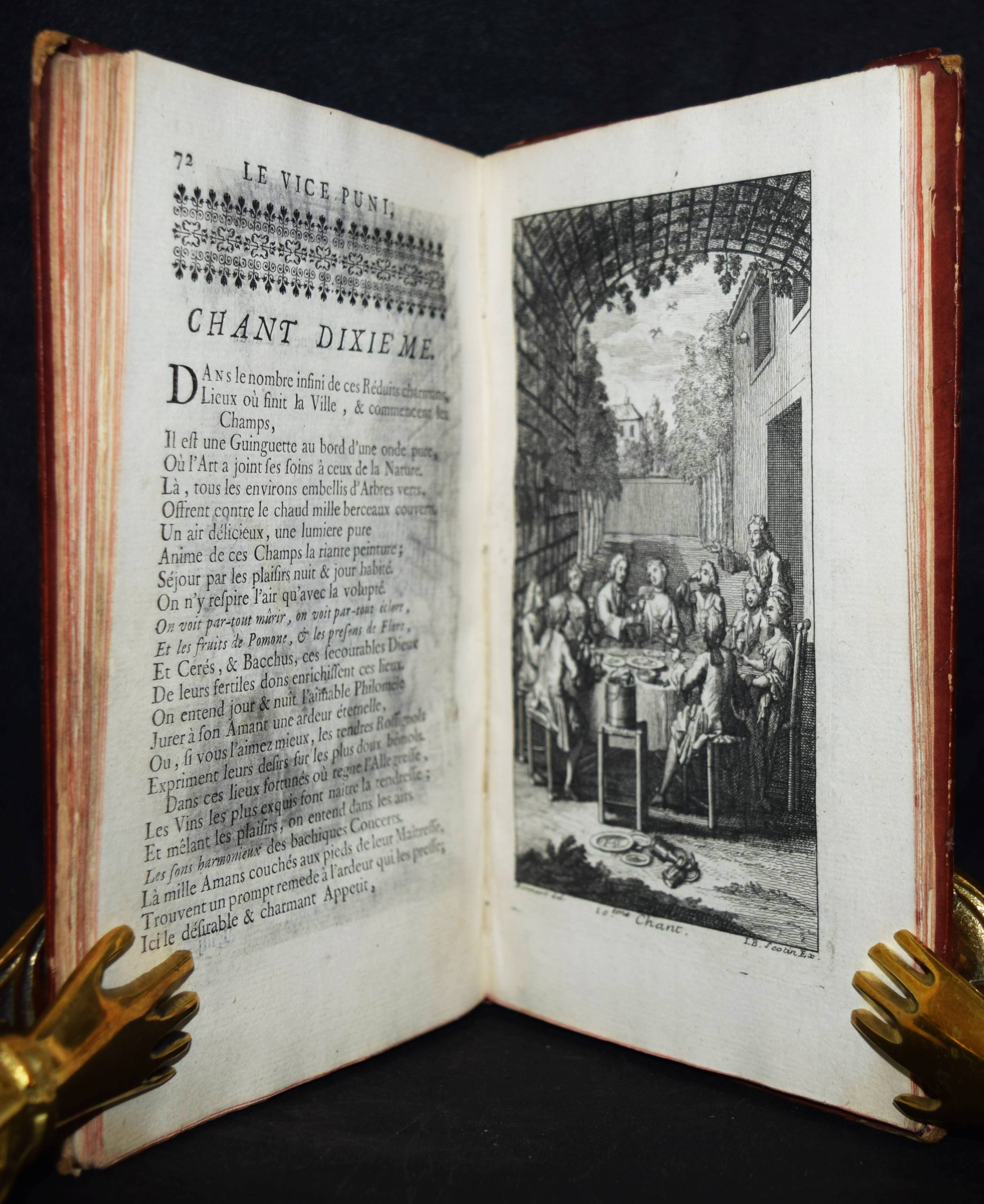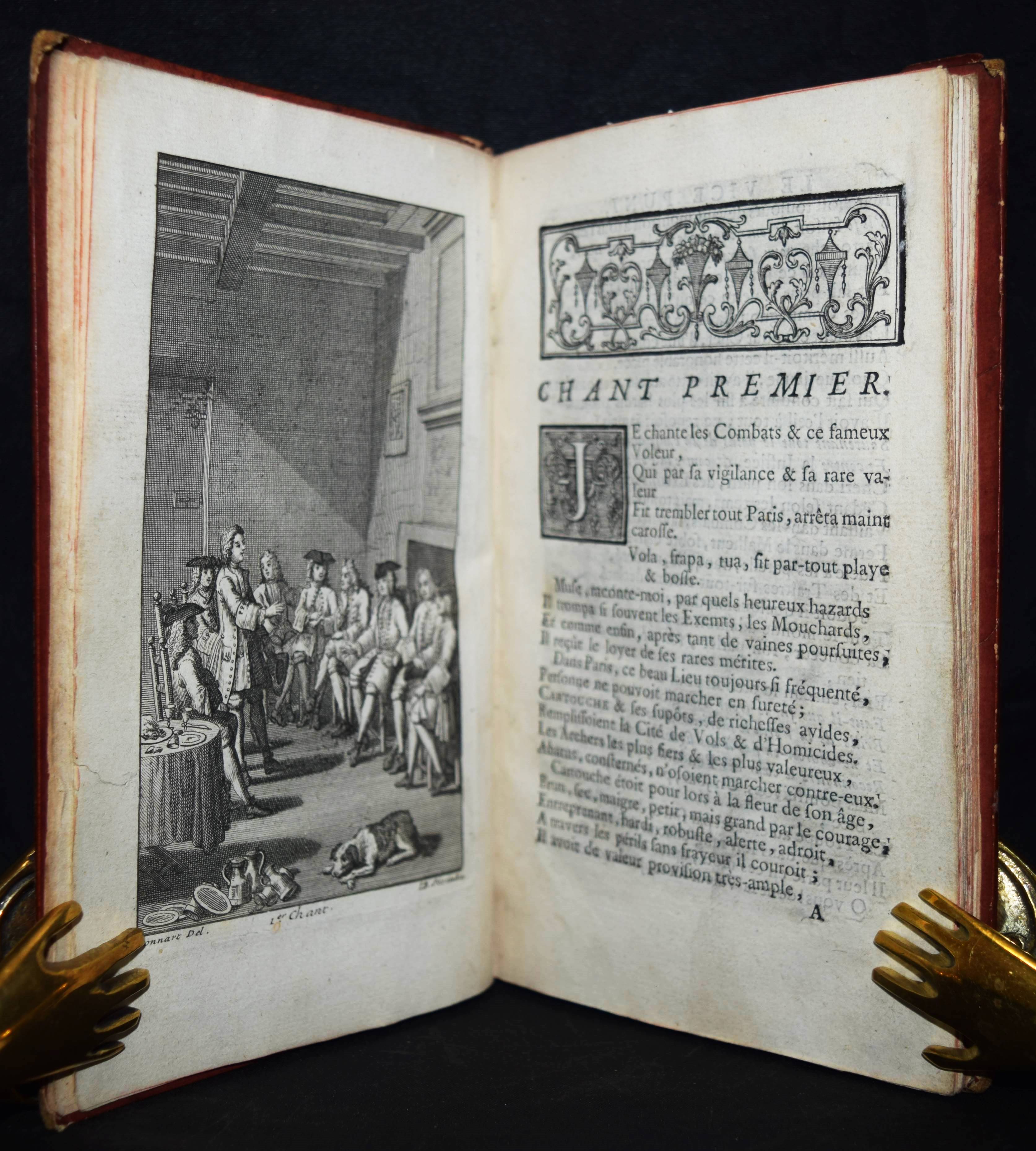 (Grandval, Nicolas Racot de). Le vice puni, ou Cartouche. Poème. Avec des figures convenables à chaque chant, dont les desseins ont été faits sur les lieux où Cartouche s’est le plus signalé. Nouvelle édition, plus belle, plus correcte, & augmentée par l’auteur. Paris, La Haye, M. G. de Merville 1728. 8°. [2] Bl., 119 S. mit 14 (statt 16) Kupfertafeln von Scotin nach Bonnart. Pbd. d. Zt. mit goldgepr. Rückentitel u. Linienverg. Barbier IV, 953. Cohen/Ricci 449. Gay III, 1328. – Erschien erstmals 1723. – Mit einem Wörterverzeichnis Argot-Französ. und Französ.-Argot (Gaunersprache). – Erst 1837 erschien der Name des Autors auf dem Titel. – In 13 Versen wird der bekannte Bandit und Gauner Cartouche (1693-1721) gepriesen, wobei der Autor die epische Gedichtform der Henriaden Voltaires parodiert. Cartouche war bei der Pariser Bevölkerung und auch beim Adel durchaus beliebt, da er seine Gaunereien nie ohne geistreichen Witz ausführte. Zeitweise arbeitete er sogar als Spitzel für die Pariser Polizei. Trotzdem wurde er inhaftiert und hingerichtet. – Rücken restauriert und etwas berieben, zwei Tafeln fehlen, sonst gut erhalten und nahezu fleckenfrei.