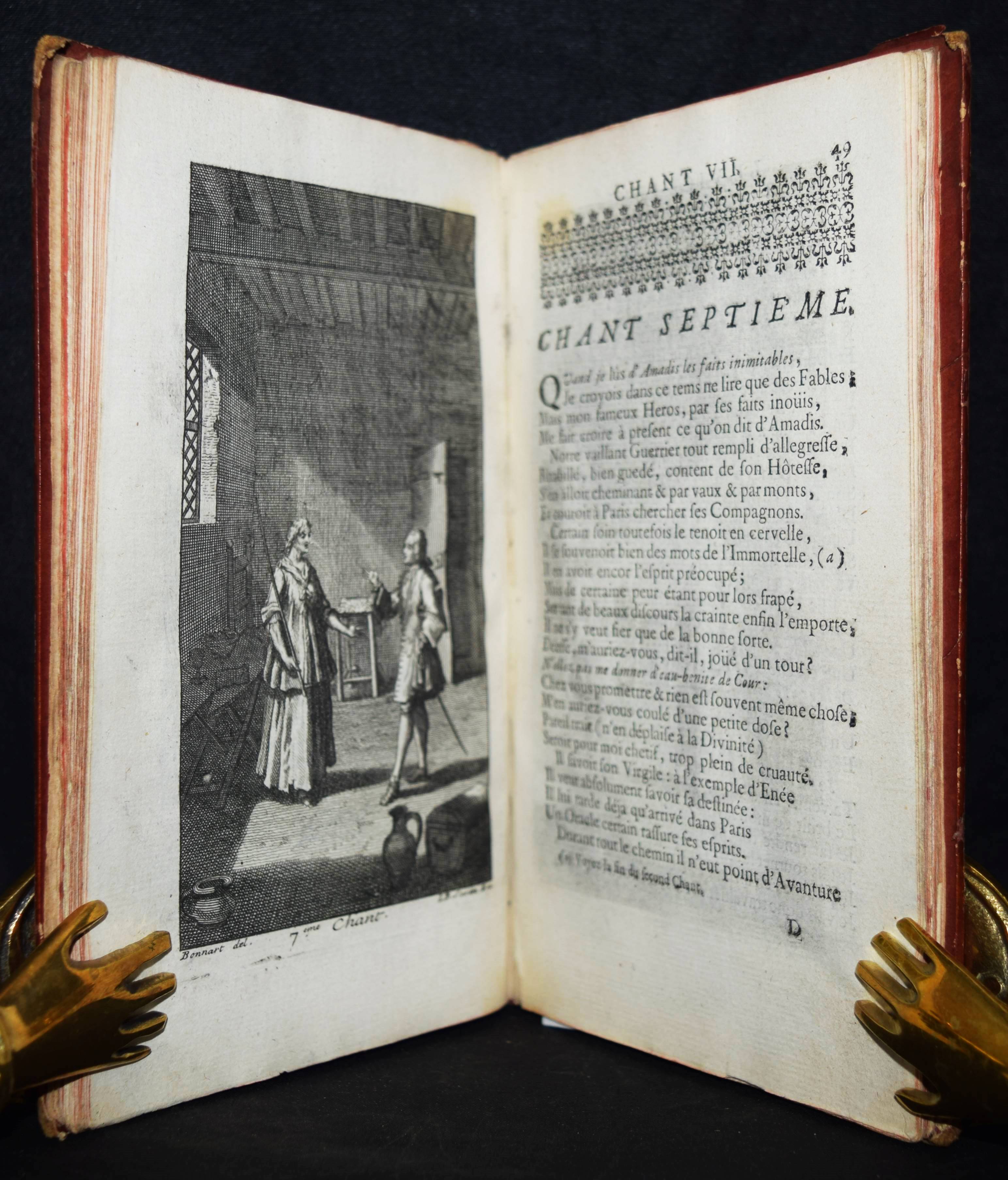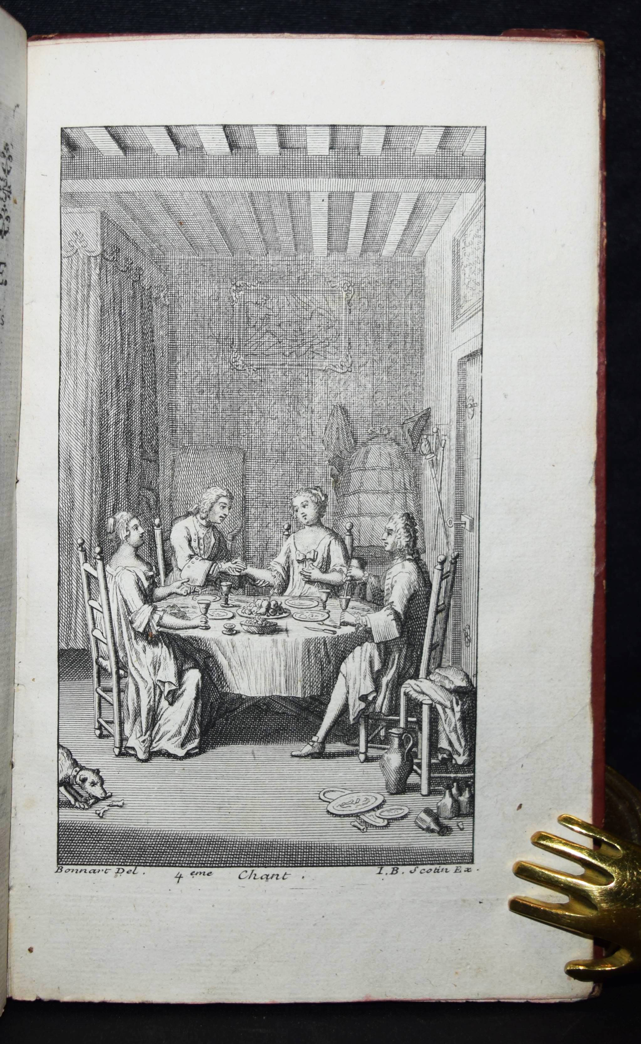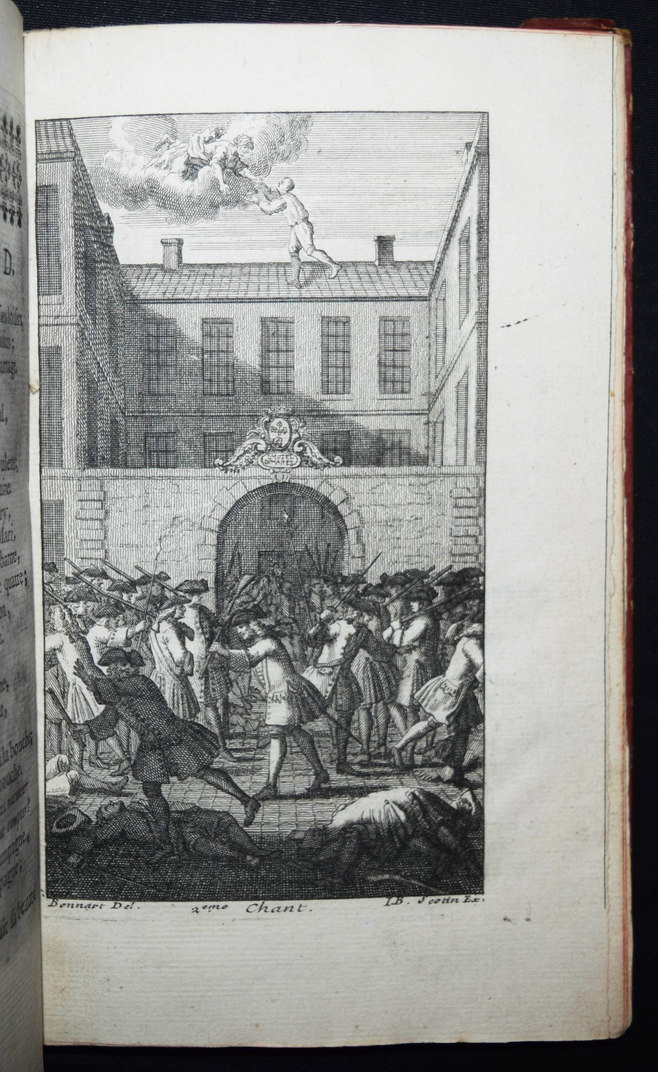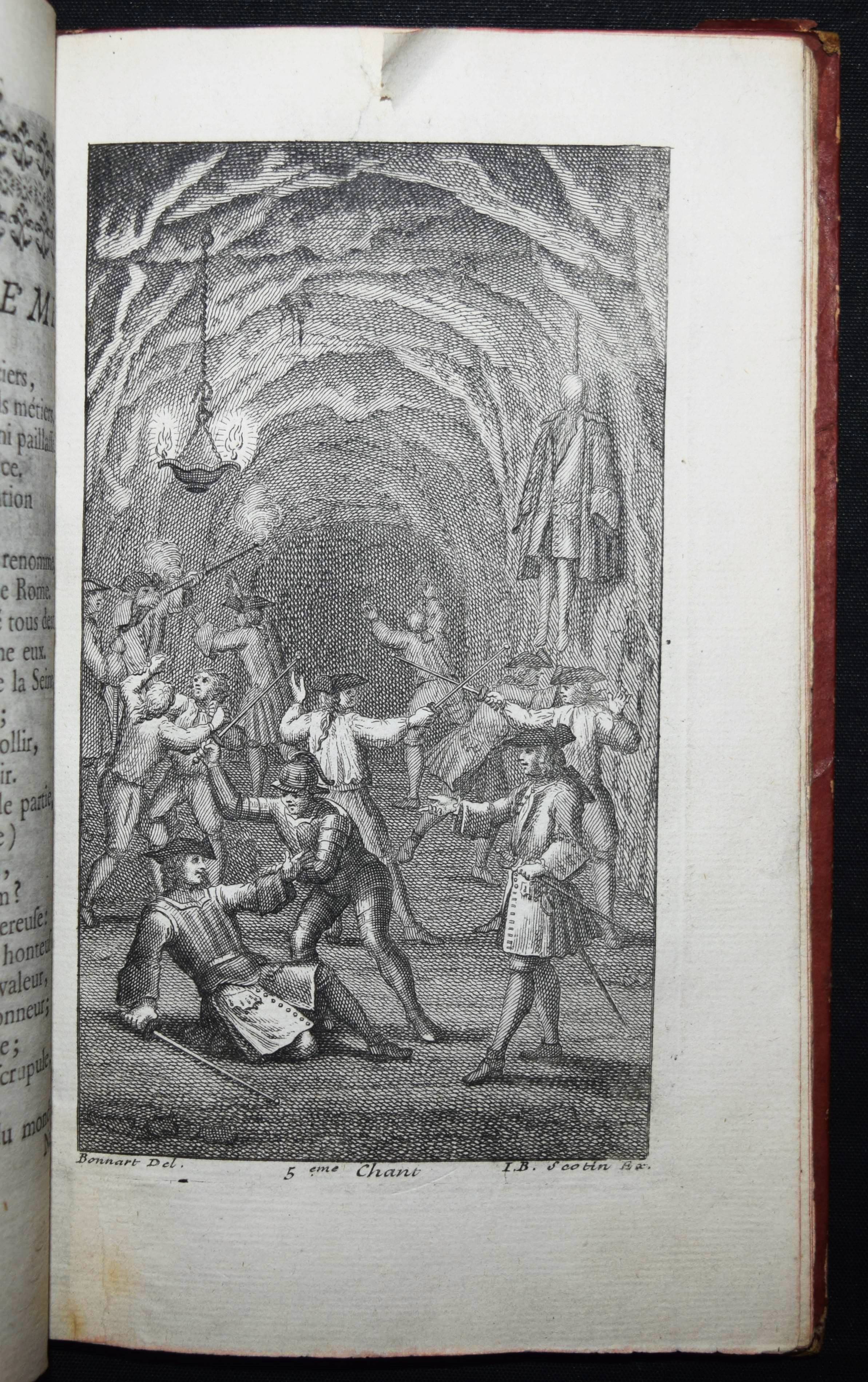 (Grandval, Nicolas Racot de). Le vice puni, ou Cartouche. Poème. Avec des figures convenables à chaque chant, dont les desseins ont été faits sur les lieux où Cartouche s’est le plus signalé. Nouvelle édition, plus belle, plus correcte, & augmentée par l’auteur. Paris, La Haye, M. G. de Merville 1728. 8°. [2] Bl., 119 S. mit 14 (statt 16) Kupfertafeln von Scotin nach Bonnart. Pbd. d. Zt. mit goldgepr. Rückentitel u. Linienverg. Barbier IV, 953. Cohen/Ricci 449. Gay III, 1328. – Erschien erstmals 1723. – Mit einem Wörterverzeichnis Argot-Französ. und Französ.-Argot (Gaunersprache). – Erst 1837 erschien der Name des Autors auf dem Titel. – In 13 Versen wird der bekannte Bandit und Gauner Cartouche (1693-1721) gepriesen, wobei der Autor die epische Gedichtform der Henriaden Voltaires parodiert. Cartouche war bei der Pariser Bevölkerung und auch beim Adel durchaus beliebt, da er seine Gaunereien nie ohne geistreichen Witz ausführte. Zeitweise arbeitete er sogar als Spitzel für die Pariser Polizei. Trotzdem wurde er inhaftiert und hingerichtet. – Rücken restauriert und etwas berieben, zwei Tafeln fehlen, sonst gut erhalten und nahezu fleckenfrei.