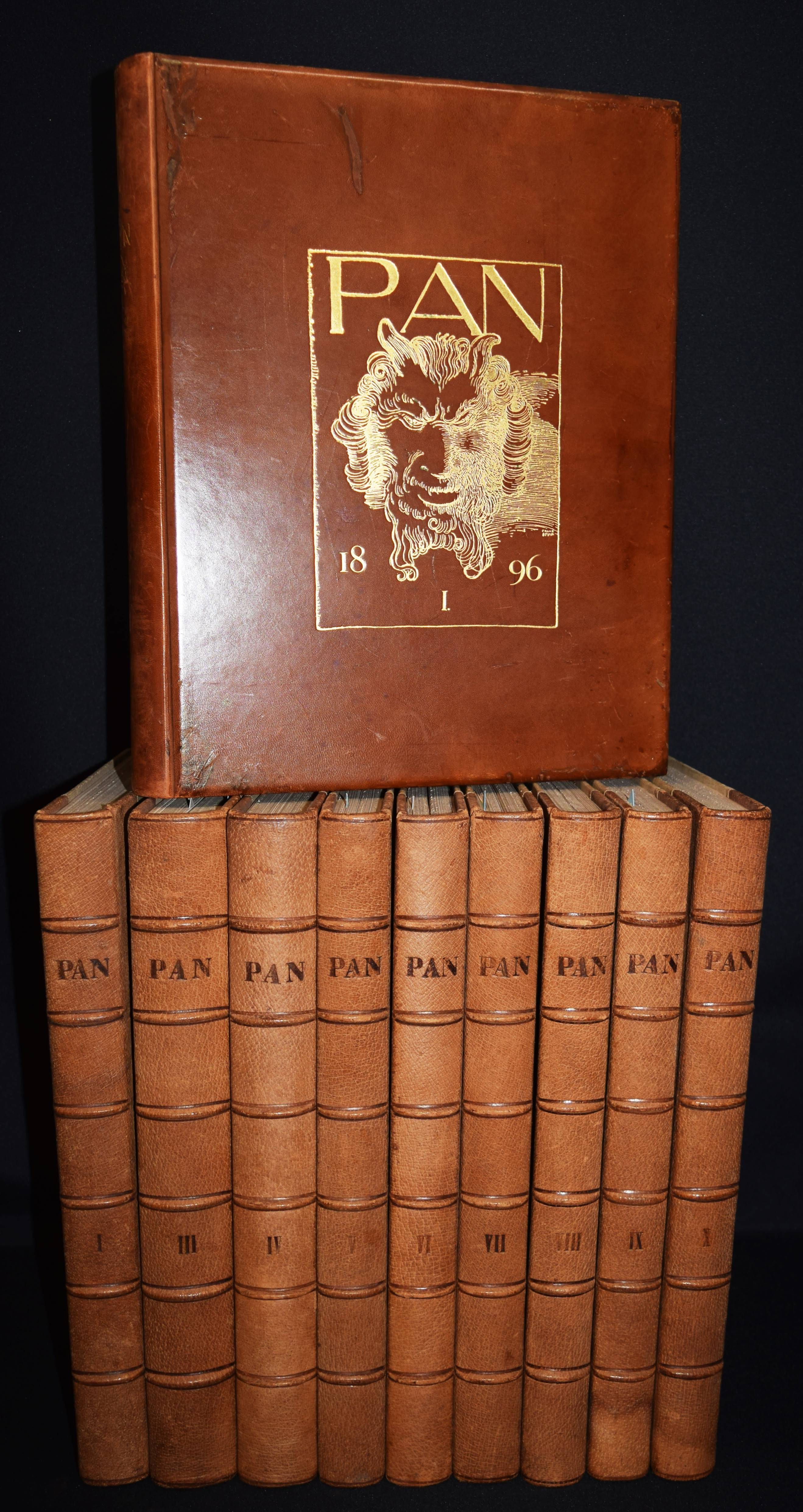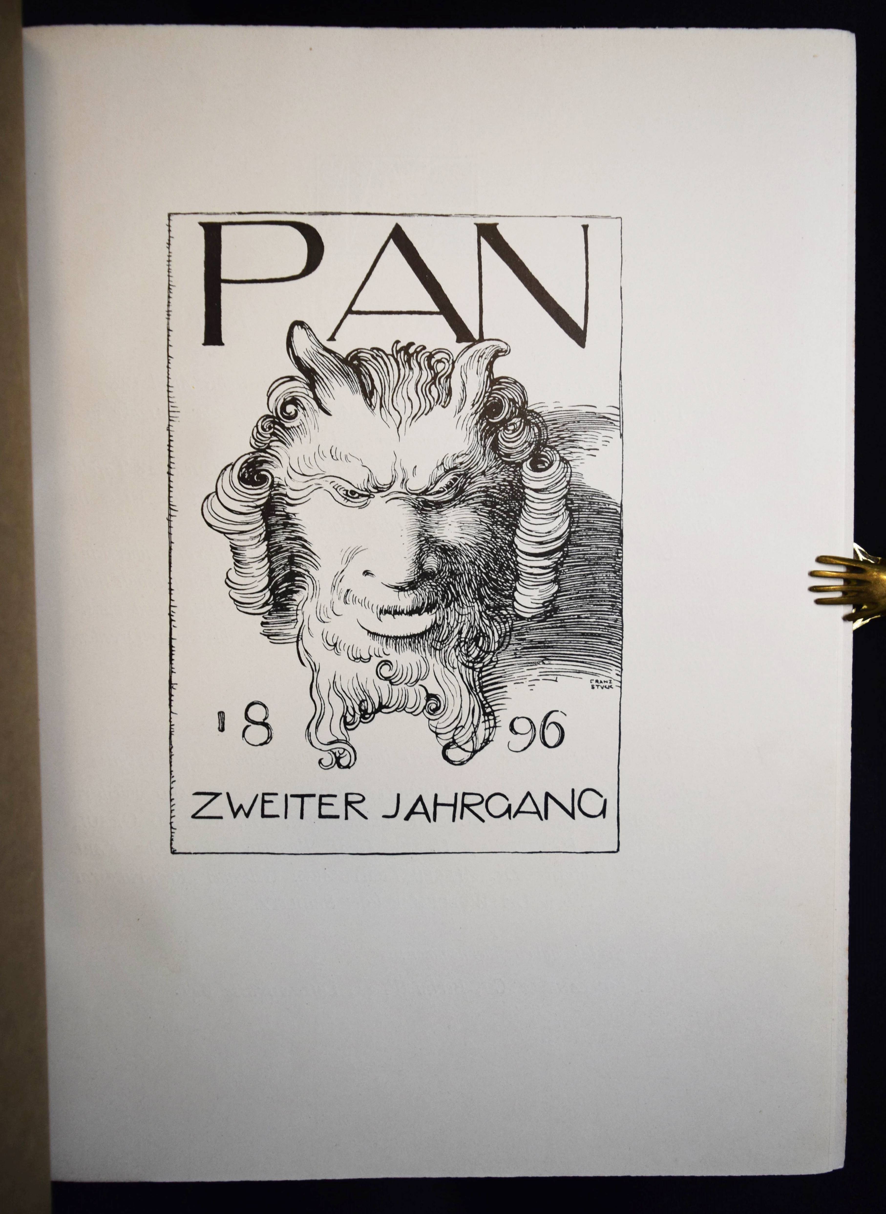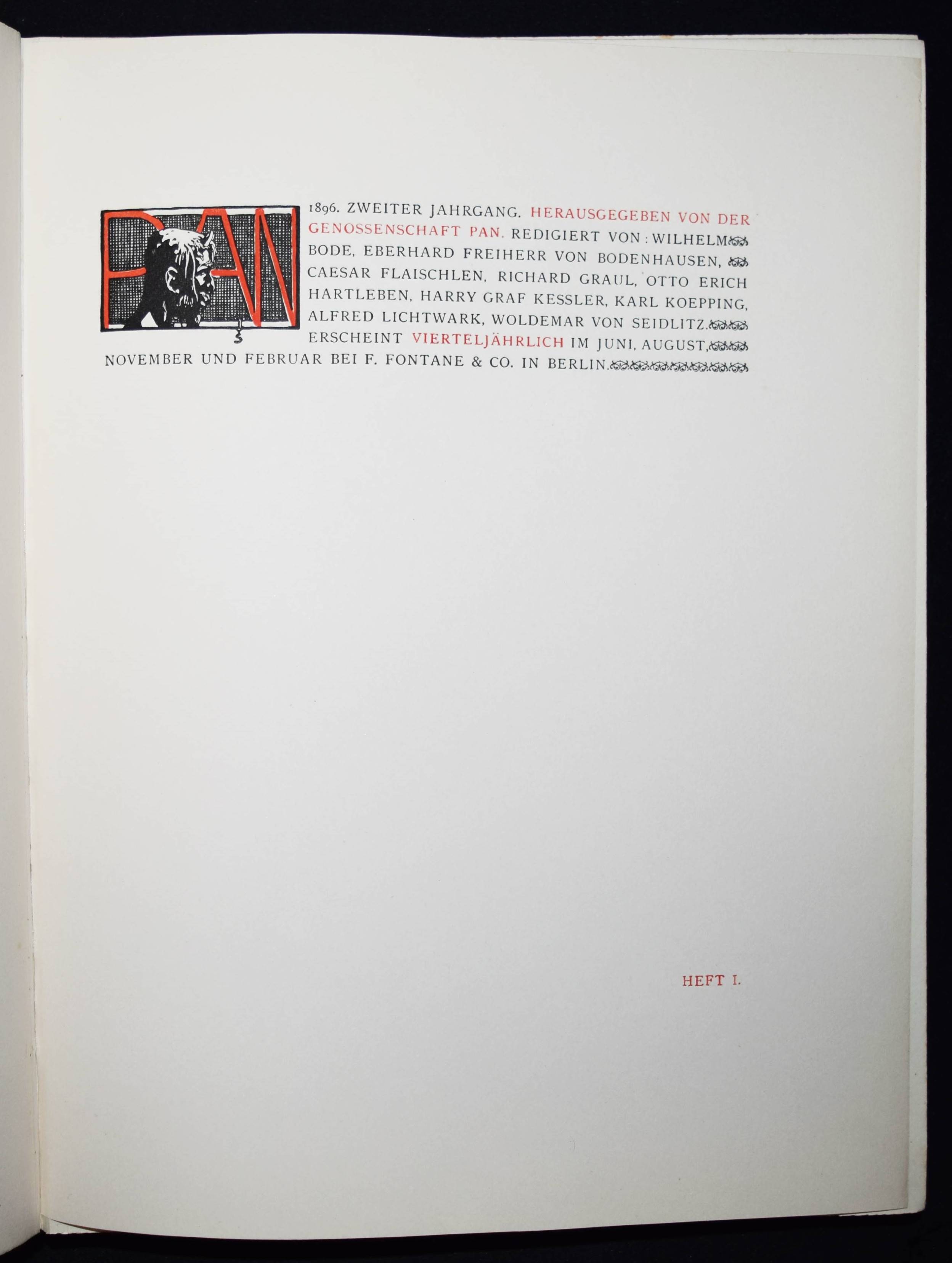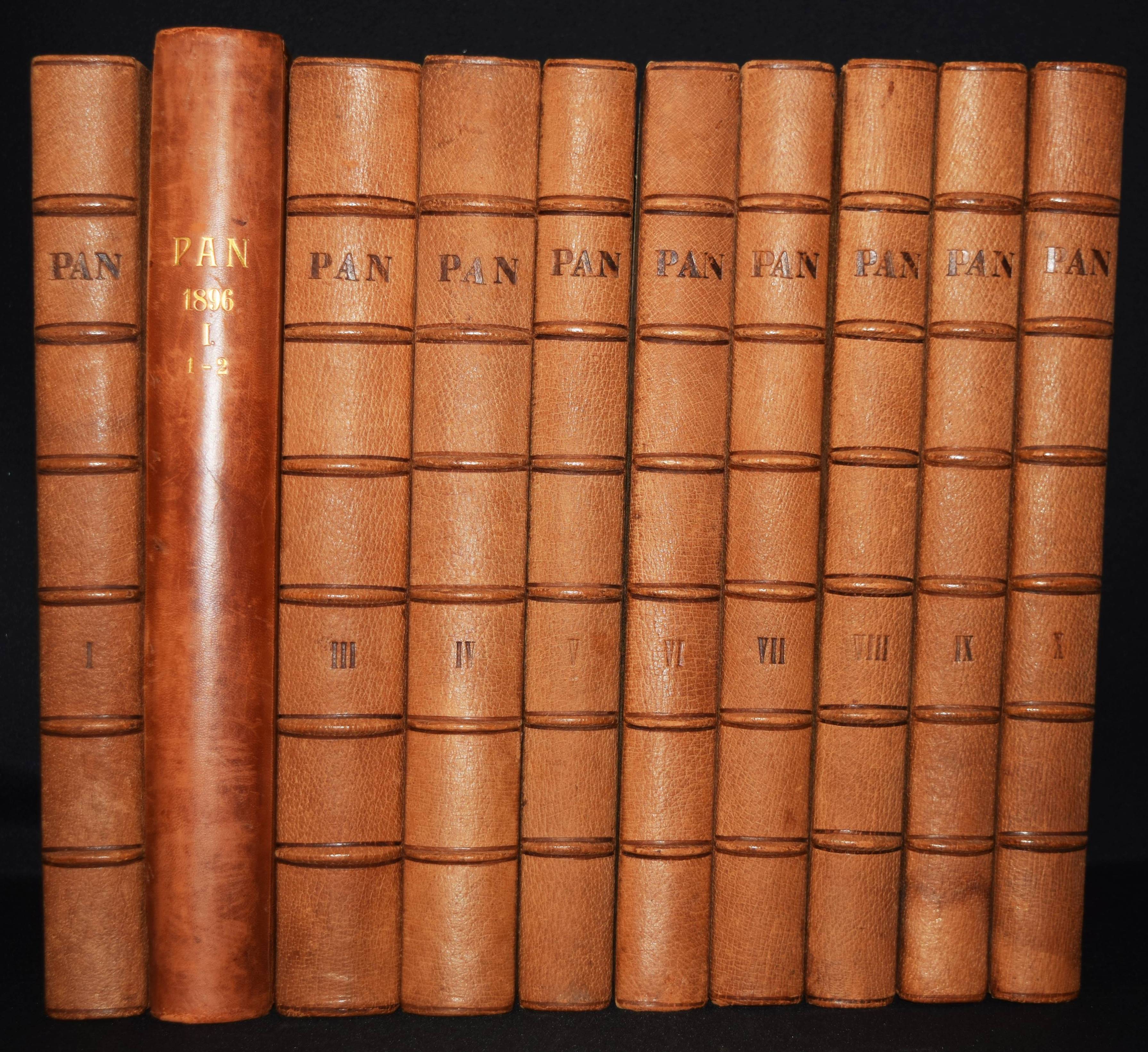 Bierbaum, Otto Julius, Julius Meier-Graefe u. a. (Red.). Pan. (Herausgegeben von der) Genossenschaft Pan. Erster (bis) Fünfter Jahrgang. 21 Hefte in 10 Bänden. Berlin, Verlag Pan 1895-1900. Folio (38 x 30 cm.). Mit 106 Originalgraphiken, 126 Tafeln, zwei Musikbeilagen und zahlreichen Textabbildungen sowie Buchschmuck. Orig.-Ldr. mit goldgepr. Deckelvignette (Jahrgang 1896) u. braune Hldr. d. Zt. mit blindgepr. Rückentiteln (illustr. Orig.-Umschläge beigebunden). Dokumentations-Bibliothek I, 426. Schauer I, 20 ff. Schlawe I, 48 ff. Söhn HDO 525, 526–530. – Eines von 70 num. Exemplaren der Vorzugsausgabe auf Kupferdruck-Papier von E. Obst & Co., Strassburg und Berlin, die Tafeln meist auf Kaiserl. Japan von R. Wagner in Berlin. – Sehr gutes und vollständiges Exemplar mit allen Originalgraphiken, einschließlich der bedeutenden Farblithographie „Mad. Marcelle Lender en buste“ von Henri Toulouse-Lautrec. – Mit den farbigen Umschlägen mit dem Pan-Kopf nach Franz Stuck, allen Titelblättern und Inhaltsverzeichnissen. – „Die nach ihrer Ausstattung erlesenste deutsche Zeitschrift; ihr Hauptverdienst liegt in der Förderung der neuen Buchkunst, die im wesentlichen mit ihr in Deutschland beginnt. … Von den anderen literarischen Zeitschriften unterscheidet ‚Pan‘ besonders sein umgreifender Inhalt (Literatur und Kunst), sein buchkünstlerisches Wollen und seine Ausstattung“ (F. Schlawe). – Mit Originalgraphiken unter anderem von Peter Behrens, Otto Eckmann, Ludwig von Kalckreuth, Max Klinger, Käthe Kollwitz, Max Liebermann, Hans Olde, August Rodin, Paul Signac, Otto Ubbelohde und Henry van de Velde. – Dazu: Pan. Prospect-Buch. Inhalts- und Mitgliederverzeichnis der drei Jahre 1895, 1896, 1897 der Zeitschrift „Pan“. Berlin 1898. OKart. – Der Jahrgang 1896 vollständig auf Kaiserl. Japan gedruckt und im Orig.-Verlagseinband mit einer signierten Orig.-Lithographie von Franz Naager. – Der Ledereinband teils geringfügig berieben, die Deckel der Halblederbände und Schnitte etwas braunfleckig, sehr schönes Exemplar; alle Originalgraphiken alle fleckenfrei.