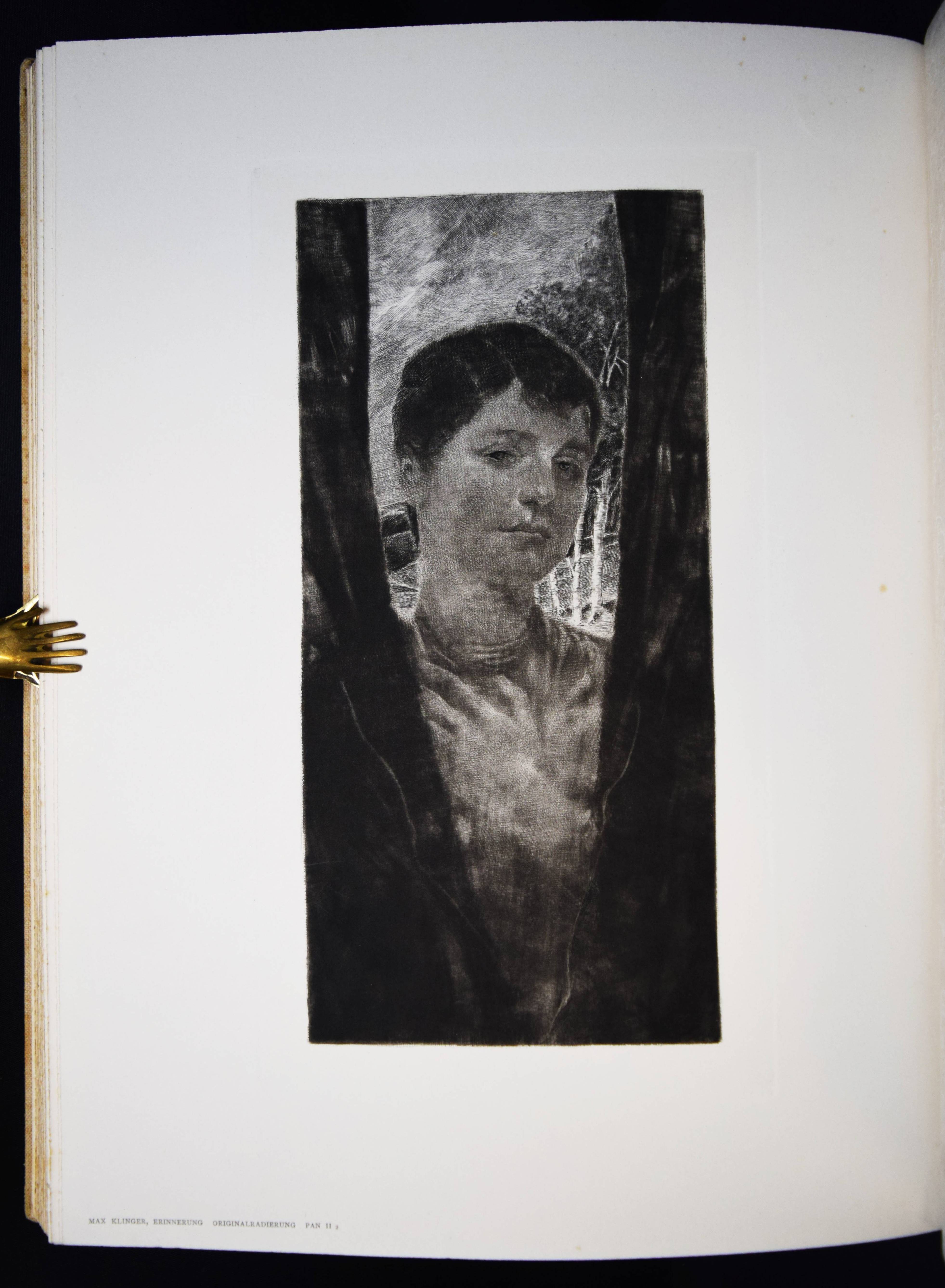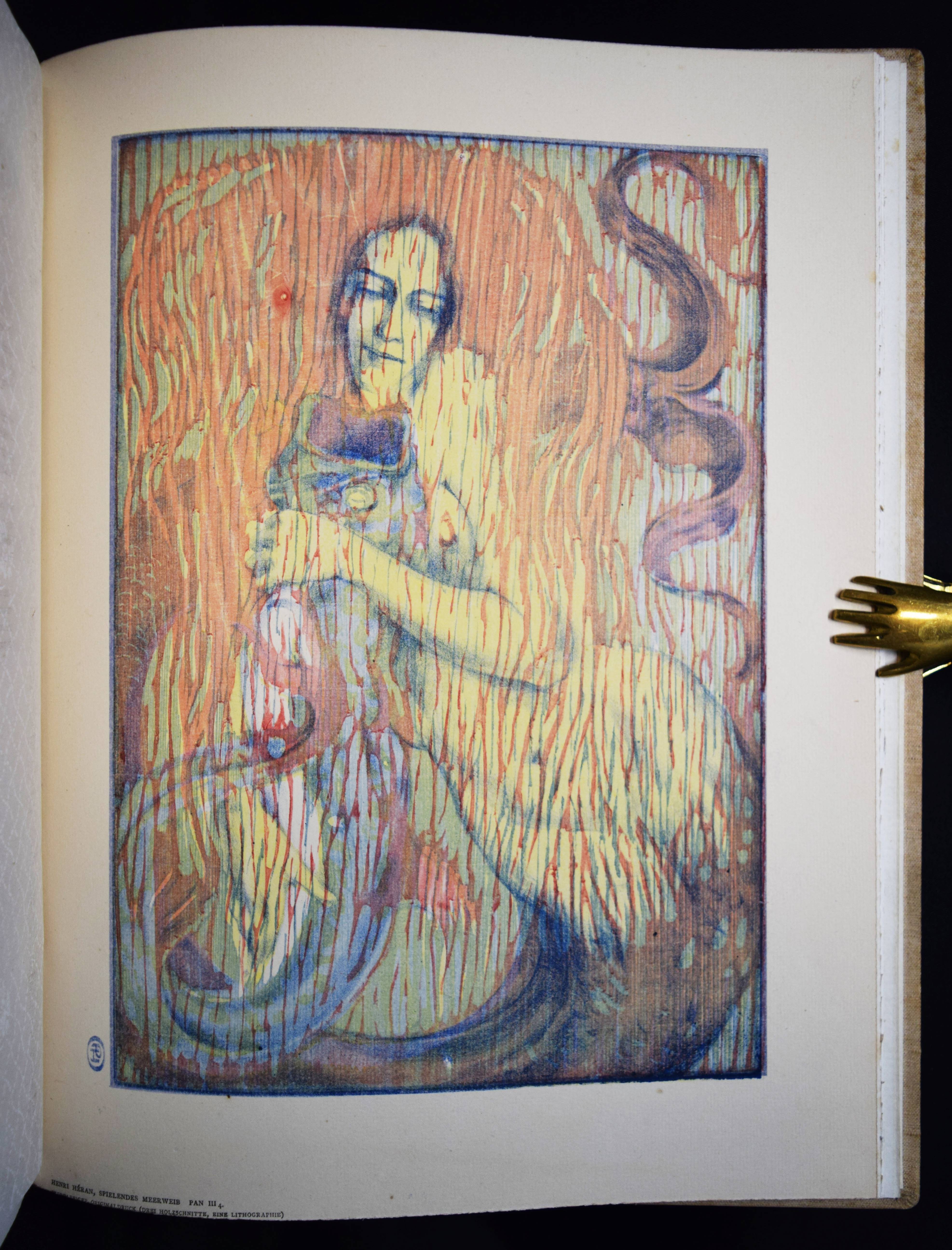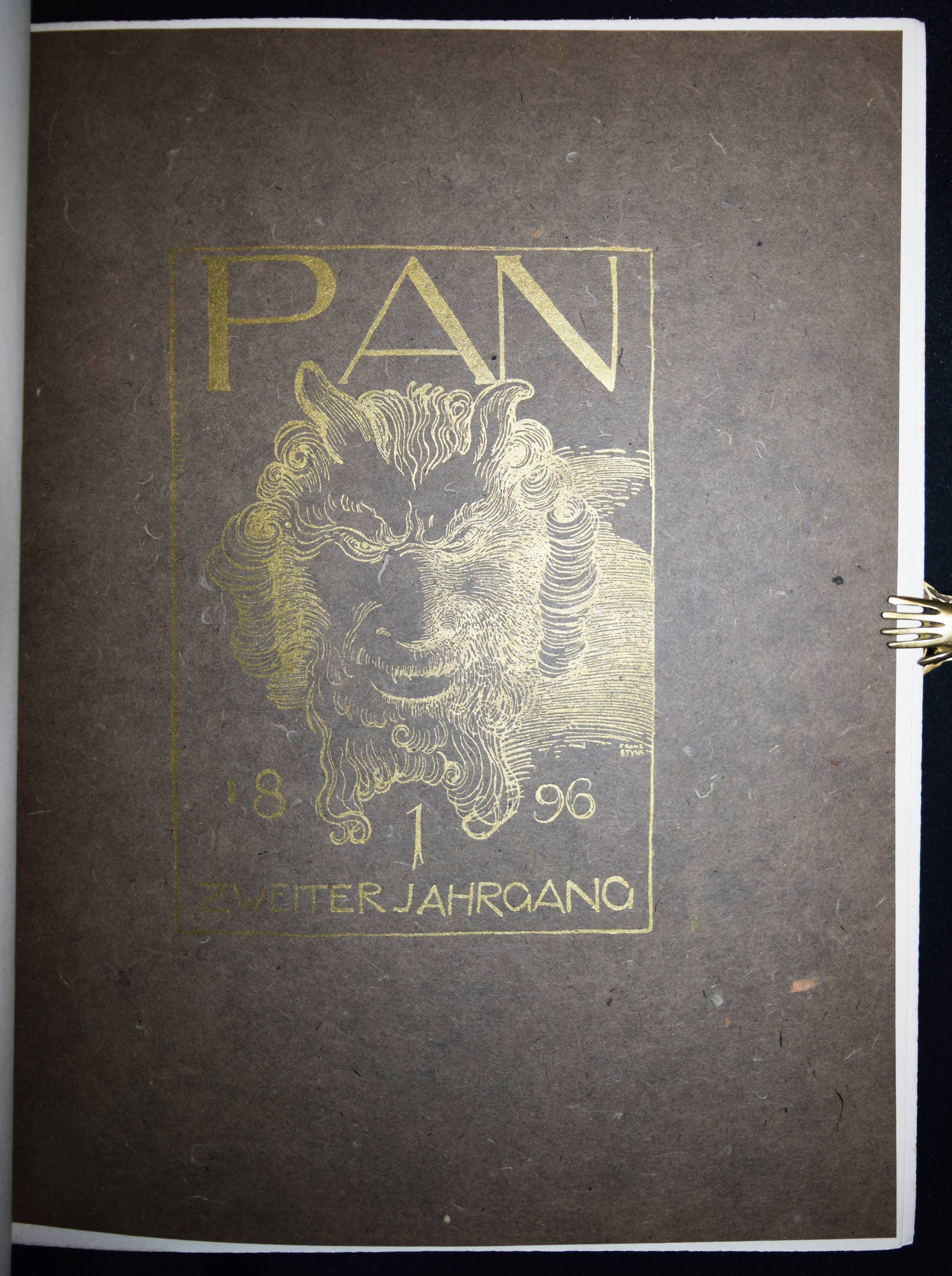 Bierbaum, Otto Julius, Julius Meier-Graefe u. a. (Red.). Pan. (Herausgegeben von der) Genossenschaft Pan. Erster (bis) Fünfter Jahrgang. 21 Hefte in 10 Bänden. Berlin, Verlag Pan 1895-1900. Folio (38 x 30 cm.). Mit 106 Originalgraphiken, 126 Tafeln, zwei Musikbeilagen und zahlreichen Textabbildungen sowie Buchschmuck. Orig.-Ldr. mit goldgepr. Deckelvignette (Jahrgang 1896) u. braune Hldr. d. Zt. mit blindgepr. Rückentiteln (illustr. Orig.-Umschläge beigebunden). Dokumentations-Bibliothek I, 426. Schauer I, 20 ff. Schlawe I, 48 ff. Söhn HDO 525, 526–530. – Eines von 70 num. Exemplaren der Vorzugsausgabe auf Kupferdruck-Papier von E. Obst & Co., Strassburg und Berlin, die Tafeln meist auf Kaiserl. Japan von R. Wagner in Berlin. – Sehr gutes und vollständiges Exemplar mit allen Originalgraphiken, einschließlich der bedeutenden Farblithographie „Mad. Marcelle Lender en buste“ von Henri Toulouse-Lautrec. – Mit den farbigen Umschlägen mit dem Pan-Kopf nach Franz Stuck, allen Titelblättern und Inhaltsverzeichnissen. – „Die nach ihrer Ausstattung erlesenste deutsche Zeitschrift; ihr Hauptverdienst liegt in der Förderung der neuen Buchkunst, die im wesentlichen mit ihr in Deutschland beginnt. … Von den anderen literarischen Zeitschriften unterscheidet ‚Pan‘ besonders sein umgreifender Inhalt (Literatur und Kunst), sein buchkünstlerisches Wollen und seine Ausstattung“ (F. Schlawe). – Mit Originalgraphiken unter anderem von Peter Behrens, Otto Eckmann, Ludwig von Kalckreuth, Max Klinger, Käthe Kollwitz, Max Liebermann, Hans Olde, August Rodin, Paul Signac, Otto Ubbelohde und Henry van de Velde. – Dazu: Pan. Prospect-Buch. Inhalts- und Mitgliederverzeichnis der drei Jahre 1895, 1896, 1897 der Zeitschrift „Pan“. Berlin 1898. OKart. – Der Jahrgang 1896 vollständig auf Kaiserl. Japan gedruckt und im Orig.-Verlagseinband mit einer signierten Orig.-Lithographie von Franz Naager. – Der Ledereinband teils geringfügig berieben, die Deckel der Halblederbände und Schnitte etwas braunfleckig, sehr schönes Exemplar; alle Originalgraphiken alle fleckenfrei.
