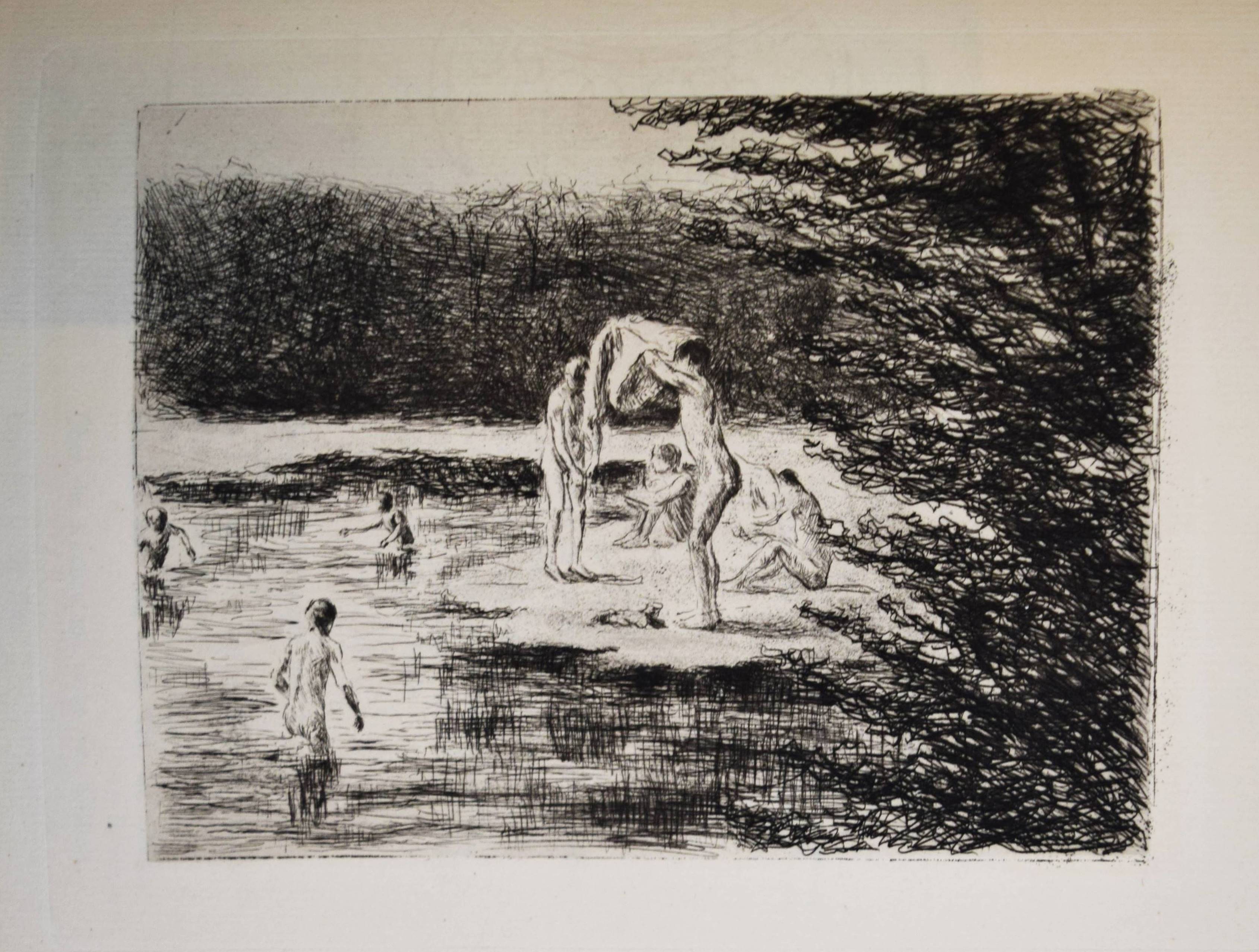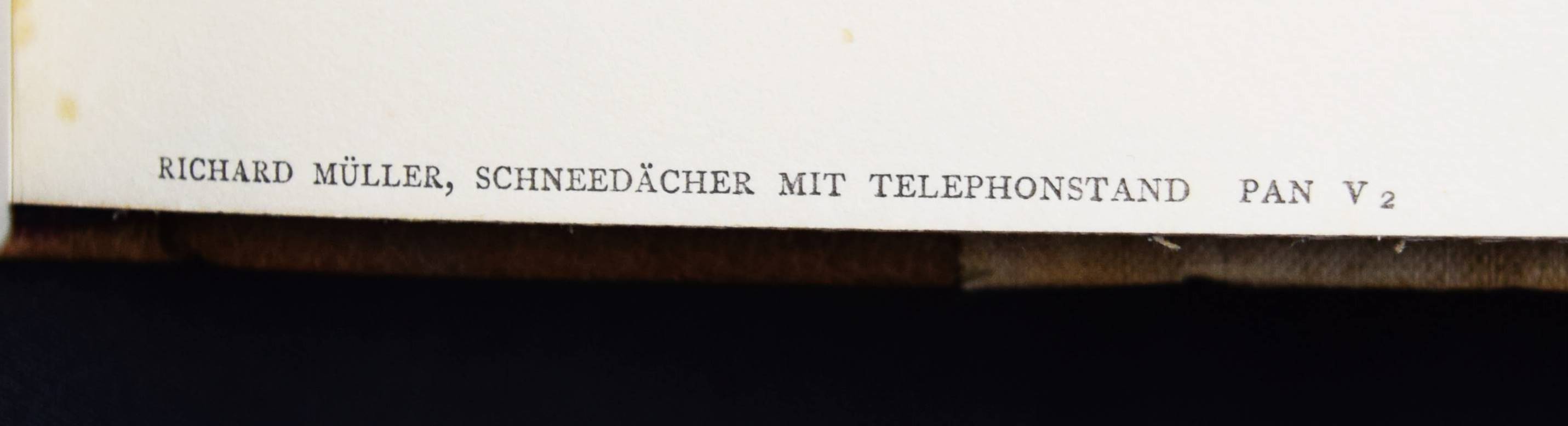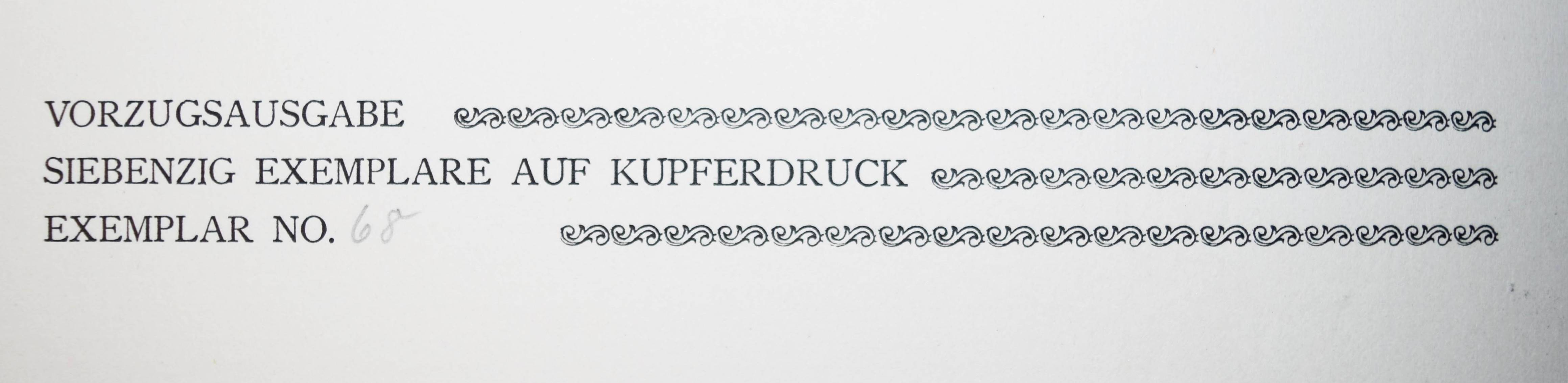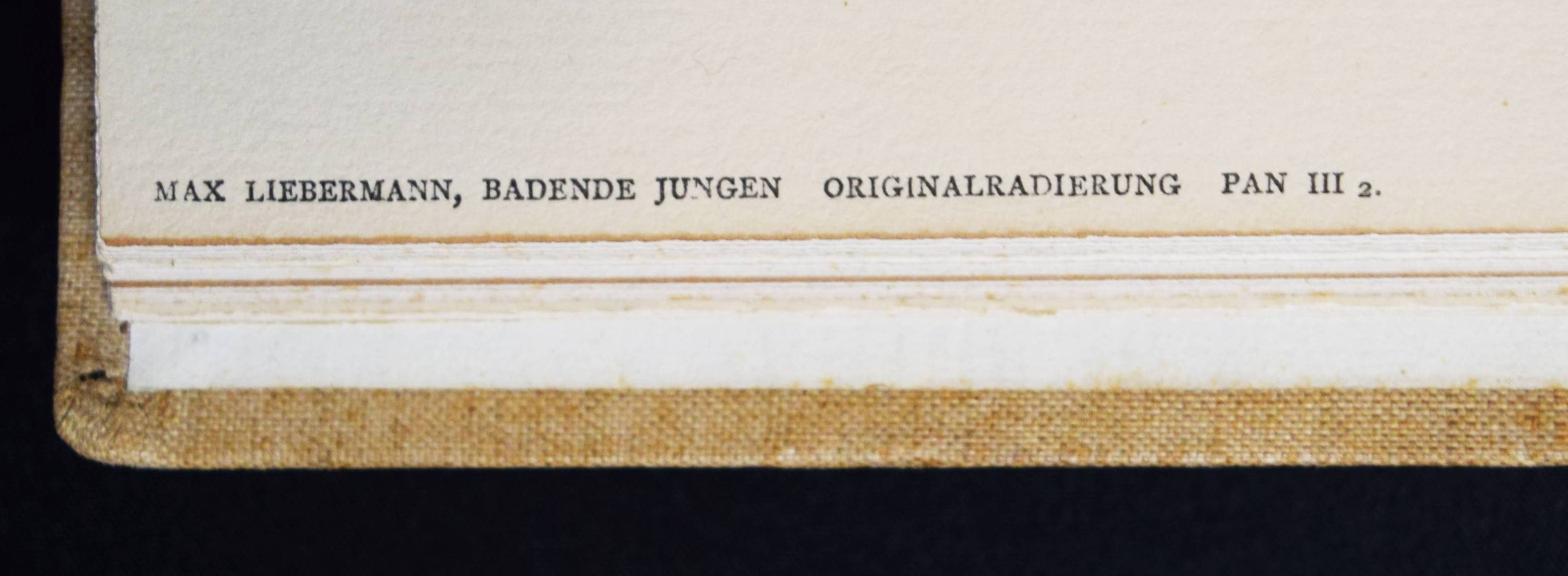 Bierbaum, Otto Julius, Julius Meier-Graefe u. a. (Red.). Pan. (Herausgegeben von der) Genossenschaft Pan. Erster (bis) Fünfter Jahrgang. 21 Hefte in 10 Bänden. Berlin, Verlag Pan 1895-1900. Folio (38 x 30 cm.). Mit 106 Originalgraphiken, 126 Tafeln, zwei Musikbeilagen und zahlreichen Textabbildungen sowie Buchschmuck. Orig.-Ldr. mit goldgepr. Deckelvignette (Jahrgang 1896) u. braune Hldr. d. Zt. mit blindgepr. Rückentiteln (illustr. Orig.-Umschläge beigebunden). Dokumentations-Bibliothek I, 426. Schauer I, 20 ff. Schlawe I, 48 ff. Söhn HDO 525, 526–530. – Eines von 70 num. Exemplaren der Vorzugsausgabe auf Kupferdruck-Papier von E. Obst & Co., Strassburg und Berlin, die Tafeln meist auf Kaiserl. Japan von R. Wagner in Berlin. – Sehr gutes und vollständiges Exemplar mit allen Originalgraphiken, einschließlich der bedeutenden Farblithographie „Mad. Marcelle Lender en buste“ von Henri Toulouse-Lautrec. – Mit den farbigen Umschlägen mit dem Pan-Kopf nach Franz Stuck, allen Titelblättern und Inhaltsverzeichnissen. – „Die nach ihrer Ausstattung erlesenste deutsche Zeitschrift; ihr Hauptverdienst liegt in der Förderung der neuen Buchkunst, die im wesentlichen mit ihr in Deutschland beginnt. … Von den anderen literarischen Zeitschriften unterscheidet ‚Pan‘ besonders sein umgreifender Inhalt (Literatur und Kunst), sein buchkünstlerisches Wollen und seine Ausstattung“ (F. Schlawe). – Mit Originalgraphiken unter anderem von Peter Behrens, Otto Eckmann, Ludwig von Kalckreuth, Max Klinger, Käthe Kollwitz, Max Liebermann, Hans Olde, August Rodin, Paul Signac, Otto Ubbelohde und Henry van de Velde. – Dazu: Pan. Prospect-Buch. Inhalts- und Mitgliederverzeichnis der drei Jahre 1895, 1896, 1897 der Zeitschrift „Pan“. Berlin 1898. OKart. – Der Jahrgang 1896 vollständig auf Kaiserl. Japan gedruckt und im Orig.-Verlagseinband mit einer signierten Orig.-Lithographie von Franz Naager. – Der Ledereinband teils geringfügig berieben, die Deckel der Halblederbände und Schnitte etwas braunfleckig, sehr schönes Exemplar; alle Originalgraphiken alle fleckenfrei.