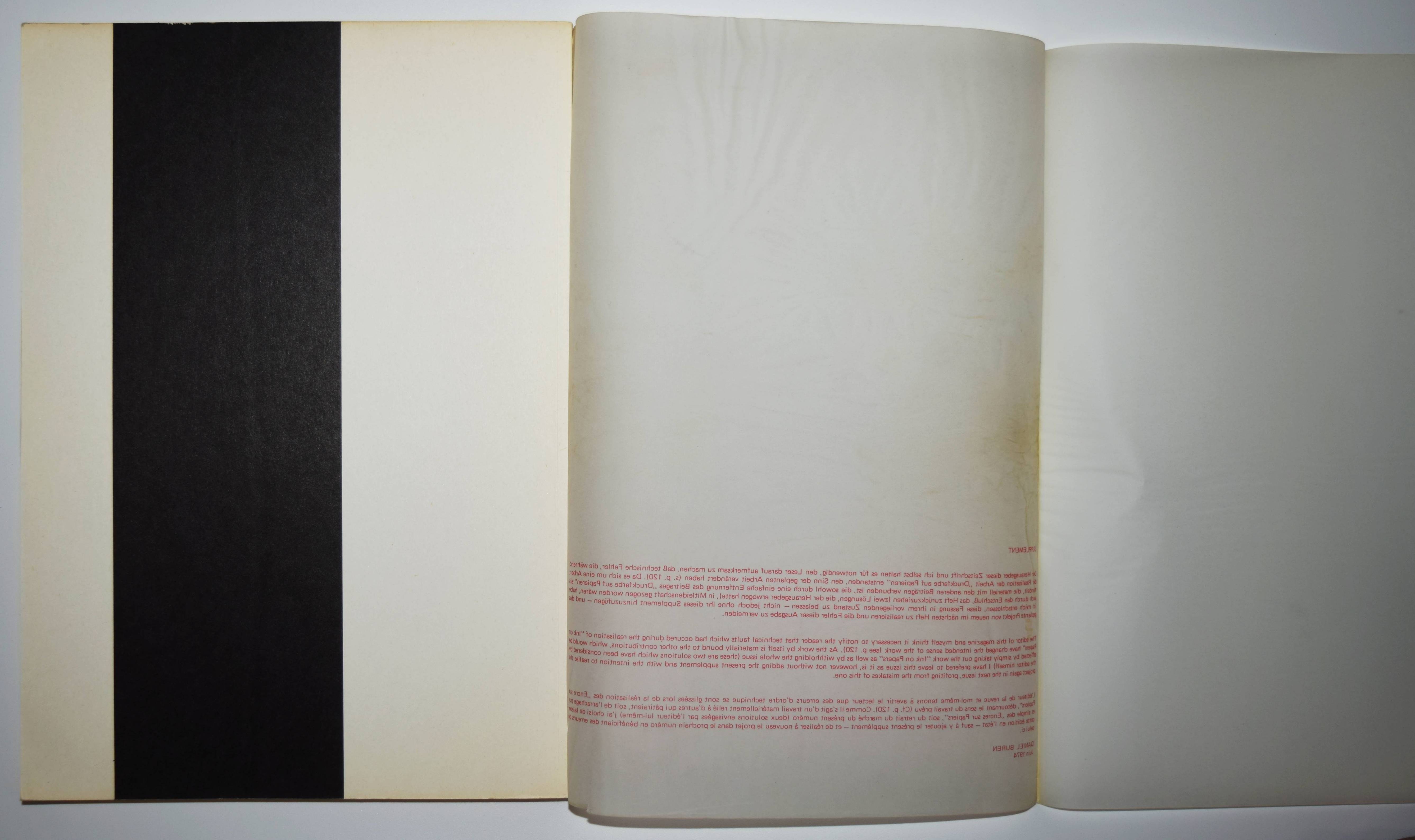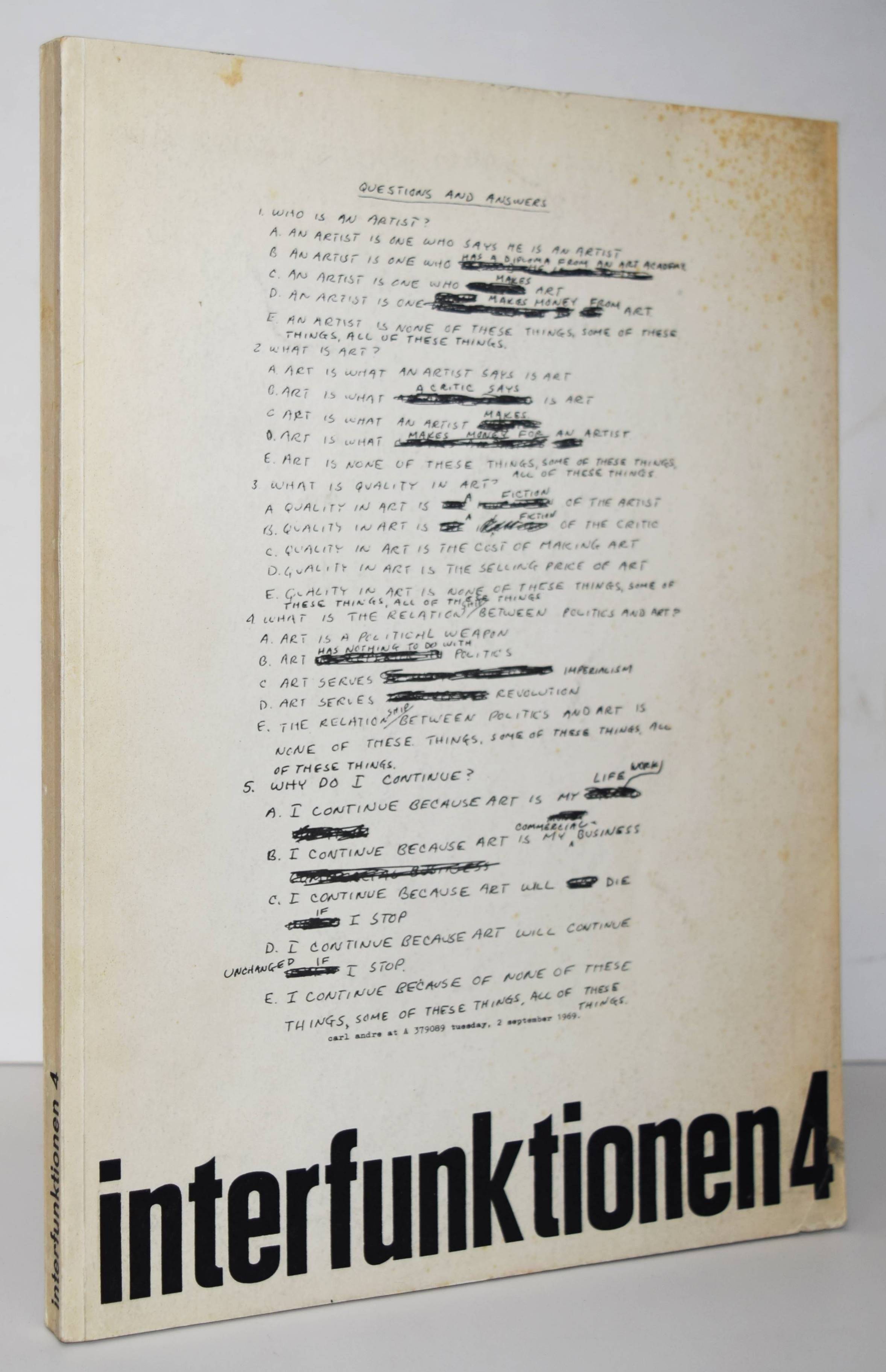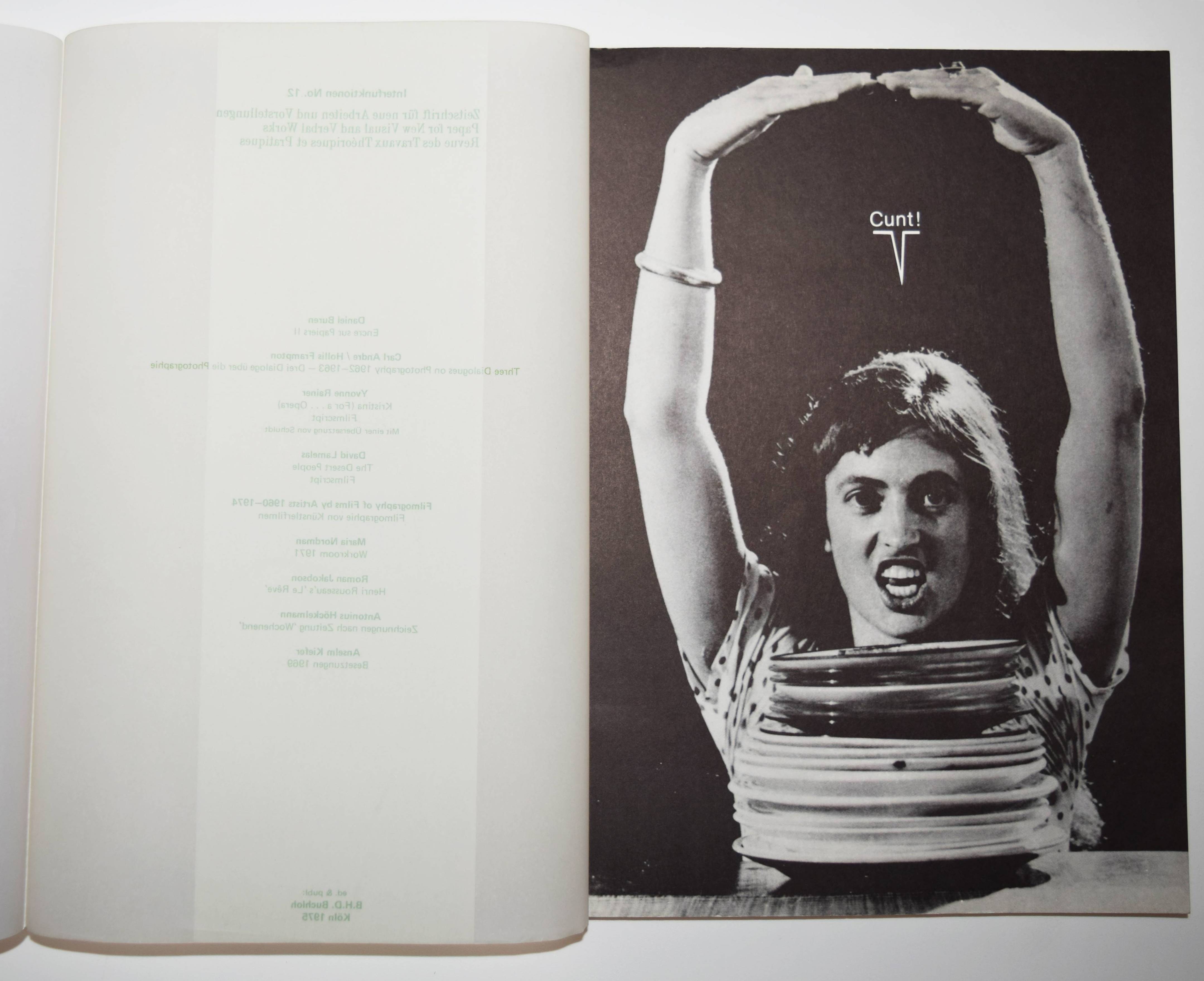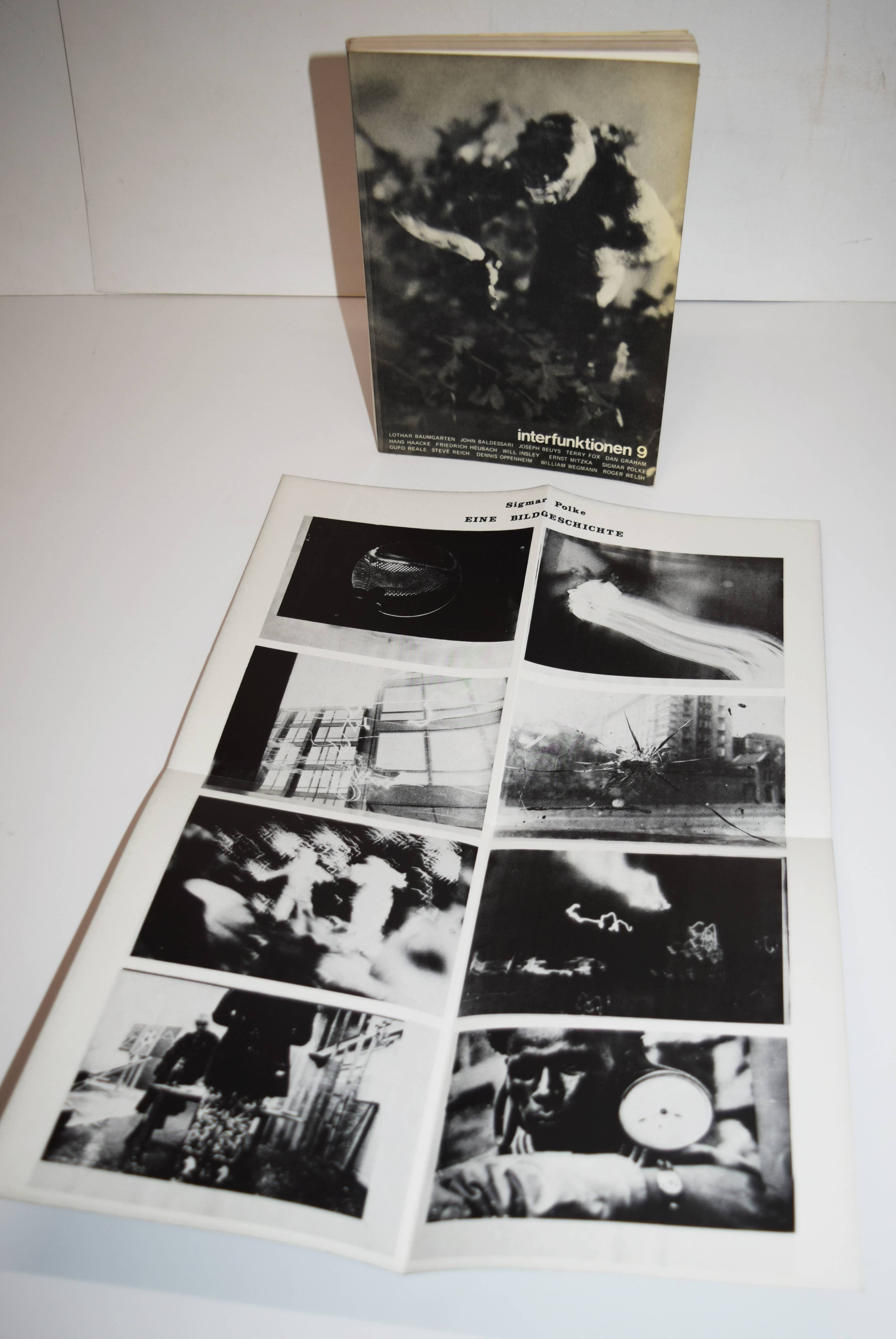 Heubach, Friedrich Wolfram und B. H. D. Buchloh (Hrsg.). Interfunktionen 1-12. Zeitschrift für neue Arbeiten und Vorstellungen. 12 Hefte. Köln 1968-1975. 4°. Mit zahlr. Abbildungen und Tafeln. Orig.-Kartonumschläge mit Schutzumschlägen. Vollständige Folge dieser wohl wichtigsten Periodika für Konzept und Avantgardekunst der zweiten Hälfte des 20. Jahrhunderts. Heft 1 hier in der zweiten Auflage als Faksimile (in 77 nummerierten und vom Herausgeber monogrammierten Exemplaren erschienen), alle weiteren Hefte in ersten und einziger Auflage. – Mit Text- und Bildbeiträgen unter anderem von Joseph Beuys, Oswald Wiener, Tomas Schmit, Valie Export, Jan Dibbets, Gilbert & George, Christo, Mike Heizer, Peter Hutchinson, Dennis Oppenheim, Bruce Nauman, Richard Long, Robert Smithson, Buckminster Fuller, Nam June Paik, Dan Graham, Lothar Baumgarten, Will Insley, Panamarenko, Reiner Ruthenbeck, Vito Acconci, John Baldessari, Marcel Broodthaers, Anselm Kiefer und Sigmar Polke. – Umschlag von Heft 2 am Kapital mit 2 kl. Einrissen, gutes vollständiges Exemplar mit den Beilagen in den Bänden 9 und 10. Heft 3 mit der Werbebeilage „Wolf Vostell – putzen“.
