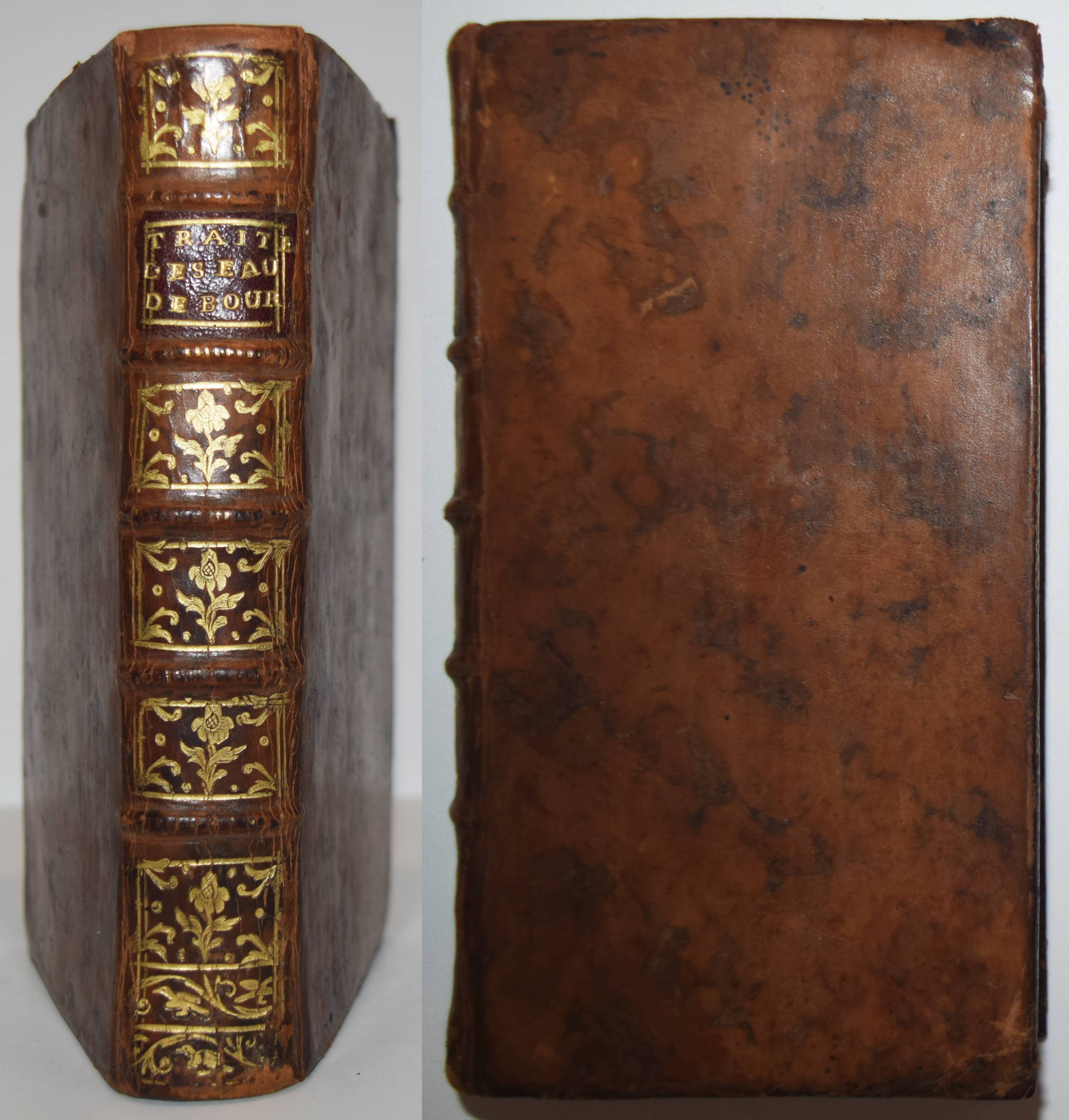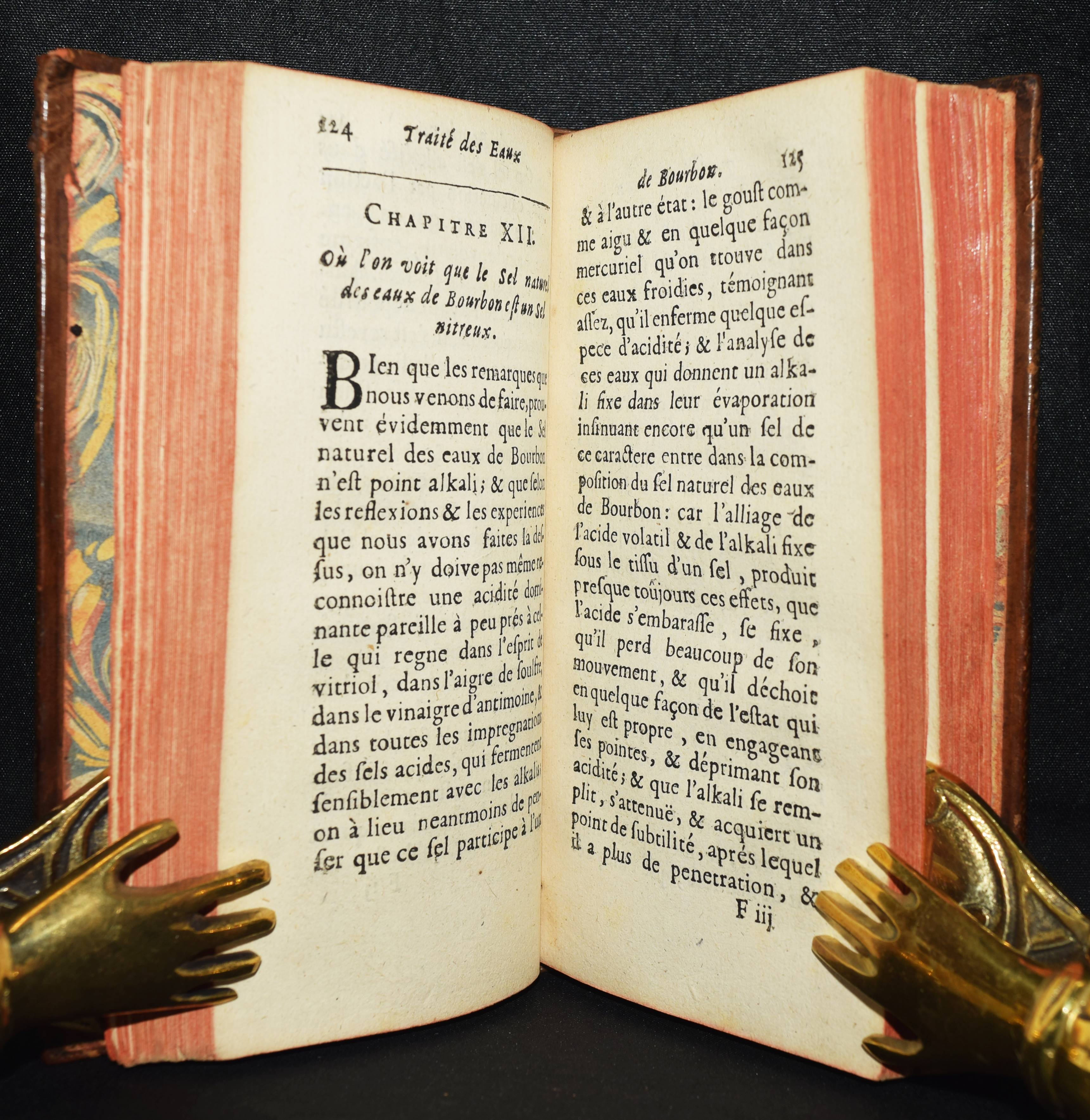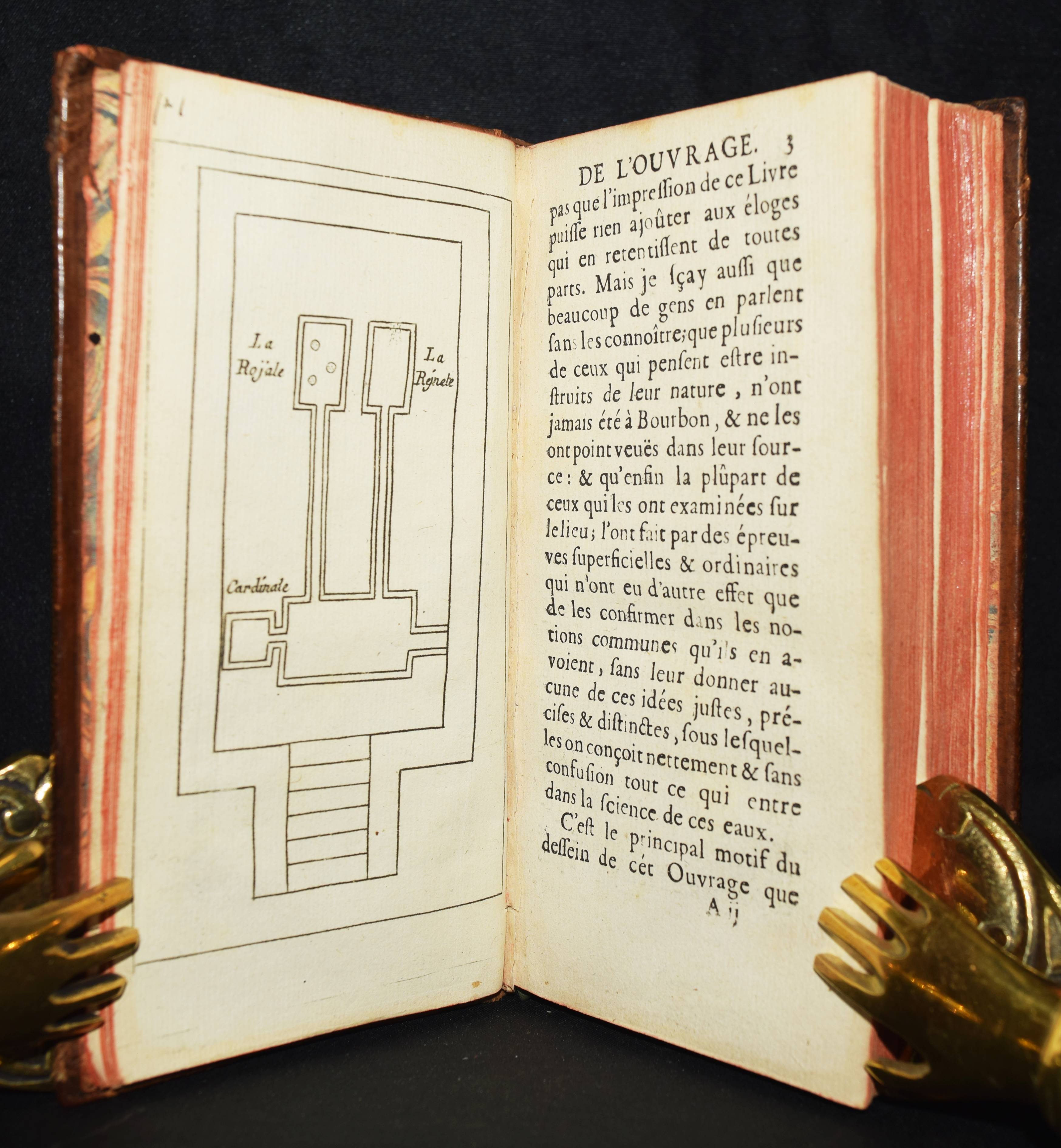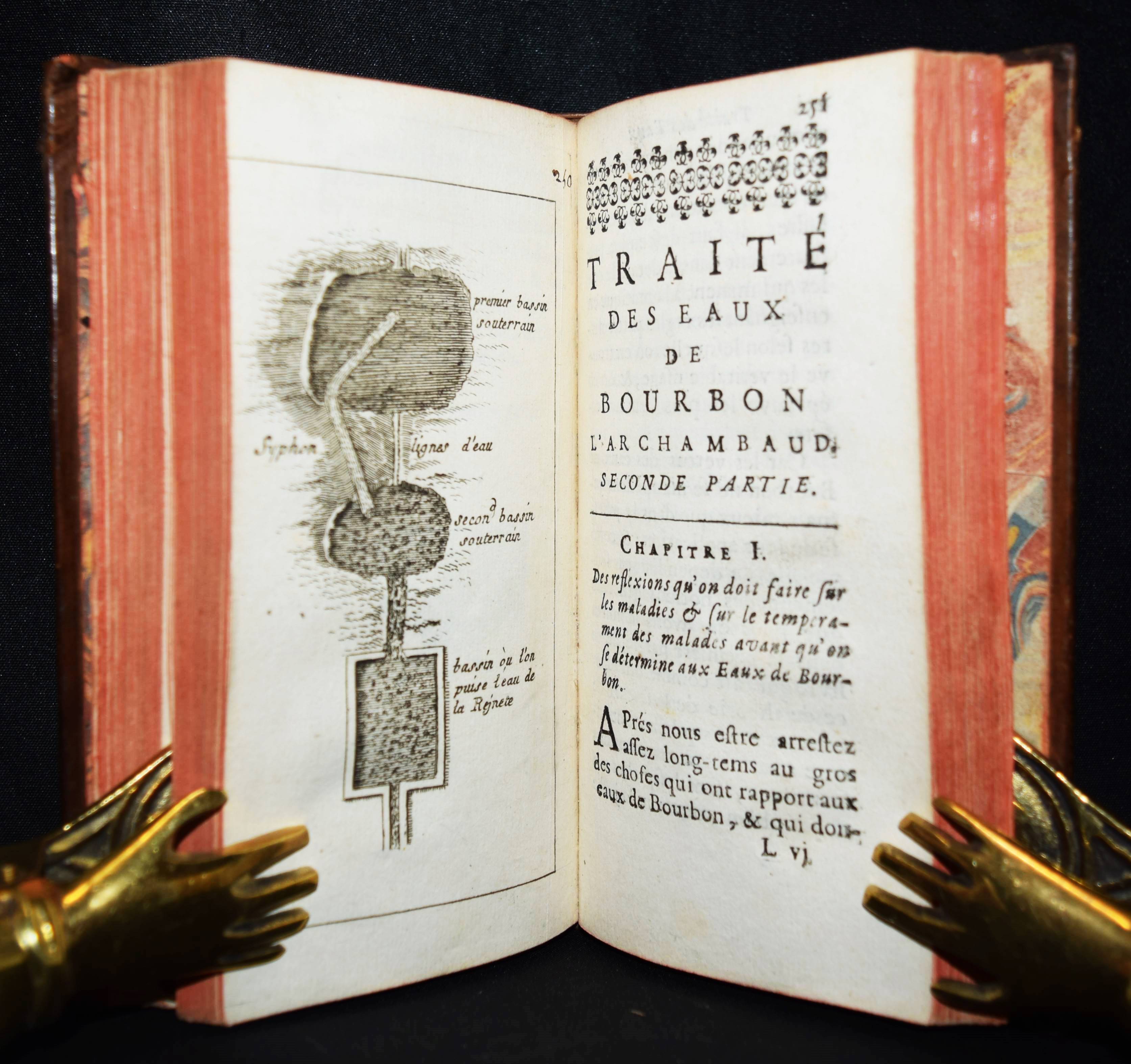 Pascal, J(ean). Traité des eaux de Bourbon l’Archambaud. Selon les principes de la nouvelle physique. 2 Teile in 1 Band. Paris, Laurent d’Houry 1699. Kl.-8° (16,5 x 9 cm.). [6] Bl., 373, (5) S. mit 3 Kupfertafeln. Ldr. d. Zt. mit goldgepr. Rückenschild, reicher floraler Rückenverg. u. Kantenverg. Zweite Ausgabe des seltenen balneologischen Werks. Die erste Ausgabe erschien 1698 ohne die Tafeln. – Der Mediziner J. Pascal beschreibt die Stadt Bourbon l’Archambaud und ihre Thermalquellen und befasst sich ausführlich mit den chemischen und medizinischen Eigenschaften des Quellwassers. Pascals Abhandlung ist das vierte Werk über die Heilquellen von Bourbon l’Archambaud nach denen von Jean Aubéri (1604), Isaac Cottier (1650) und François Le Rat (1677). – Sehr schönes sauberes und dekorativ gebundenes Exemplar.
