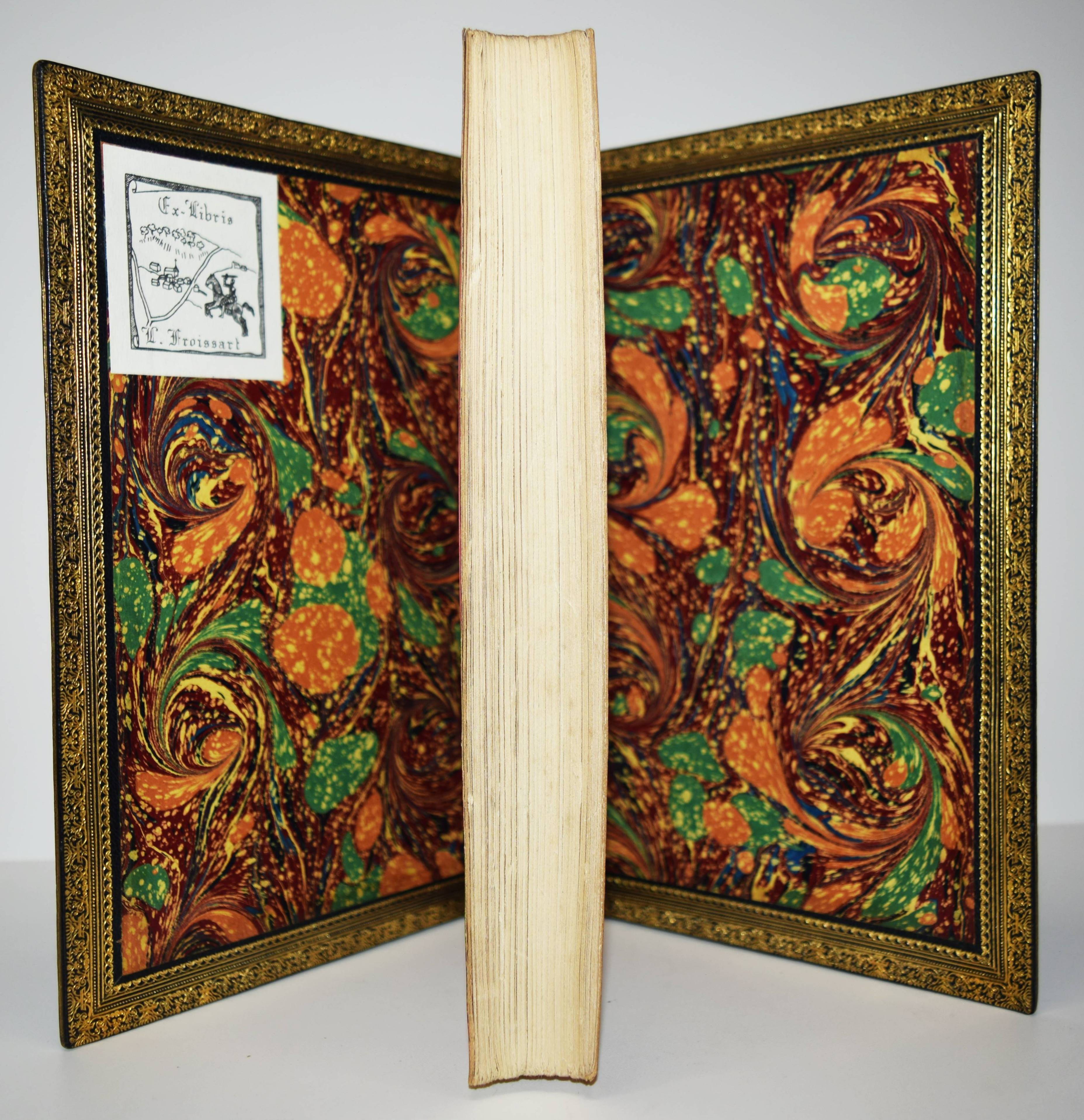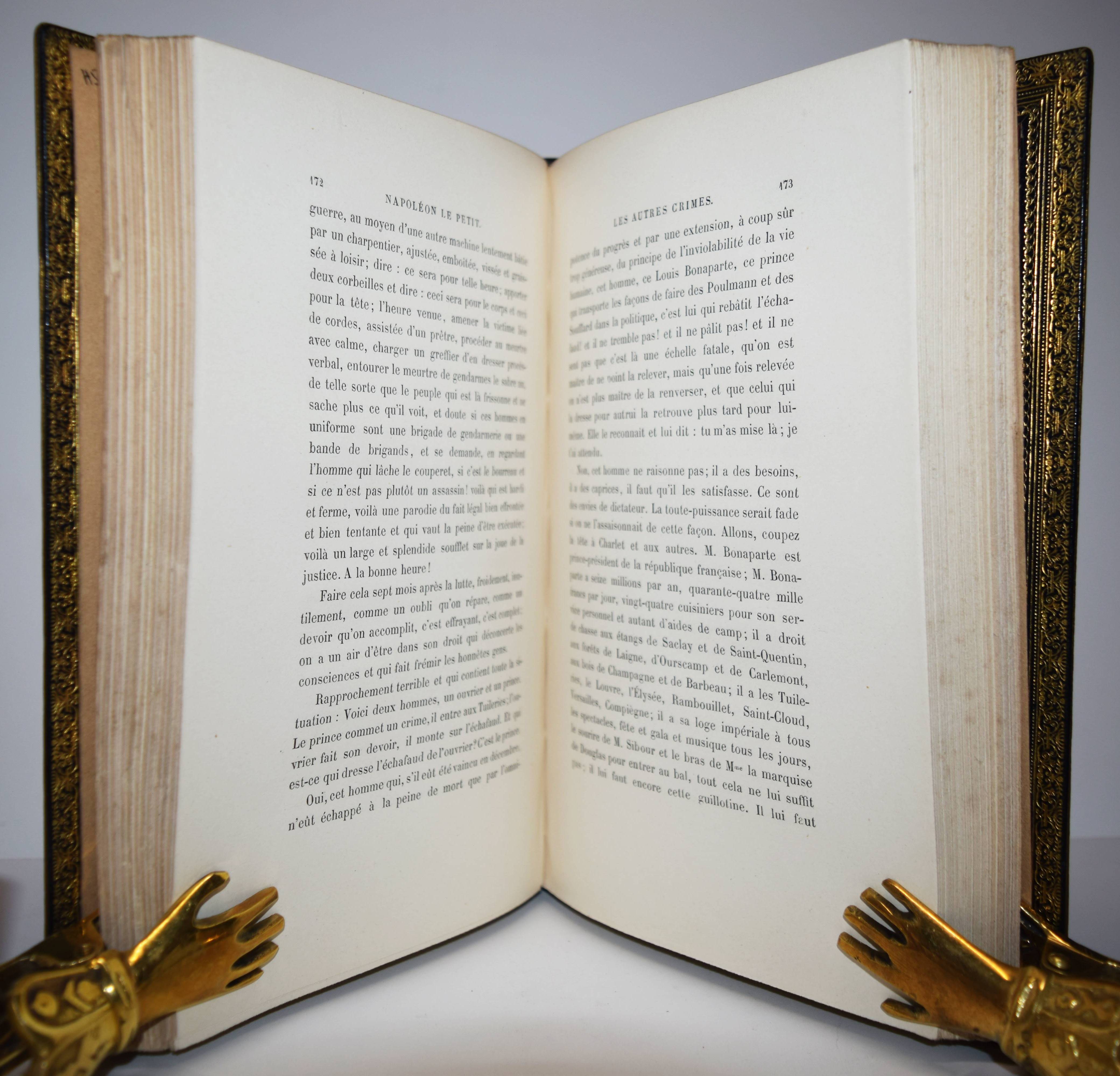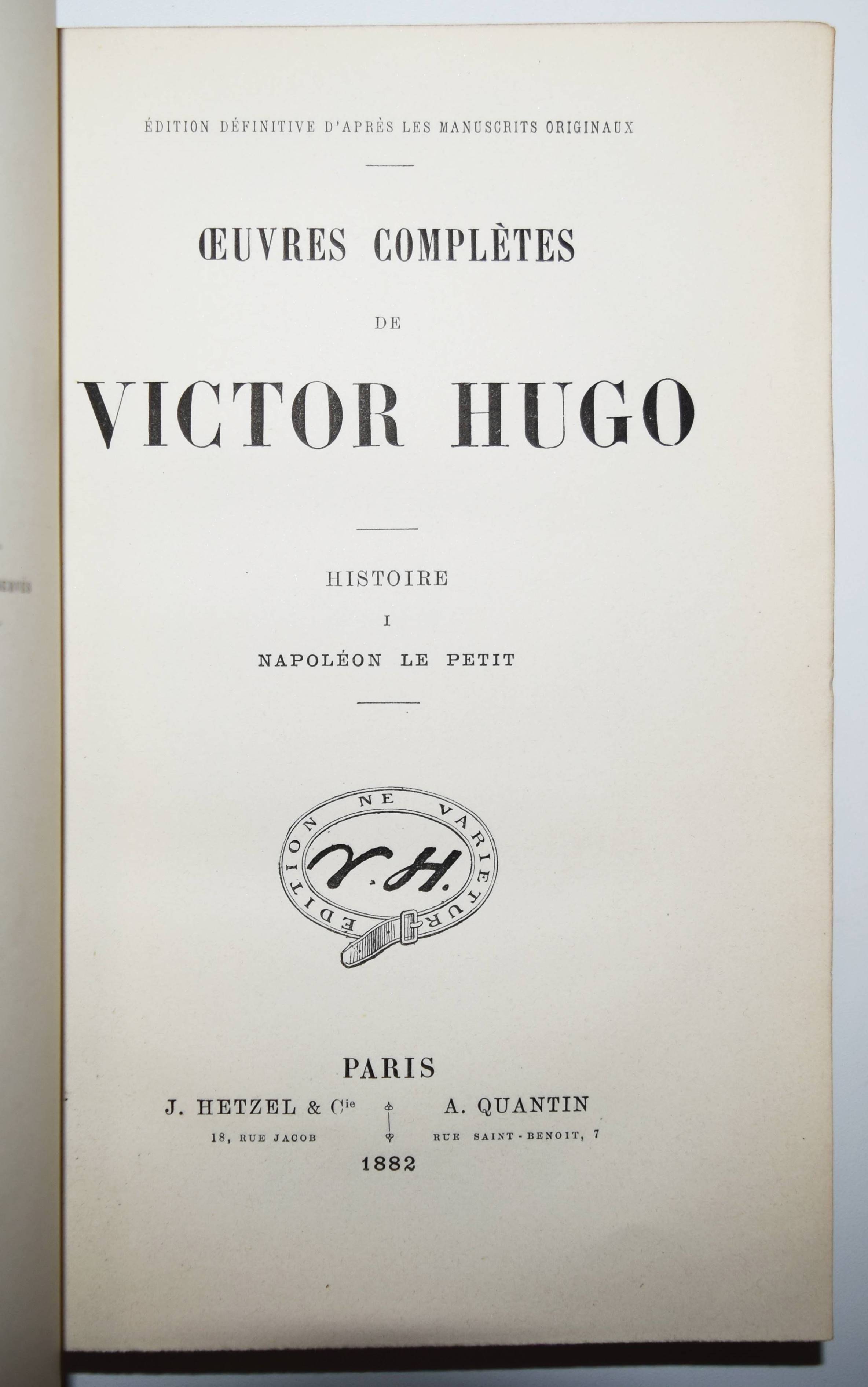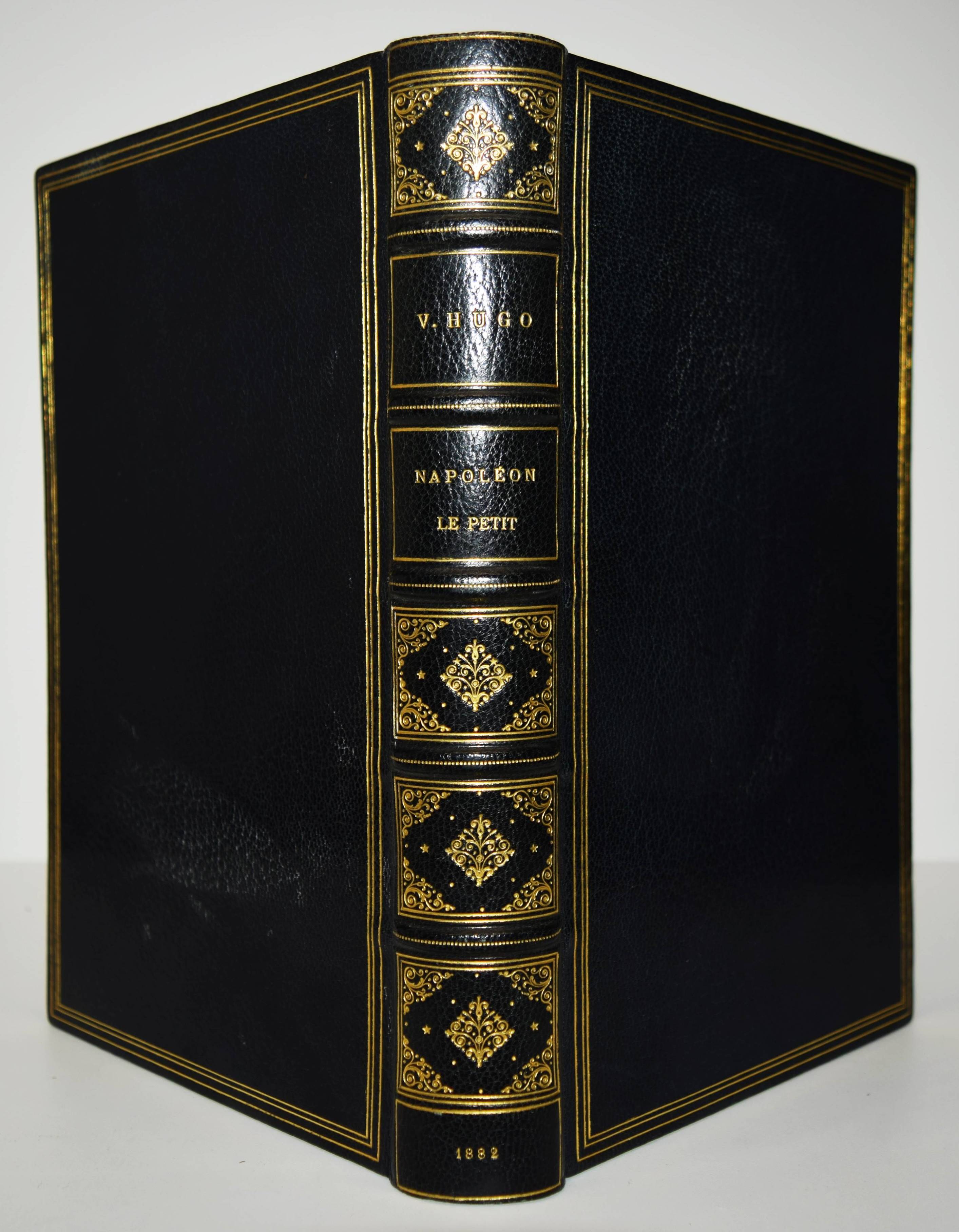 Hugo, Victor. Napoléon le Petit. Édition définitive d’après les manuscrits originaux. Paris, J. Hetzel & Cie. 1882. Gr.-8°. [2] Bl., 355, (1) S. Schwarzer Maroquineinband d. Zt. mit goldgepr. Rückentitel, Rückenverg., Deckelfiletten, Innenkantenverg. u. Kopfgoldschnitt. (Œuvres complètes de Victor Hugo; Histoire tome 1). Vicaire IV, 310. – Entgültige Ausgabe. Die erste Ausgabe erschien bereits 1852. – „Beim Ausbruch der Februarrevolution 1848 war er zunächst begeistert, schlug sich nach dem Juni-Aufstand der Pariser Arbeiter aber auf die Seite des konservativen „Parti de l’ordre“ und dann auf die des neugewählten Präsidenten Louis-Napoléon Bonaparte. Zum konservativen Abgeordneten gewählt, verwirrte er jedoch seine politischen Freunde durch sozial engagierte und politisch liberale Reden … Als Hugo sich gegen den Staatsstreich auflehnte, mit dem sich Bonaparte am 2. Dezember 1851 zum Präsidenten auf Lebenszeit machte, wurde er kurz inhaftiert und anschließend aus Frankreich verbannt. Er ließ sich auf den französischsprachigen, aber zu England gehörenden Kanalinseln nieder, erst auf Jersey und dann auf Guernsey, in Saint Peter Port, wo er das Hauteville House bewohnte. Von hier aus attackierte er Bonaparte, der sich am 2. Dezember 1852 als Napoléon III. zum Kaiser hatte ausrufen lassen, satirisch als „Napoléon le Petit“, als „Kleinen Napoleon“ (im Vergleich zu seinem großen Onkel)“ (Wikipedia). – Sehr schönes Exemplar in einem prachtvollen Handeinband.