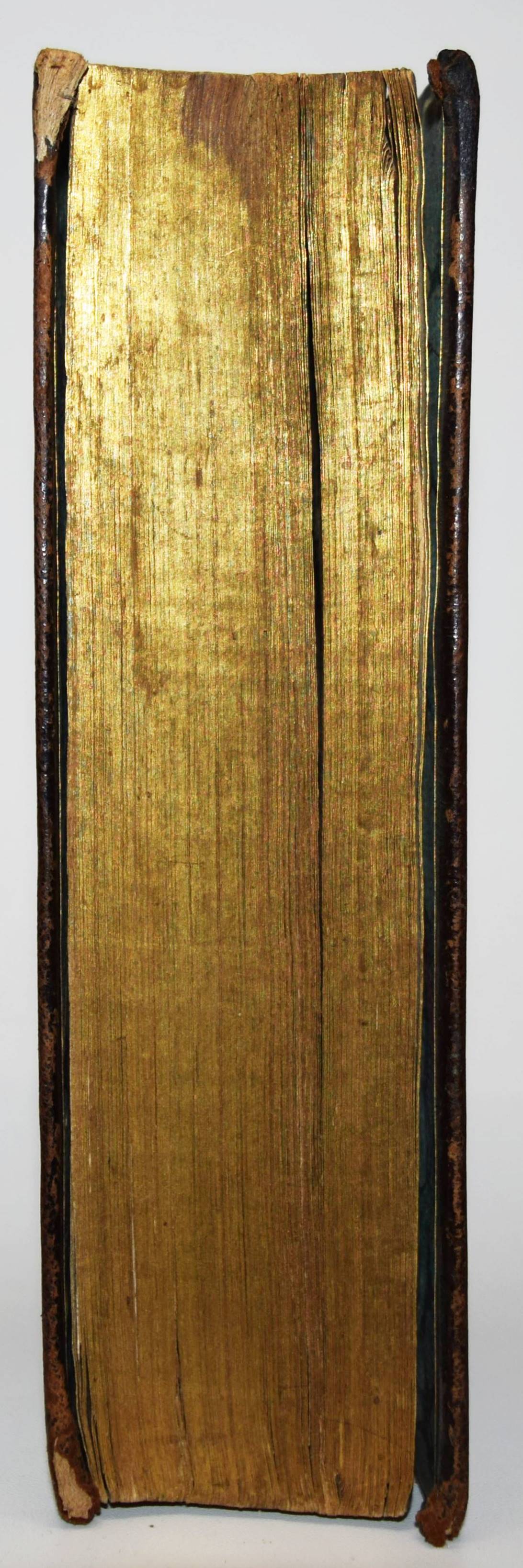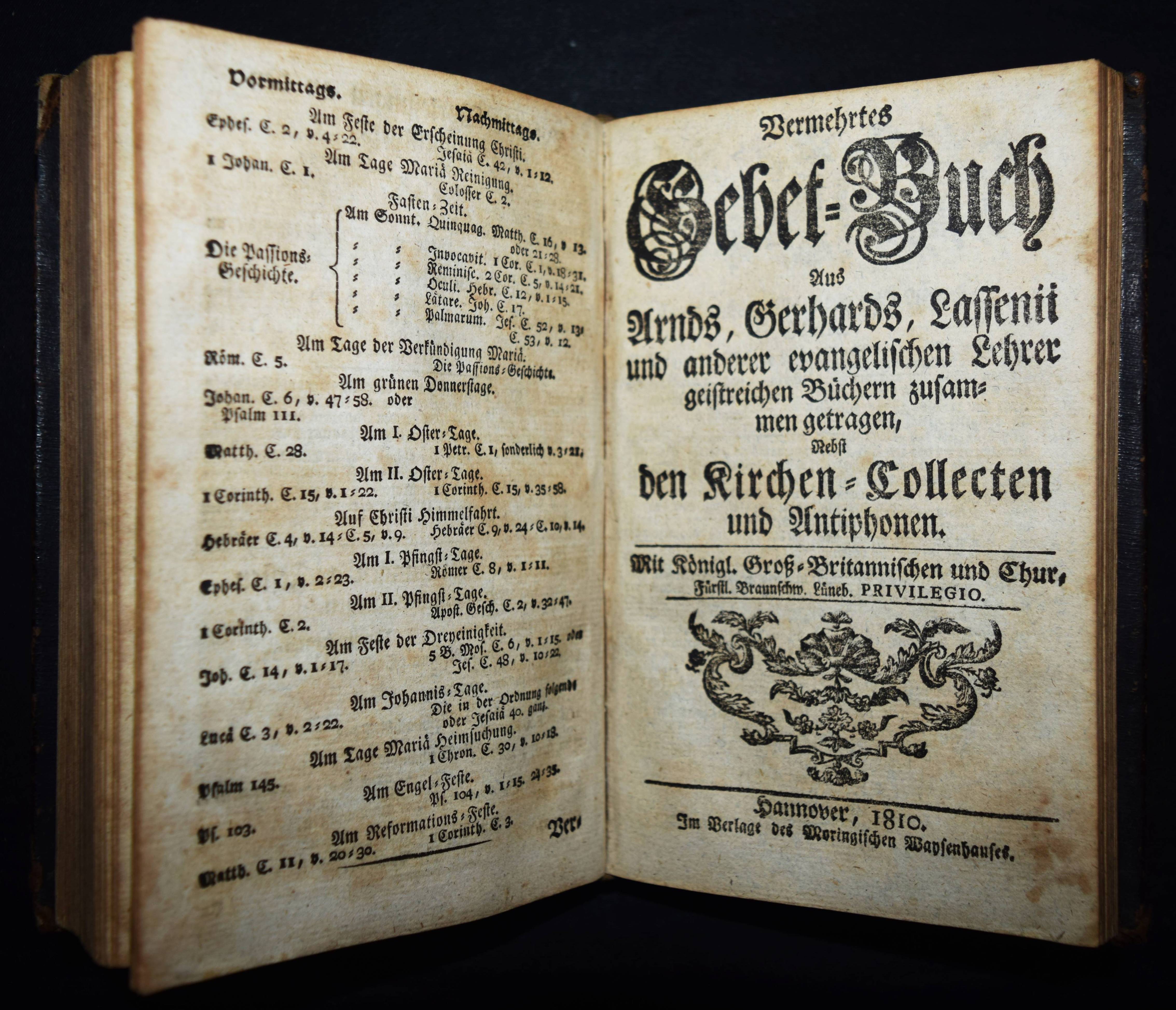 Hannöverisches Kirchen-Gesang-Buch, nebst einem Anhange neuer Gesänge und einem Gebetbuche. (Beigebunden): Vermehrtes aus Arnds, Gerhards, Lassenii und anderer evangelischen Lehrer geistreichen Büchern zusammen getragen, nebst den Kirchen-Collecten und Antiphonen. Die neun und dreißigste Aufl. mit stehenden Schriften. 2 Teile in 1 Band. Hannover, Verlag des Moringischen Waysenhauses 1810. 8°. 660 S., [6] Bl., 82 S.; 112 S. mit 2 Titelvignetten in Holzschnitt. Ldr. d. Zt. mit goldgepr. Deckel-Monogramm (D.E.L.) und Jahreszahl (1811) sowie Goldschnitt. Einband etwas berieben, durchgehend etwas gebräunt und braunfleckig, gutes Exemplar.