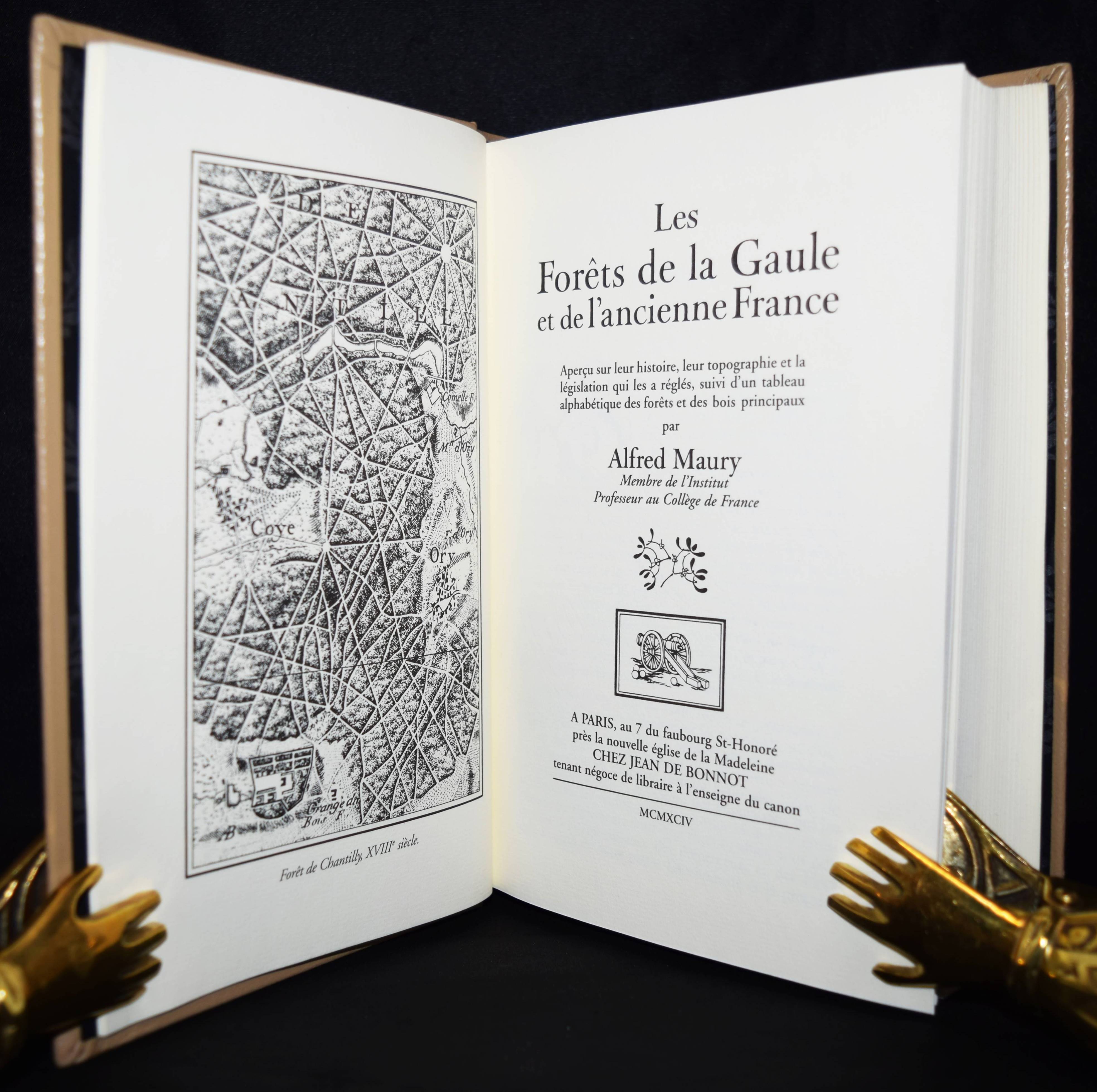 Maury, (Louis Ferdinand) Alfred. Les Forêts de la Gaule et de l’ancienne France. Aperçu de leur histoire, leur topographie et la législation qui les a régies, suivi d’un tableau alphabétique des forêts et des bois principaux. Paris, Jean de Bonnot 1994. 8°. [8] Bl., 473 S., [2] Bl. mit einigen Tafeln. Illustr. OLdr. mit Rücken- u. Deckelverg. u. Kopfgoldschnitt. Von J. de Bonnot signiert. – Bibliophil ausgestatteter Neudruck der Ausgabe Paris 1867. – Sehr gutes Exemplar.