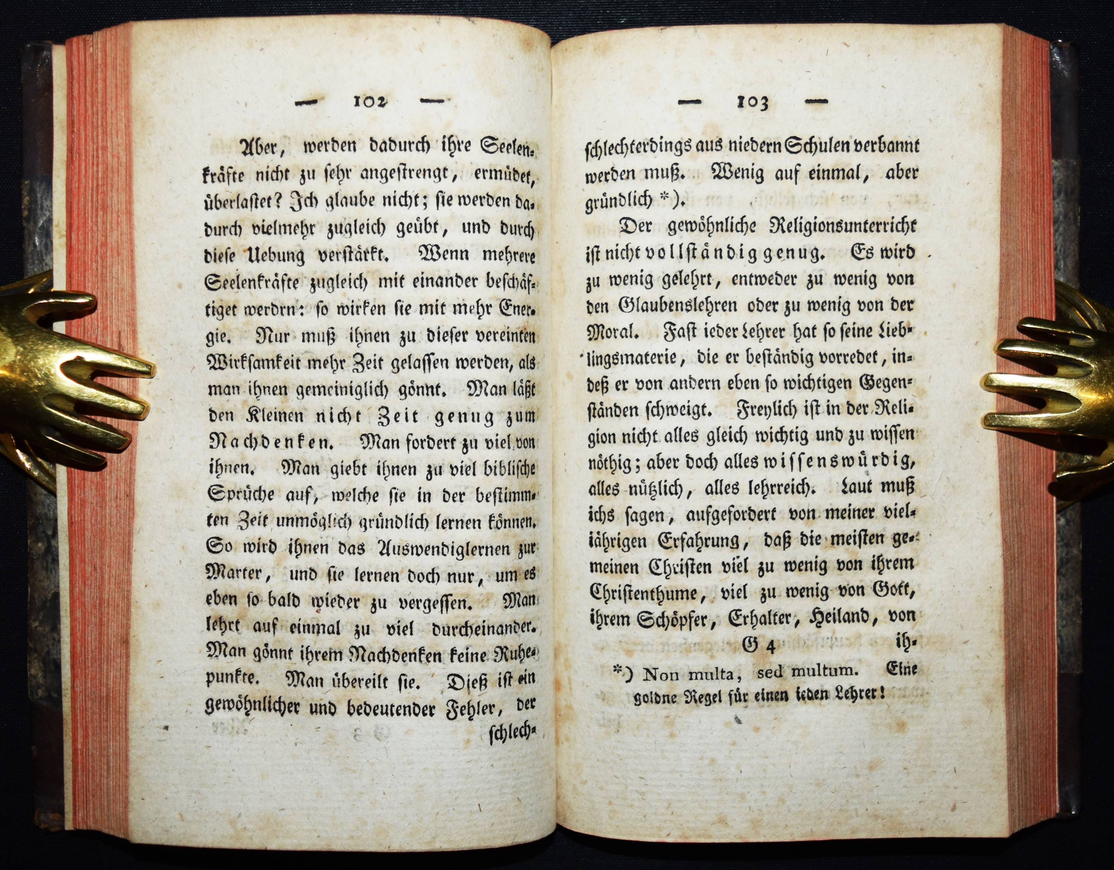(Wettengel, Friedrich Traugott). Lazarus, der Arme. O.O. u. Dr. (Greiz, Henning) 1806. Kl.-8°. 246 S. Hldr. d. Zt. mit goldgepr. Rückenschild. Erste und einzige Ausgabe, sehr selten. – Das Gleichnis vom reichen Mann und vom armen Lazarus ist eine biblische Erzählung aus dem Lukasevangelium (Lk 16,19–31 EU). Die Figur des Lazarus ist nicht identisch mit dem nach dem Johannesevangelium von Jesus Christus auferweckten Lazarus (Joh 11 EU). – F. G. Wettengel (1750-1824) studierte in Jena und Erlangen Philosophie und Theologie. 1775 ging er nach Greiz, wo ihn der Fürst Heinrich XI. von Reuß zum Hofkaplan ernannte. 1780 wurde ihm die Leitung des Waisenhauses übertragen. Wettengel hat zahlreiche theologische Schriften veröffentlicht. – Einband etwas berieben, vord. Gelenk am Kapital mit kl. Fehlstelle, durchgehend etwas braunfleckig, gutes Exemplar.