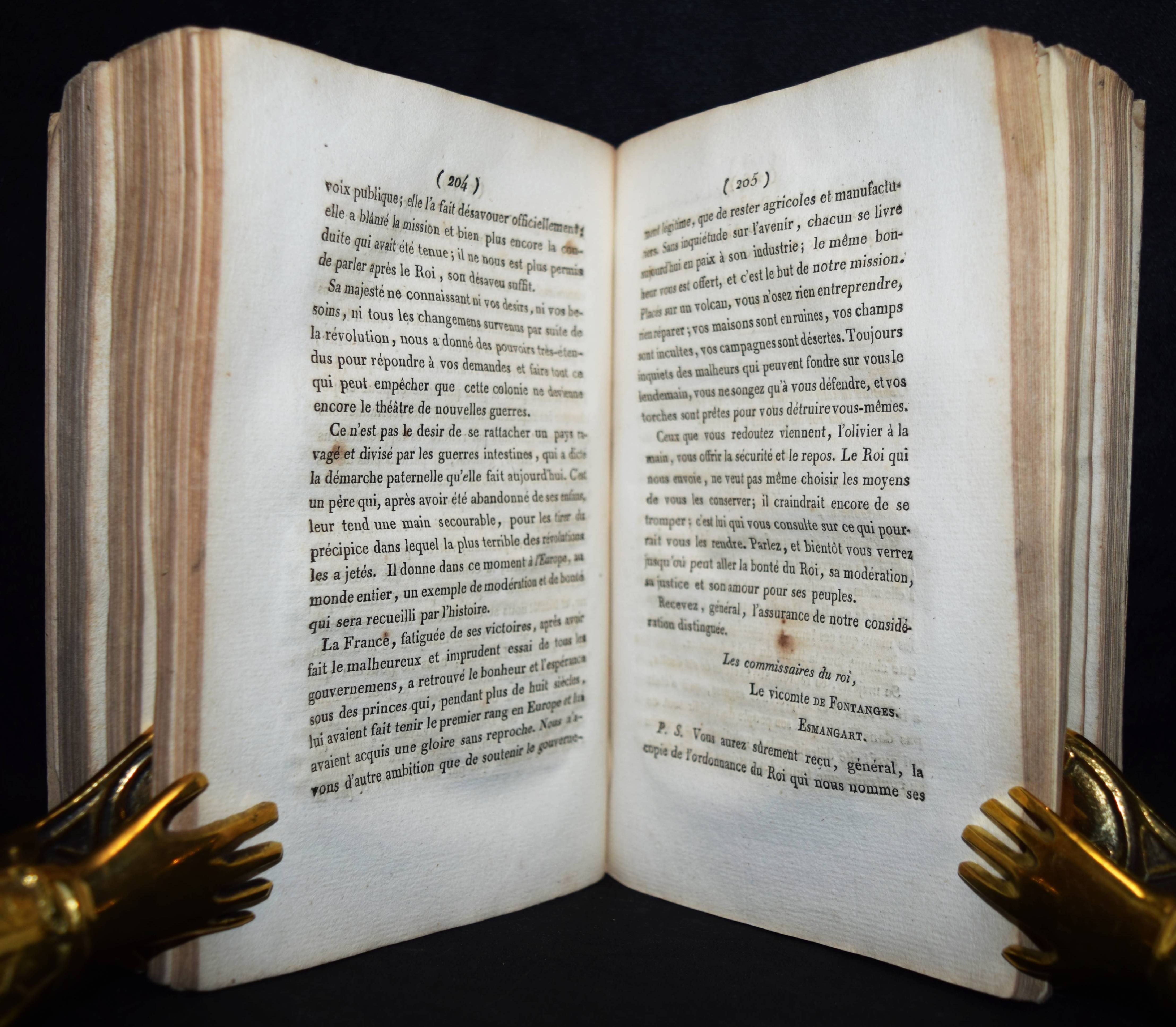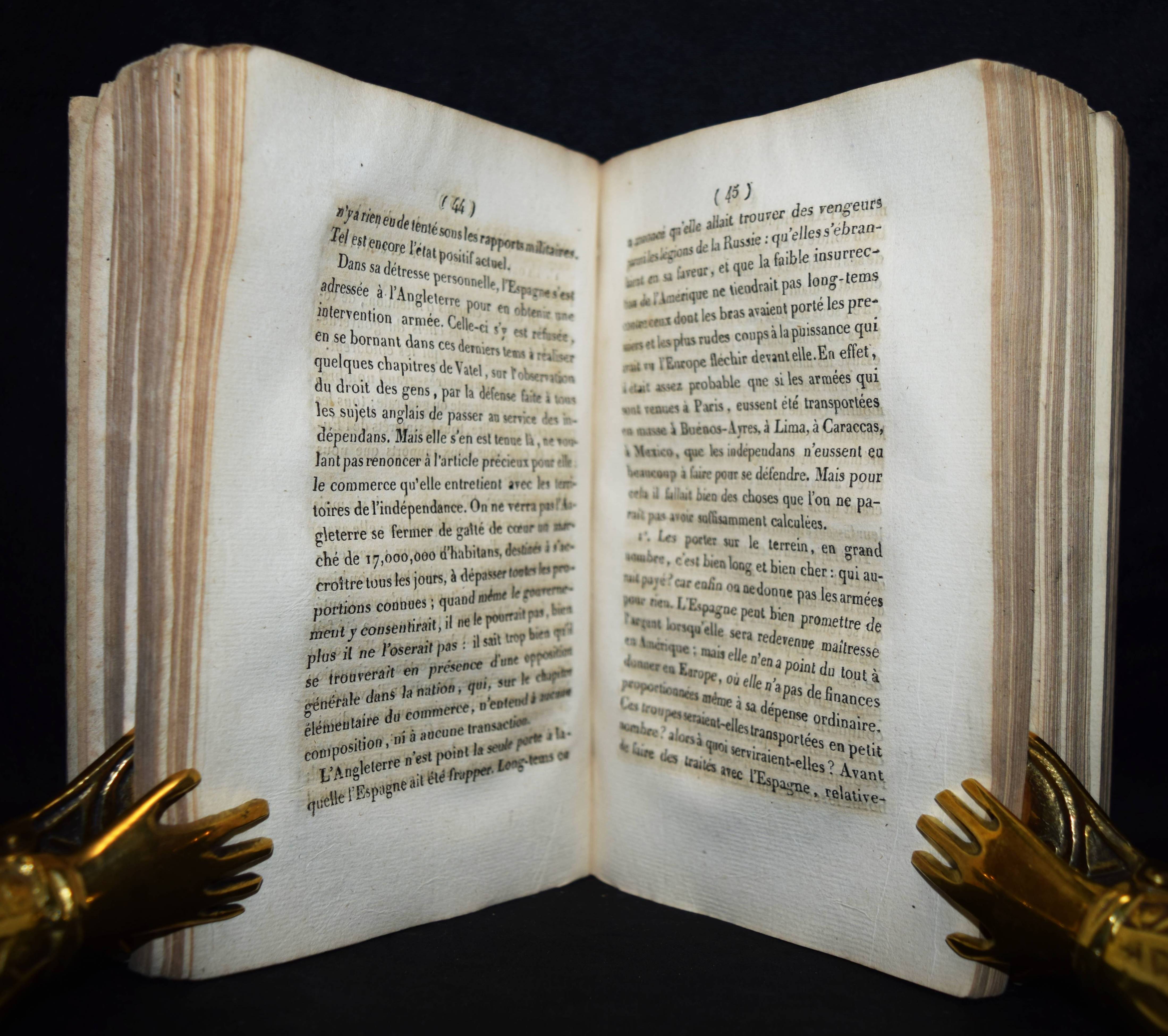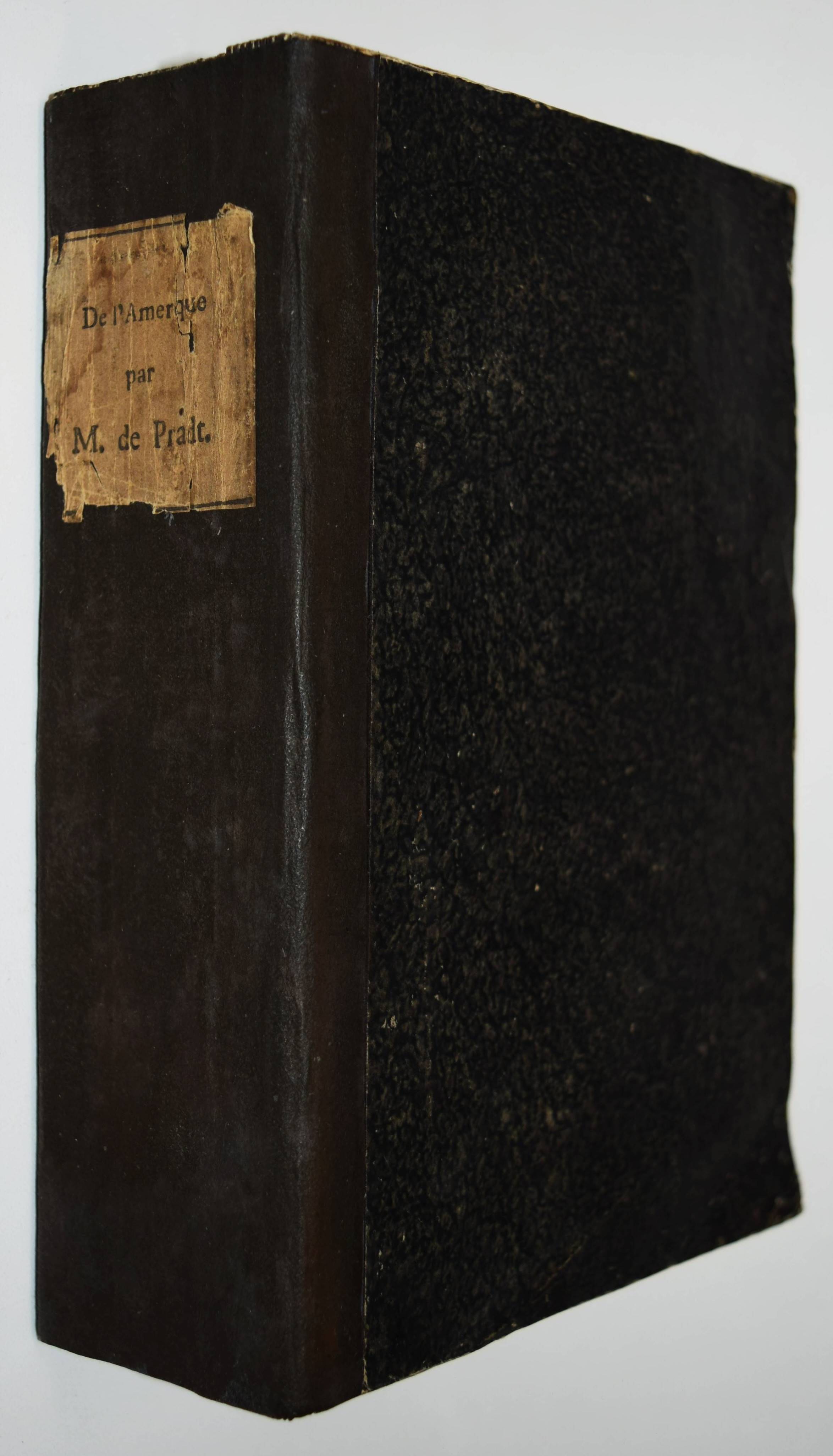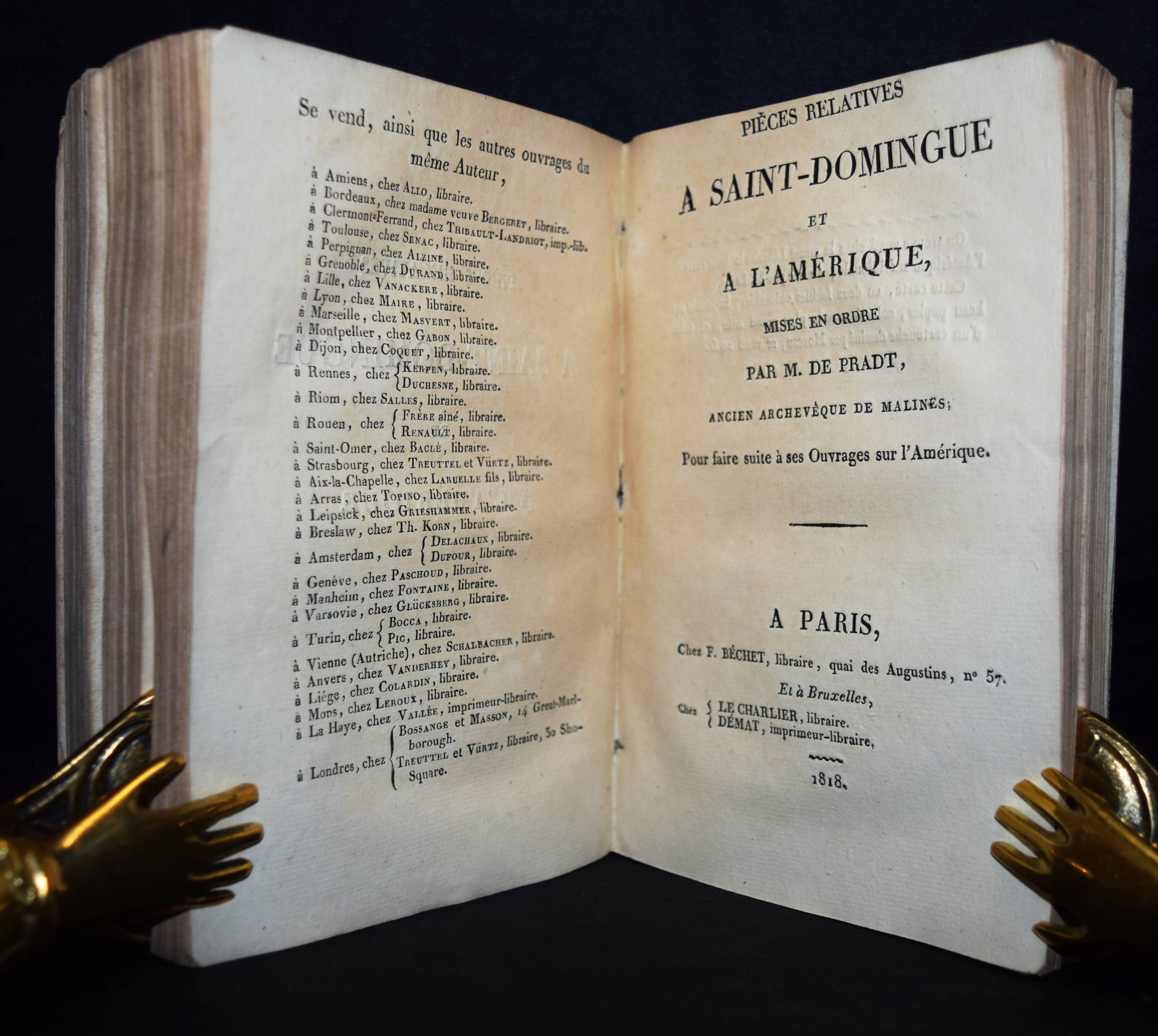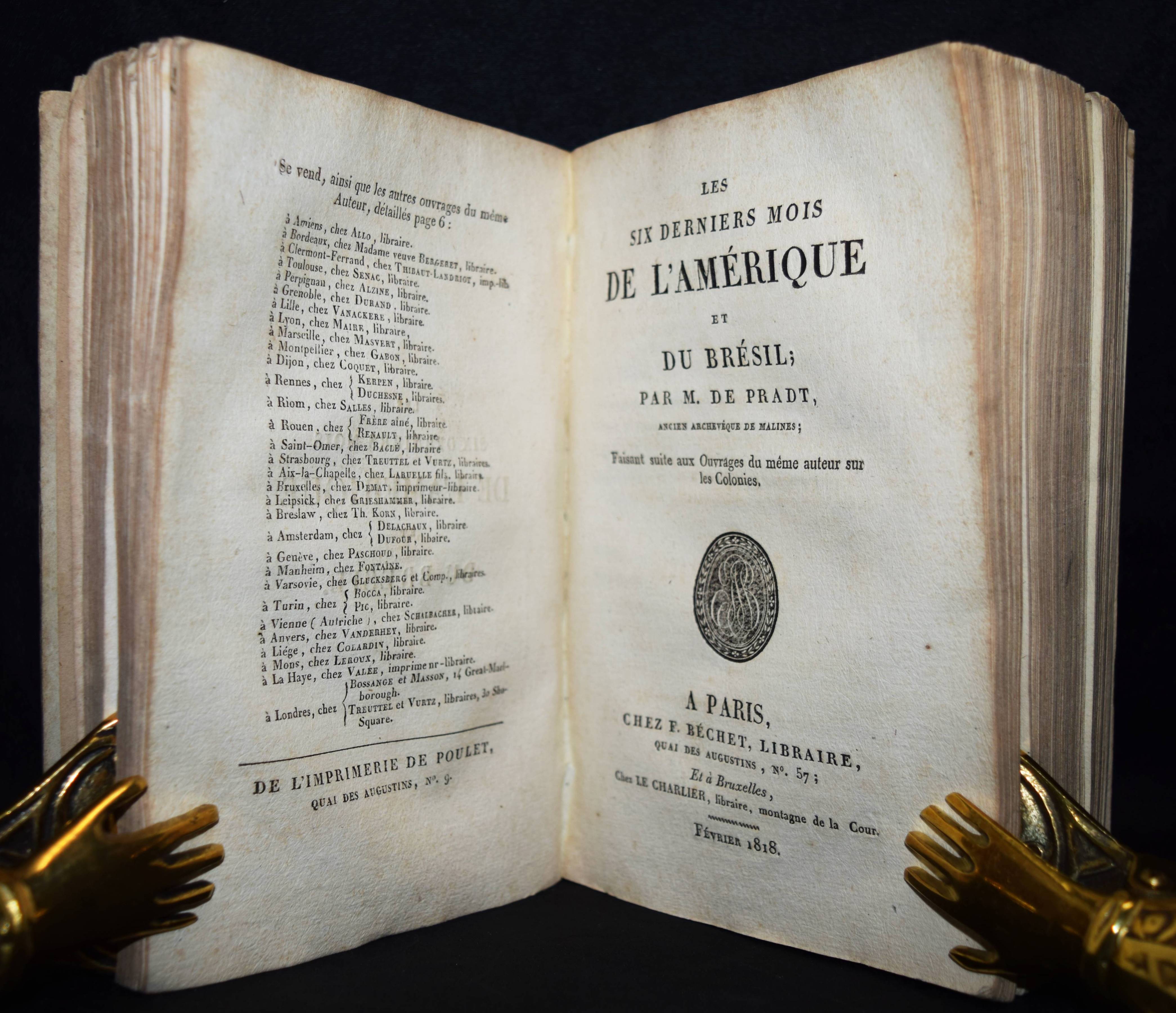 Pradt, (Dominique Dufour) de. Des trois derniers mois de l’Amérique Méridionale et du Brésil, suivis des personnalités et incivilités de la quotidiennne et du journal des débats. (Beigebunden): Ders. Les six derniers mois de l’Amérique et du Brésil. Faisant suite aux ouvrages du meme auteur sur les Colonies. – (Beigebunden): Ders. Pieces rélatives à Saint-Domingue et l’Amérique, mise en ordre. 3 Werke in 1 Band. Paris, F. Bechet 1817 u. 1818. 8°. [2] Bl., 160 S., [1] Bl.; [3] Bl., 267 S.; [2] Bl., 206 S., [1] Bl. Kart. d. Zt. mit Papierrückenschild. Palau 235.015. Sabin 64906, 64908 u. 64905. Vgl. Borba de Moraes 688. – Erste Ausgaben. – Vom Verleger F. Bechet auf dem Titel verso signiert. – Die Beschreibungen erschienen meist zusammen mit „Des colonies et de la Révolution actuelle de l’Amérique“ (Paris 1817). – D. D. de Pradt (1759-1837), franz. Diplomat und Erzbischof von Mechelen, berichtet hier besonders über die politischen Verhältnisse in Mittelamerika und Brasilien. – Rücken fachgerecht restauriert, St.a.T., stellenweise gebräunt und braunfleckig, sonst gut erhalten.