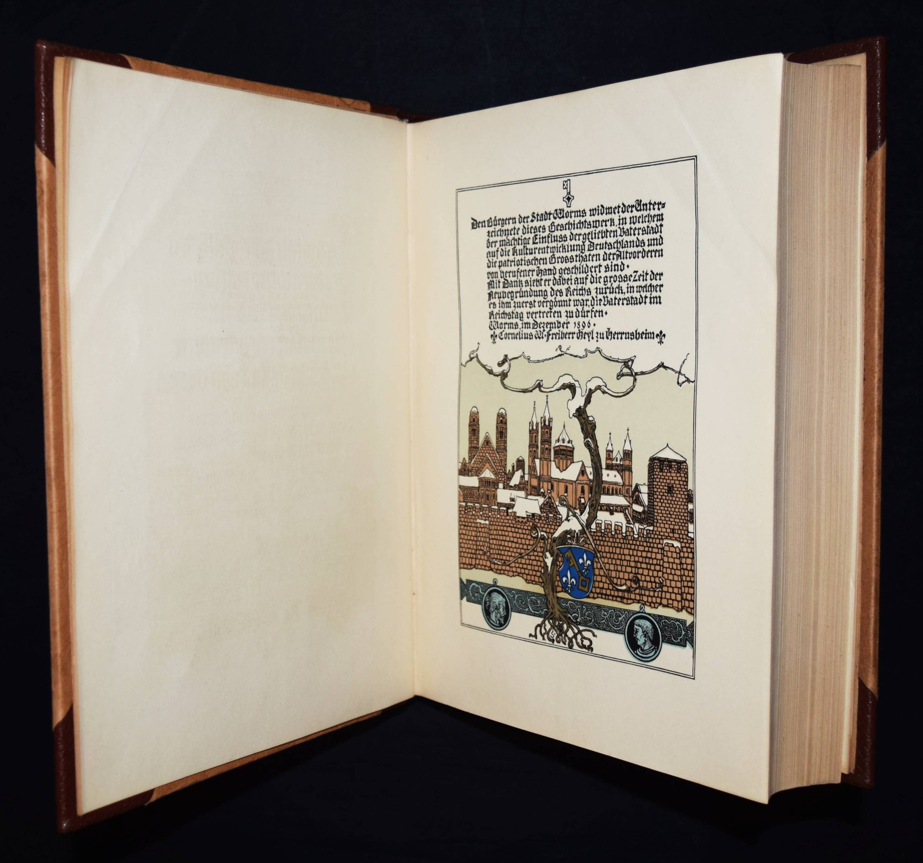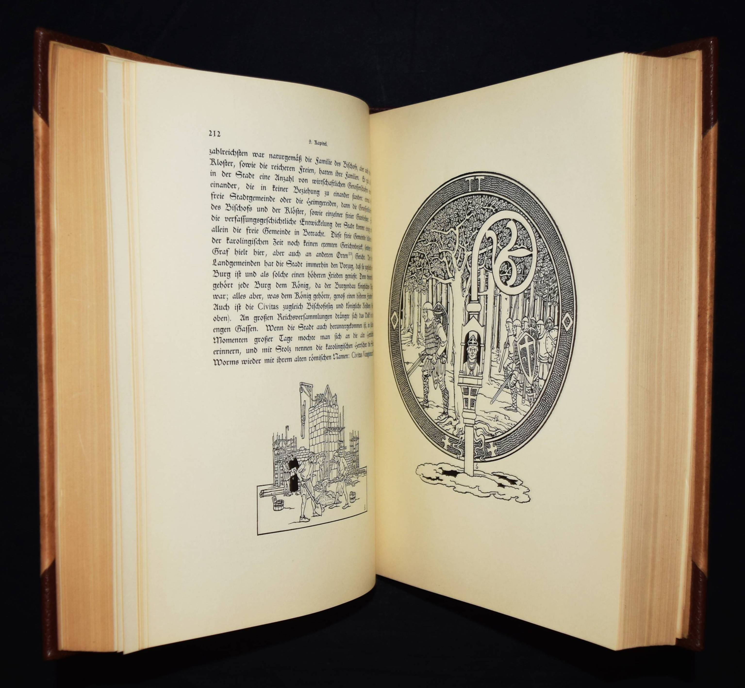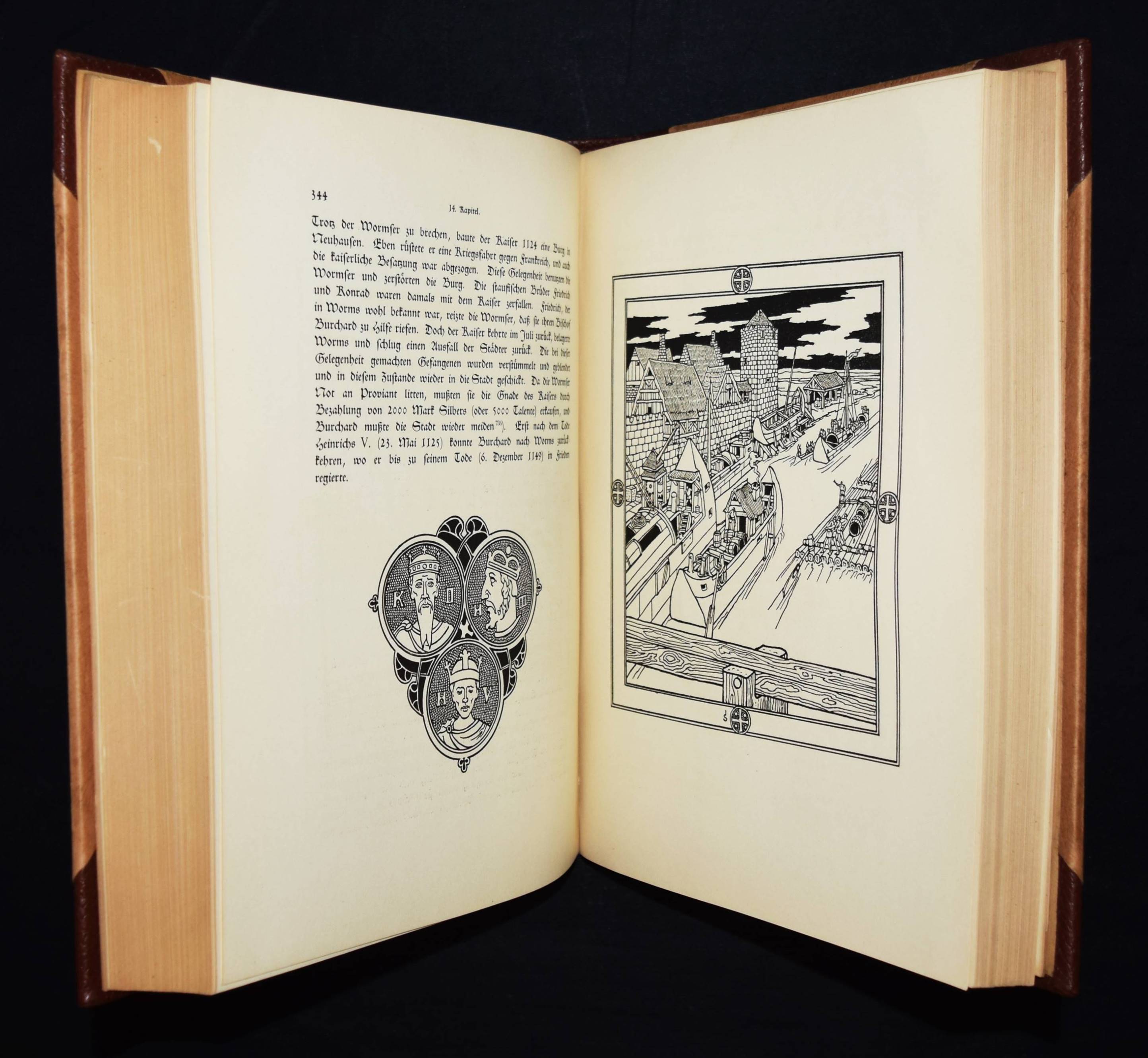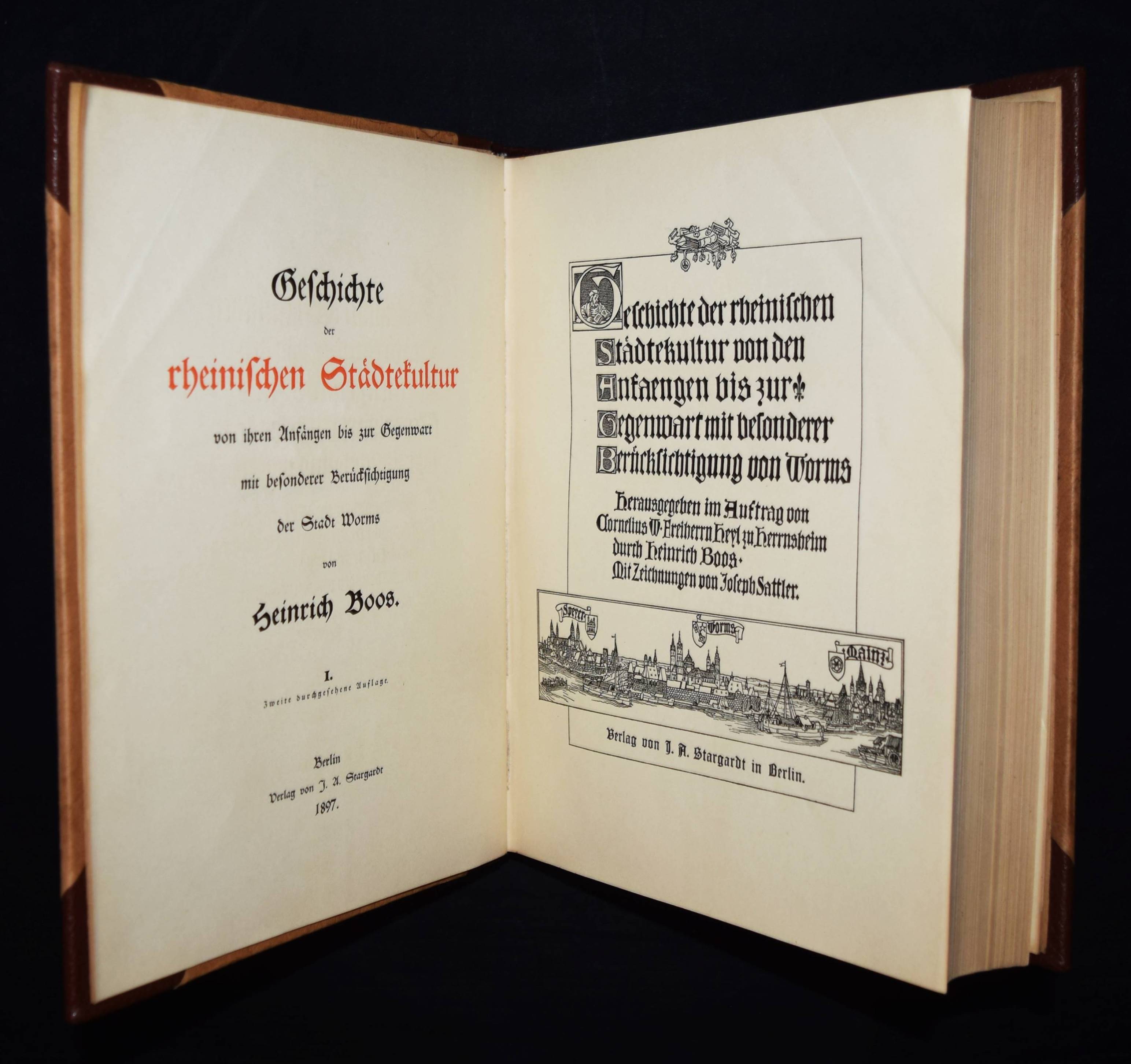 Boos, Heinrich. Geschichte der rheinischen Städtekultur von ihren Anfängen bis zur Gegenwart mit besonderer Berücksichtigung der Stadt Worms. 2. durchgesehene Aufl. 4 Bände. Berlin, J. A. Stargardt 1897-1901. 4°. Mit zahlr. (50 ganzs., 2 farb.) Illustrationen, Vignetten u. Initialen von Joseph Sattler. Hldr. d. Zt. Grautoff, Buchkunst 1901, S. 97 ff. Rodenberg S. 240. – Erste Ausgabe. – Aufwendig ausgestattetes Hauptwerk des Historikers H. Boos (1851-1917), entstanden im Auftrag von Cornelius W. Freiherr Heyl von Herrnsheim, den Bürgern seiner Vaterstadt Worms gewidmet. – „Ein illustriertes deutsches Geschichtswerk, das wir Kuglers Geschichte Friedrichs des Großen mit den Holzschnitten Menzels getrost an die Seite stellen können“ (H. Loubier). – „Größte und am meisten bewunderte Arbeit … hohen Lobes wert … von der Offizin Otto von Holten in Berlin mit unendlicher Sorgfalt durchgeführt“ (O. Grautoff). – Innengelenke teils etwas angeplatzt, Widm.a.V. von Band I, gutes sauberes Exemplar.