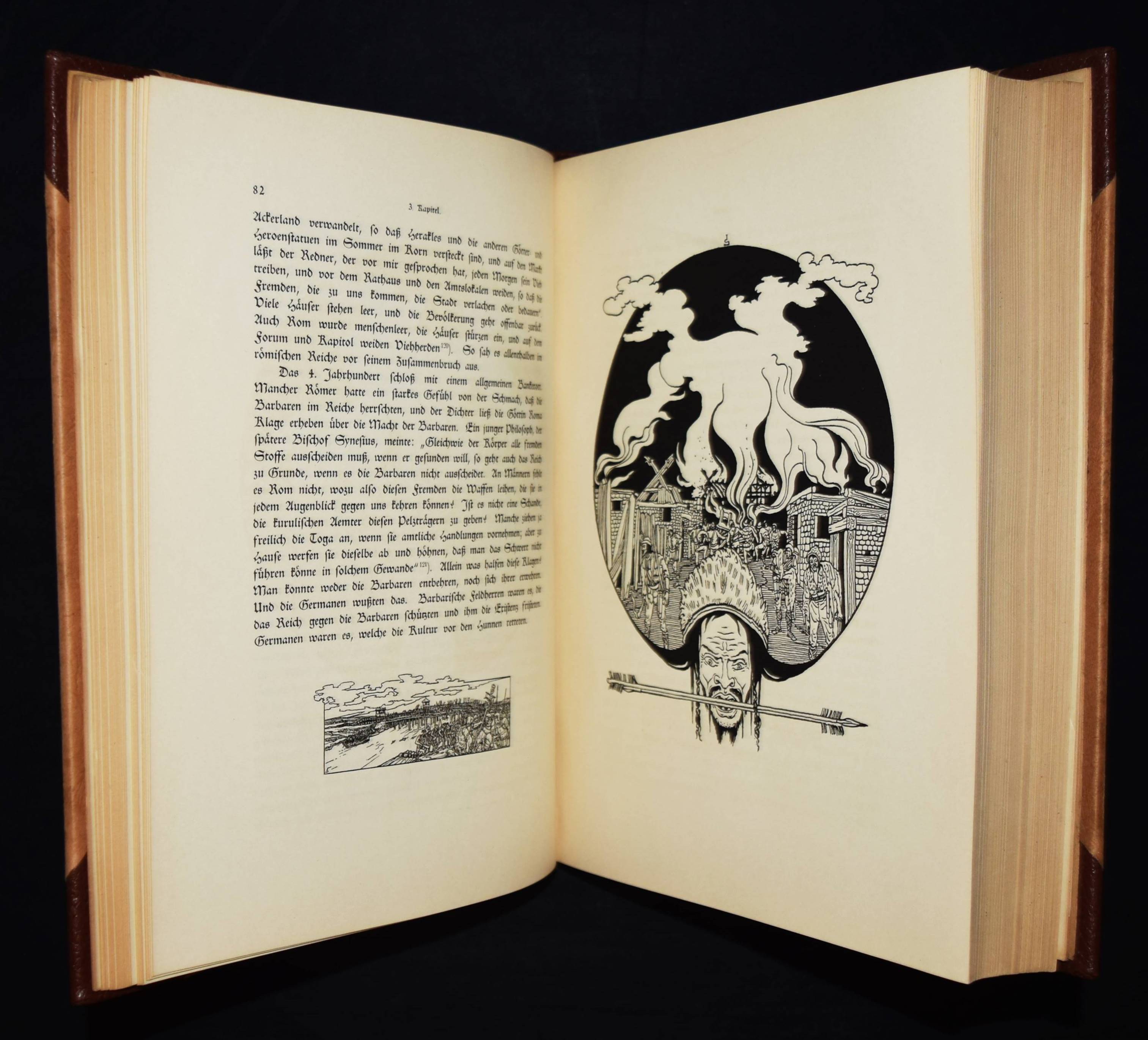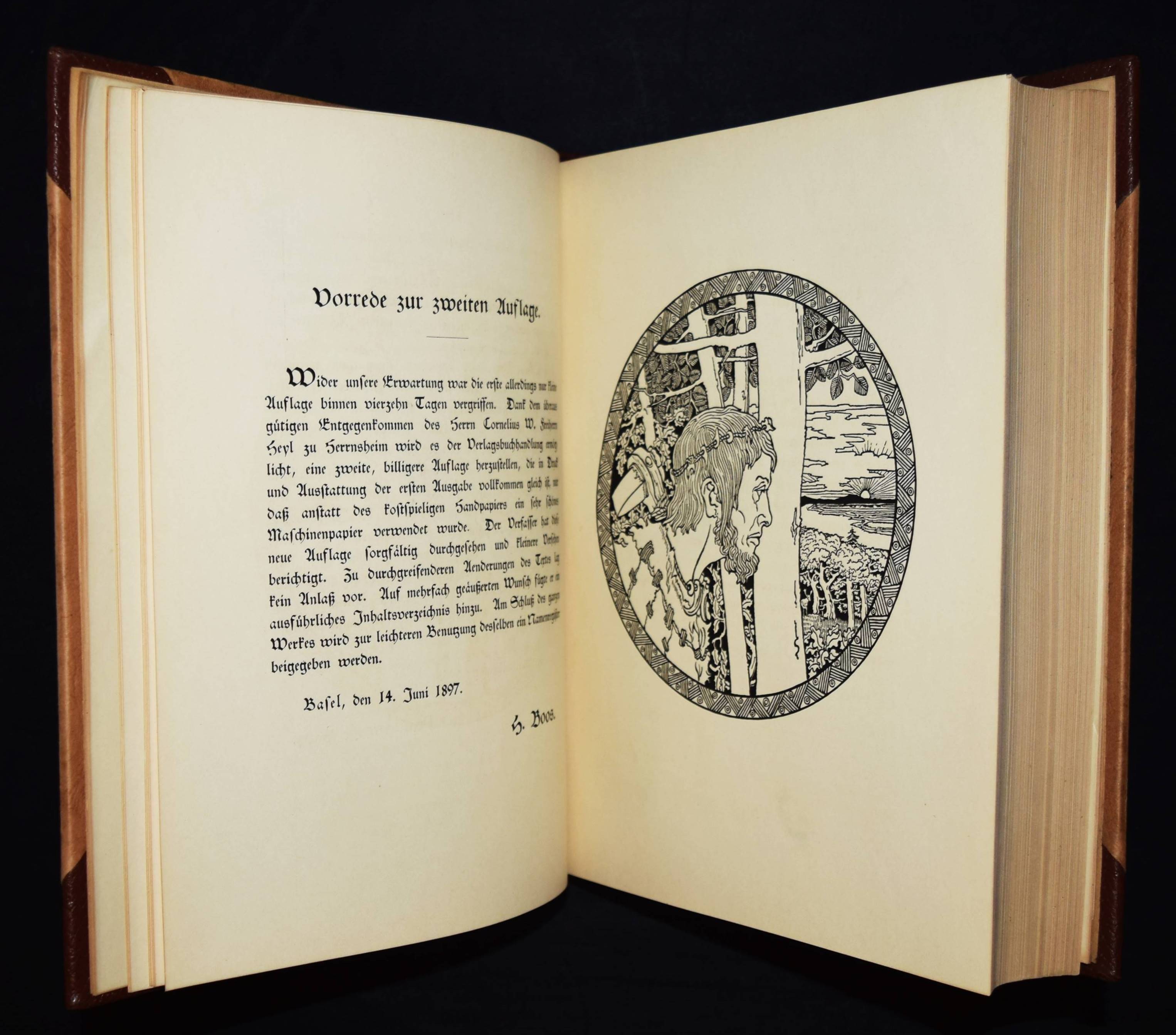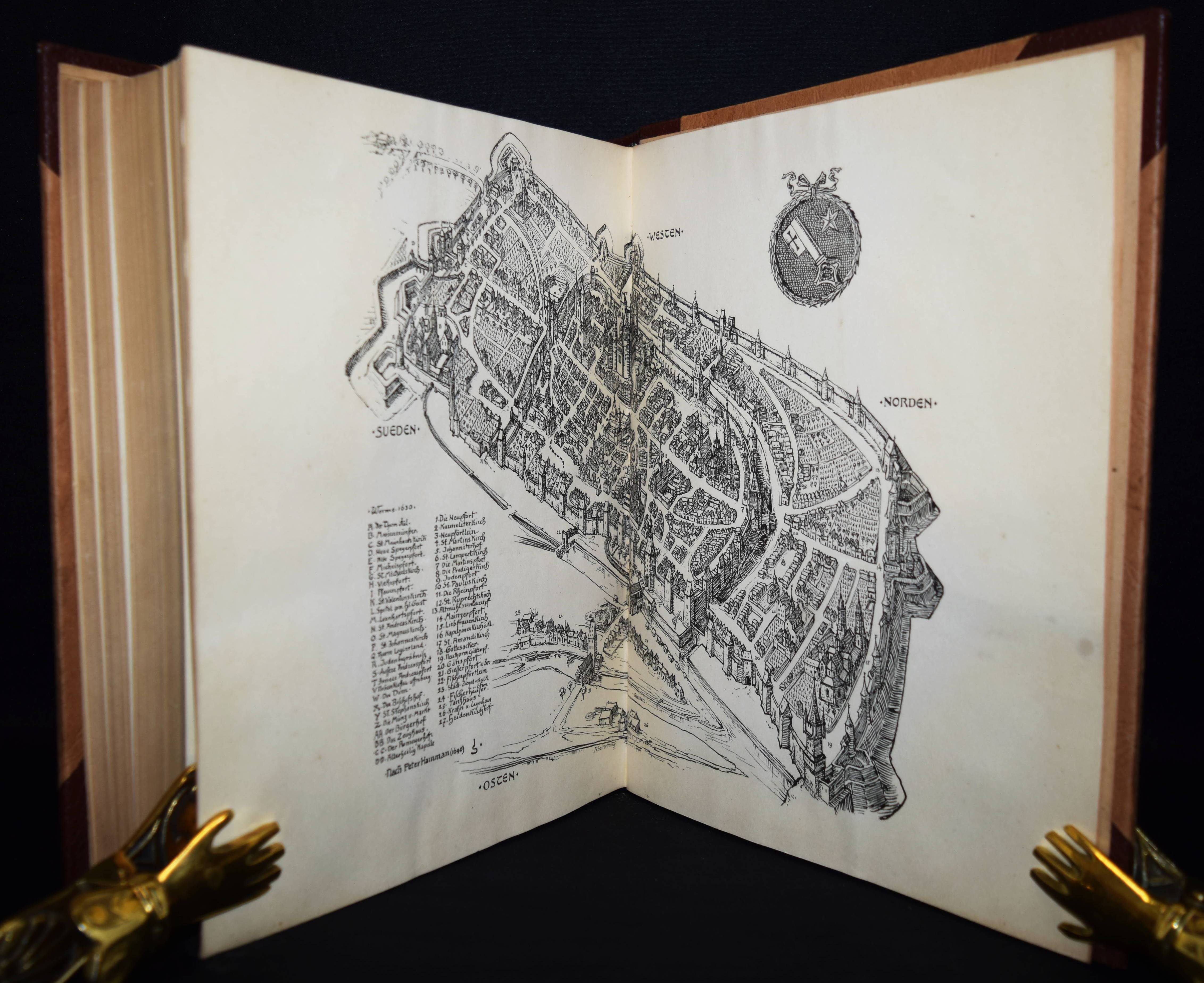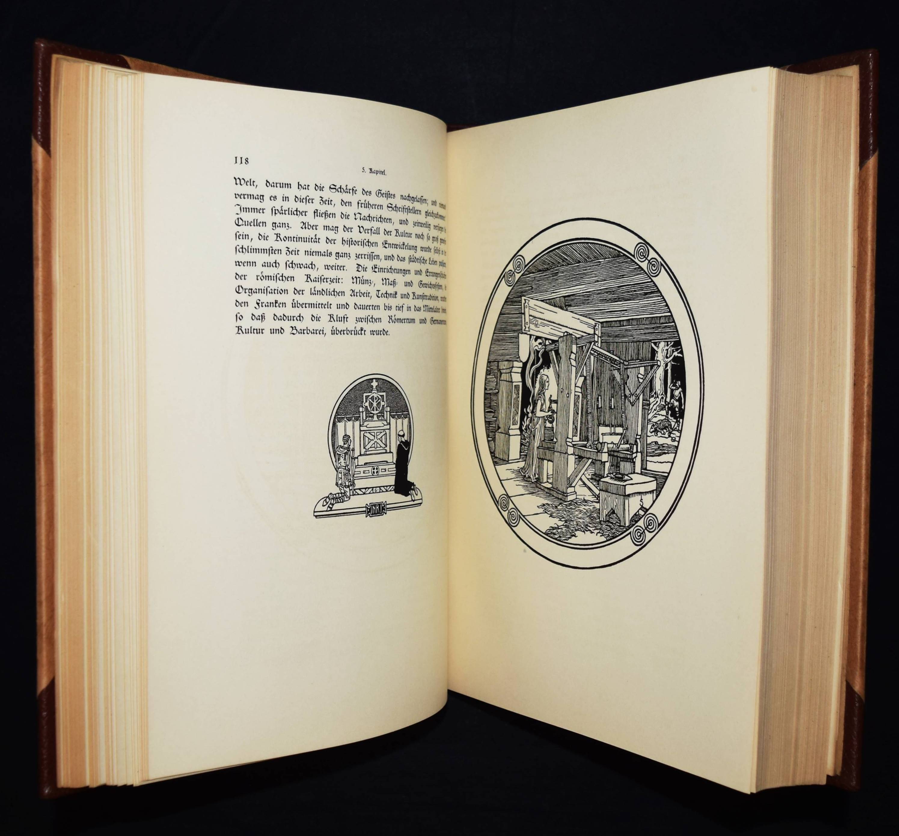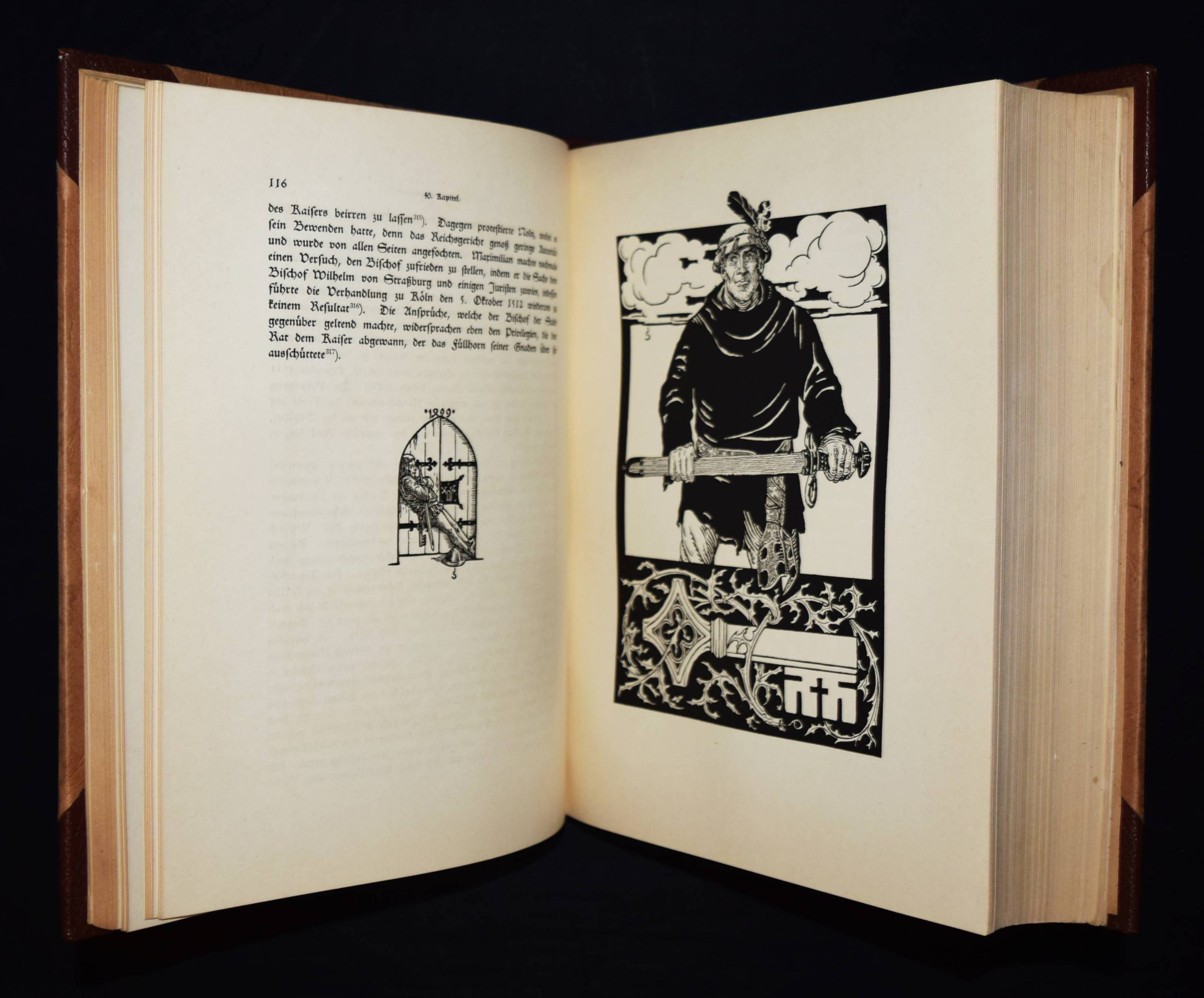 Boos, Heinrich. Geschichte der rheinischen Städtekultur von ihren Anfängen bis zur Gegenwart mit besonderer Berücksichtigung der Stadt Worms. 2. durchgesehene Aufl. 4 Bände. Berlin, J. A. Stargardt 1897-1901. 4°. Mit zahlr. (50 ganzs., 2 farb.) Illustrationen, Vignetten u. Initialen von Joseph Sattler. Hldr. d. Zt. Grautoff, Buchkunst 1901, S. 97 ff. Rodenberg S. 240. – Erste Ausgabe. – Aufwendig ausgestattetes Hauptwerk des Historikers H. Boos (1851-1917), entstanden im Auftrag von Cornelius W. Freiherr Heyl von Herrnsheim, den Bürgern seiner Vaterstadt Worms gewidmet. – „Ein illustriertes deutsches Geschichtswerk, das wir Kuglers Geschichte Friedrichs des Großen mit den Holzschnitten Menzels getrost an die Seite stellen können“ (H. Loubier). – „Größte und am meisten bewunderte Arbeit … hohen Lobes wert … von der Offizin Otto von Holten in Berlin mit unendlicher Sorgfalt durchgeführt“ (O. Grautoff). – Innengelenke teils etwas angeplatzt, Widm.a.V. von Band I, gutes sauberes Exemplar.