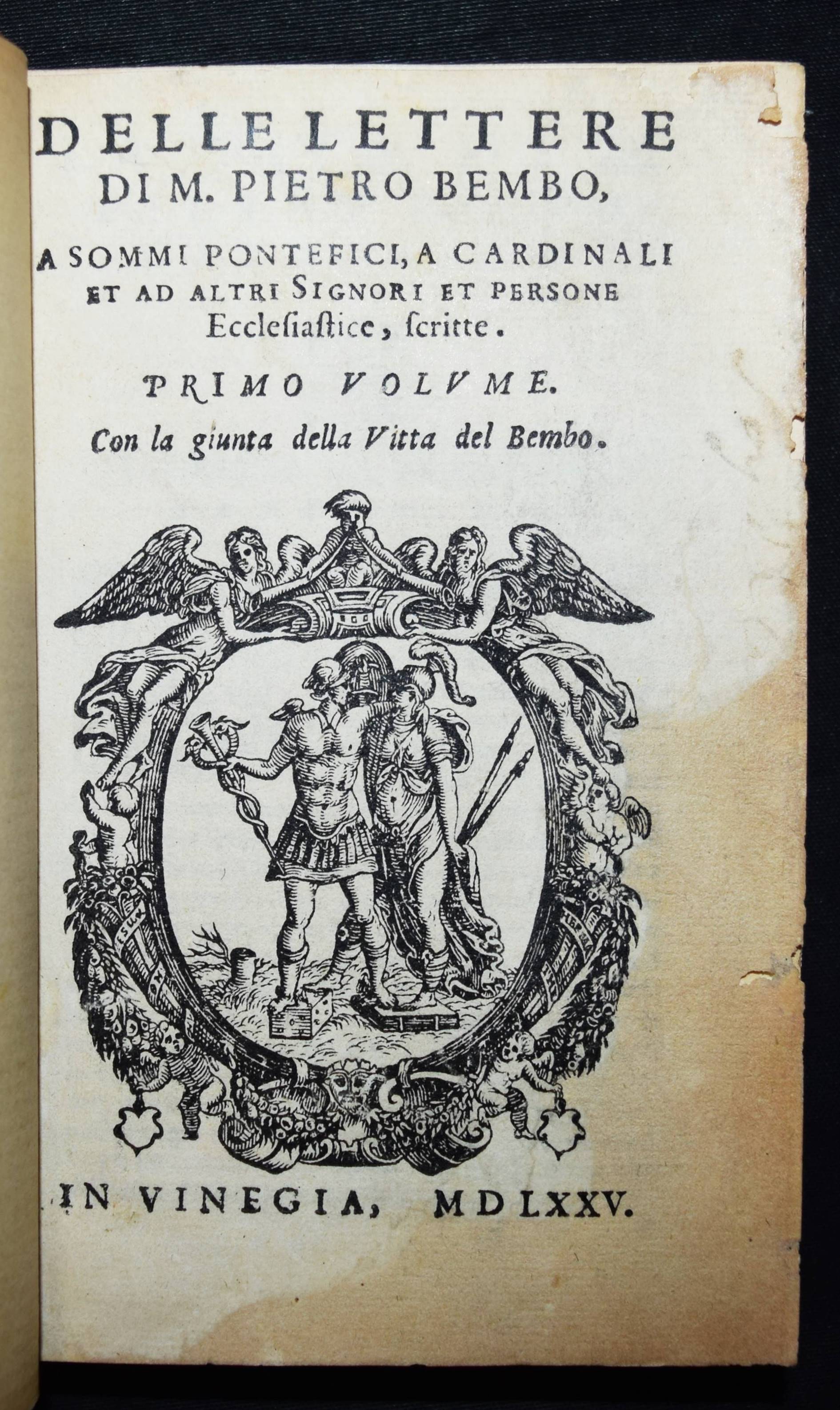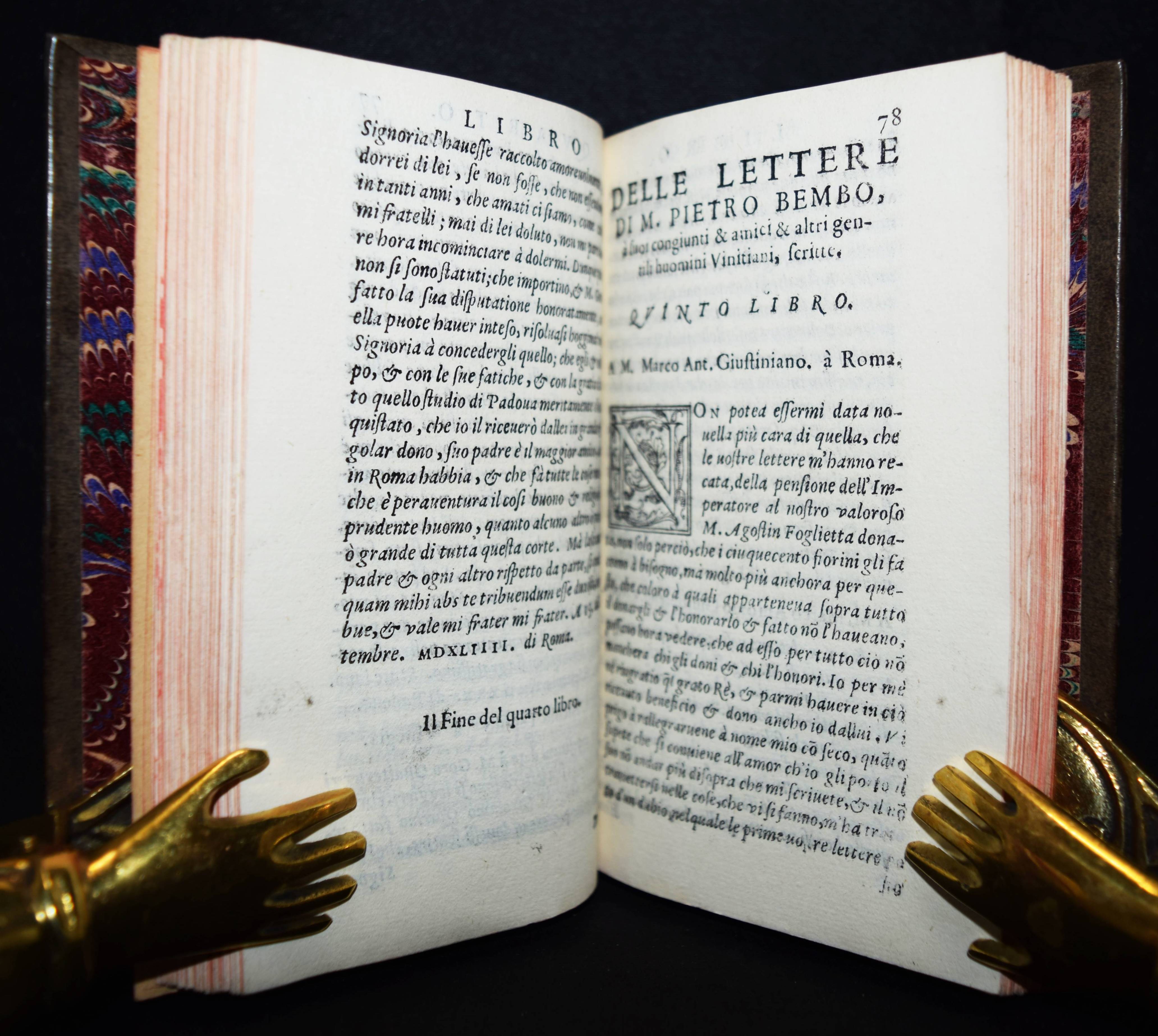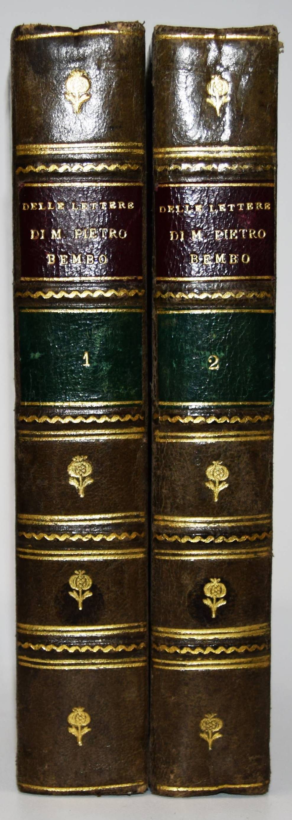 Bembo, Pietro. Delle lettere di M. Pietro Bembo. A sommi ponteficia, a cardinali et ad altri Signori et persone ecclesiastice, scritte. Con la giunta della vitta del Bembo. Primo (e) secondo volume. Band I u. II (von 3). Venetia, o. Dr. (G. Scotto) 1575. 8°. 381, (1) S.; 168 Bl. mit wdh. Titelvignette in Holzschnitt u. illustr. Initialen. Ldr. d. 19. Jahrhunderts mit goldgepr. Rückensch., Rückenverg. u. Deckelfiletten. Gamba 138. – Seltene frühe (2. ?) Ausgabe der 1548-1552 zuerst erschienenen Briefsammlung. Es erschien noch ein dritter Teil mit Briefen an Freunde. – „Questa bella e rara edizione meritava d’essere citata dai vocabolaristi“ (Gamba). – Der bedeutende ital. Humanist und Schriftsteller P. Bembo (1470-1547), „macht gegen 1496 die Bekanntschaft von Aldo Manuzio, einem der wichtigsten Buchdrucker und Publizisten der damaligen Zeit. Dieser veröffentlicht im selben Jahr Bembos Erstlingswerk „De Aetna“. Hier beschreibt Bembo in Latein die Besteigung des Ätna mit seinem Vater. … Bei Manuzio beschäftigt sich Bembo verstärkt mit Dante und Petrarca und vertieft vor allem sein Wissen um die Werke Francesco Petrarcas, … Während der Zeit bei Manuzio werden viele Werke der tre corone (Dante/Petrarca/Boccaccio) veröffentlicht. Unter ihnen sind Klassiker wie die „Divina Commedia“ und die „Terze Rime“ von Dante, sowie „Le cose volgari“ von Petrarca… Als sie 1501 veröffentlicht werden, weisen sie Unterschiede zur Urfassung von Petrarca auf. Bembo scheut sich nicht, seine eigene, moderne Orthographie auf Petrarcas Werk anzuwenden, und nach den Regeln der damaligen Zeit abzuändern. Um das Volgare eines Mitglieds der tre corone zu ändern, die schon zum damaligen Zeitpunkt als Klassiker angesehen werden, bedarf es eines hohen Selbstbewusstseins und der Kenntnis um seine eigenen Fähigkeiten. Des weiteren erhält Bembo Rückendeckung von Manuzio, der „Le cose volgari“ druckt, und Bembos Normalisierung des Werkes unverändert lässt. So änderte Bembo zum Beispiel die Kommasetzung, fügte Strichpunkte ein, oder änderte Apostrophen. All dies geschah zum Wohle der besseren Lesbarkeit des Textes. „Le cose volgari“ bleiben jedoch nicht das einzige Werk, das von Bembos Normalisierung betroffen ist. Die Texte, die bis 1503 gedruckt werden, erhalten Kommata, die in vielen Werken des bisherigen Volgare noch völlig fehlten, oder nach heutigen Vorstellungen falsch gesetzt wurden. Auch werden, wie oben erwähnt, andere syntaktische Feinheiten abgeändert oder eingefügt. … 1539 wird er von Papst Paul III. endlich zum Kardinal ernannt, und 1541 zum Bischof von Gubbio. Schon drei Jahre später wird er Bischof von Bergamo, erfüllt seine Aufgaben aber von Rom aus. Am 18.1.1547 stirbt Pietro Bembo und wird zwischen Papst Leo X. und Papst Clemens VII. begraben“ (A. Blahnik, Leben und Werk des Pietro Bembo, München 2006). – Titelblatt von Band I etwas fleckig, sonst sehr schönes sauberes und dekorativ gebundenes Exemplar.