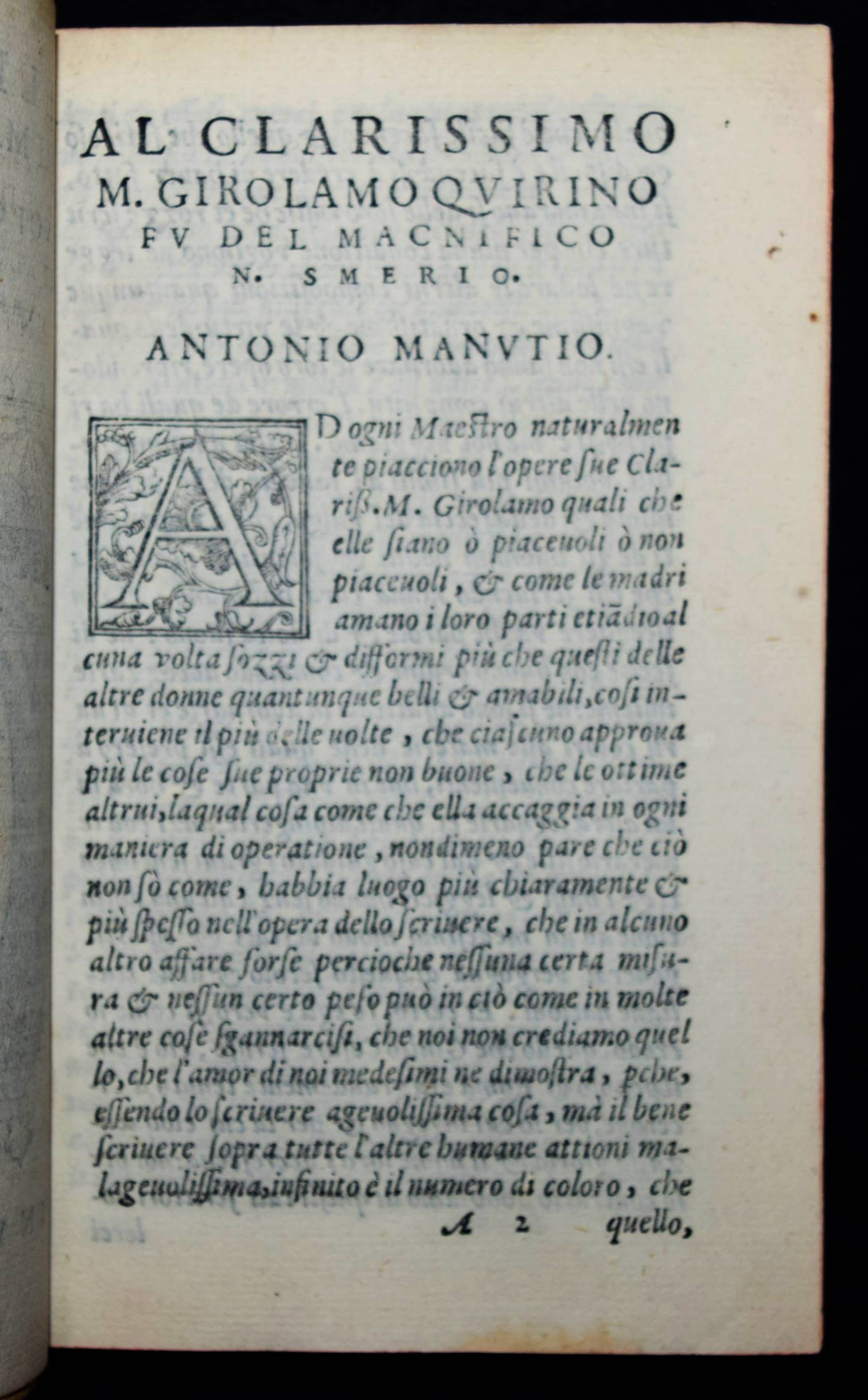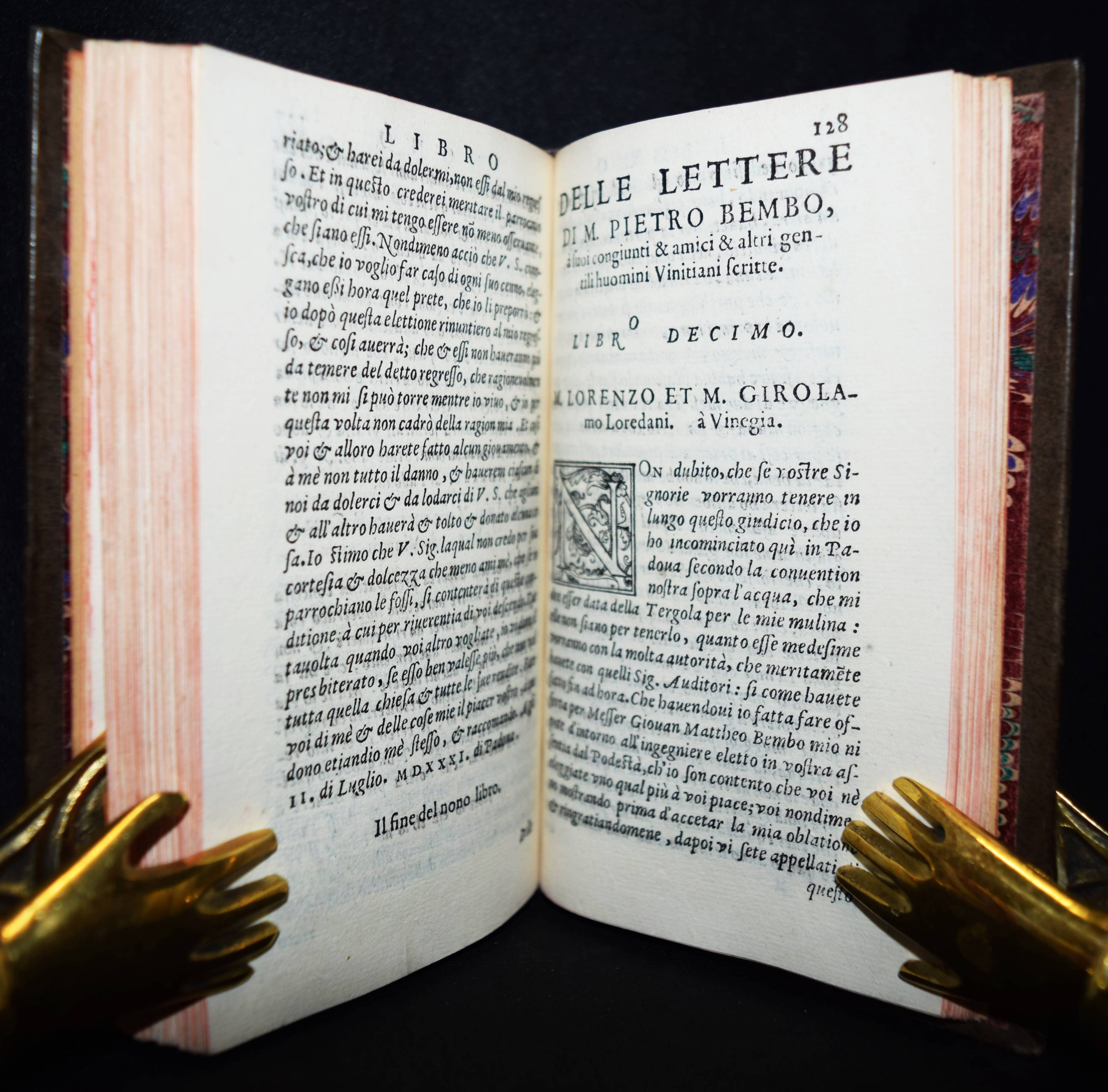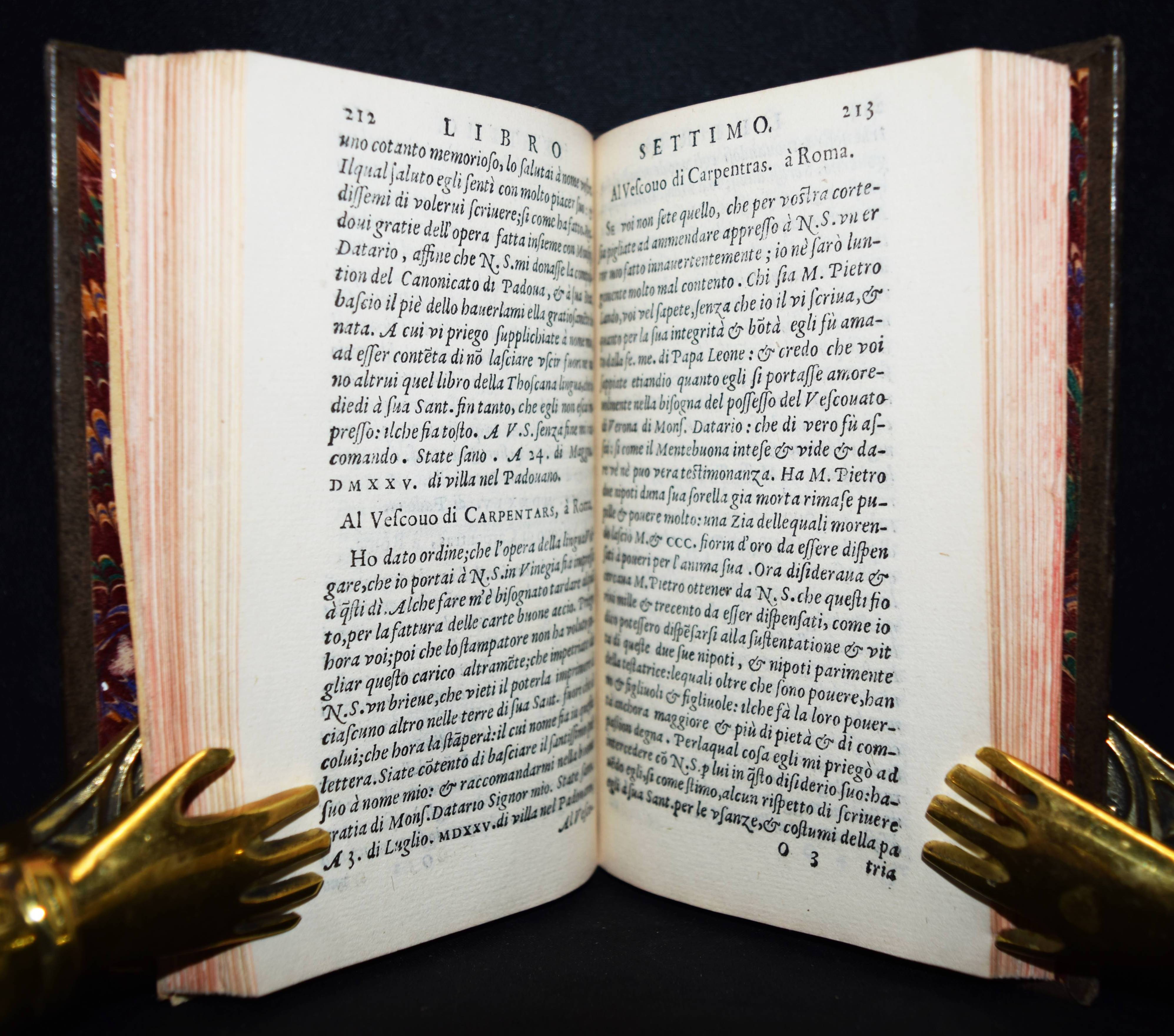 Bembo, Pietro. Delle lettere di M. Pietro Bembo. A sommi ponteficia, a cardinali et ad altri Signori et persone ecclesiastice, scritte. Con la giunta della vitta del Bembo. Primo (e) secondo volume. Band I u. II (von 3). Venetia, o. Dr. (G. Scotto) 1575. 8°. 381, (1) S.; 168 Bl. mit wdh. Titelvignette in Holzschnitt u. illustr. Initialen. Ldr. d. 19. Jahrhunderts mit goldgepr. Rückensch., Rückenverg. u. Deckelfiletten. Gamba 138. – Seltene frühe (2. ?) Ausgabe der 1548-1552 zuerst erschienenen Briefsammlung. Es erschien noch ein dritter Teil mit Briefen an Freunde. – „Questa bella e rara edizione meritava d’essere citata dai vocabolaristi“ (Gamba). – Der bedeutende ital. Humanist und Schriftsteller P. Bembo (1470-1547), „macht gegen 1496 die Bekanntschaft von Aldo Manuzio, einem der wichtigsten Buchdrucker und Publizisten der damaligen Zeit. Dieser veröffentlicht im selben Jahr Bembos Erstlingswerk „De Aetna“. Hier beschreibt Bembo in Latein die Besteigung des Ätna mit seinem Vater. … Bei Manuzio beschäftigt sich Bembo verstärkt mit Dante und Petrarca und vertieft vor allem sein Wissen um die Werke Francesco Petrarcas, … Während der Zeit bei Manuzio werden viele Werke der tre corone (Dante/Petrarca/Boccaccio) veröffentlicht. Unter ihnen sind Klassiker wie die „Divina Commedia“ und die „Terze Rime“ von Dante, sowie „Le cose volgari“ von Petrarca… Als sie 1501 veröffentlicht werden, weisen sie Unterschiede zur Urfassung von Petrarca auf. Bembo scheut sich nicht, seine eigene, moderne Orthographie auf Petrarcas Werk anzuwenden, und nach den Regeln der damaligen Zeit abzuändern. Um das Volgare eines Mitglieds der tre corone zu ändern, die schon zum damaligen Zeitpunkt als Klassiker angesehen werden, bedarf es eines hohen Selbstbewusstseins und der Kenntnis um seine eigenen Fähigkeiten. Des weiteren erhält Bembo Rückendeckung von Manuzio, der „Le cose volgari“ druckt, und Bembos Normalisierung des Werkes unverändert lässt. So änderte Bembo zum Beispiel die Kommasetzung, fügte Strichpunkte ein, oder änderte Apostrophen. All dies geschah zum Wohle der besseren Lesbarkeit des Textes. „Le cose volgari“ bleiben jedoch nicht das einzige Werk, das von Bembos Normalisierung betroffen ist. Die Texte, die bis 1503 gedruckt werden, erhalten Kommata, die in vielen Werken des bisherigen Volgare noch völlig fehlten, oder nach heutigen Vorstellungen falsch gesetzt wurden. Auch werden, wie oben erwähnt, andere syntaktische Feinheiten abgeändert oder eingefügt. … 1539 wird er von Papst Paul III. endlich zum Kardinal ernannt, und 1541 zum Bischof von Gubbio. Schon drei Jahre später wird er Bischof von Bergamo, erfüllt seine Aufgaben aber von Rom aus. Am 18.1.1547 stirbt Pietro Bembo und wird zwischen Papst Leo X. und Papst Clemens VII. begraben“ (A. Blahnik, Leben und Werk des Pietro Bembo, München 2006). – Titelblatt von Band I etwas fleckig, sonst sehr schönes sauberes und dekorativ gebundenes Exemplar.