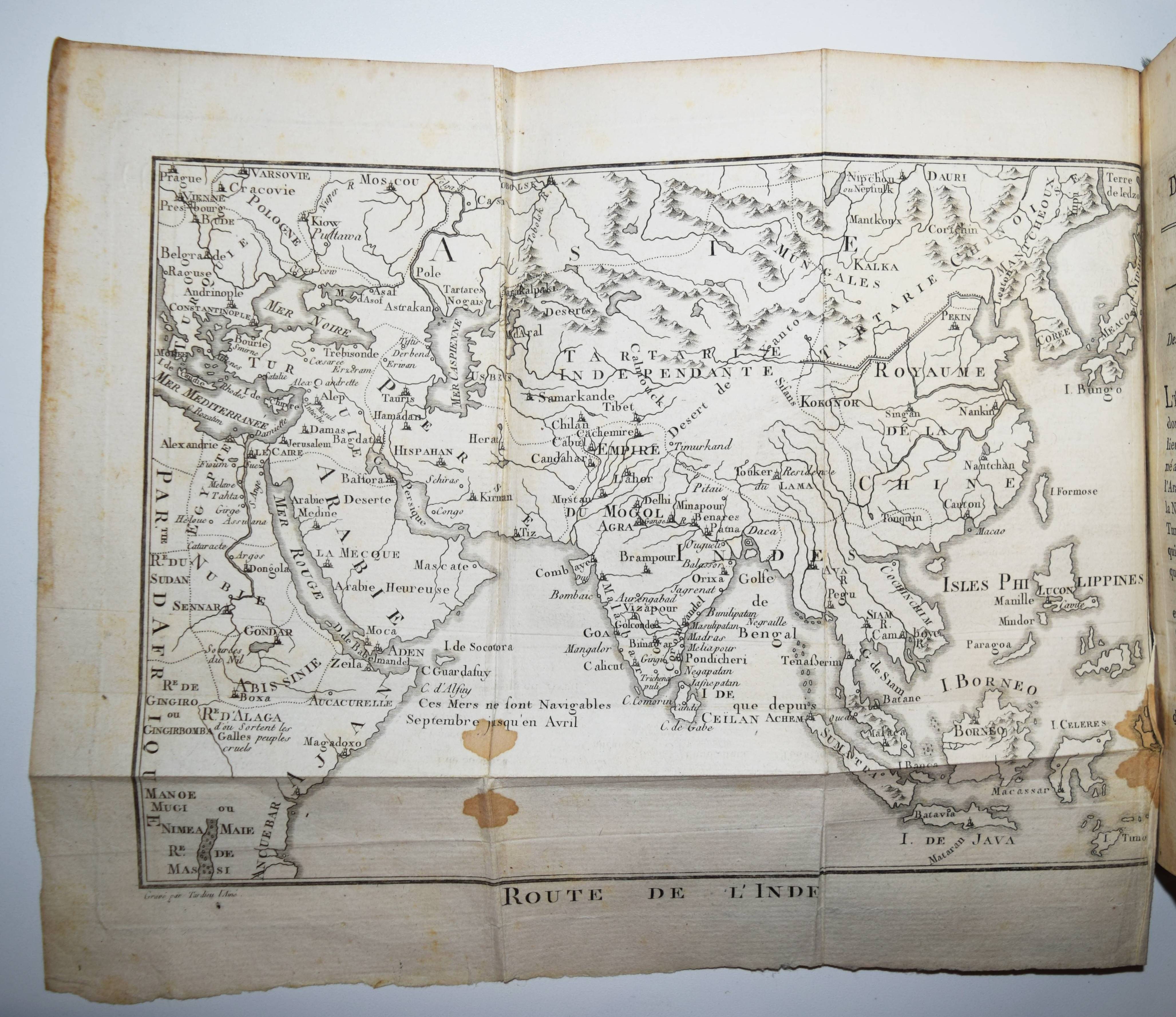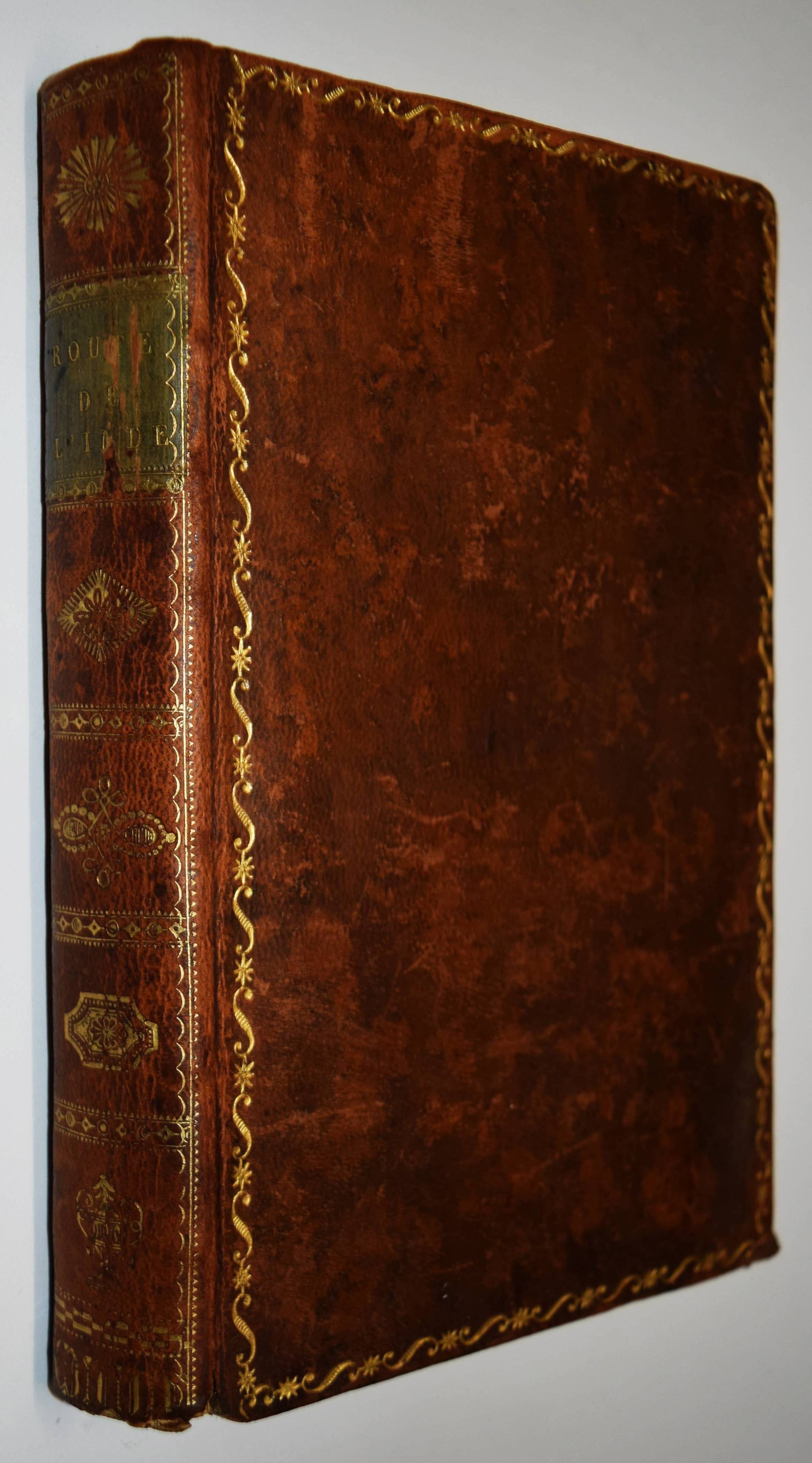 Henry, P(ierre) F(rancois), (Ed. et transl.). Route de l’Inde, ou description géographique de l’Égypte, la Syrie, l’Arabie, la Perse et l’Inde. Ouvrage dans lequel on a renfermé un précis de l’histoire, et le tableau des mœurs et coutumes des peuples anciens et modernes, qui ont habité ces différentes contrées, depuis les temps les plus reculés, jusqu’à nos jours. Traduit en partie de l’Anglais, et rédigé. Paris, (Jean Gabriel) Dentu An X – 1802. 8°. VIII, 454 S., [2] Bl. mit 1 gefalt. gestoch. Karte. Ldr. d. Zt. mit goldgepr. Rückenschild, Rückenverg., Deckelfiletten u. Kantenverg. Zweite franz. Ausgabe; die erste Ausgabe erschien 1798. – Ausführliche Beschreibung des Vorderen Orients (Ägypten, Syrien, Arabische Halbinsel und Indien). Der Verfasser bezieht sich dabei auf die angebliche Route Alexanders des Großen von Ägypten nach Indien. Das Werk erschien wohl anlässlich von Napoleons Ägyptenfeldzug oder Ägyptischen Expedition (1798 bis 1801). – Einband berieben und am Fuß etwas bestoßen, stellenweise etwas braunfleckig, gutes Exemplar.