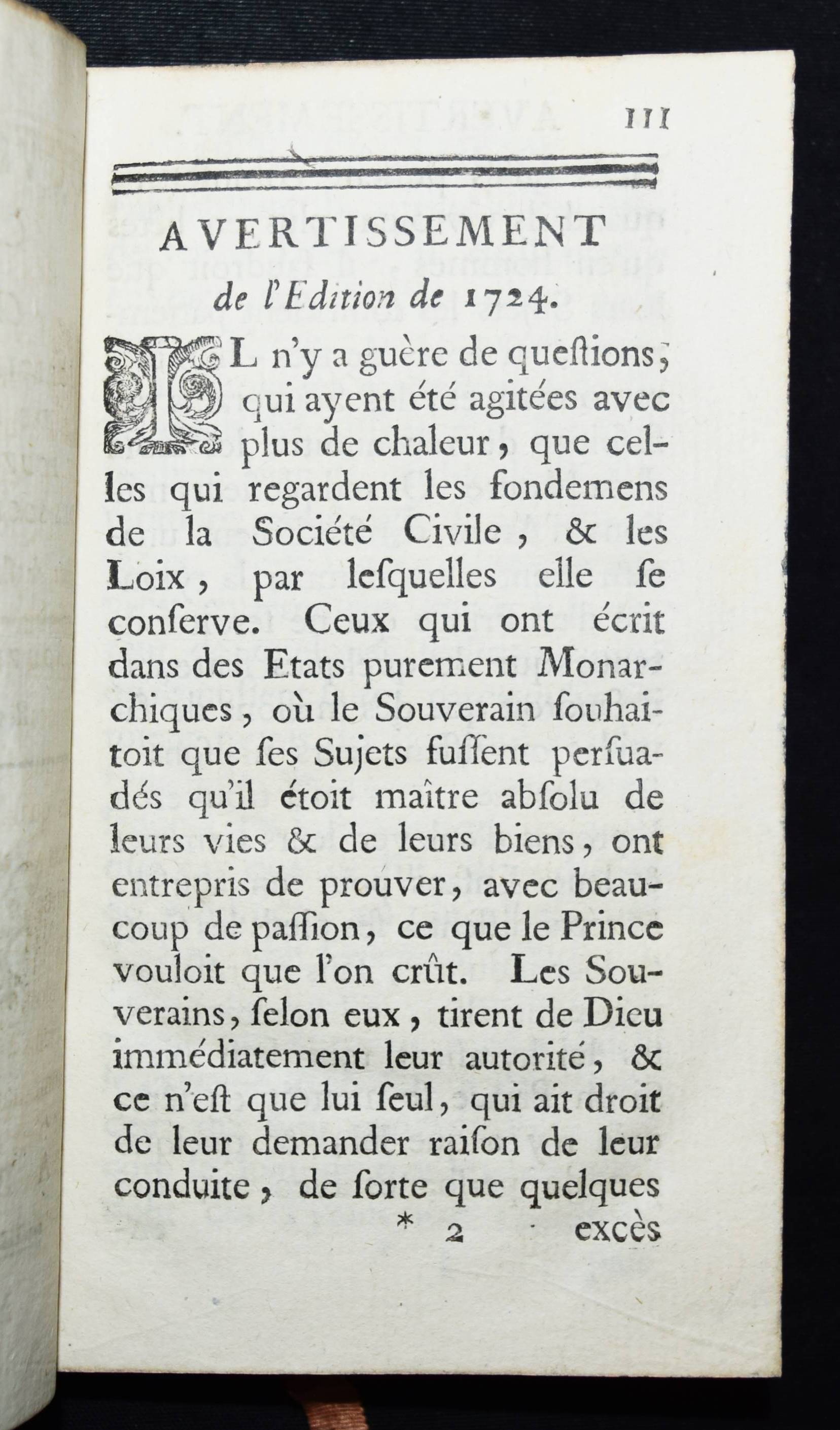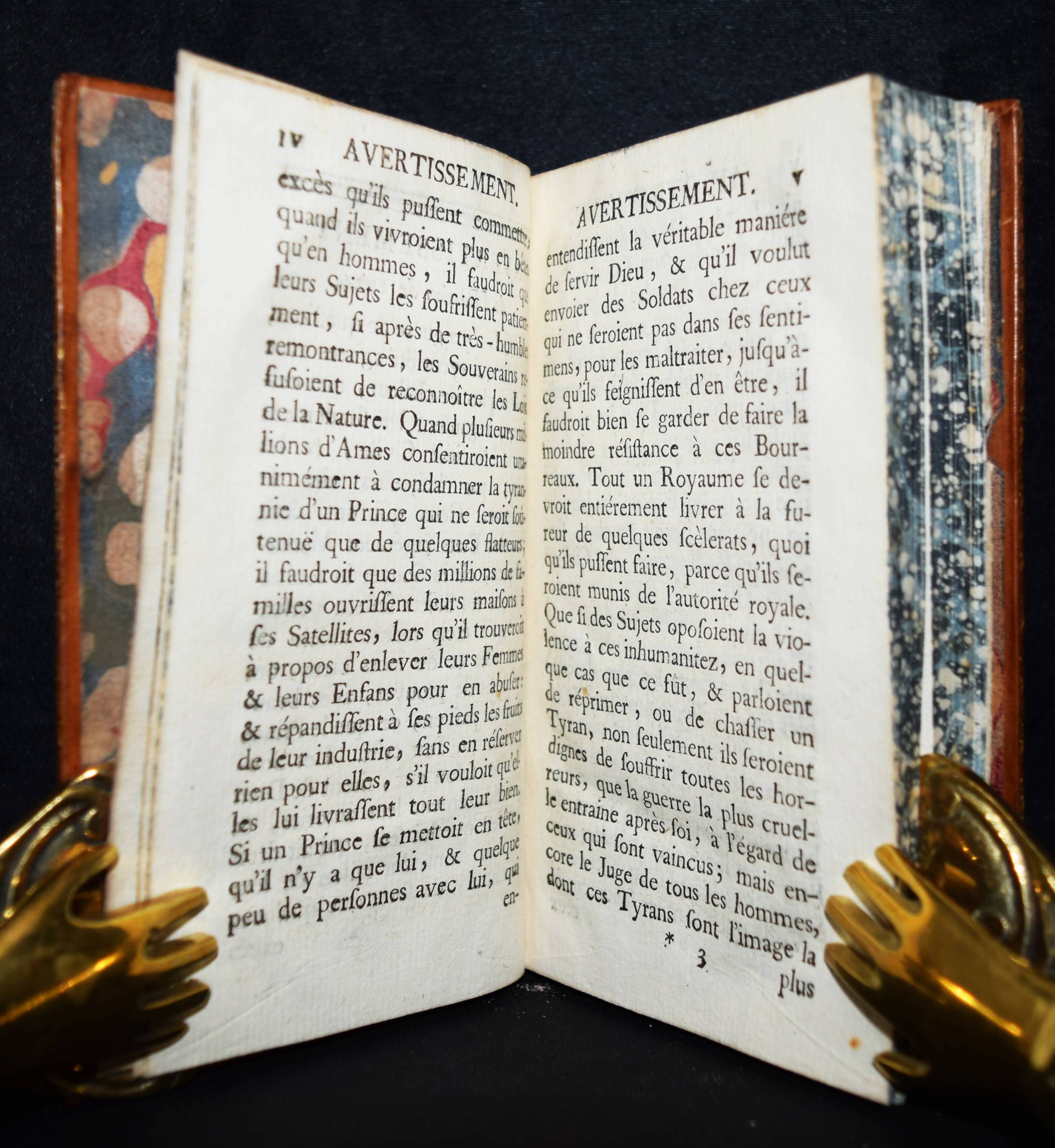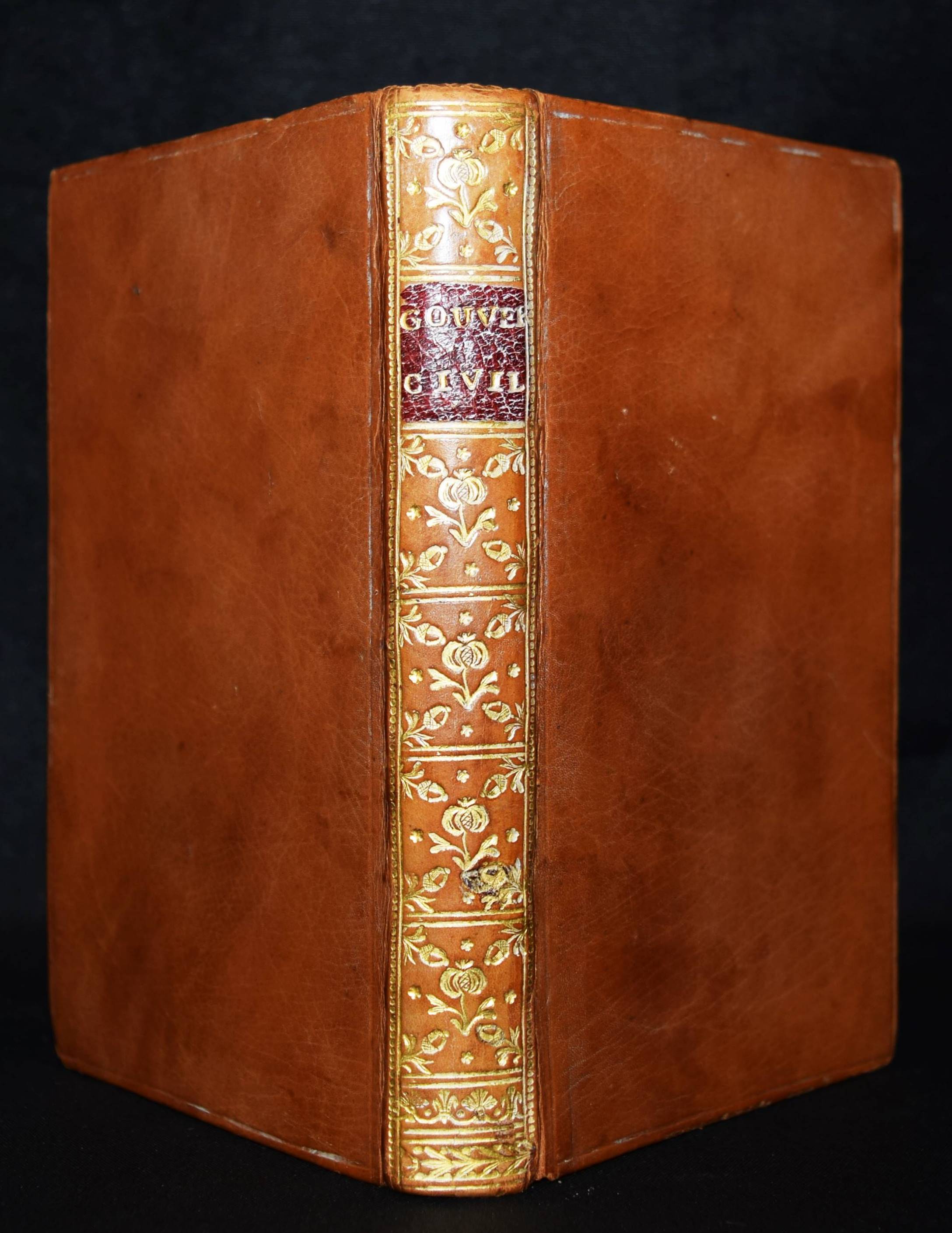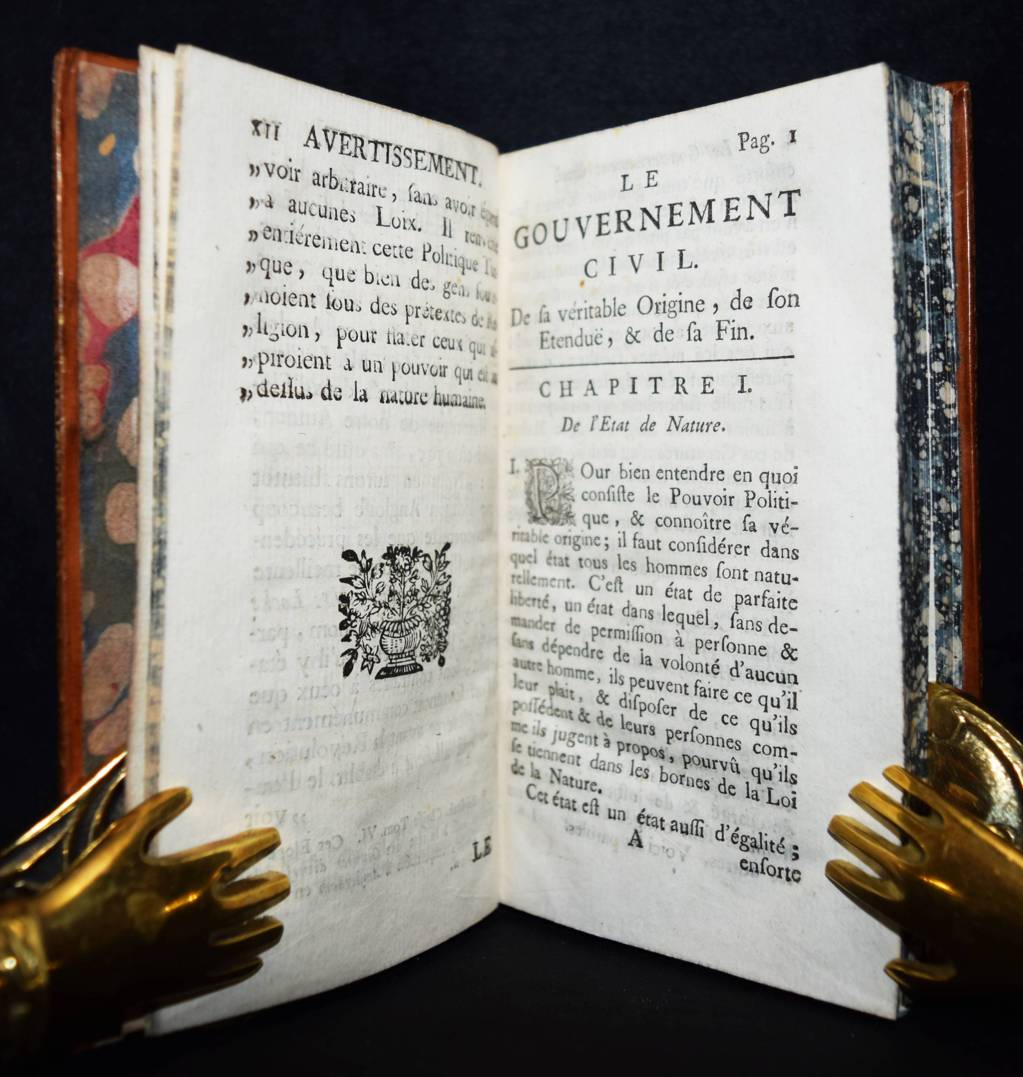 Locke, (John). Du gouvernement civil. Où l’on traite de l’origine, des fondemens, de la nature, du pouvoir, et des fins des sociétés politiques. Traduit de l’Anglois (par David Mazel). Nouvelle édition, revue & corrigée. Bruxelles 1749. Kl.-8°. XII, 358 S., [1] Bl. Ldr. d. Zt. mit goldgepr. Rückenschild u. reicher floraler Rückenverg. Barbier II, 549. – Bereits 1691 zuerst erschienene Übersetzung von Lockes politischem Hauptwerk „Two Treatises of Government“. Die engl. Orig.-Ausgabe erschien 1689 anonym und hatte grundlegenden Einfluss auf die Glorious Revolution von 1688/1689 und die danach eingerichtete Staatsordnung in England sowie im 18. Jahrhundert auf die Amerikanische Verfassung von 1787 und die Französische Revolution von 1789. – Gestoch. Wappen-Exlibris, sehr schönes sauberes und dekorativ gebundenes Exemplar.