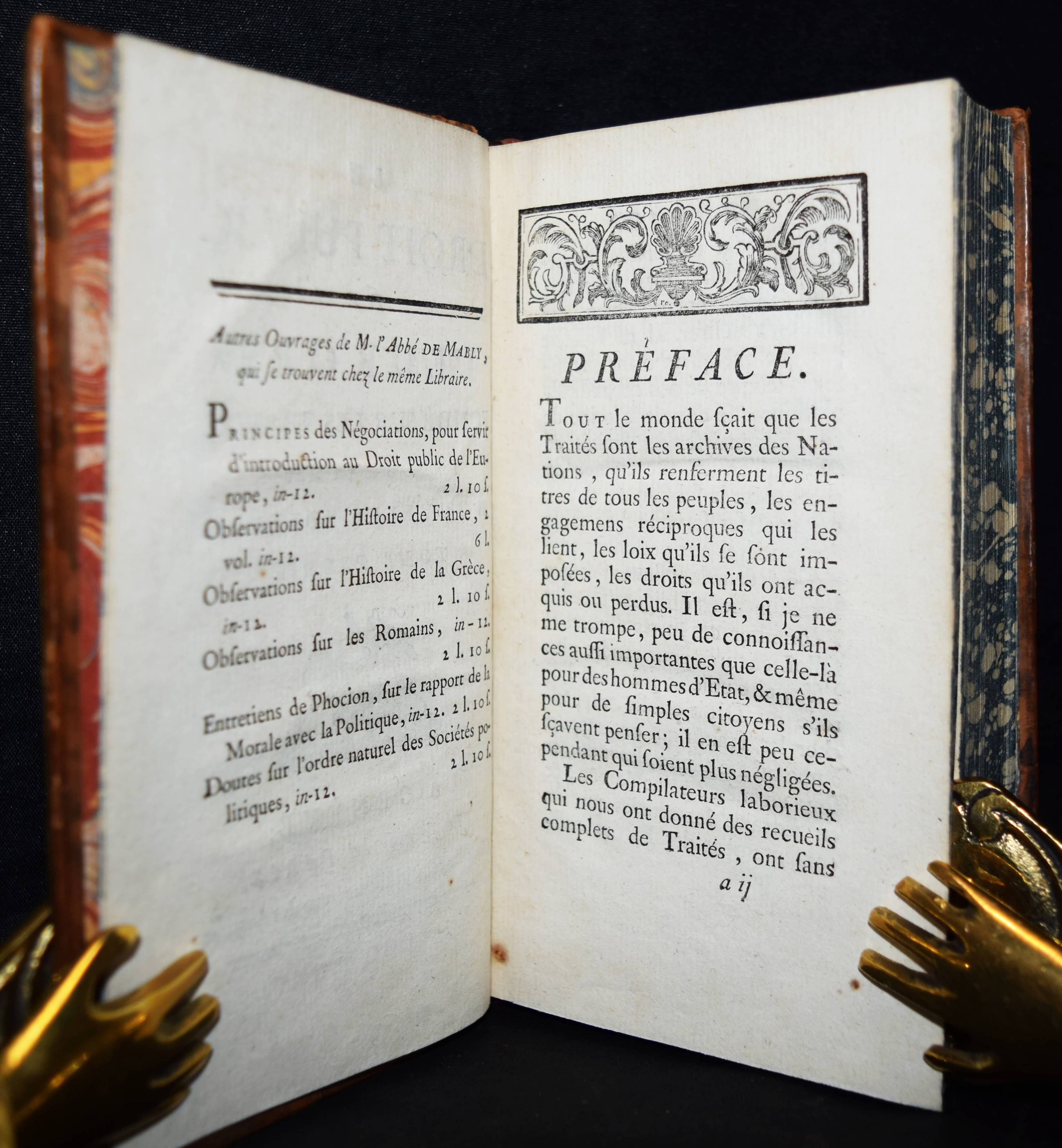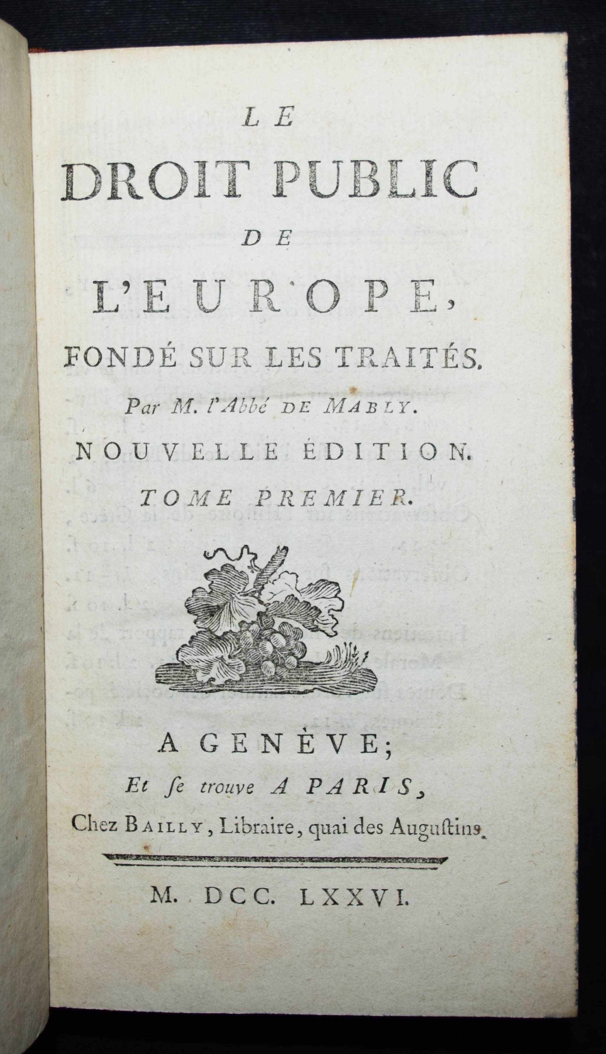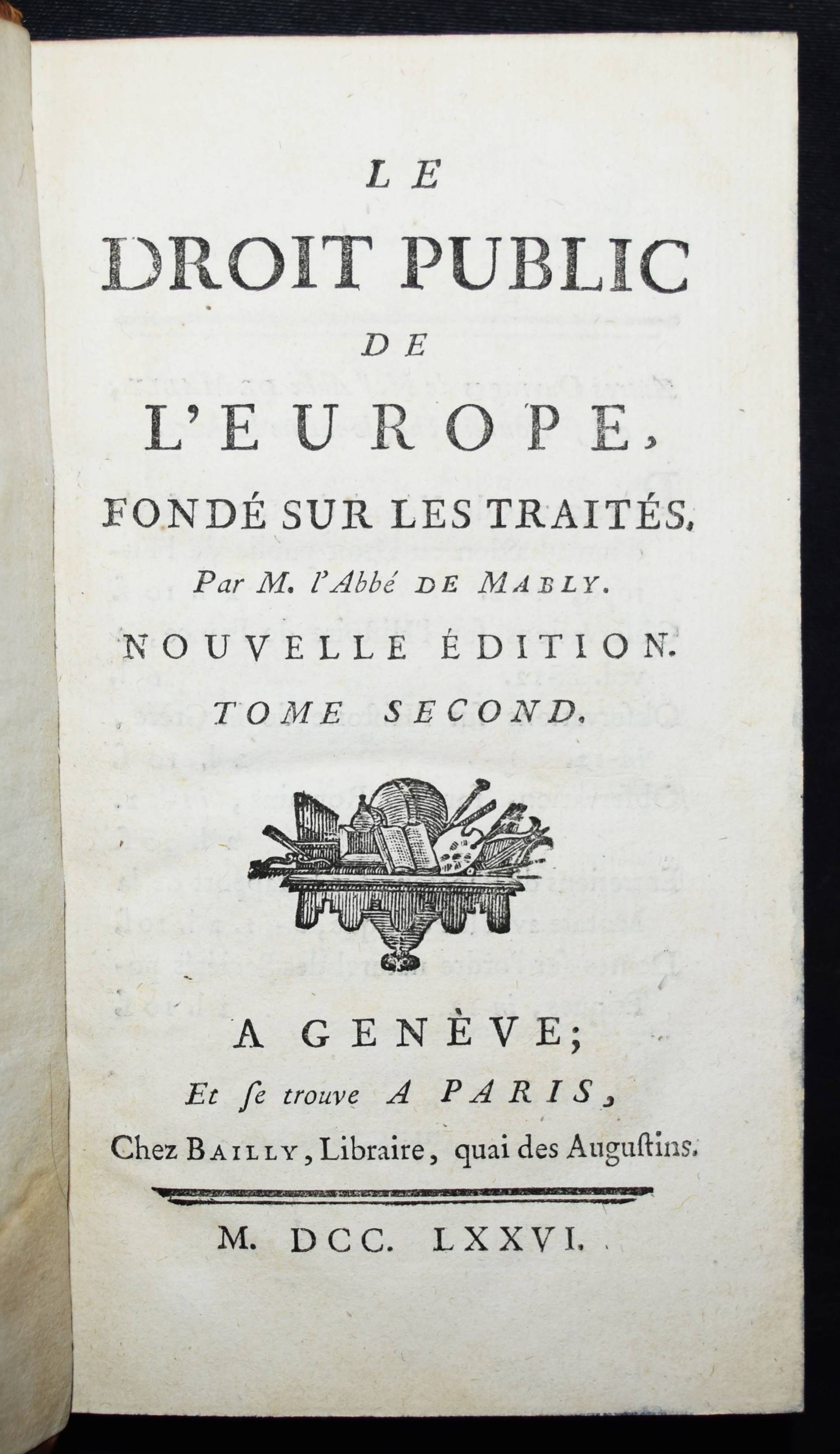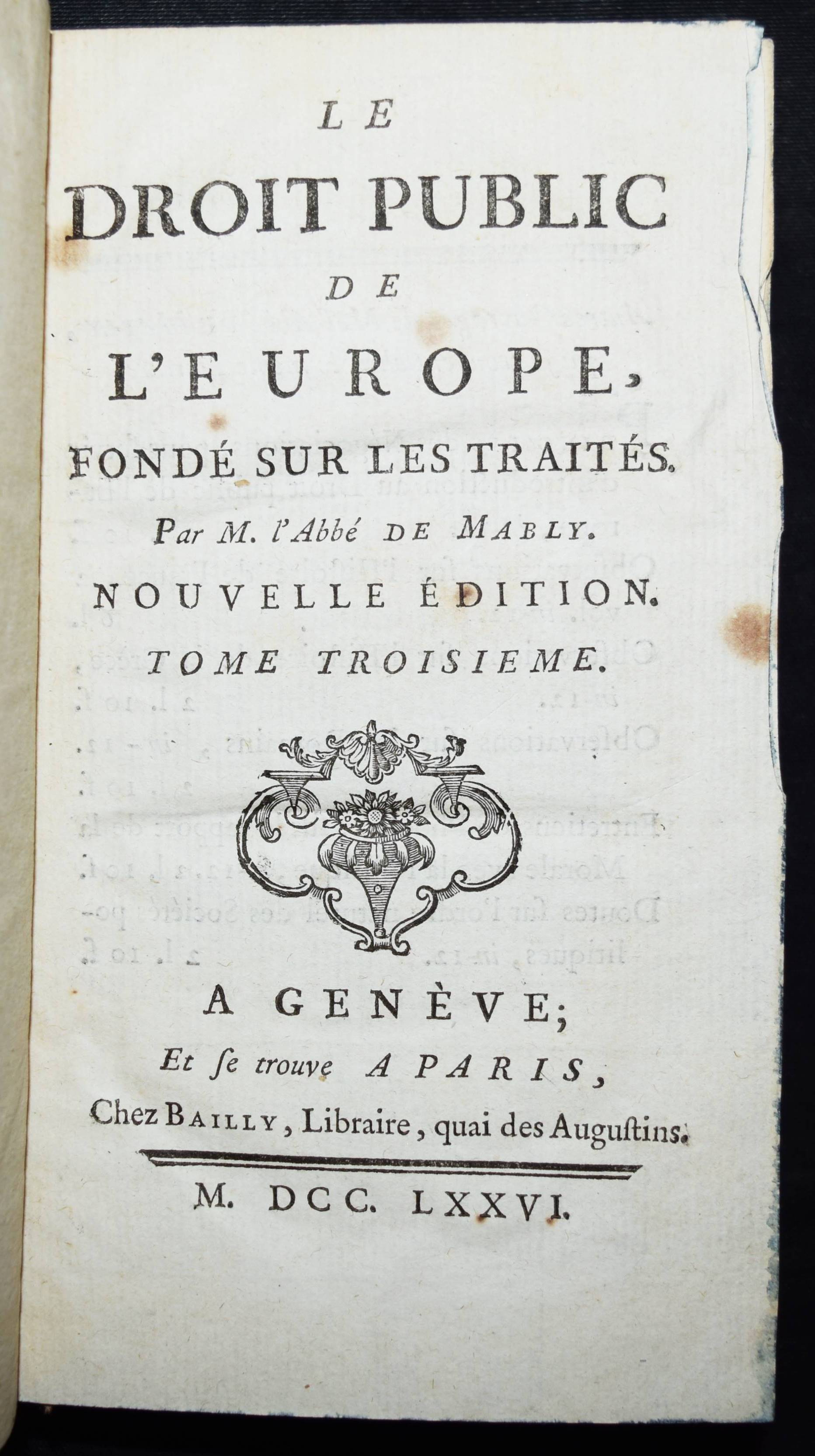 Mably, (Gabriel Bonnot de). Le droit public de l’Europe. Fondé sur les traités. Nouvelle édition. 3 Bände. Genève, Paris, Bailly 1776. 8°. XII, 525 S.; III, 563 S.; III, 507 S. Ldr. d. Zt. mit goldgepr. Rückensch. u. floraler Rückenverg. VD18 12263818. Vgl. Cioranescu 41163. Higgs 2630. Tchemerzine VII, 263. – Klassische Abhandlung zum Staatsrecht, erstmals 1740 erschienen. – „Das Buch gehört zu den klassischen Schriften über Politik. (Es) erregte ungeheures Aufsehen (und) war tatsächlich eine Geschichte der auswärtigen Politik der europäischen Kabinette von 1648 bis 1748“ (Die Gesellschafts- u. Staatslehren des Abbes Mably, S. 16 f.). – Sehr schönes sauberes und dekorativ gebundenes Exemplar.
