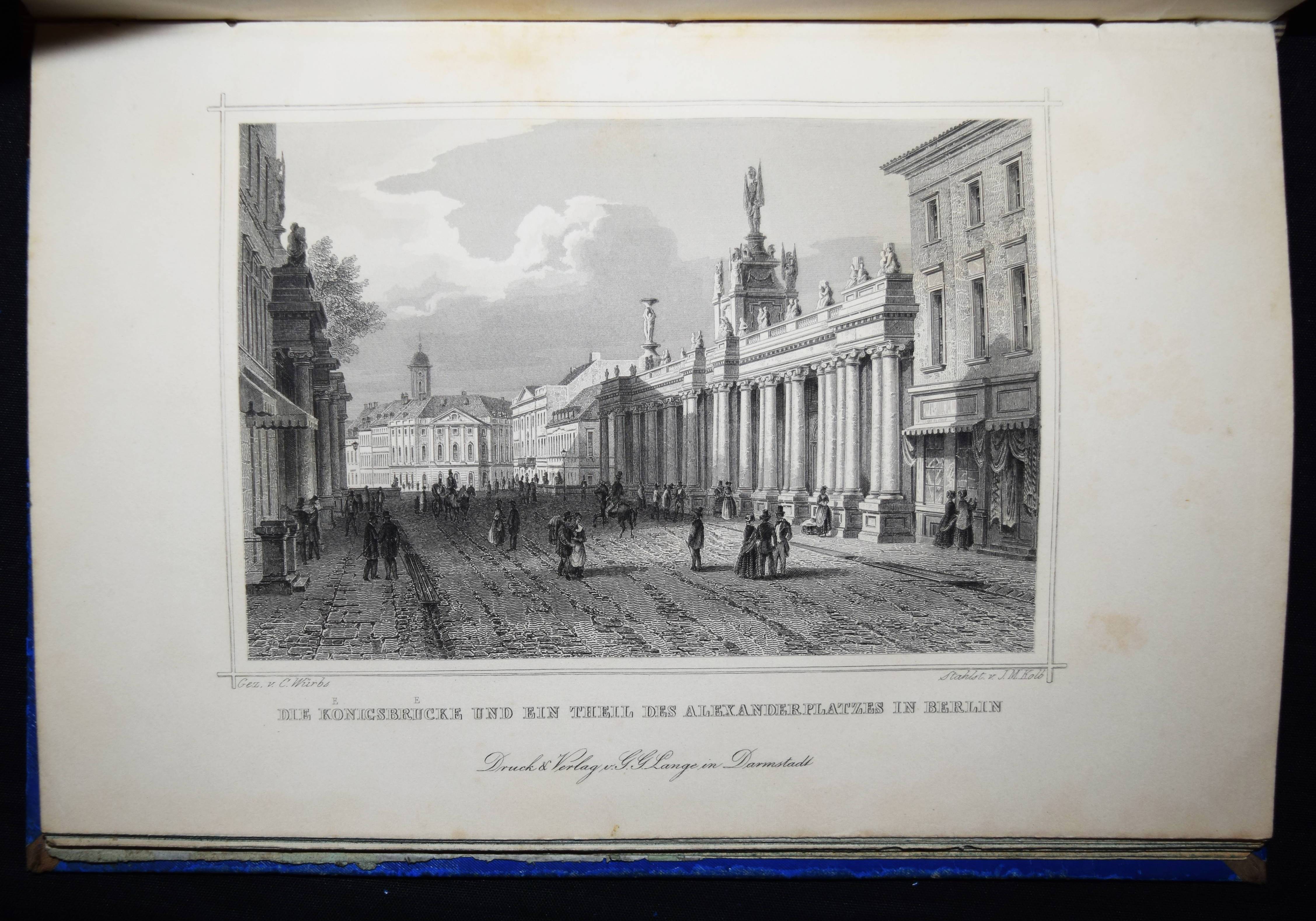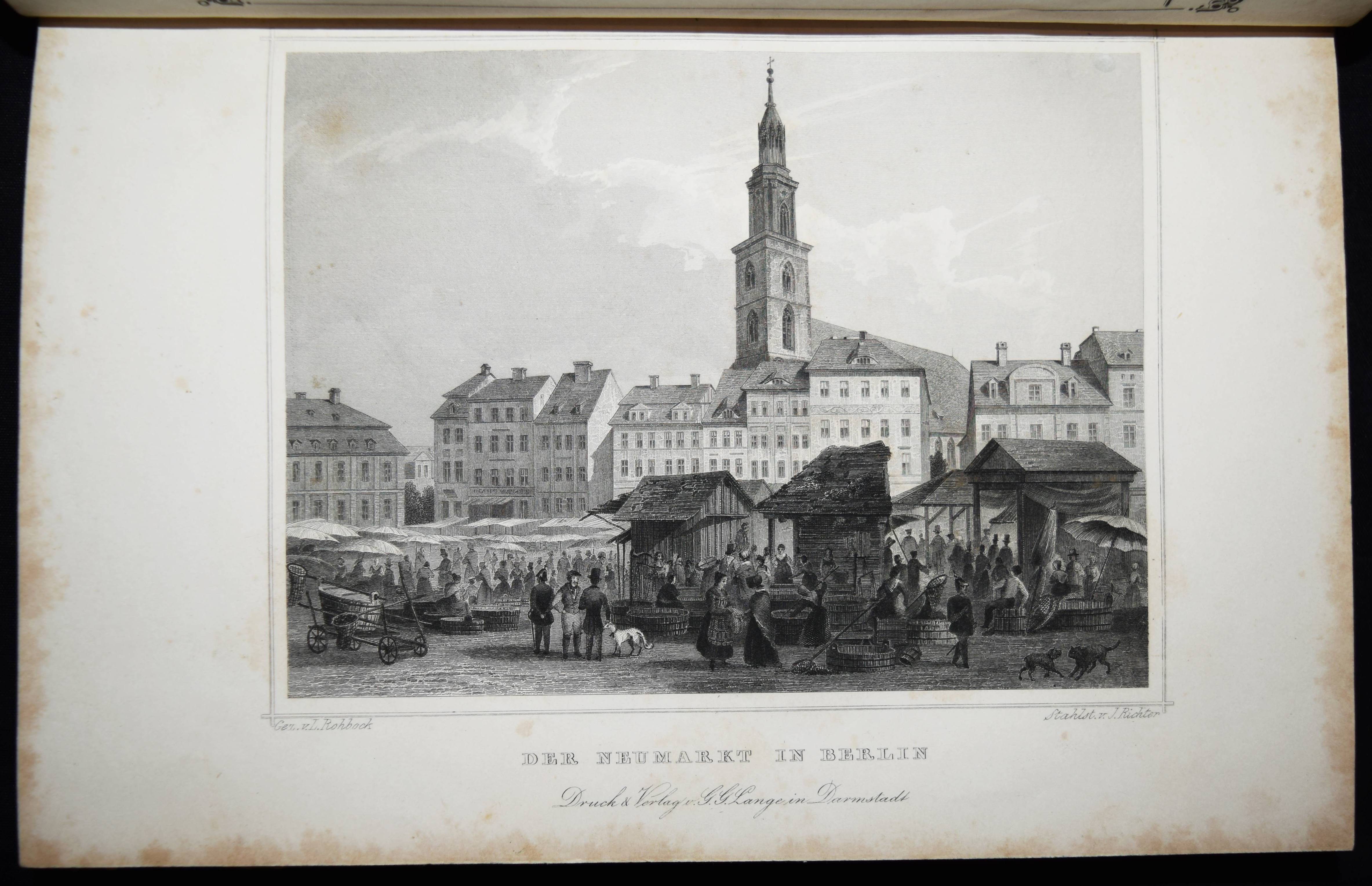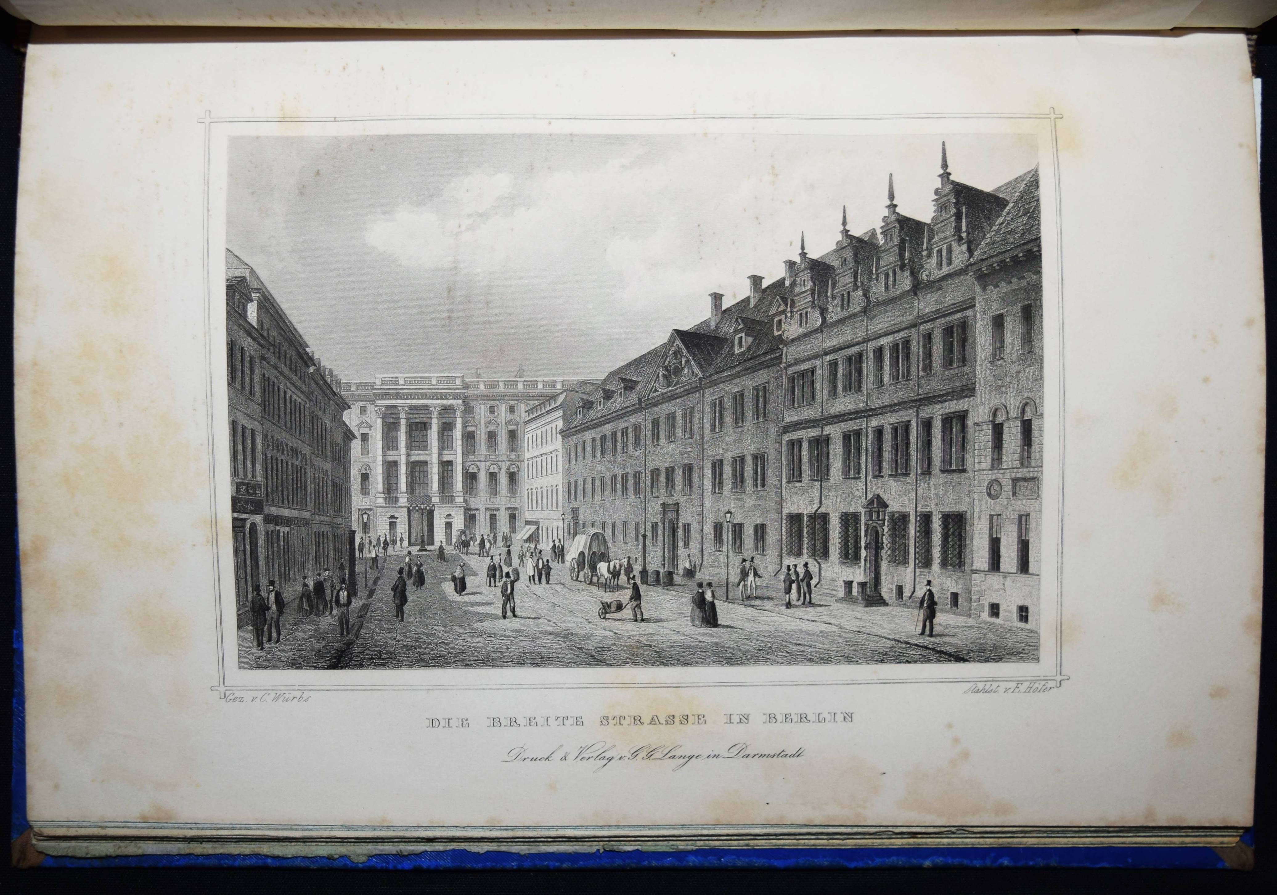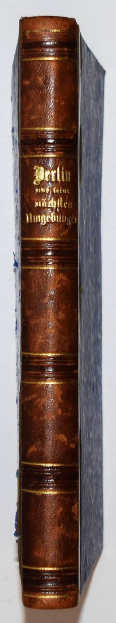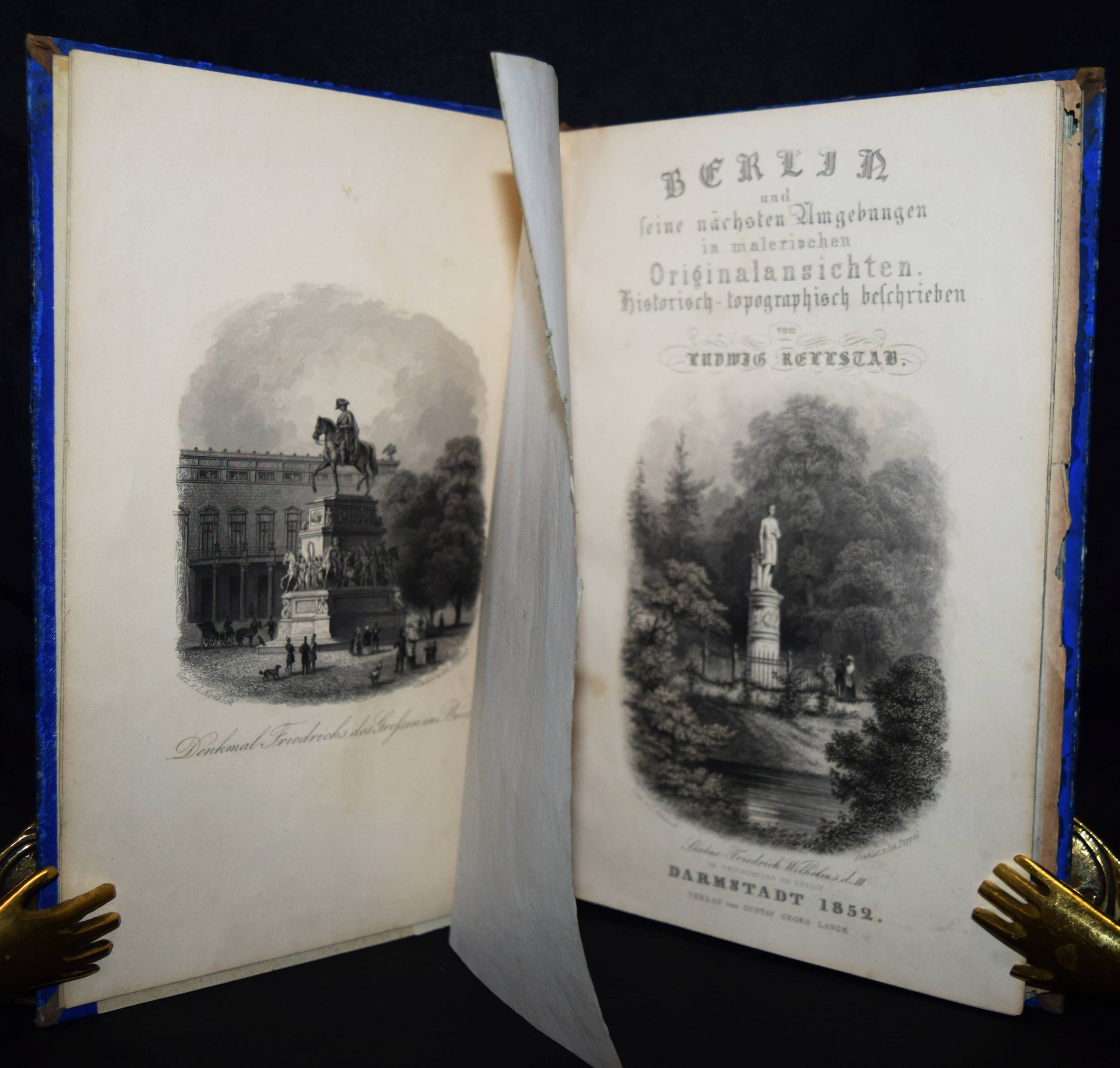 Rellstab, Ludwig. Berlin und seine nächsten Umgebungen in malerischen Originalansichten. Historisch-topographisch beschrieben. Darmstadt, Lange 1852. Gr.-8°. Gestoch. Frontispiz, gestoch. illustr. Titel, 152 S. u. 32 (statt 30) Stahlstich-Ansichten. Halblederband der Zeit mit goldgepr. Rückentitel u. Linienverg. Berlin-Bibliographie 63 (verz. für diese Ausgabe nur 30 Ansichten). Engelmann I, 346. – Eines der schönsten Ansichtenwerke des 19. Jahrhunderts nach der Arbeit Spikers. Hier mit zwei zusätzlichen Ansichten: „Das Marmorpalais zu Sanssouci“ und „Der Hamburger Eisenbahnhof in Berlin“. Außerdem liegt noch 1 handkol. Lithographie „Das Industrie-Gebaeude in Berlin“ (Nürnberg, Renner & Schuster um 1840) bei. – Einband etwas berieben, eine Tafel (″Der Gendarmen-Markt“) lose, fleckig und mit Randläsuren, wenige Tafeln etwas fleckig, sonst gut erhalten.