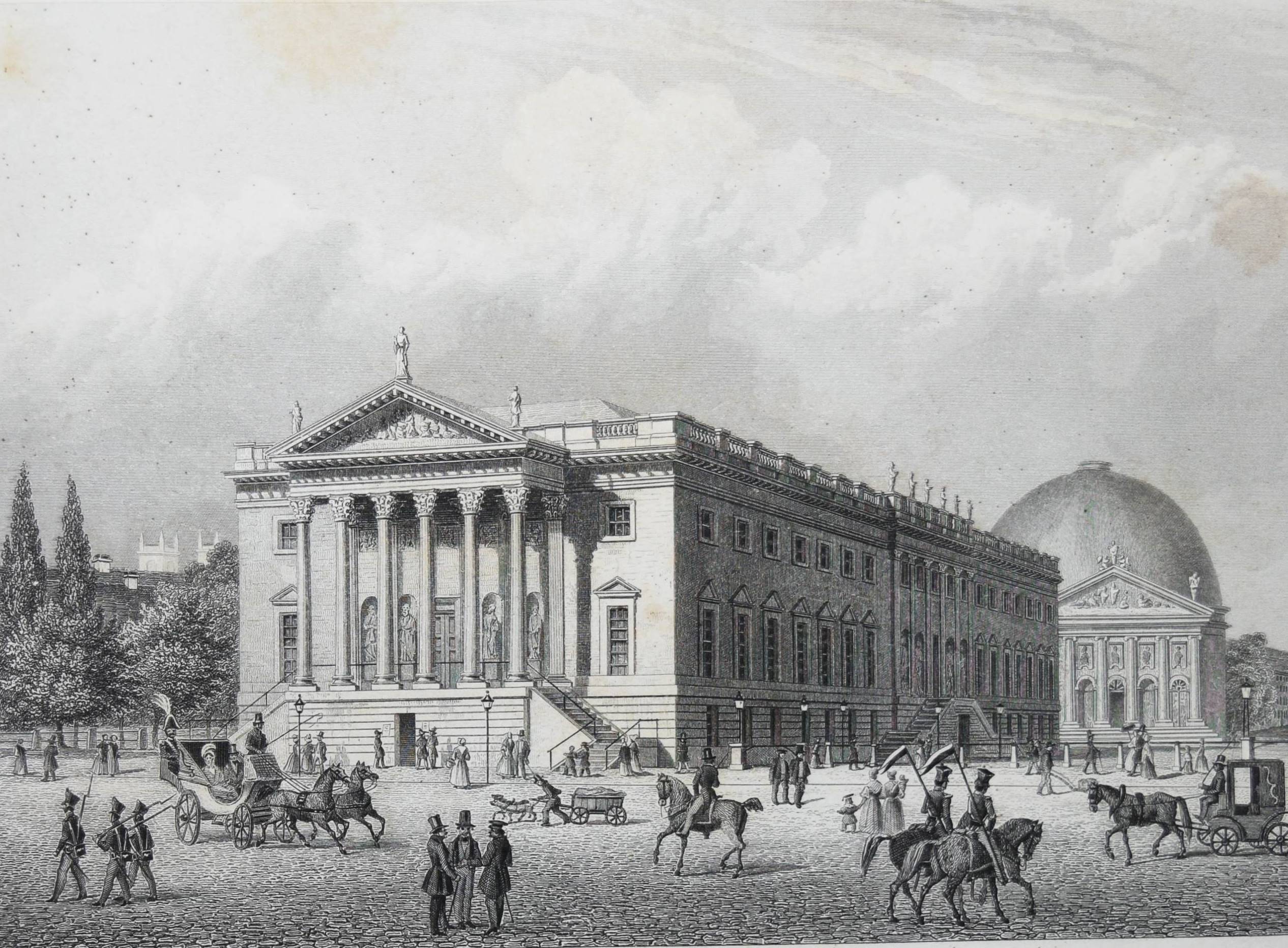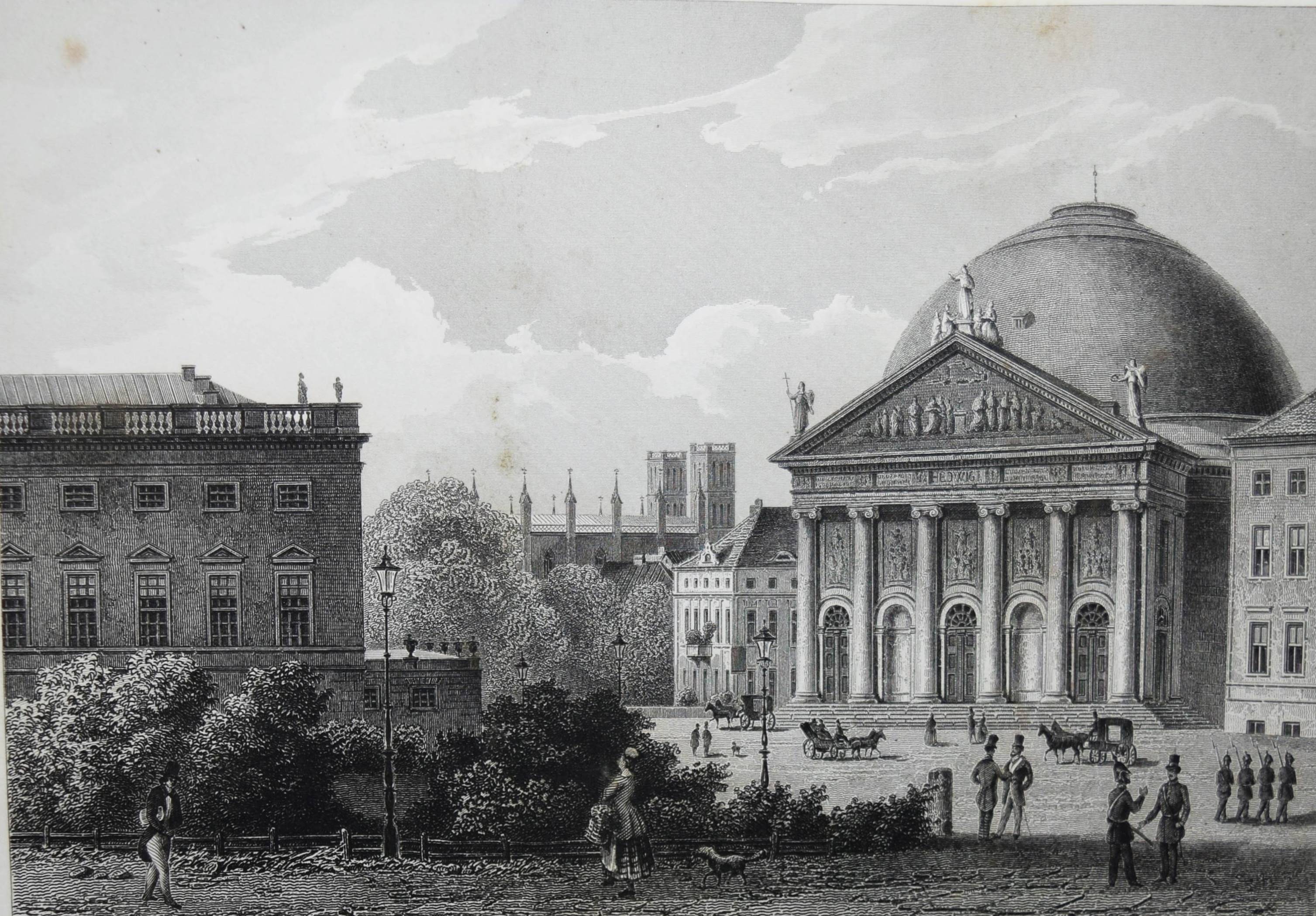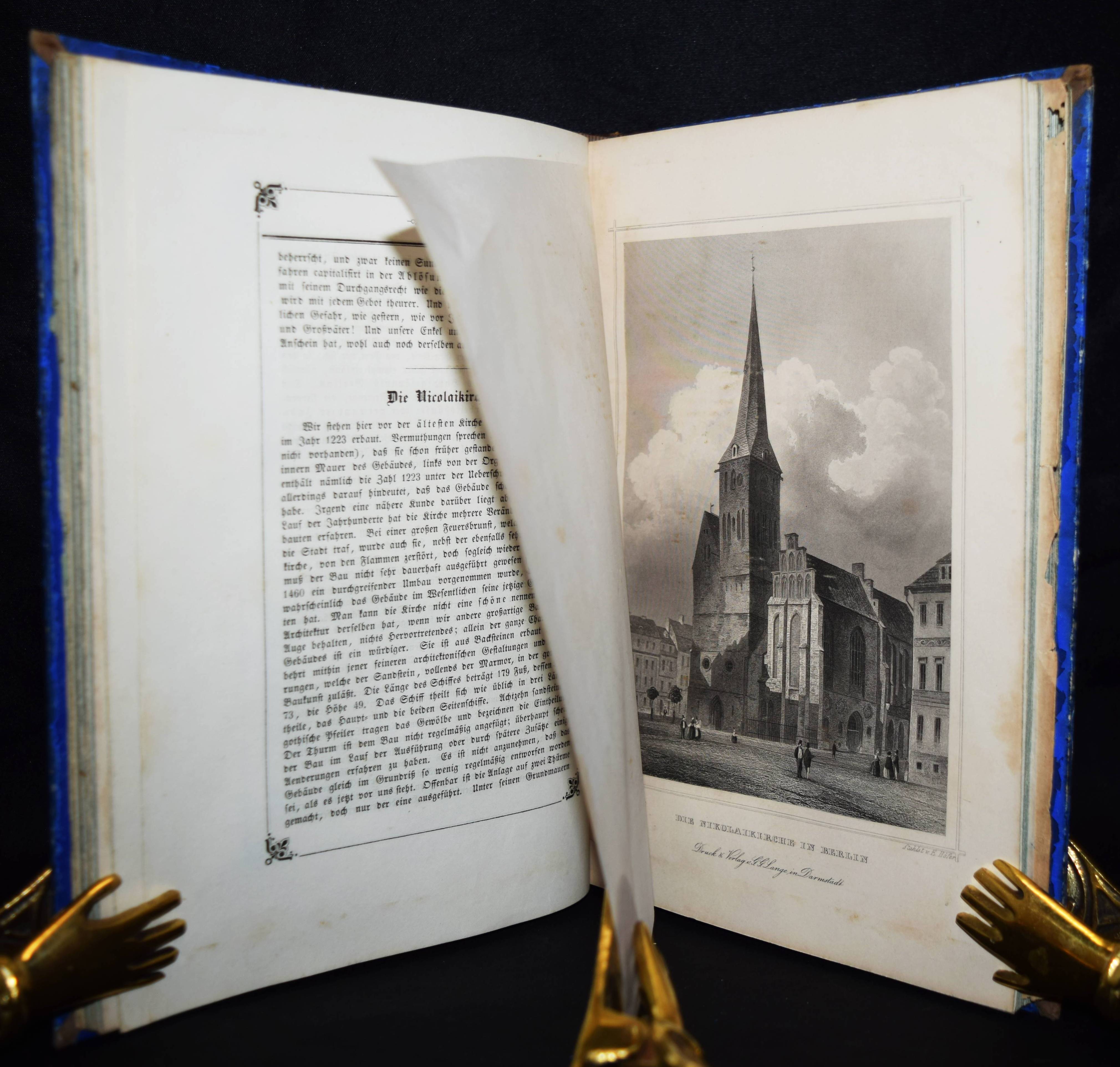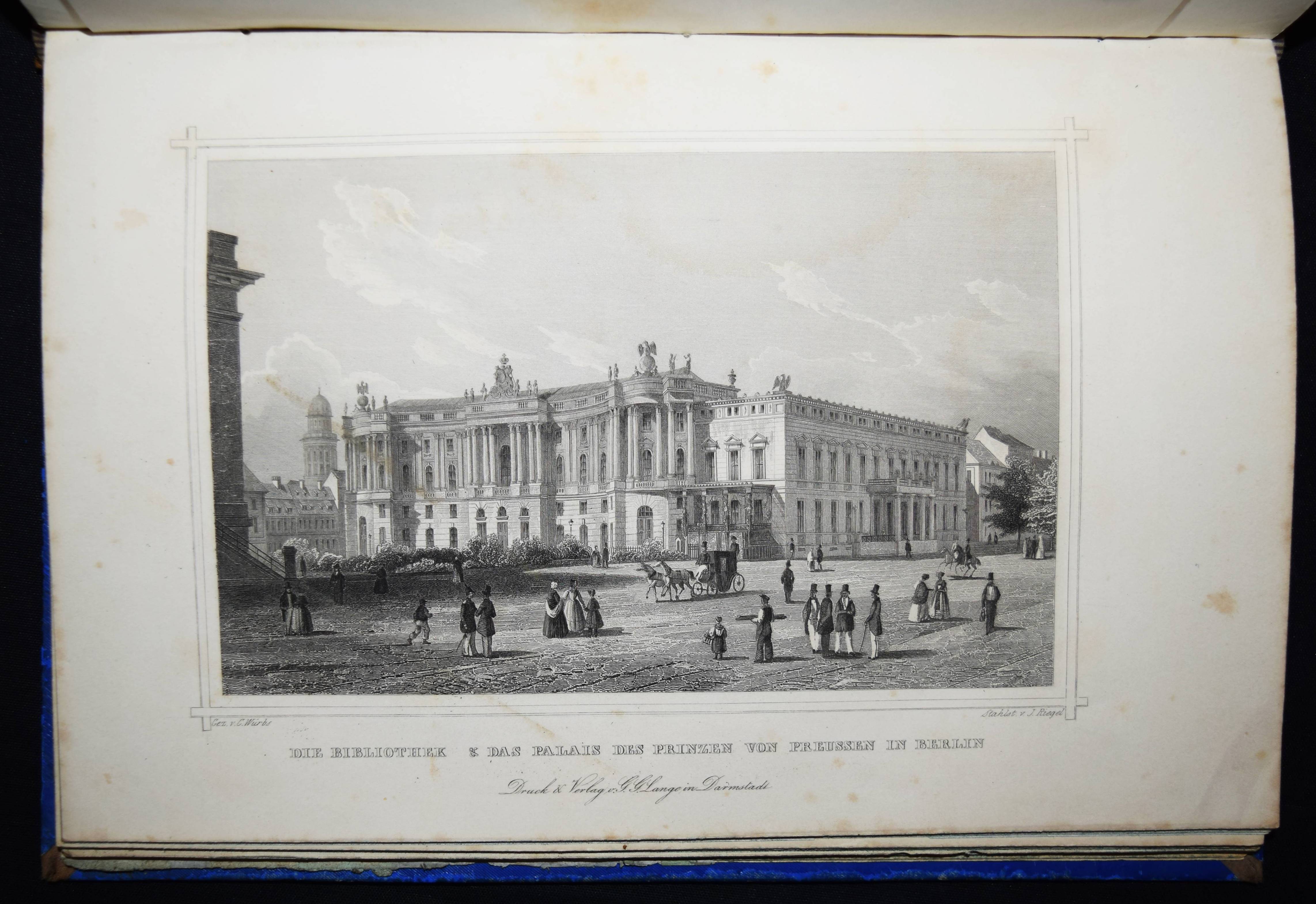 Rellstab, Ludwig. Berlin und seine nächsten Umgebungen in malerischen Originalansichten. Historisch-topographisch beschrieben. Darmstadt, Lange 1852. Gr.-8°. Gestoch. Frontispiz, gestoch. illustr. Titel, 152 S. u. 32 (statt 30) Stahlstich-Ansichten. Halblederband der Zeit mit goldgepr. Rückentitel u. Linienverg. Berlin-Bibliographie 63 (verz. für diese Ausgabe nur 30 Ansichten). Engelmann I, 346. – Eines der schönsten Ansichtenwerke des 19. Jahrhunderts nach der Arbeit Spikers. Hier mit zwei zusätzlichen Ansichten: „Das Marmorpalais zu Sanssouci“ und „Der Hamburger Eisenbahnhof in Berlin“. Außerdem liegt noch 1 handkol. Lithographie „Das Industrie-Gebaeude in Berlin“ (Nürnberg, Renner & Schuster um 1840) bei. – Einband etwas berieben, eine Tafel (″Der Gendarmen-Markt“) lose, fleckig und mit Randläsuren, wenige Tafeln etwas fleckig, sonst gut erhalten.