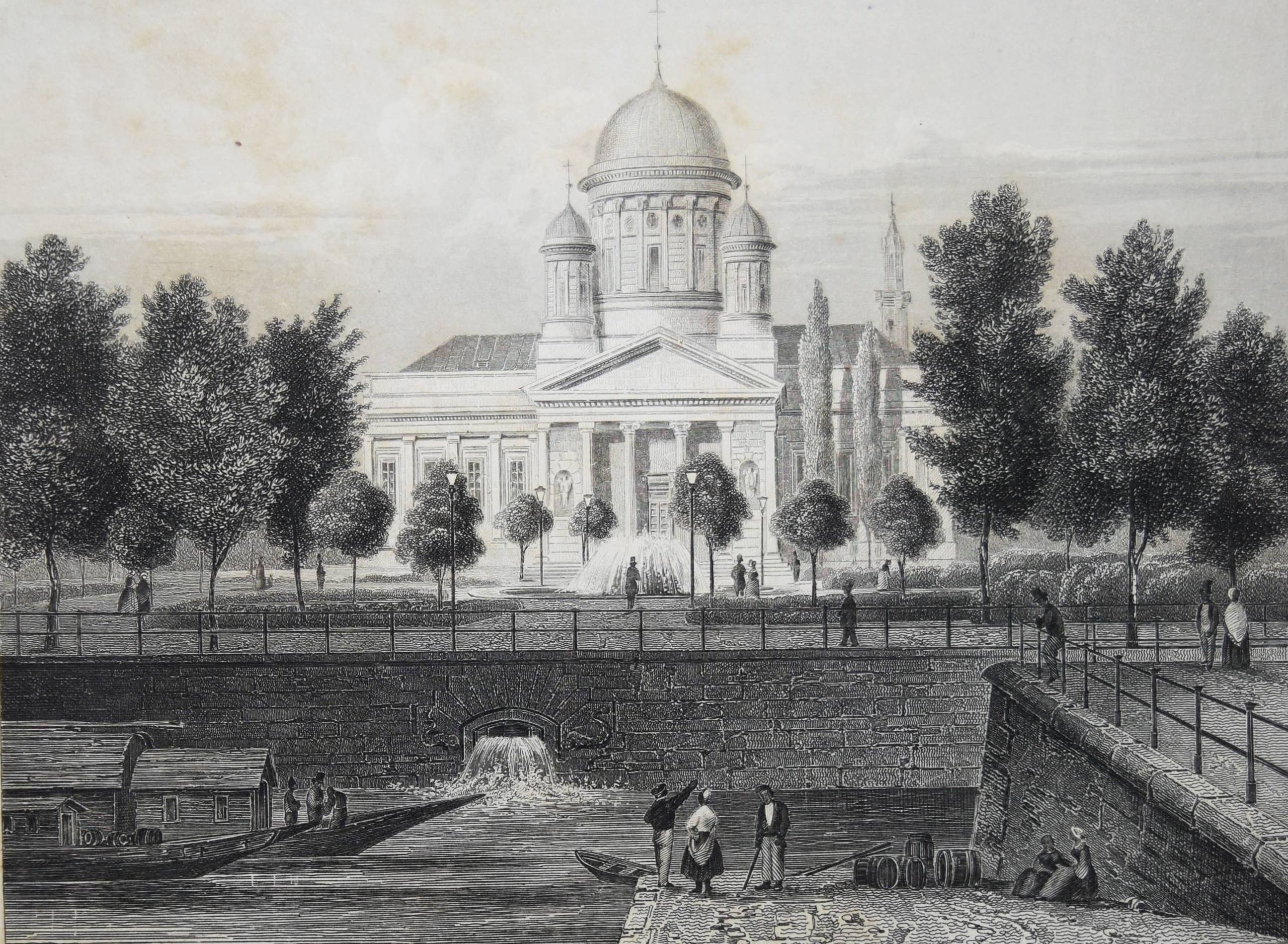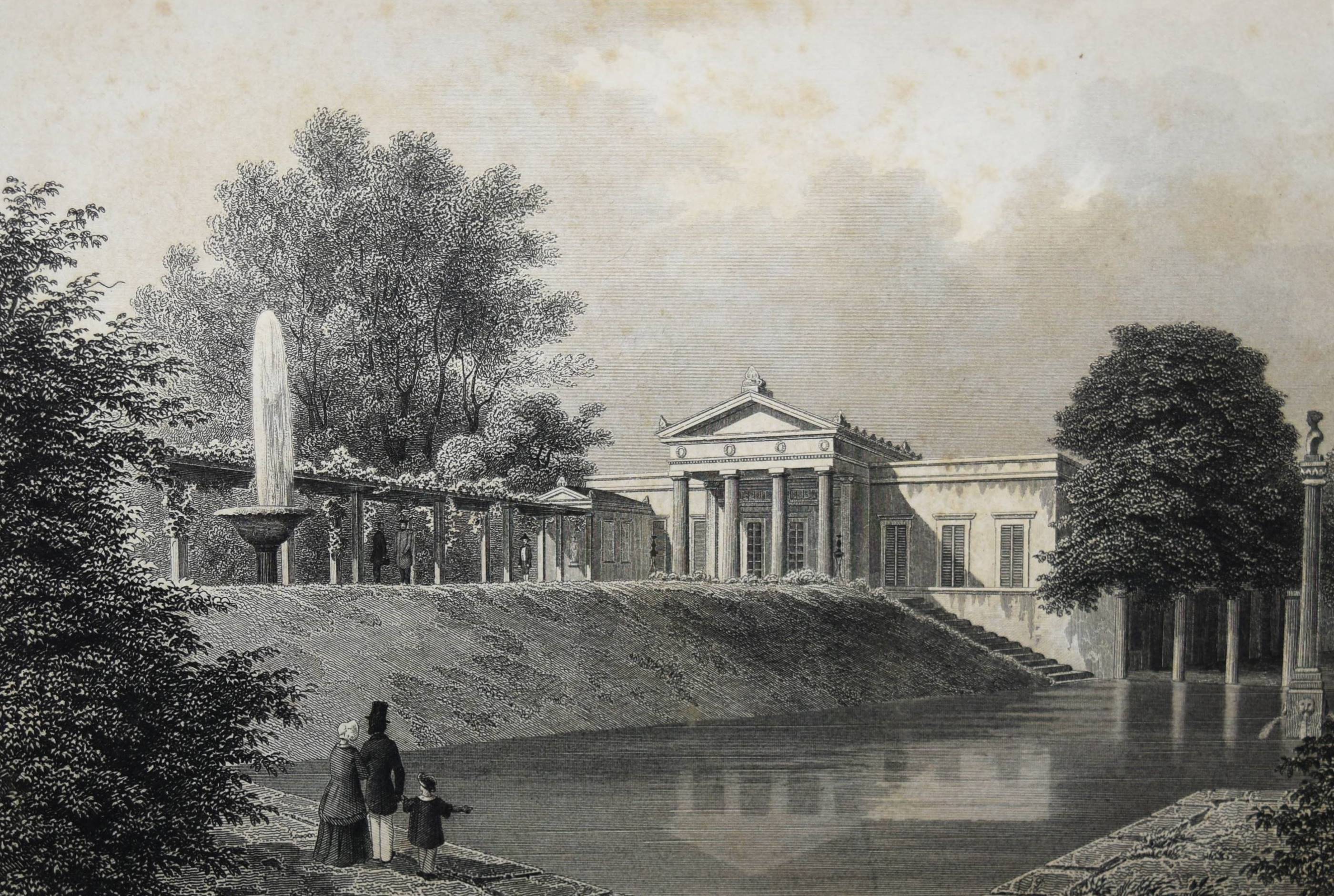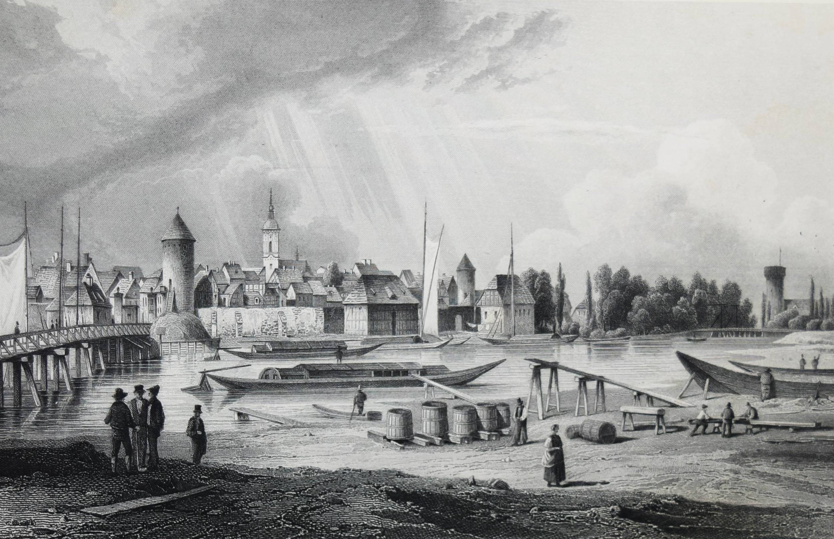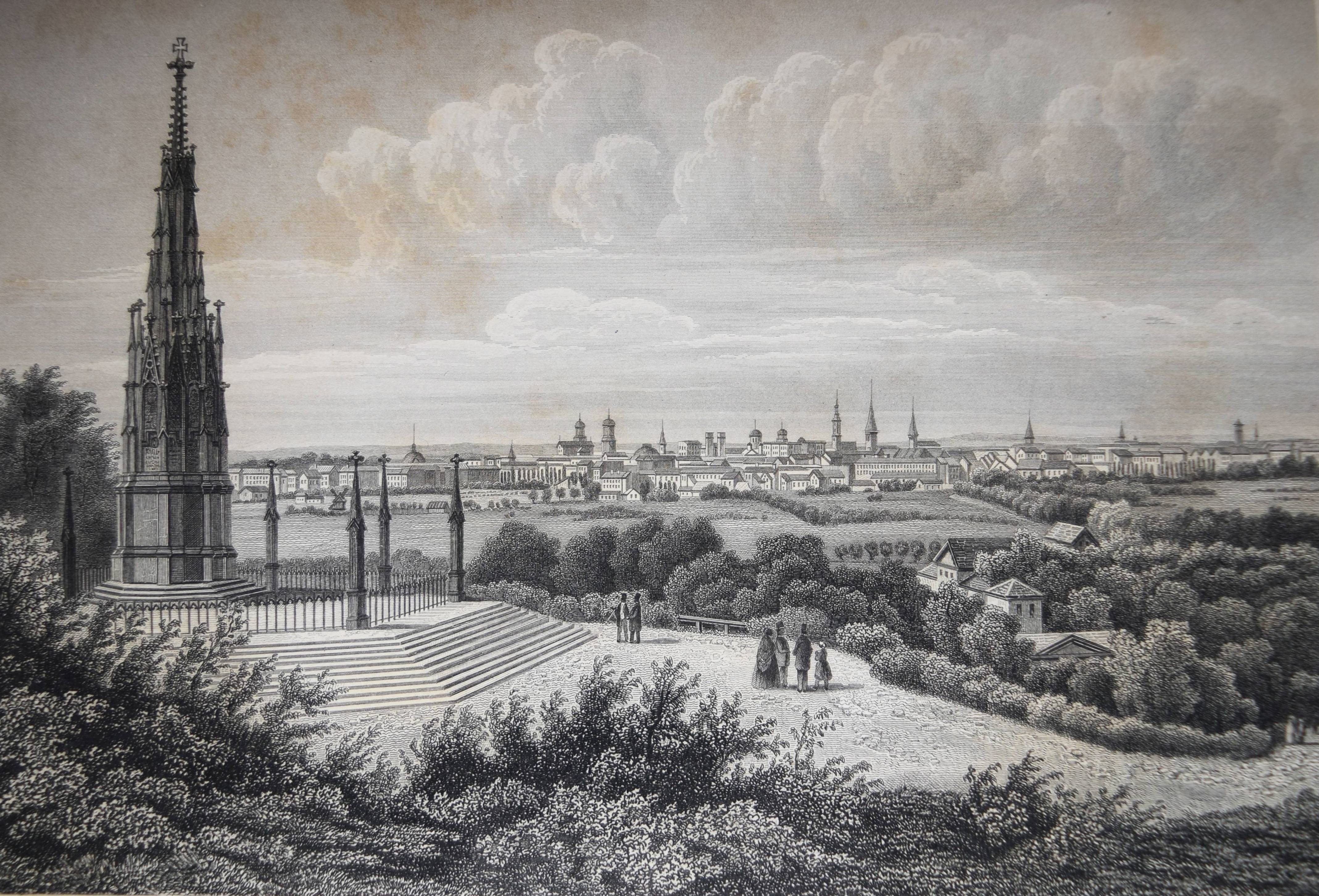Rellstab, Ludwig. Berlin und seine nächsten Umgebungen in malerischen Originalansichten. Historisch-topographisch beschrieben. Darmstadt, Lange 1852. Gr.-8°. Gestoch. Frontispiz, gestoch. illustr. Titel, 152 S. u. 32 (statt 30) Stahlstich-Ansichten. Halblederband der Zeit mit goldgepr. Rückentitel u. Linienverg. Berlin-Bibliographie 63 (verz. für diese Ausgabe nur 30 Ansichten). Engelmann I, 346. – Eines der schönsten Ansichtenwerke des 19. Jahrhunderts nach der Arbeit Spikers. Hier mit zwei zusätzlichen Ansichten: „Das Marmorpalais zu Sanssouci“ und „Der Hamburger Eisenbahnhof in Berlin“. Außerdem liegt noch 1 handkol. Lithographie „Das Industrie-Gebaeude in Berlin“ (Nürnberg, Renner & Schuster um 1840) bei. – Einband etwas berieben, eine Tafel (″Der Gendarmen-Markt“) lose, fleckig und mit Randläsuren, wenige Tafeln etwas fleckig, sonst gut erhalten.