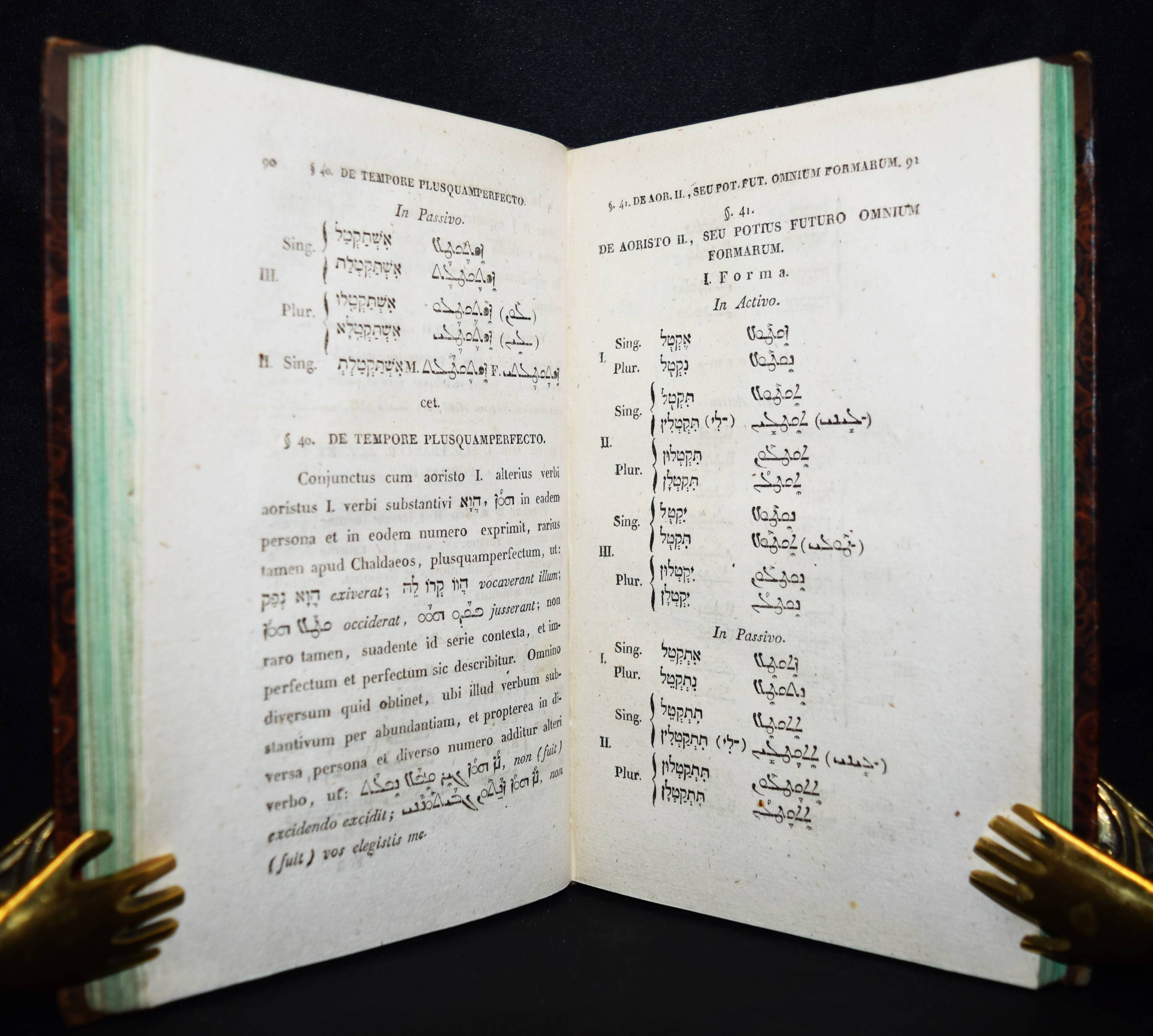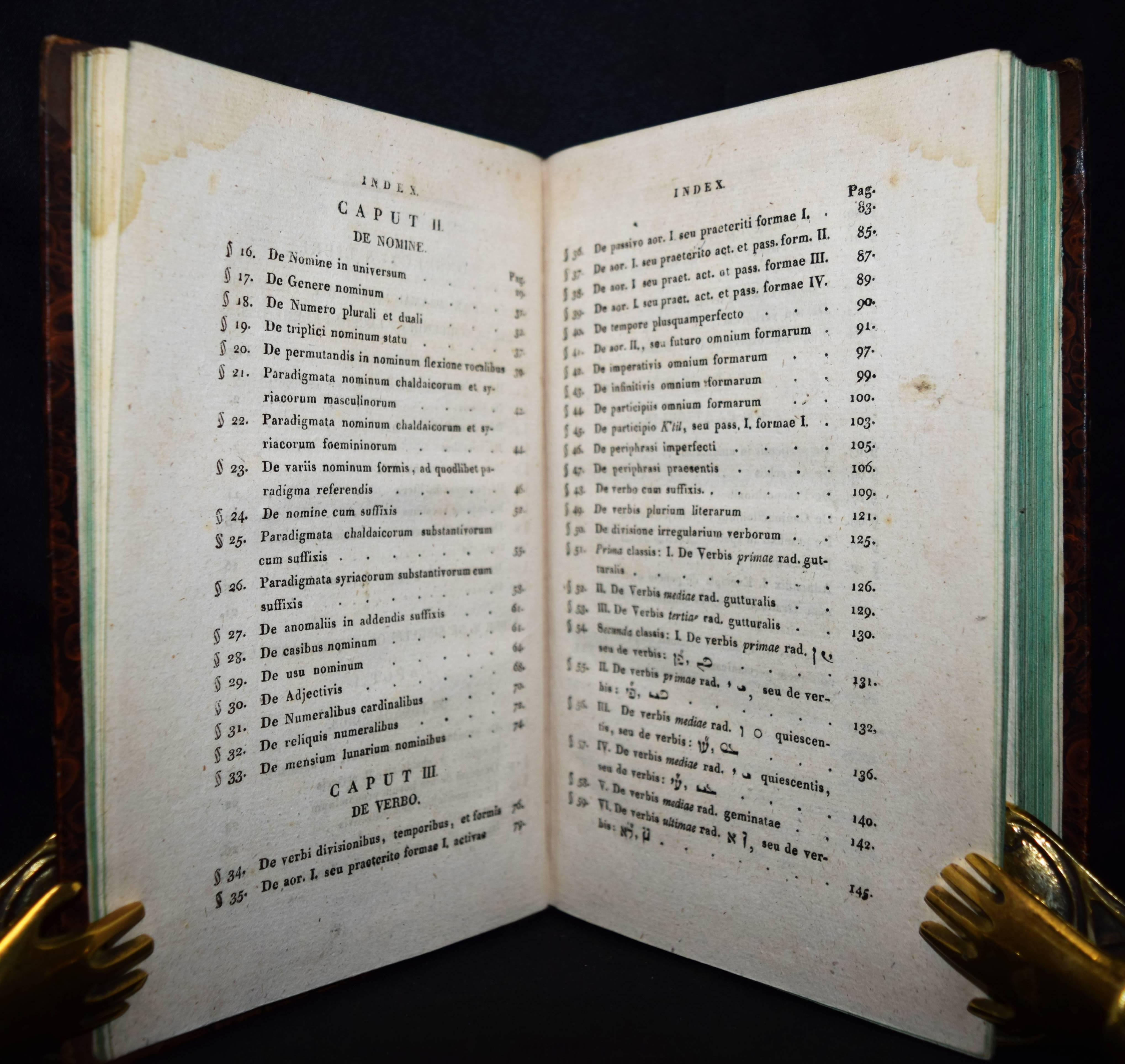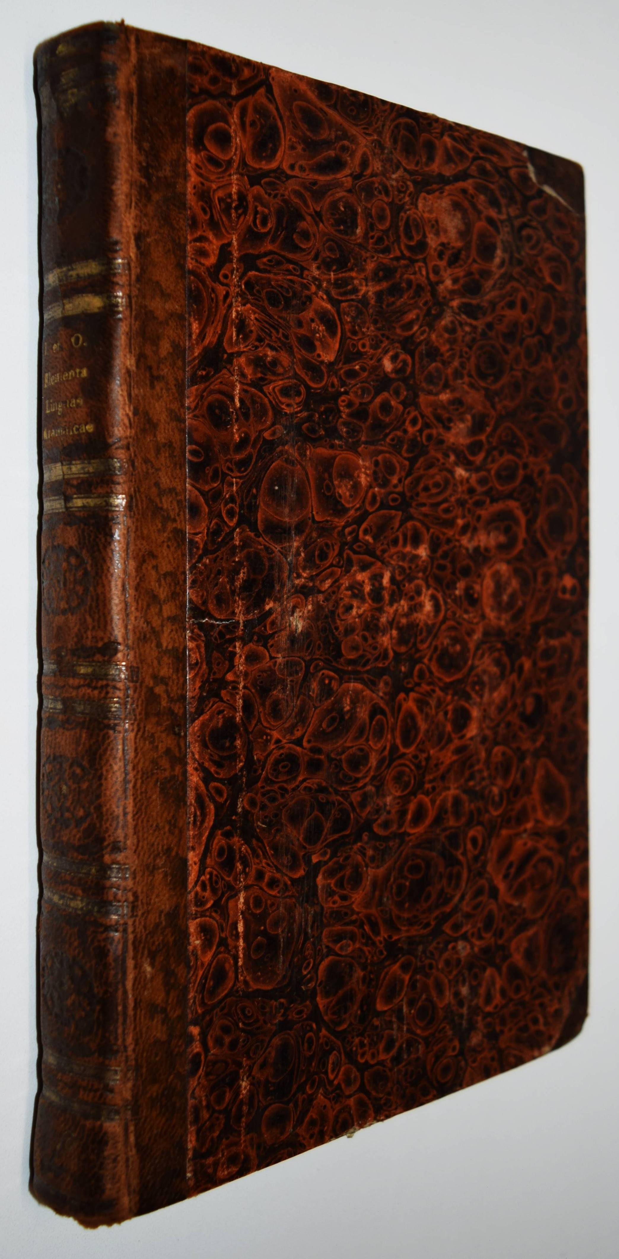 Jahn, Johann. Elementa Aramaicae seu Chaldaeo-Syriacae linguae. Wien, Anton Schmid 1820. 8°. XVI, 196, XXX S., [1] Bl. Hldr. d. Zt. mit goldgepr. Rückentitel u. Rückenverg. ADB XIII, 665 ff. Wurzbach X, 44. – Erste lateinische Ausgabe; die deutsche Orig.-Ausgabe erschien bereits 1793. – J. Jahn (1750-1816), seit 1789 Professor für orientalische Sprachen und biblische Archäologie in Wien, veröffentlichte 1793 eine „für Anfänger bestimmte Chaldäische und Syrische Sprachlehre sammt Chrestomathie (1800). … das Wörterbuch ließ er durch den ihm befreundeten Syrer Aryda, der aus seinem Vaterlande vertrieben in Wien lebte und gleichfalls an der Universität lehrte, prüfen und verbessern, einige schriftliche Dialoge mit Aryda sind der Chrestomathie eingeschaltet“ (Werner in ADB). – Einband etwas berieben, nur vereinzelt leicht braunfleckig, gutes Exemplar.
