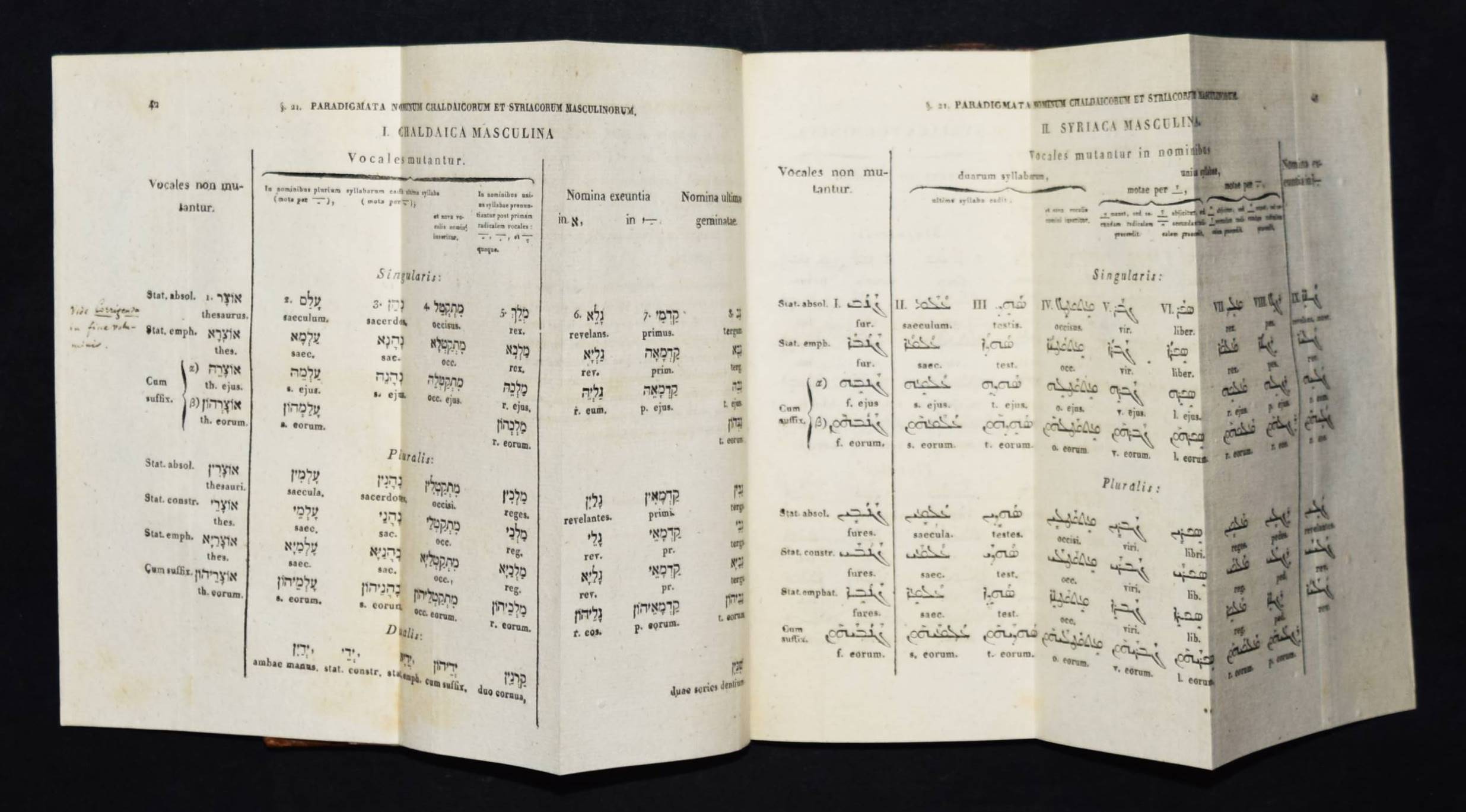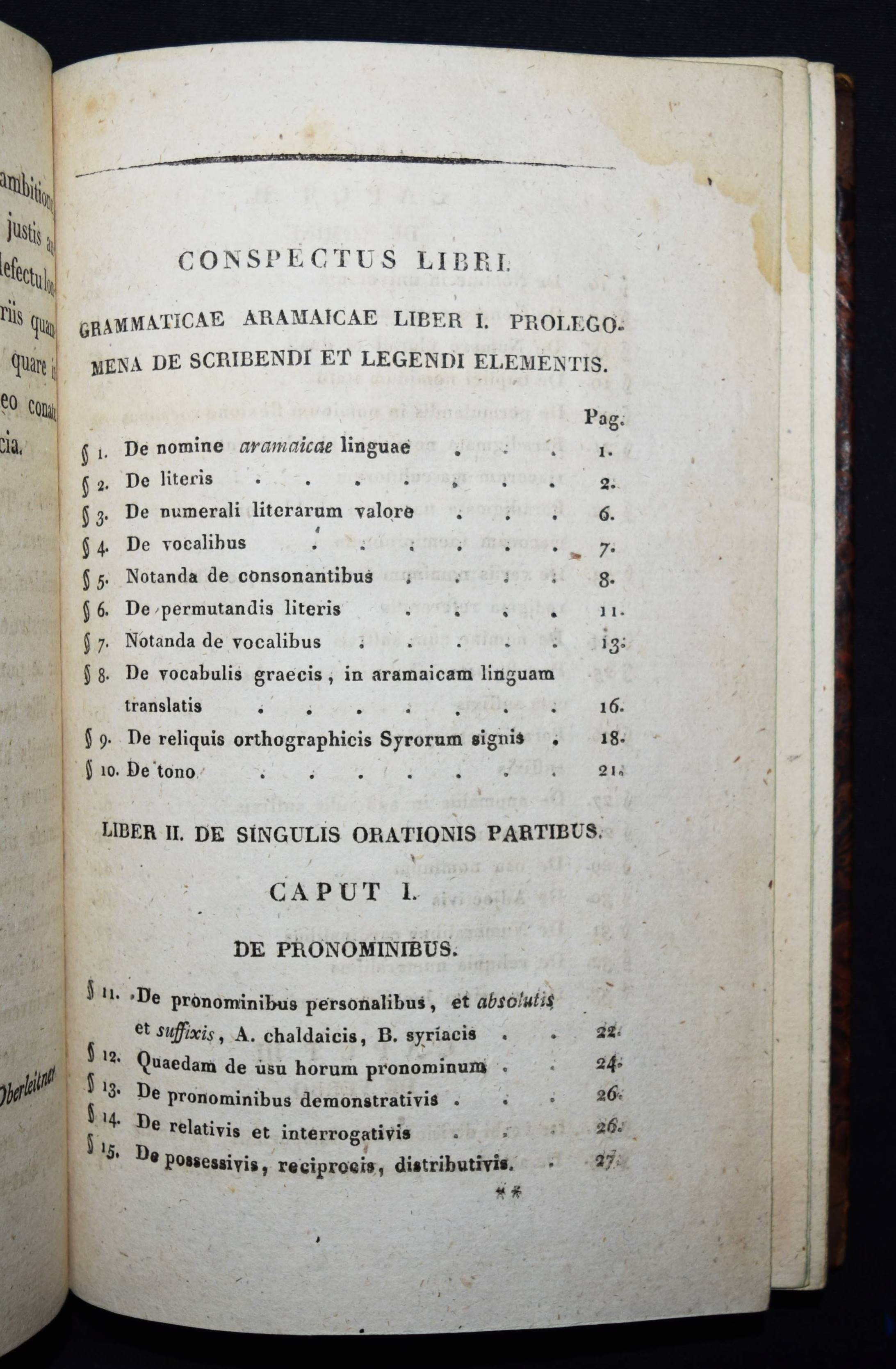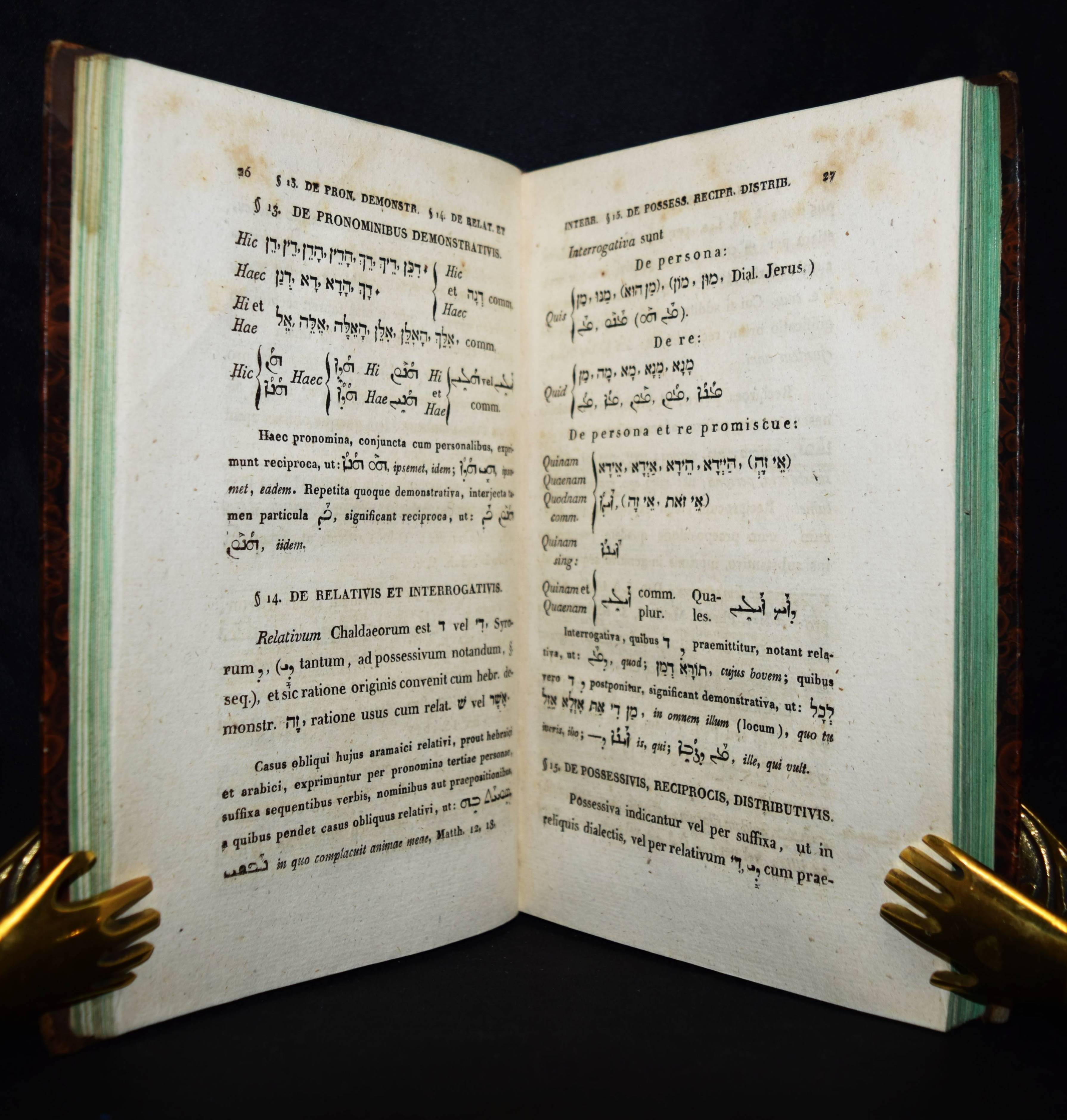 Jahn, Johann. Elementa Aramaicae seu Chaldaeo-Syriacae linguae. Wien, Anton Schmid 1820. 8°. XVI, 196, XXX S., [1] Bl. Hldr. d. Zt. mit goldgepr. Rückentitel u. Rückenverg. ADB XIII, 665 ff. Wurzbach X, 44. – Erste lateinische Ausgabe; die deutsche Orig.-Ausgabe erschien bereits 1793. – J. Jahn (1750-1816), seit 1789 Professor für orientalische Sprachen und biblische Archäologie in Wien, veröffentlichte 1793 eine „für Anfänger bestimmte Chaldäische und Syrische Sprachlehre sammt Chrestomathie (1800). … das Wörterbuch ließ er durch den ihm befreundeten Syrer Aryda, der aus seinem Vaterlande vertrieben in Wien lebte und gleichfalls an der Universität lehrte, prüfen und verbessern, einige schriftliche Dialoge mit Aryda sind der Chrestomathie eingeschaltet“ (Werner in ADB). – Einband etwas berieben, nur vereinzelt leicht braunfleckig, gutes Exemplar.