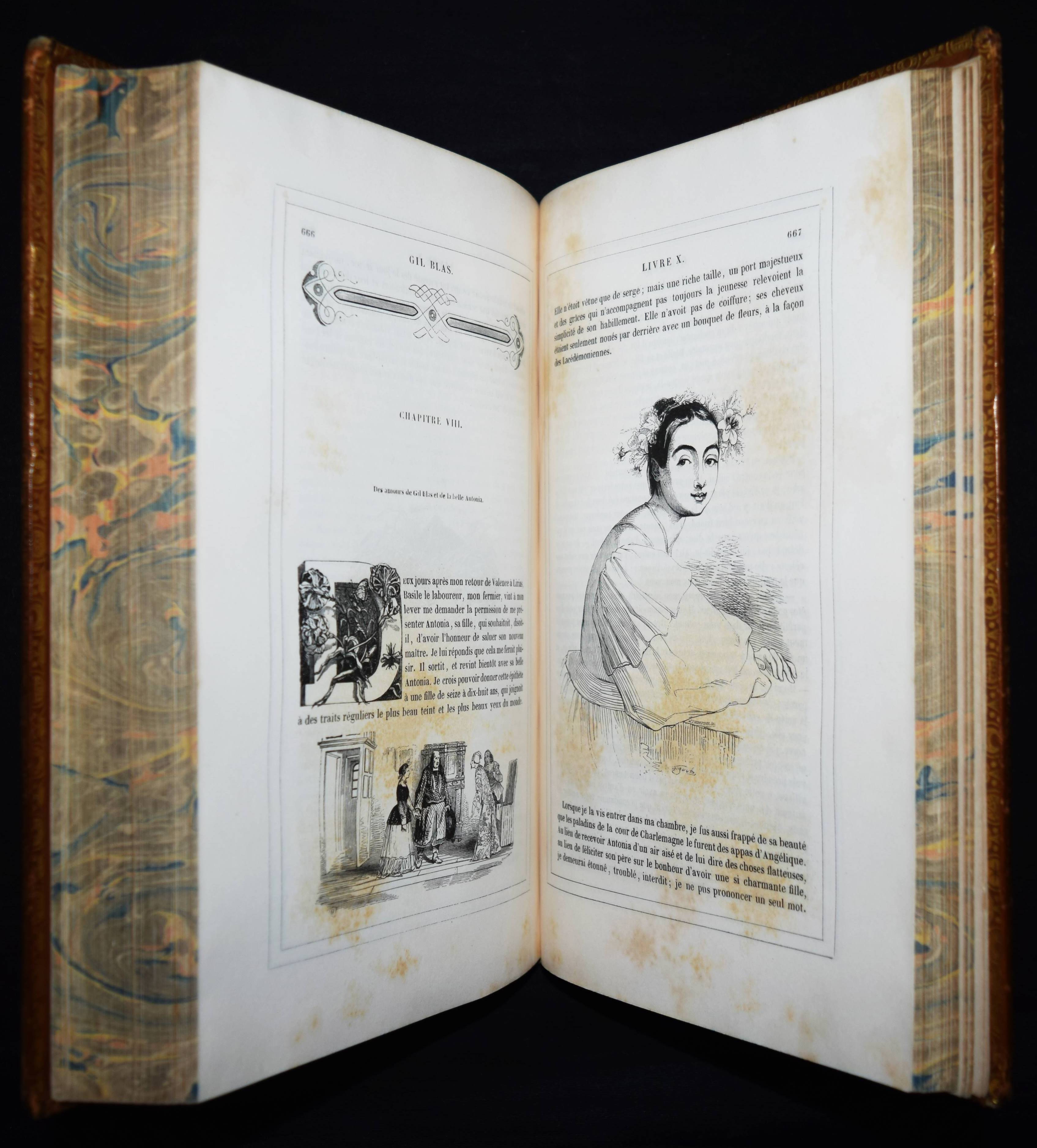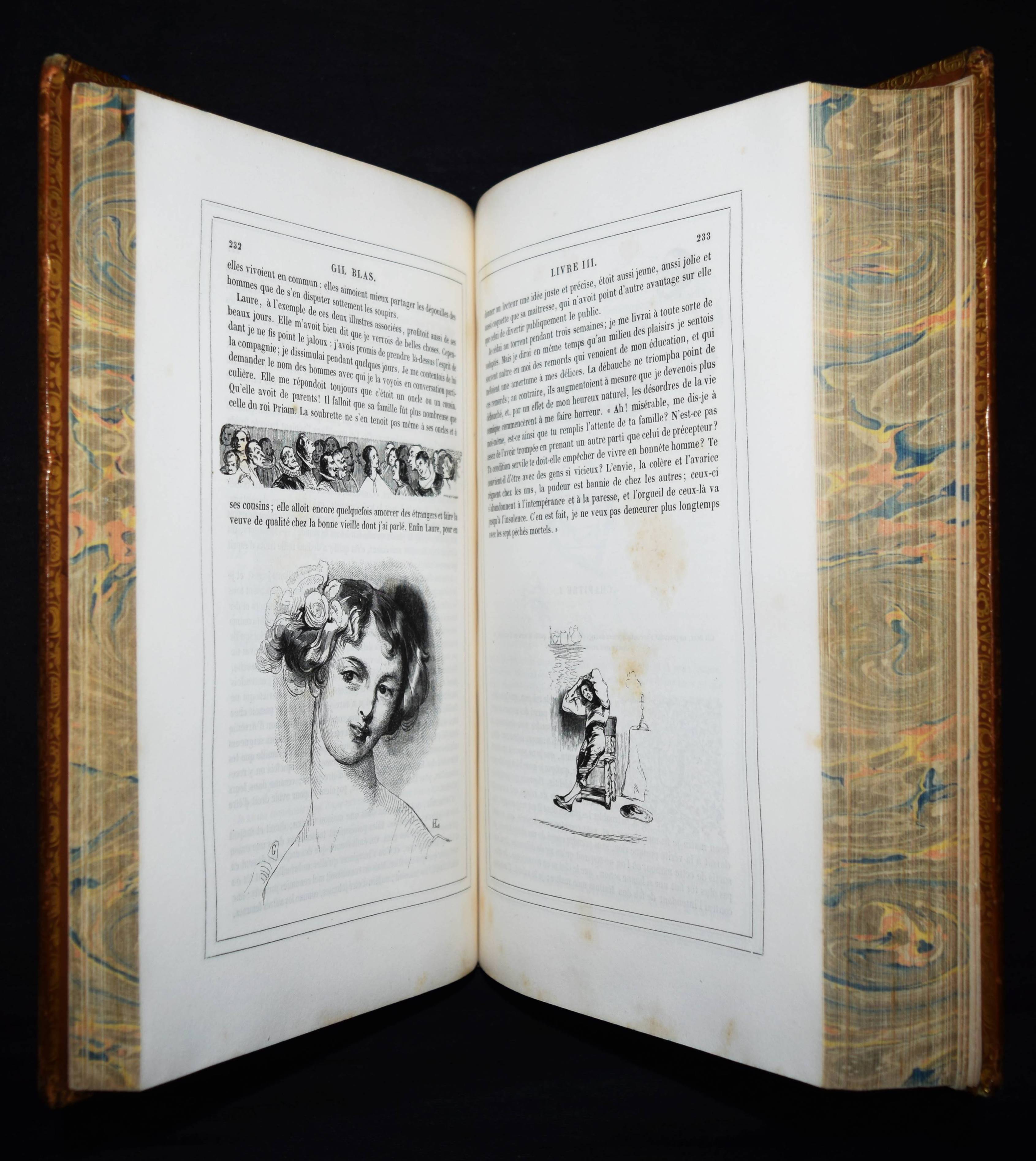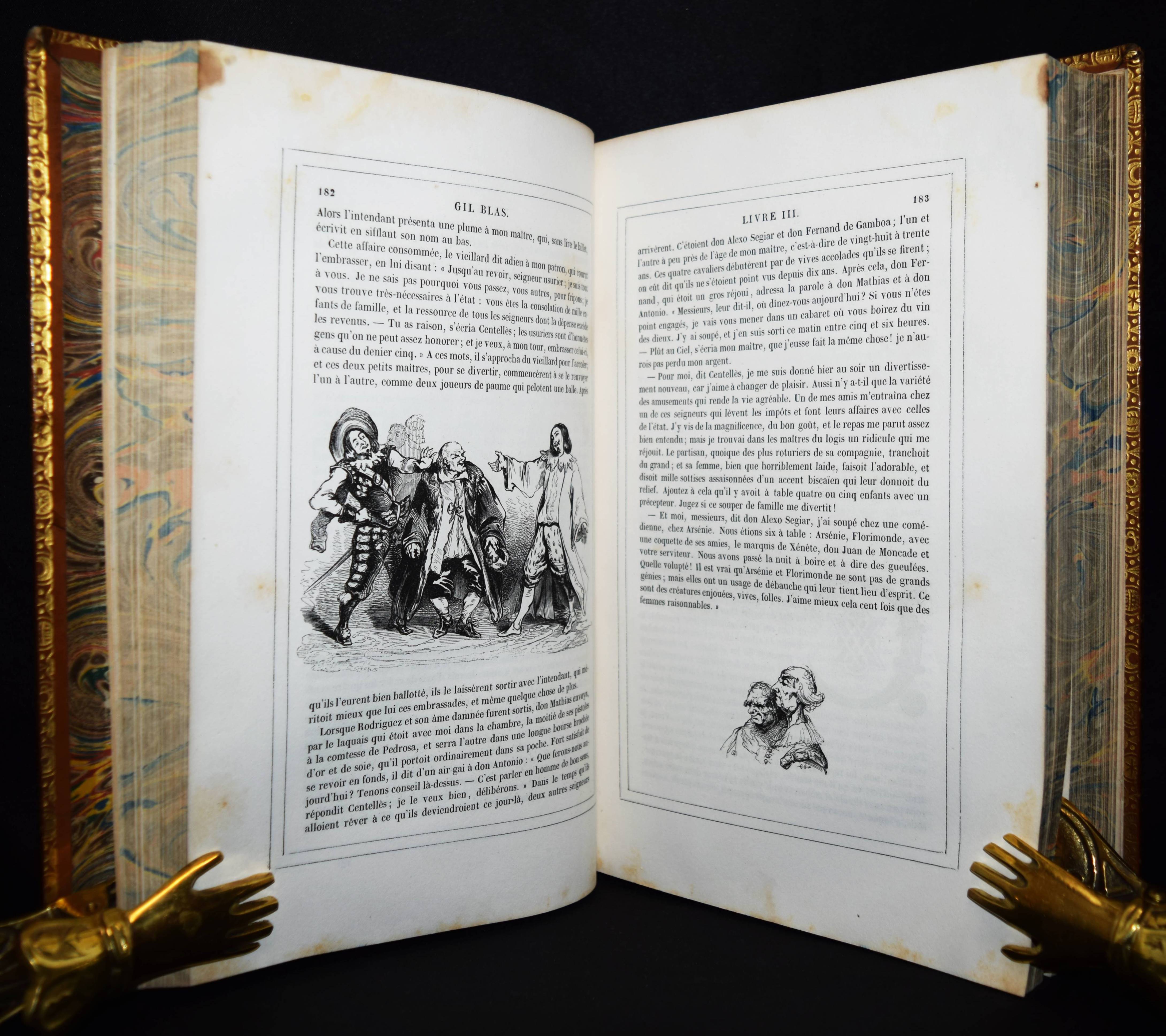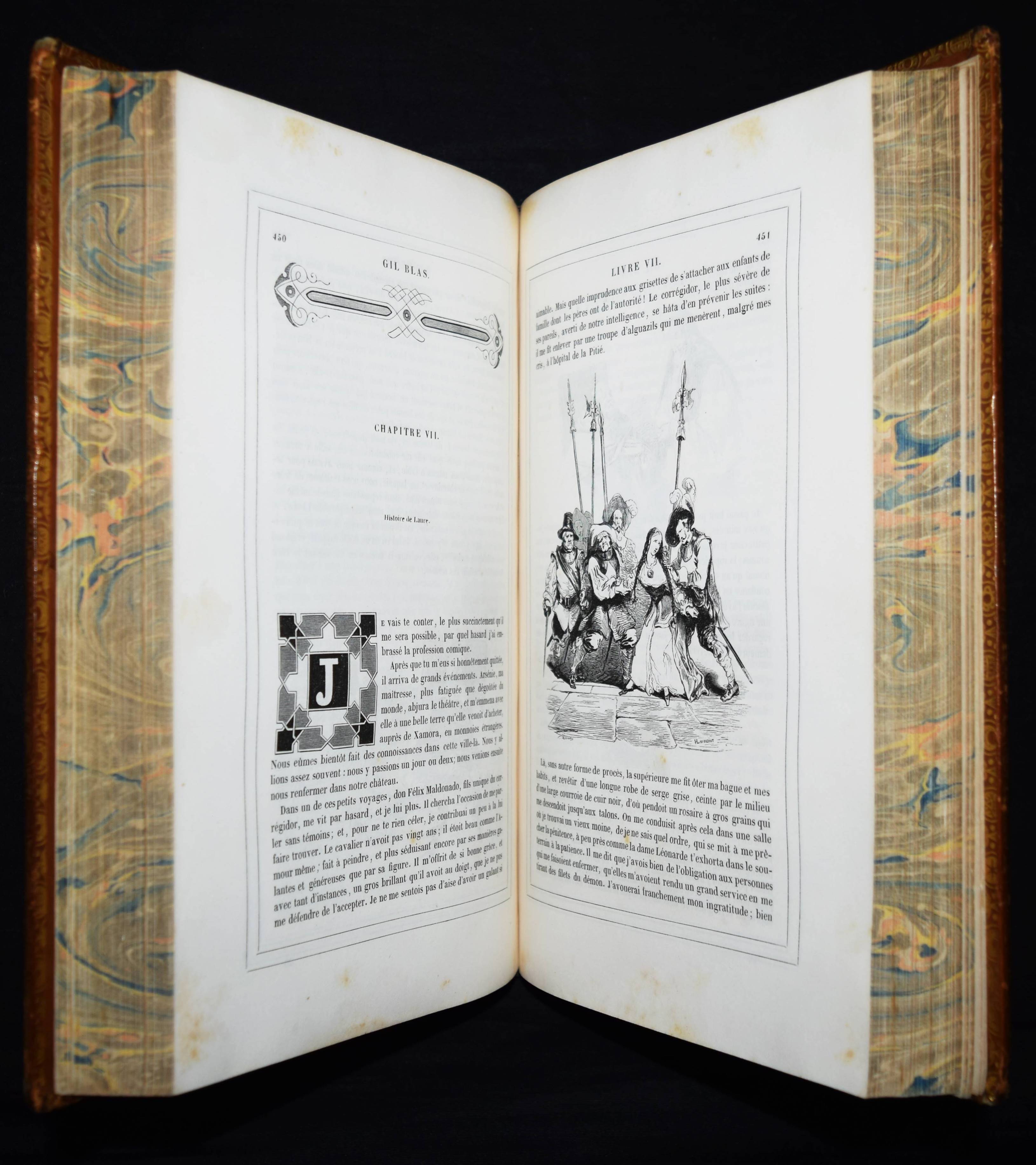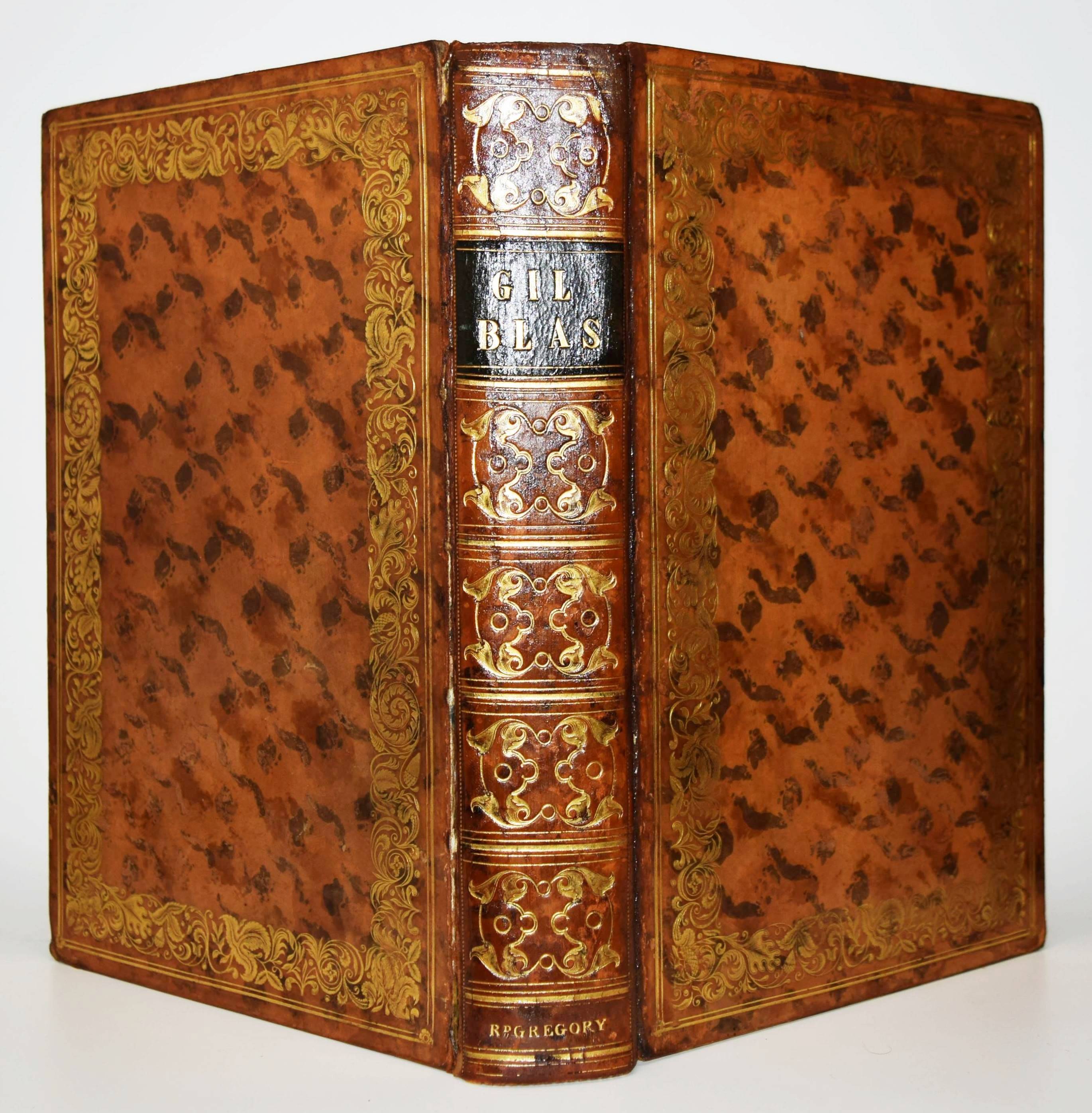 Le Sage, Alain René. Histoire de Gil Blas de Santillane. Vignettes par Jean Gigoux. Paris, Dubouchet et Cie. 1838. Gr.-8°. 829 S. mit illustr. Vortitel, Frontispiz, illustr. Titel u. zahlr. Holzschnitt-Illustrationen. Kalbledereinband d. Zt. mit goldgepr. Rückenschild, Rücken- u. Deckelverg. u. Innenkantenverg. (sign. ″RD. GREGORY″). Sander 440 Anm. – Dritte erweiterte Ausgabe mit ca. 50 neuen Illustrationen (z. T. die früheren ersetzt oder verändert). Die Abdrucke sind besser als in der ersten und zweiten Ausgabe. – Gelenke restauriert, hinteres Gelenk spröde aber fest, durchgehend etwas stockfleckig, gutes Exemplar in einem dekorativen signierten Handeinband.
