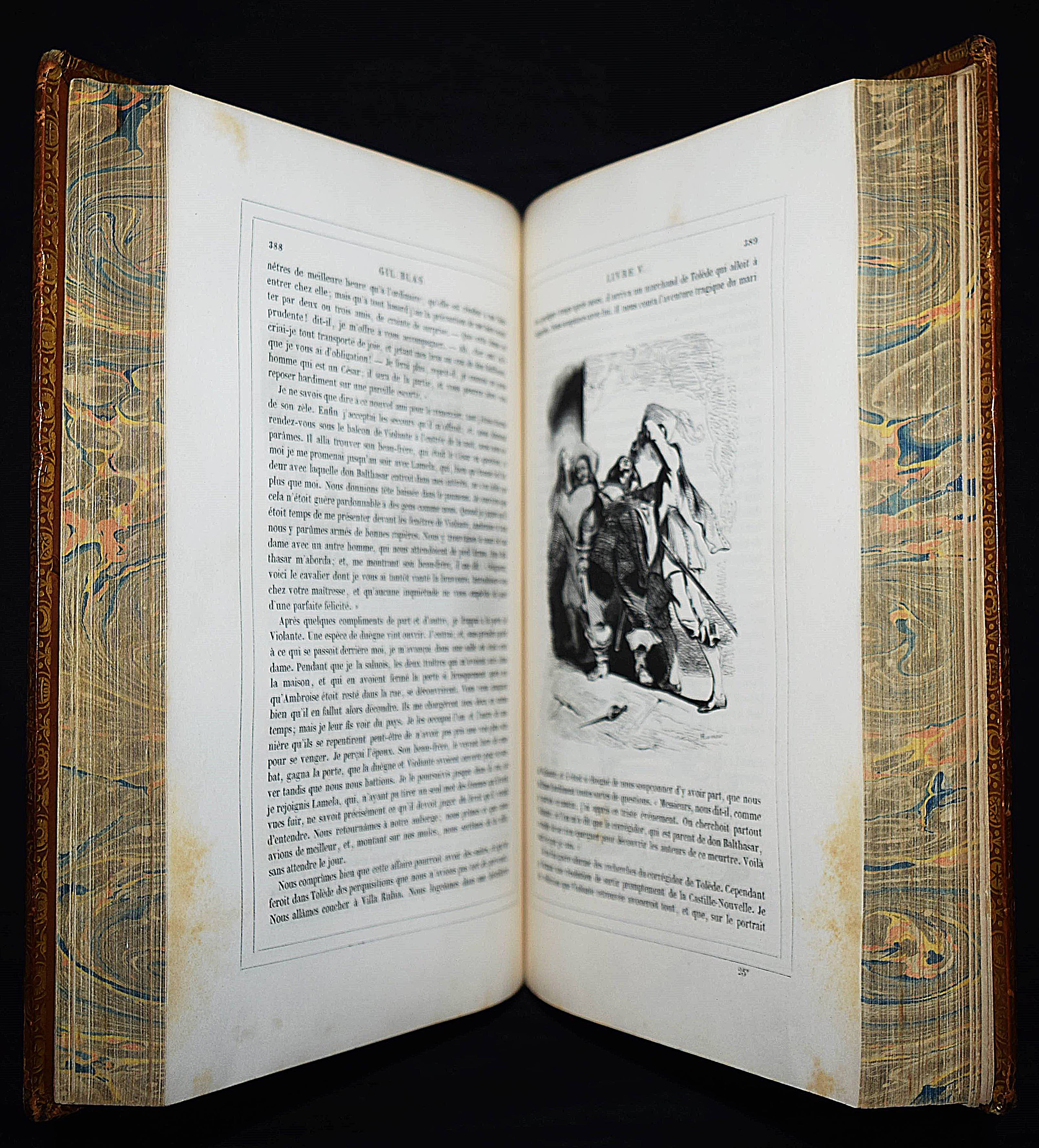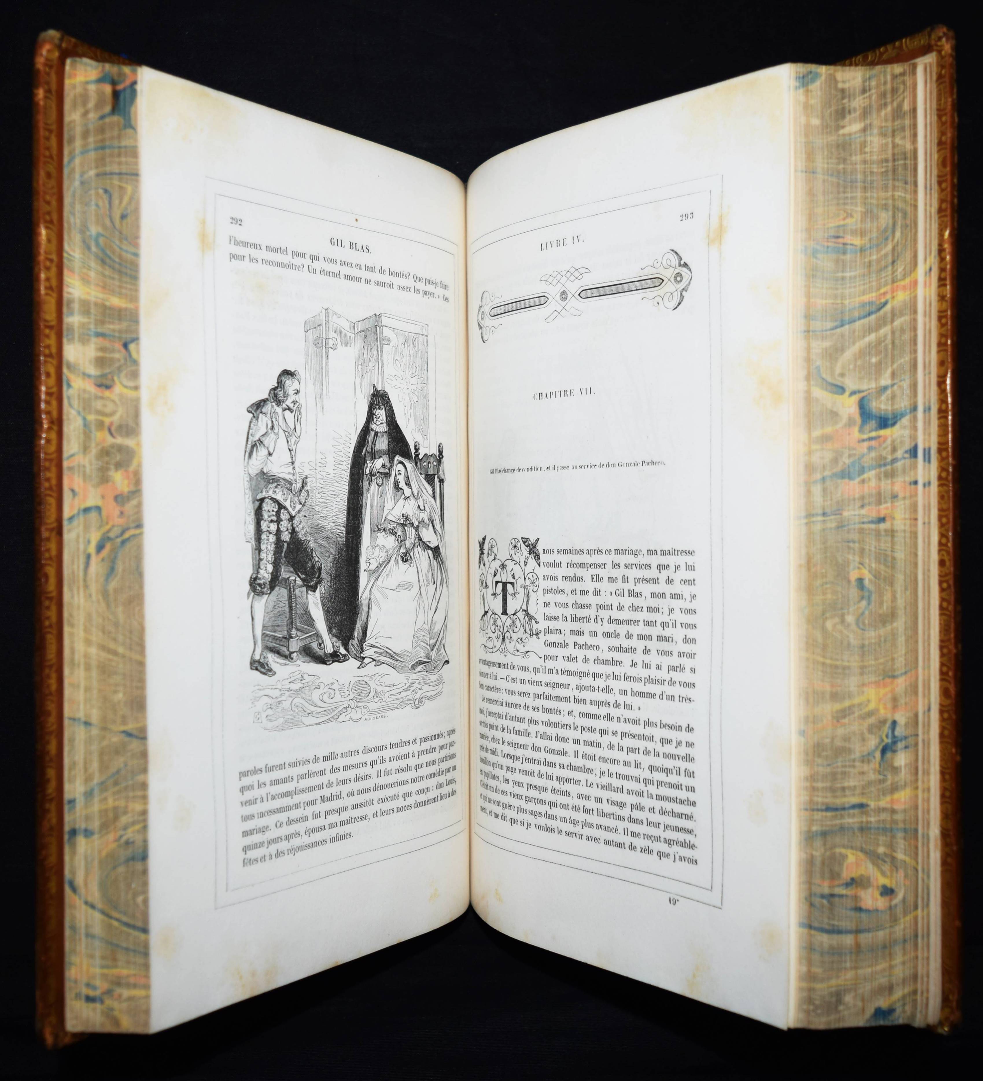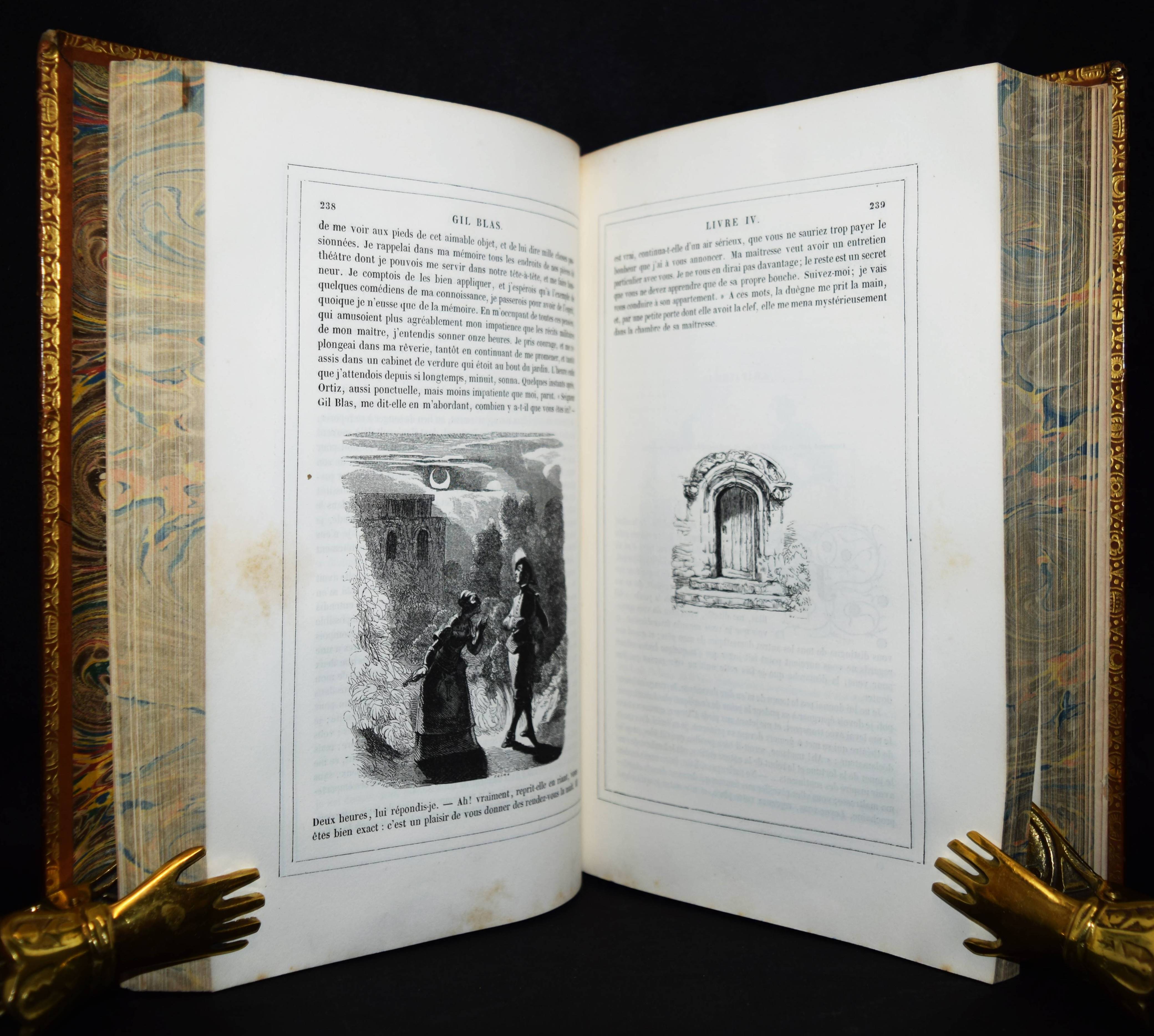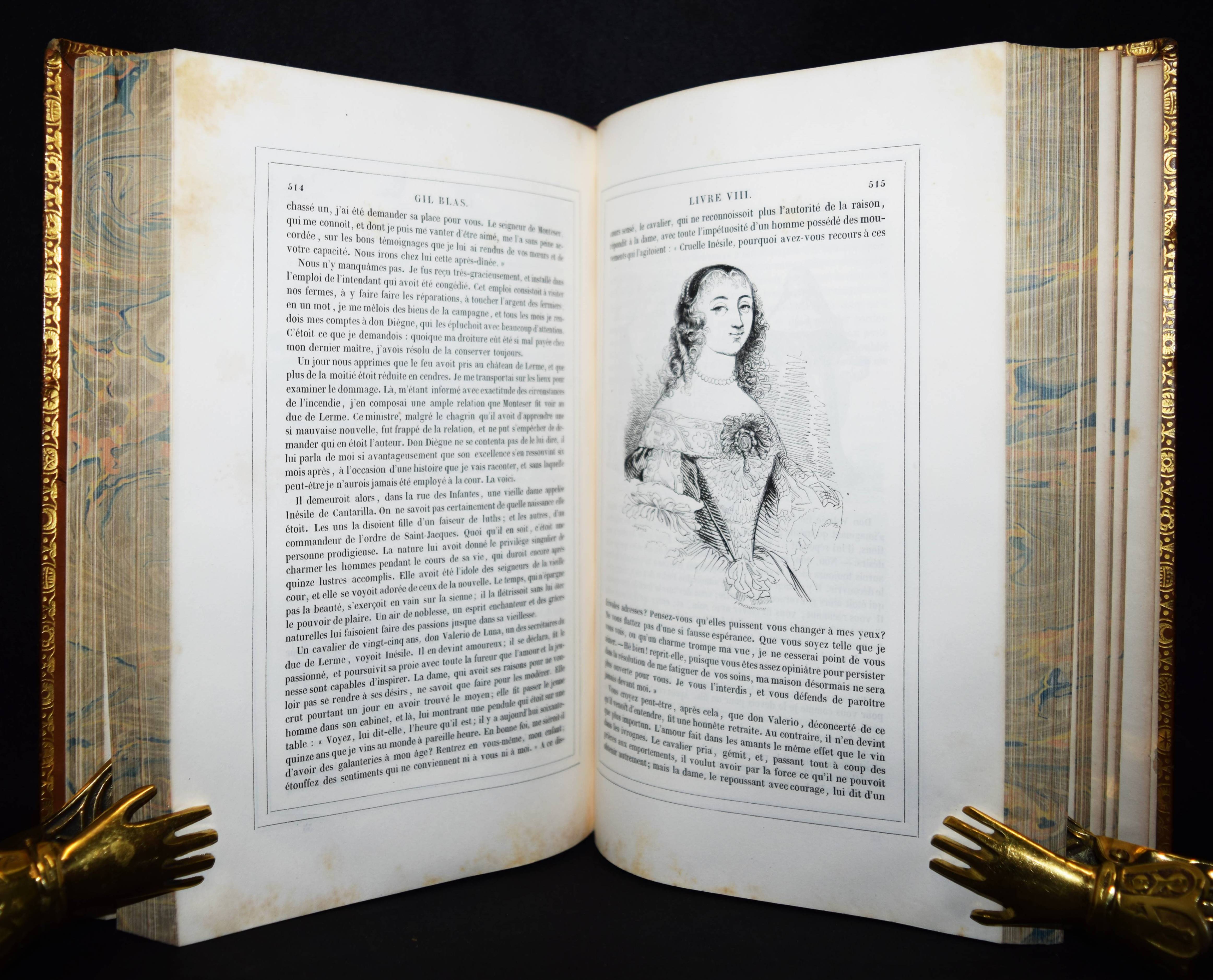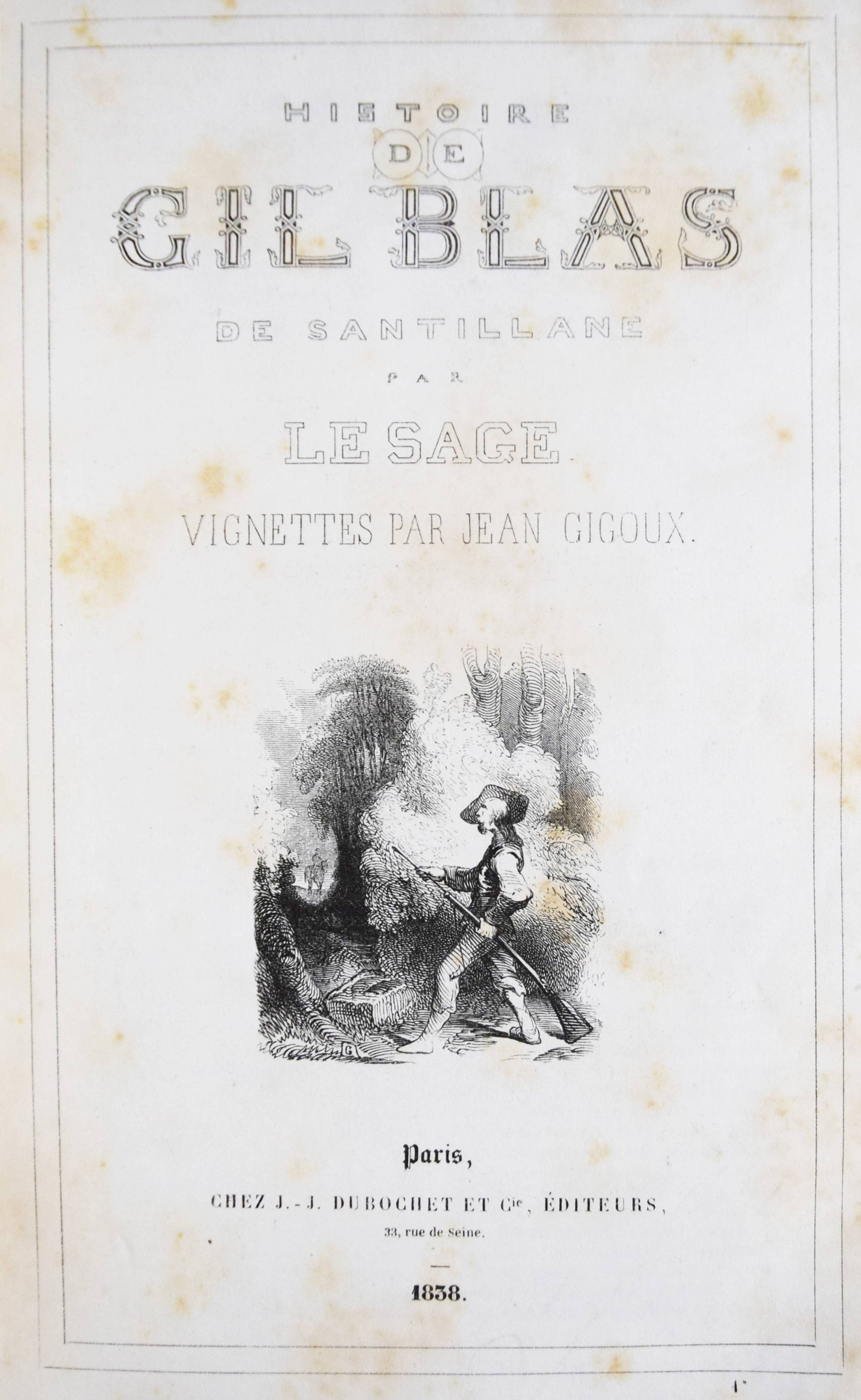 Le Sage, Alain René. Histoire de Gil Blas de Santillane. Vignettes par Jean Gigoux. Paris, Dubouchet et Cie. 1838. Gr.-8°. 829 S. mit illustr. Vortitel, Frontispiz, illustr. Titel u. zahlr. Holzschnitt-Illustrationen. Kalbledereinband d. Zt. mit goldgepr. Rückenschild, Rücken- u. Deckelverg. u. Innenkantenverg. (sign. ″RD. GREGORY″). Sander 440 Anm. – Dritte erweiterte Ausgabe mit ca. 50 neuen Illustrationen (z. T. die früheren ersetzt oder verändert). Die Abdrucke sind besser als in der ersten und zweiten Ausgabe. – Gelenke restauriert, hinteres Gelenk spröde aber fest, durchgehend etwas stockfleckig, gutes Exemplar in einem dekorativen signierten Handeinband.