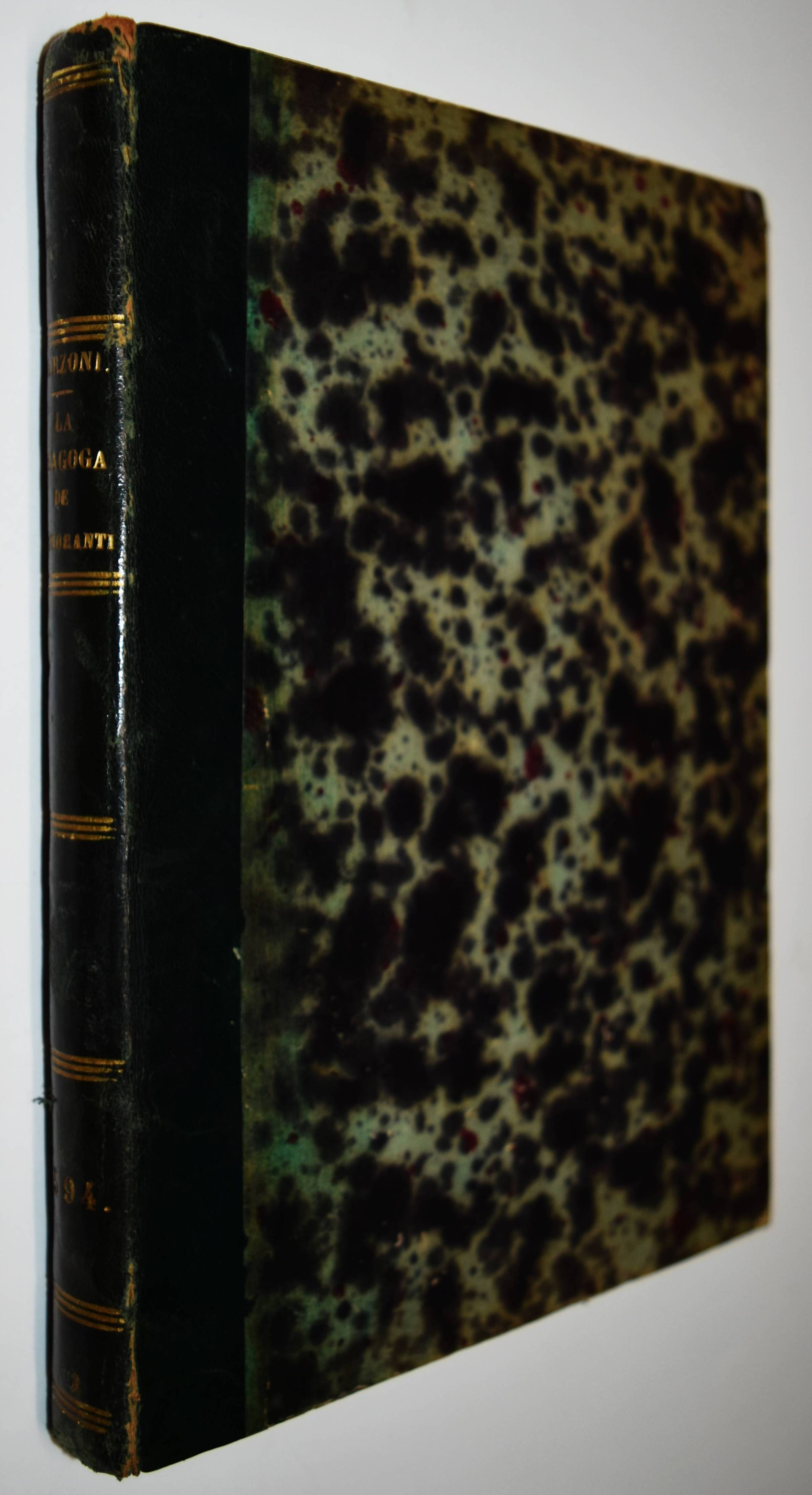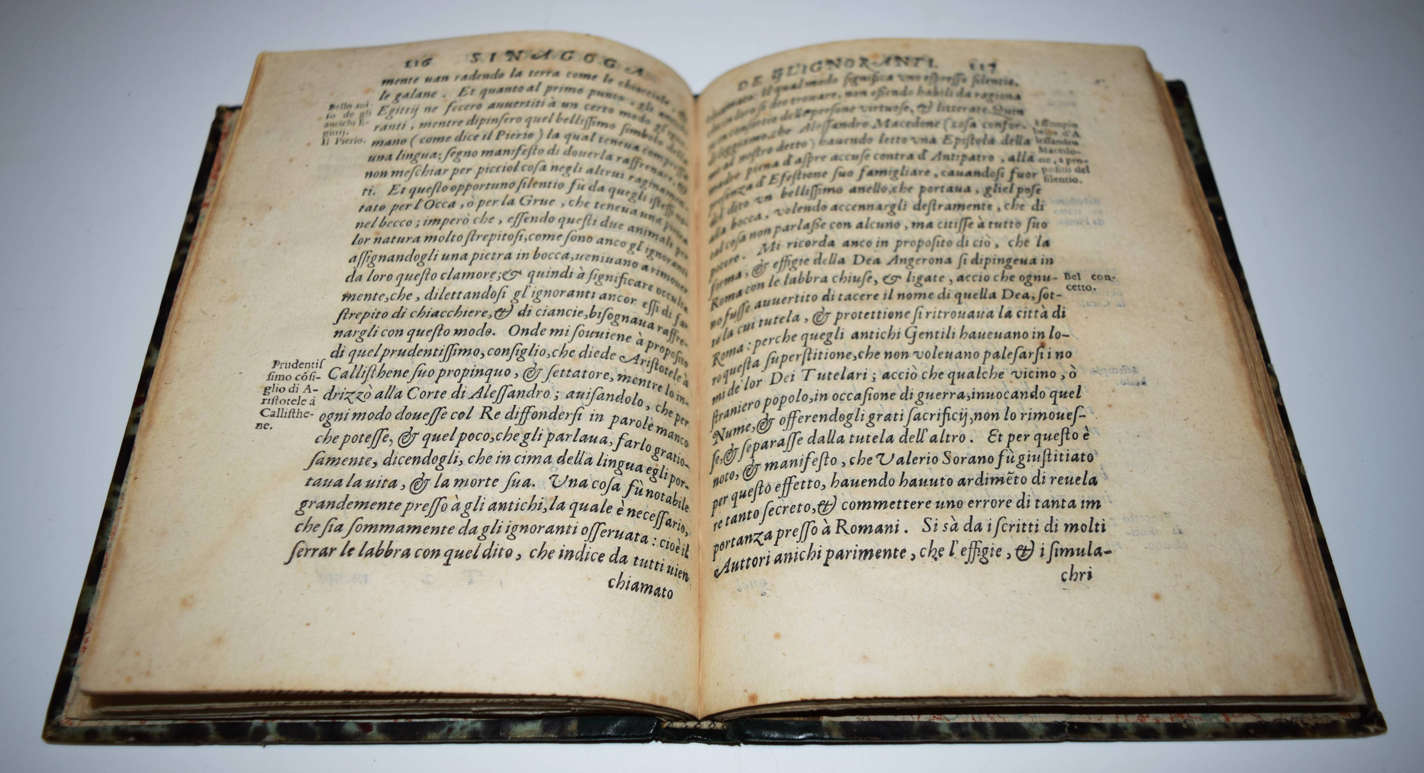 Garzoni, Tommaso. La Sinagoga degl’Ignoranti. Novamente formata, & posta in luce. Venetia, Giacomo Antonio Somasco 1594. 8° (20,3 x 15 cm.). [6] Bl., 203 S. mit Titelvignette, 1 illustr. Initiale und Schlußvignette in Holzschnitt. Halblederband des 19. Jahrhunderts mit goldgepr. Rückentitel und Linienvergoldung. Adams G 262. – Dritte Ausgabe, erschien zuerst 1589. – Seltene Streitschift des italienischen Renaissance Schriftstellers T. Garzoni (1549-1589) gegen einen ungenannten franzos. Schriftsteller gerichtet, der G. einen Ignoranten genannt hatte. Eine gelehrte und geistreiche Analyse des Begriffes „Ignoranz“, orientiert sich im Stil an den Adagia des Erasmus, ohne dies jedoch anzumerken. – Einband etwas berieben, gestoch. Wappen-Exlibris, anfangs etwas wasserrandig und gebräunt, gutes Exemplar. – Terza edizione, pubblicata per la prima volta nel 1589 – Rara polemica dello scrittore rinascimentale italiano T. Garzoni (1549-1589) contro un innominato scrittore francese che aveva definito G. un ignorante. Garzoni aveva definito G. un ignorante. Un’analisi erudita e arguta del termine „ignoranza“, orientata nello stile agli Adagia di Erasmo, ma senza rilevarlo. – Legatura un po’ rovinata, inciso. Targa corazzata in rilievo, un po’ macchiata e brunita all’inizio, buona copia.