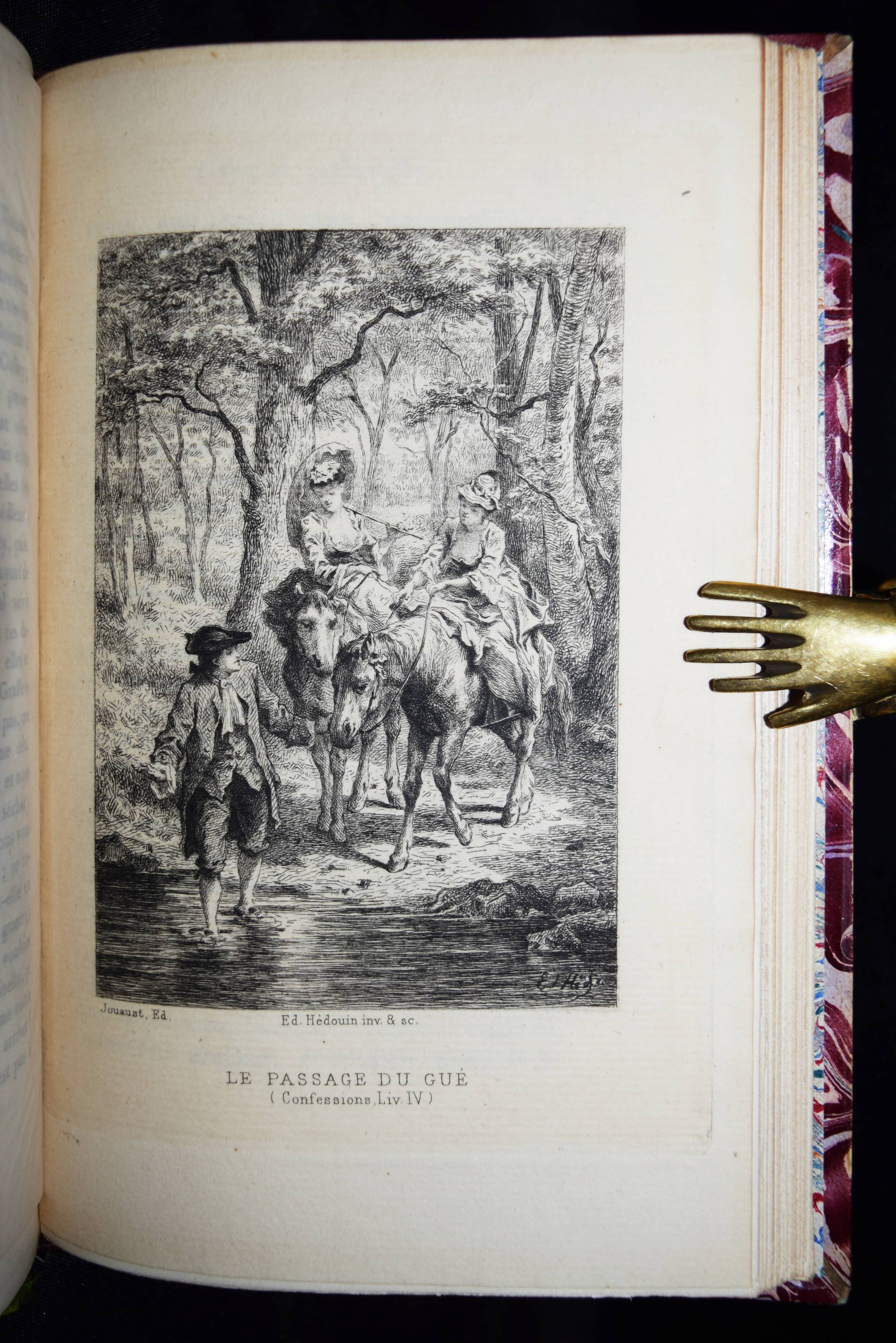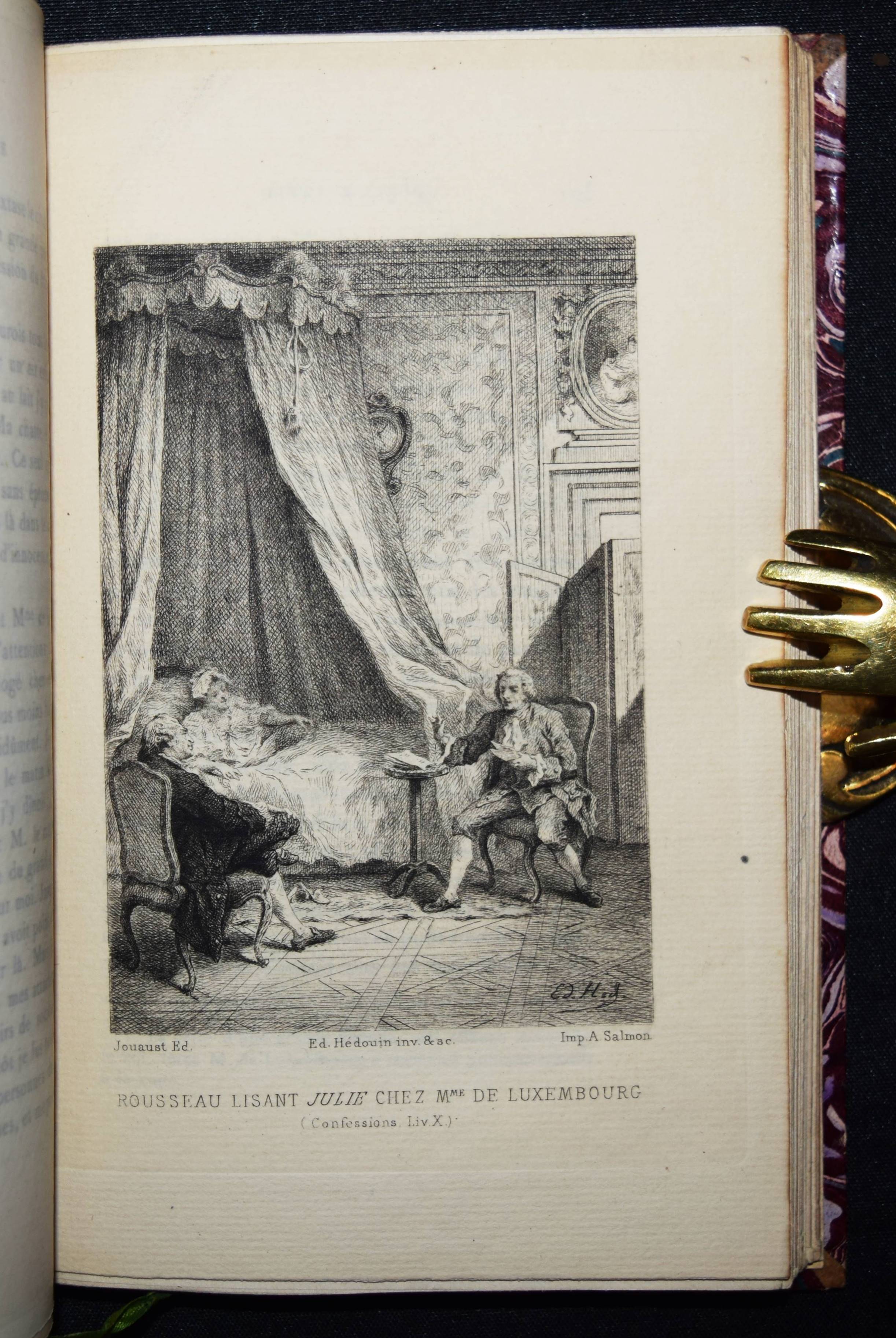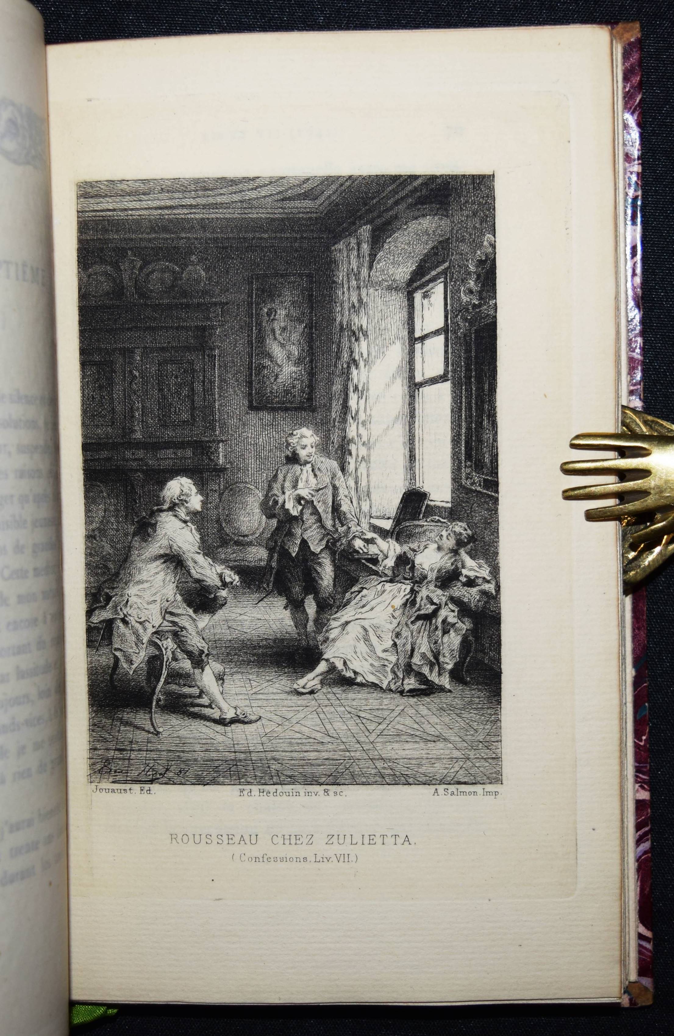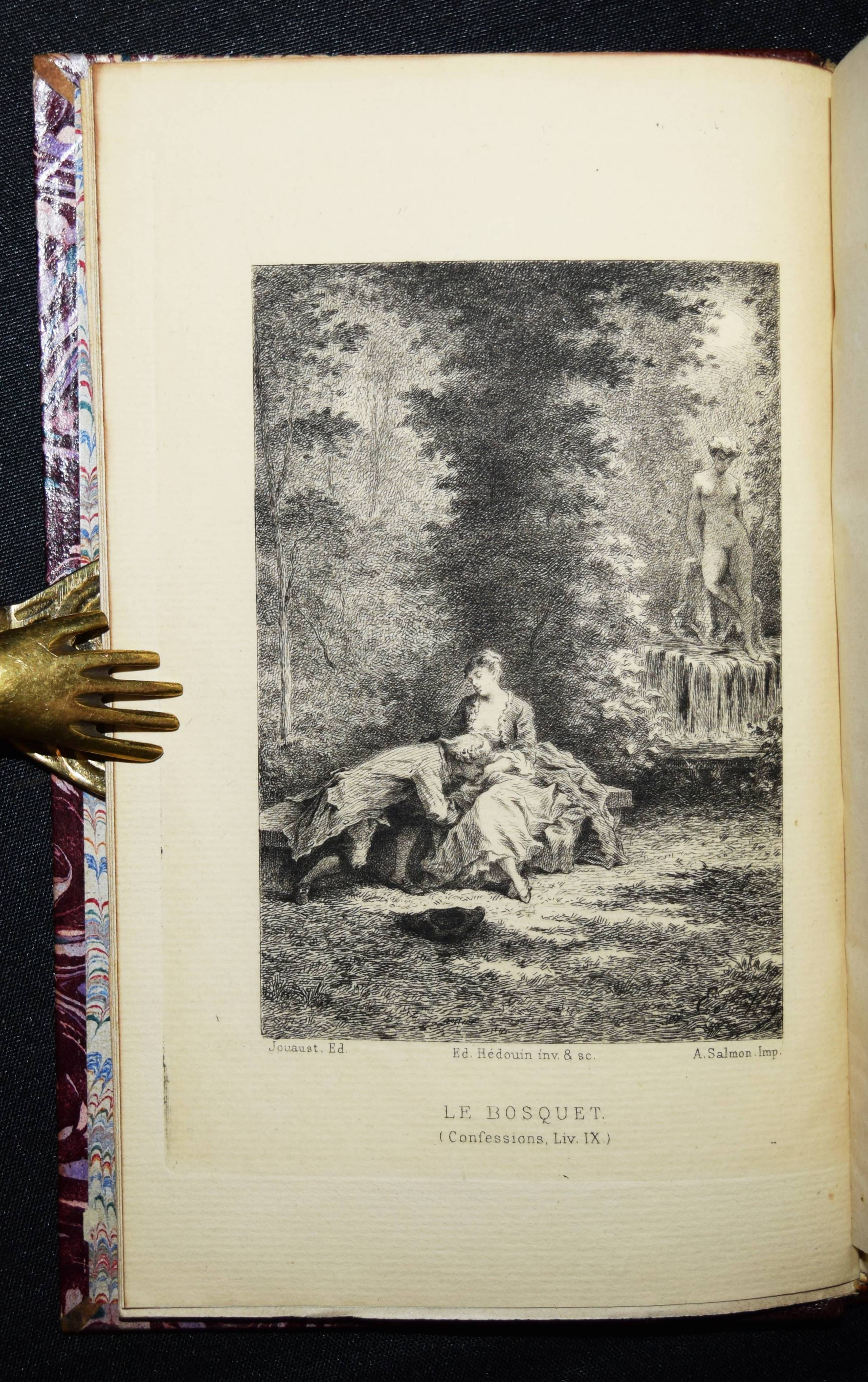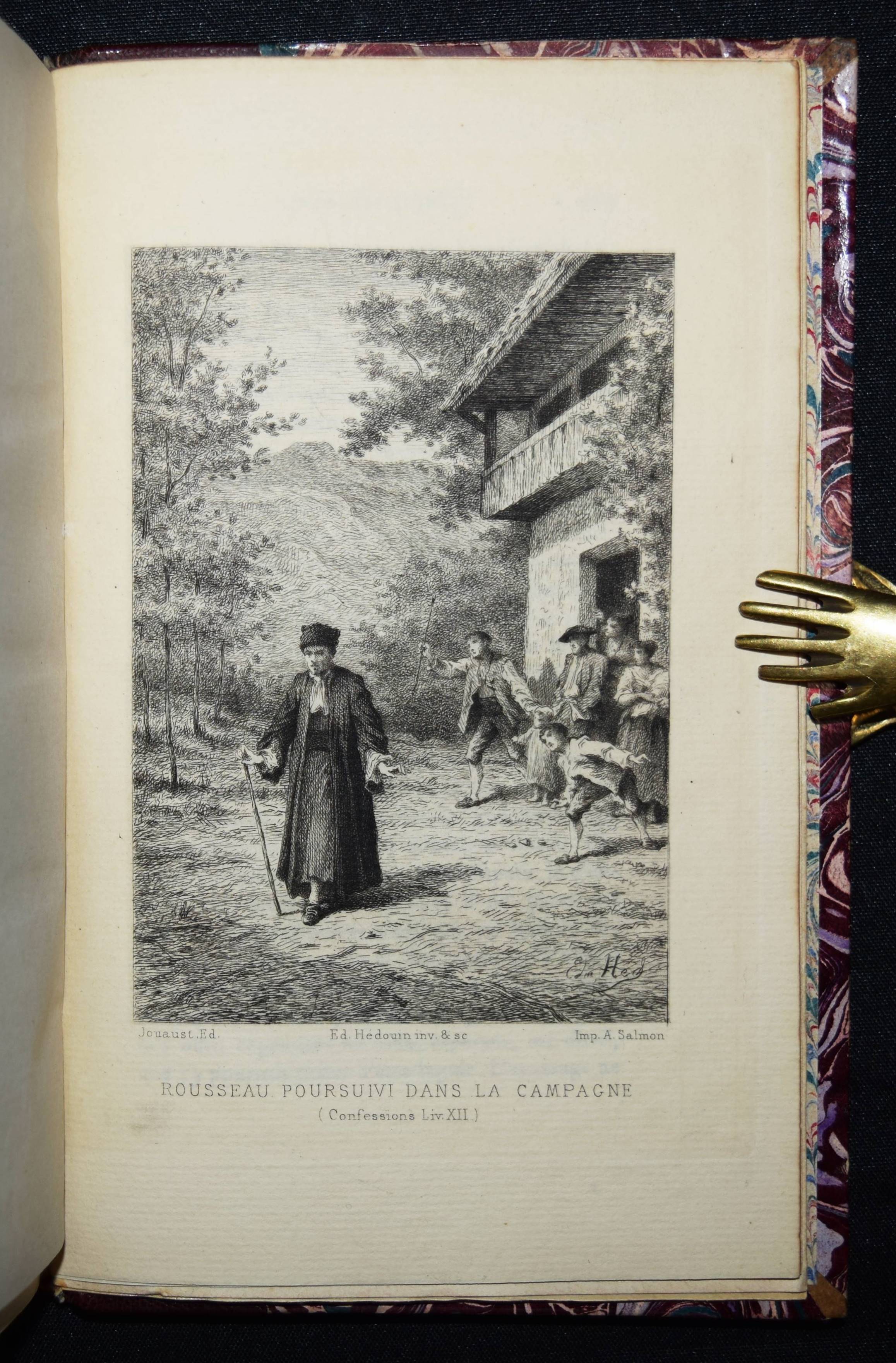 Rousseau, J(ean)-J(acques). Les confessions. Avec une préface par Marc-Monnier. 3 Bände. Paris, Librairie des Bibliophiles o. J. (1881). 8° (18 x 11,5 cm.). [2] Bl., 359 S.; [2] Bl., 281 S., [1] Bl.; [2] Bl., 414 S., [1] Bl. mit gestoch. Portrait und 12 Radierungen von Ed(mond) Hédouin. Dunkelrote Hldr. d. Zt. mit goldgepr. Rückentiteln, dekorativer Rückenverg. u. Kopfgoldschnitt. Carteret III, 91. – Erste Ausgabe mit diesen Illustrationen. – Eines von wenigen Exemplaren der Luxusausgabe in Oktavformat. Die Normalausgabe erschien auf anderem Papier in 4 Bänden und kleinerem Format (16°). – Der französische Maler, Radierer, Lithograf und Illustrator E. Hédouin (1820-1889) „fand seinen künstlerischen Schwerpunkt in der Genremalerei. Immer wieder thematisierte er das ländliche Leben in der Natur. Dabei gelten seine Szenen aus Spanien als am gelungensten“ (Meyers Konversations Lexikon, 4. Aufl. 1888 ff.; vgl. auch AKL LXX, 539 f.). – Sehr schönes sauberes Exemplar in dekorativen Handeinbänden.