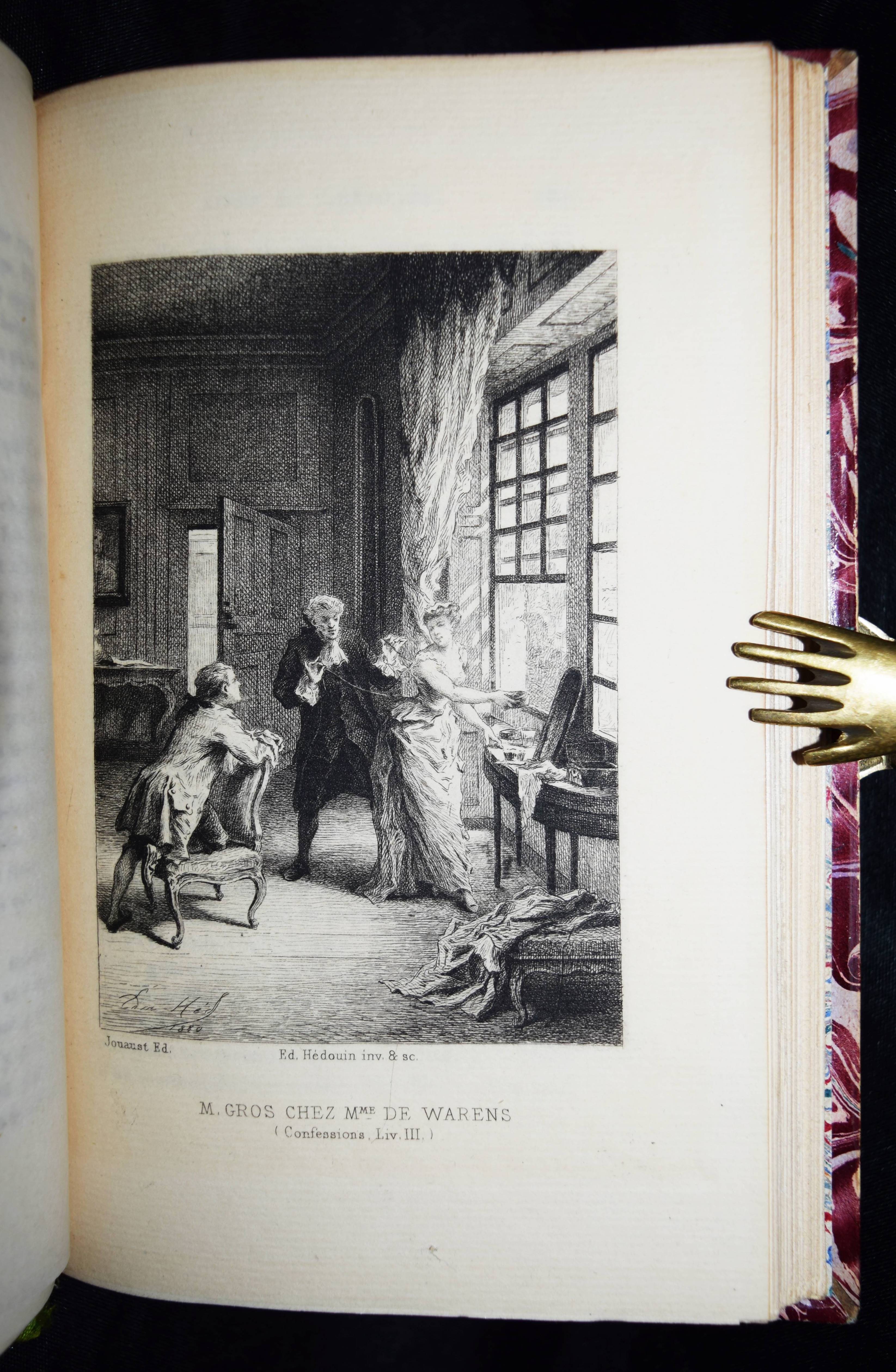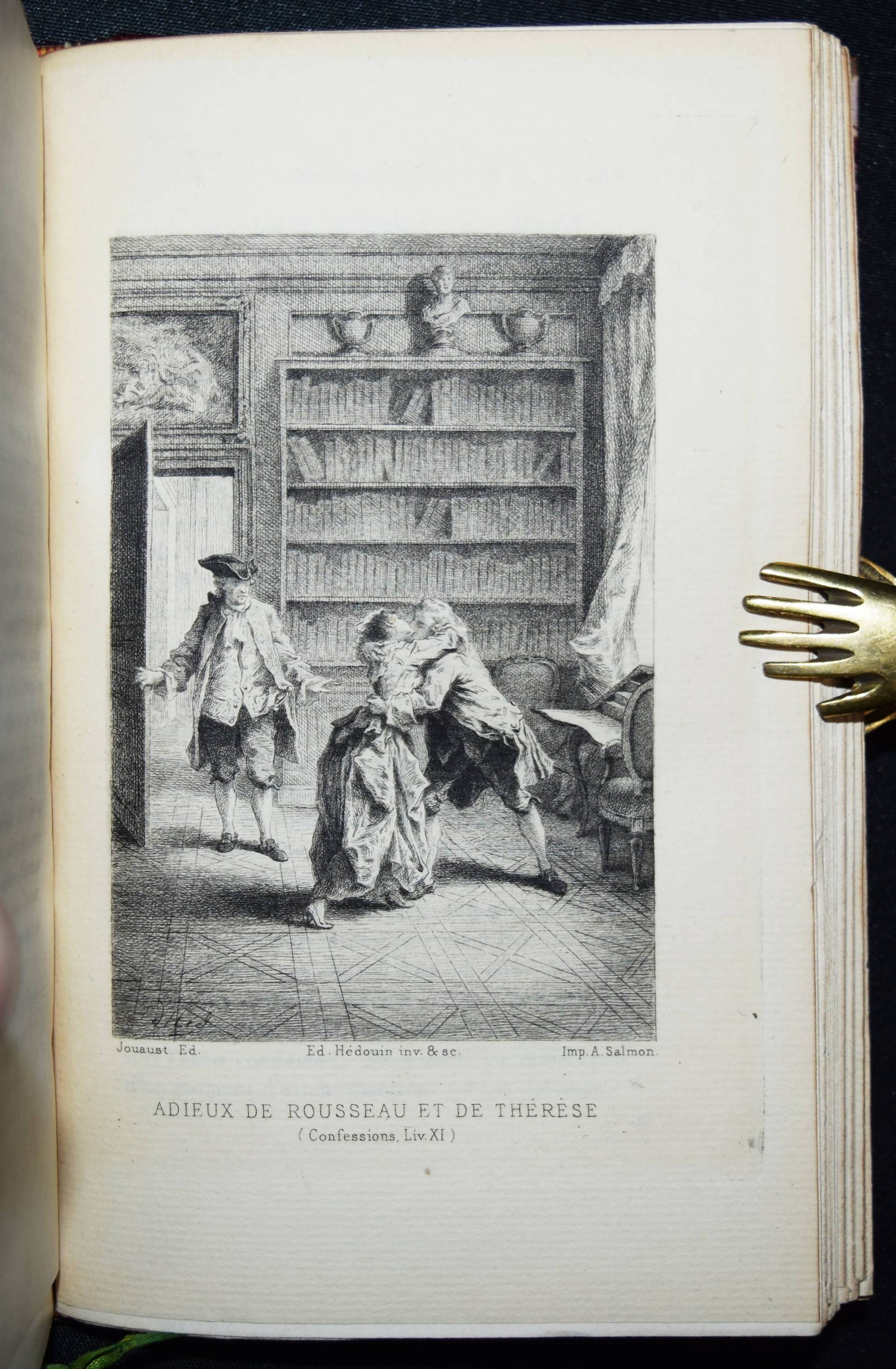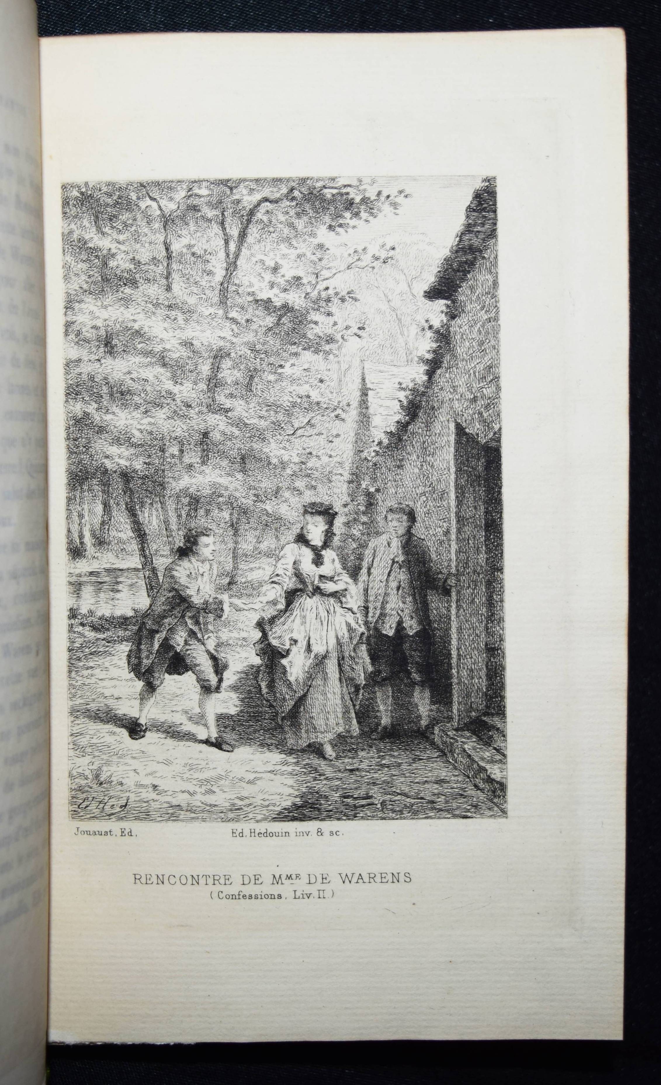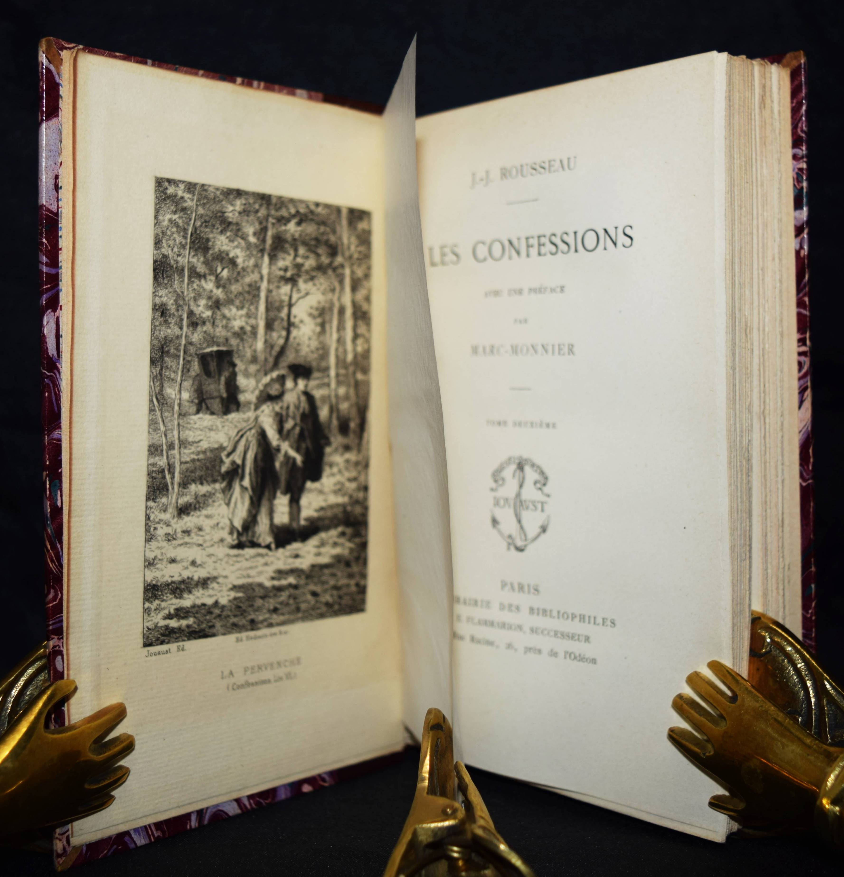 Rousseau, J(ean)-J(acques). Les confessions. Avec une préface par Marc-Monnier. 3 Bände. Paris, Librairie des Bibliophiles o. J. (1881). 8° (18 x 11,5 cm.). [2] Bl., 359 S.; [2] Bl., 281 S., [1] Bl.; [2] Bl., 414 S., [1] Bl. mit gestoch. Portrait und 12 Radierungen von Ed(mond) Hédouin. Dunkelrote Hldr. d. Zt. mit goldgepr. Rückentiteln, dekorativer Rückenverg. u. Kopfgoldschnitt. Carteret III, 91. – Erste Ausgabe mit diesen Illustrationen. – Eines von wenigen Exemplaren der Luxusausgabe in Oktavformat. Die Normalausgabe erschien auf anderem Papier in 4 Bänden und kleinerem Format (16°). – Der französische Maler, Radierer, Lithograf und Illustrator E. Hédouin (1820-1889) „fand seinen künstlerischen Schwerpunkt in der Genremalerei. Immer wieder thematisierte er das ländliche Leben in der Natur. Dabei gelten seine Szenen aus Spanien als am gelungensten“ (Meyers Konversations Lexikon, 4. Aufl. 1888 ff.; vgl. auch AKL LXX, 539 f.). – Sehr schönes sauberes Exemplar in dekorativen Handeinbänden.