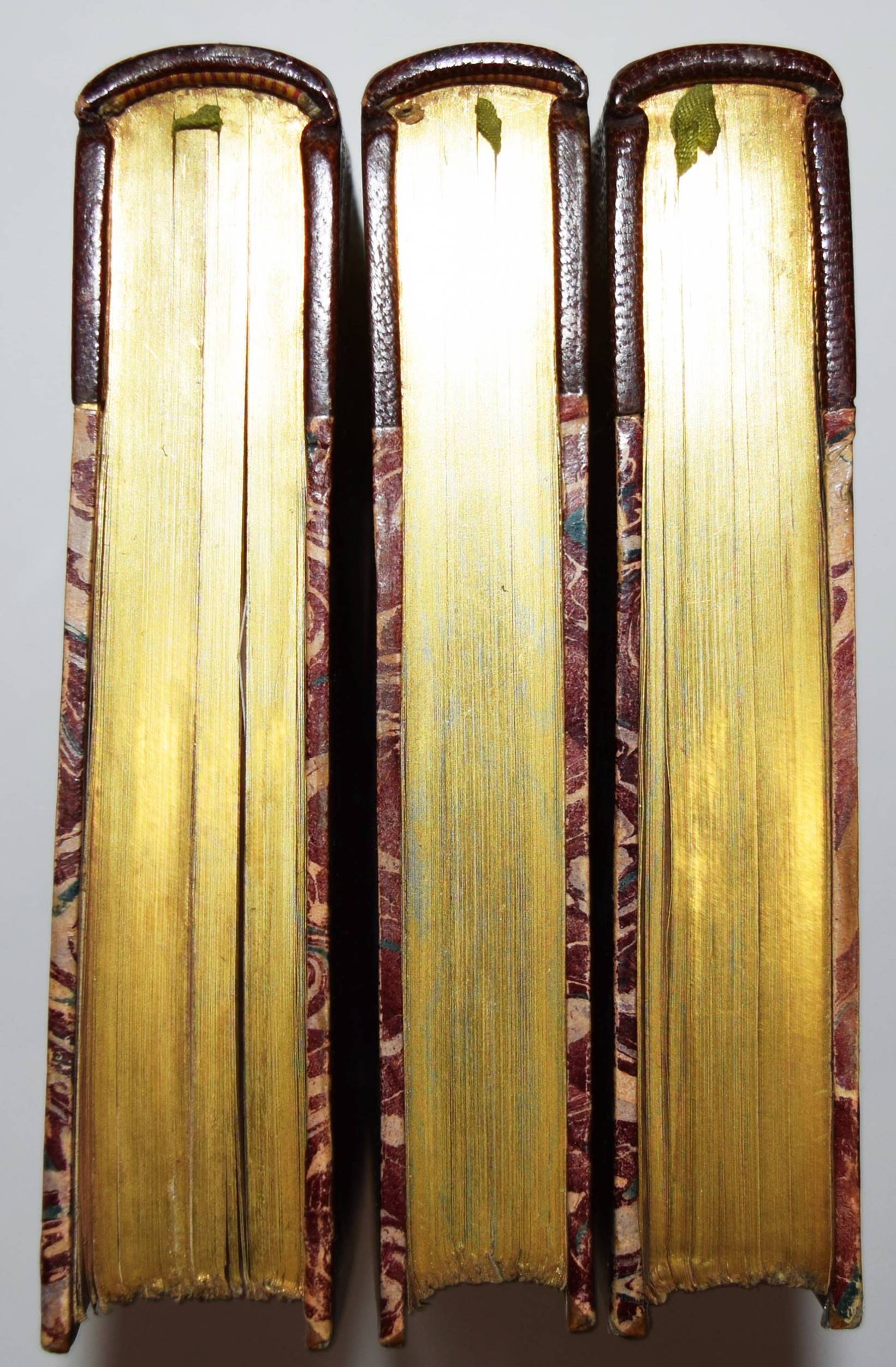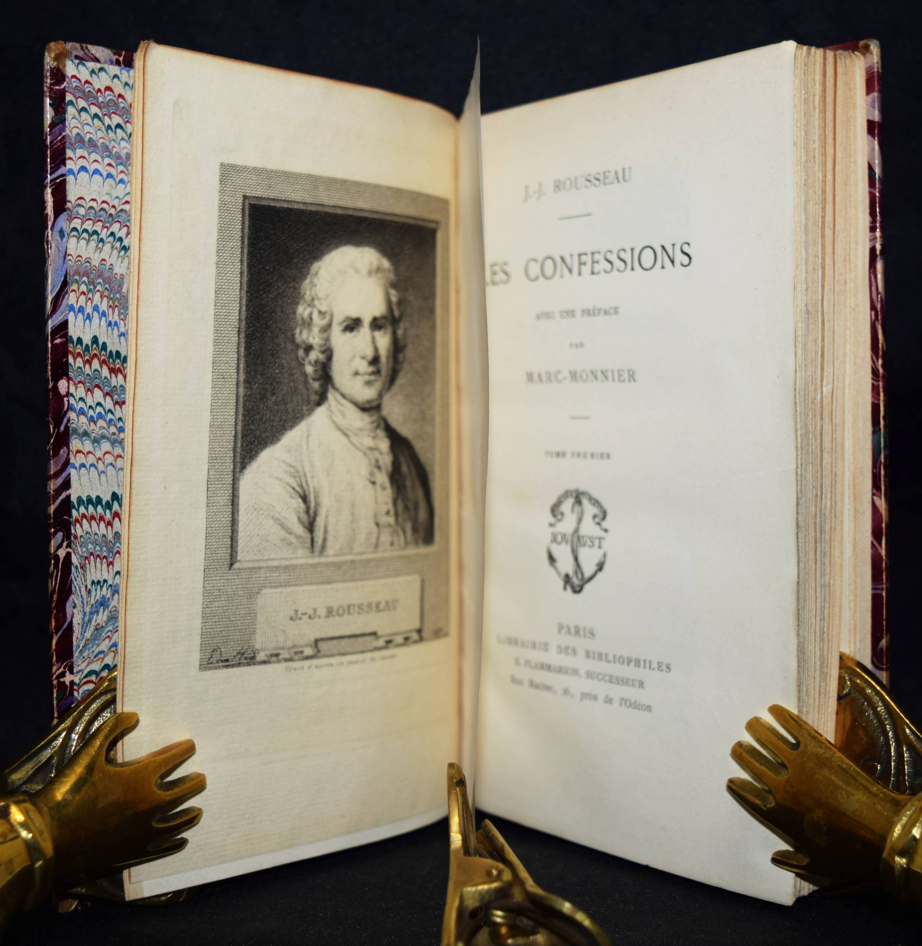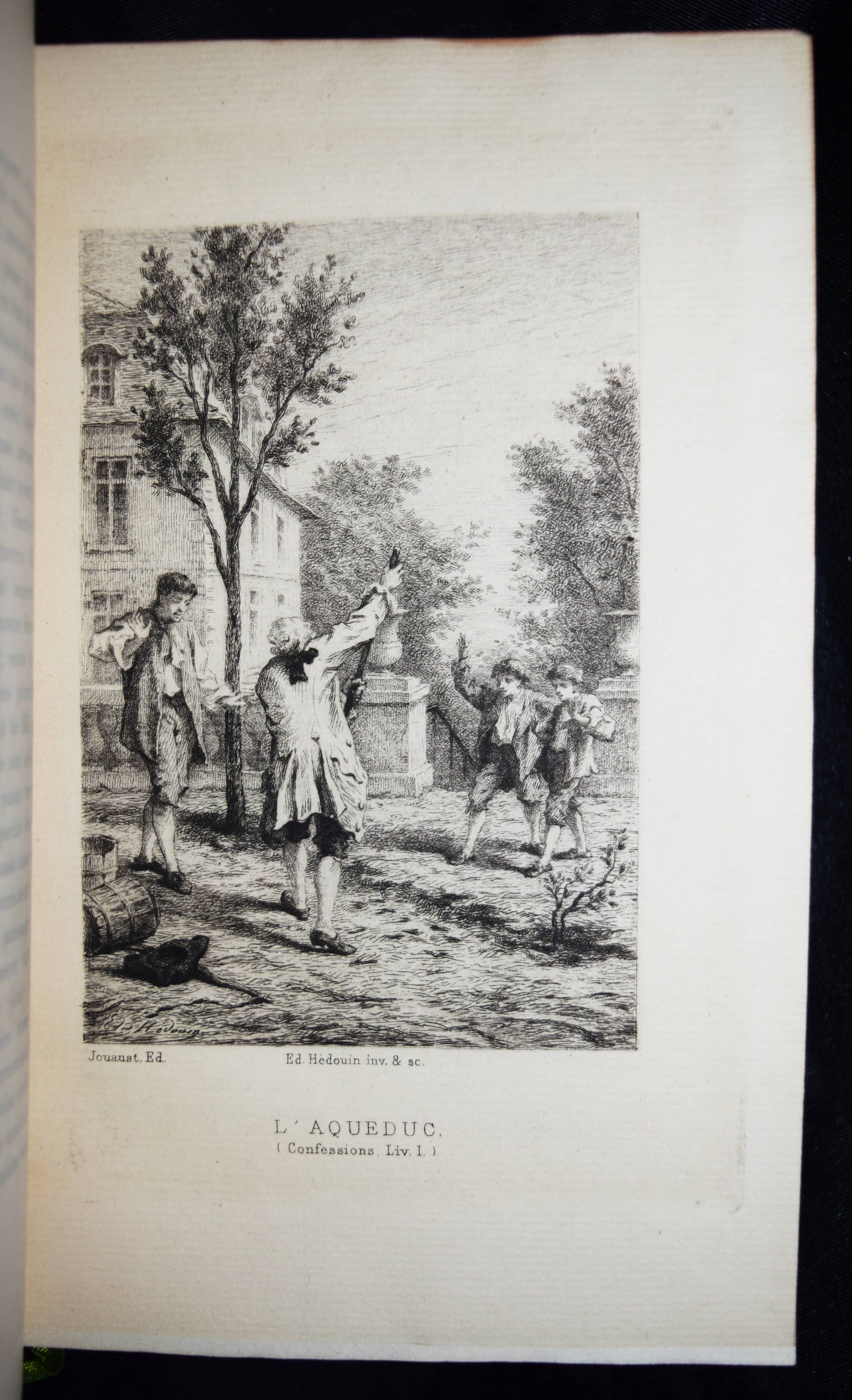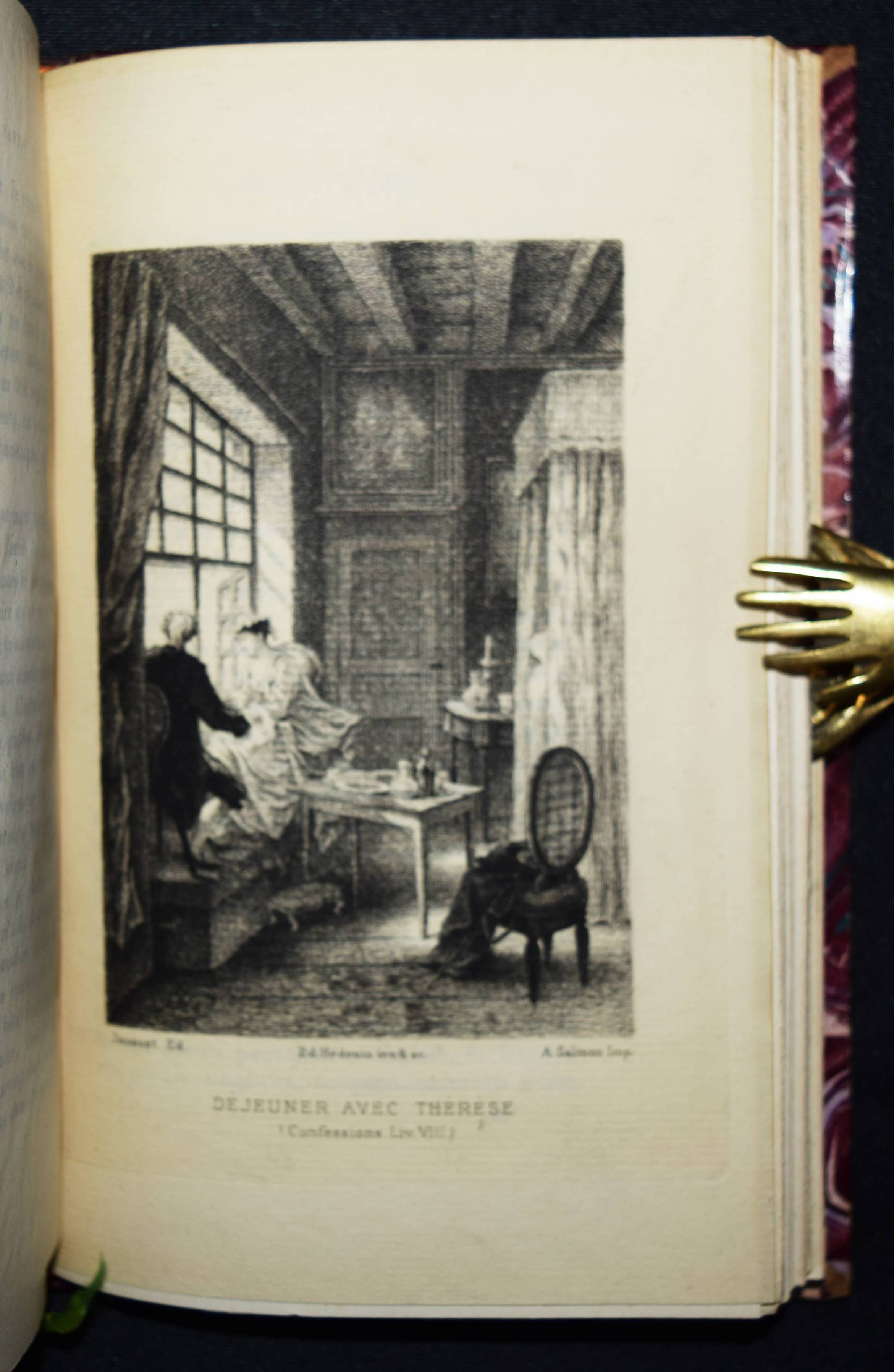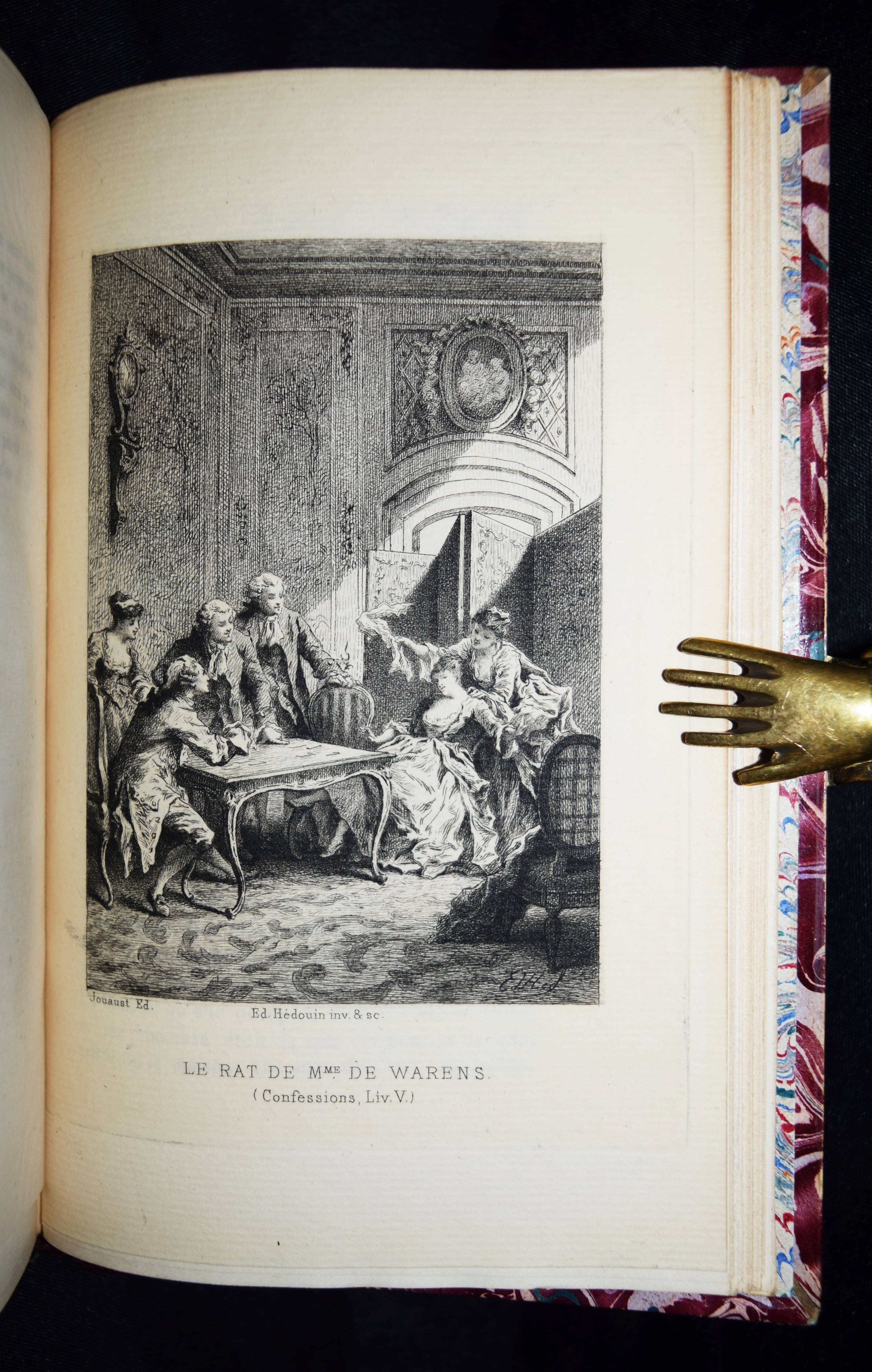 Rousseau, J(ean)-J(acques). Les confessions. Avec une préface par Marc-Monnier. 3 Bände. Paris, Librairie des Bibliophiles o. J. (1881). 8° (18 x 11,5 cm.). [2] Bl., 359 S.; [2] Bl., 281 S., [1] Bl.; [2] Bl., 414 S., [1] Bl. mit gestoch. Portrait und 12 Radierungen von Ed(mond) Hédouin. Dunkelrote Hldr. d. Zt. mit goldgepr. Rückentiteln, dekorativer Rückenverg. u. Kopfgoldschnitt. Carteret III, 91. – Erste Ausgabe mit diesen Illustrationen. – Eines von wenigen Exemplaren der Luxusausgabe in Oktavformat. Die Normalausgabe erschien auf anderem Papier in 4 Bänden und kleinerem Format (16°). – Der französische Maler, Radierer, Lithograf und Illustrator E. Hédouin (1820-1889) „fand seinen künstlerischen Schwerpunkt in der Genremalerei. Immer wieder thematisierte er das ländliche Leben in der Natur. Dabei gelten seine Szenen aus Spanien als am gelungensten“ (Meyers Konversations Lexikon, 4. Aufl. 1888 ff.; vgl. auch AKL LXX, 539 f.). – Sehr schönes sauberes Exemplar in dekorativen Handeinbänden.