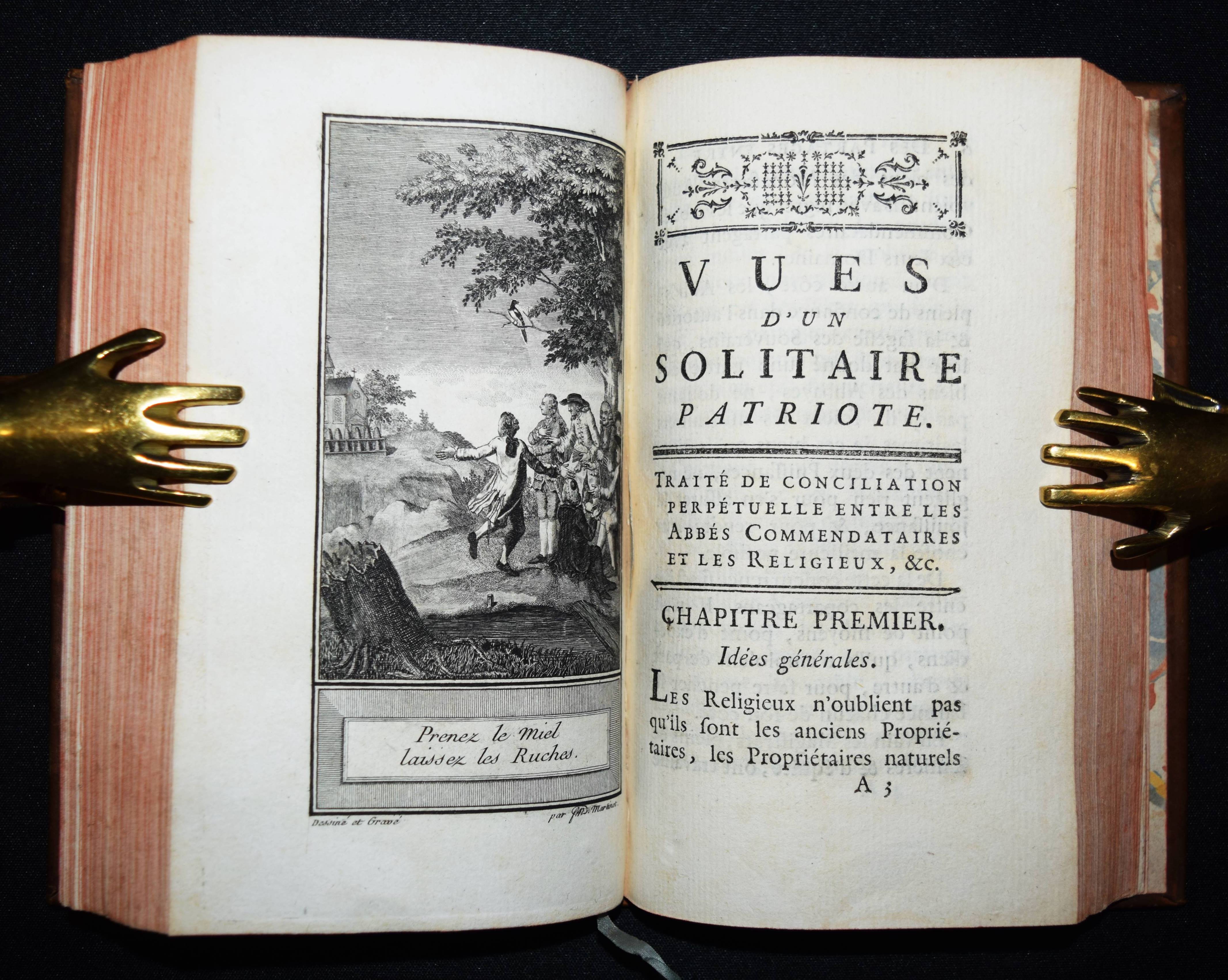 (Féroux, Christophe Léon). Vues d’un solitaire patriote. 2 Teile in 1 Band. La Haye et Paris, Clousier 1784. Kl.-8° (16,5 x 10 cm.). 237 S.; 244 S. mit 2 gestoch. Fronisp. von P. M. Martinet. Ldr. d. Zt. mit goldgepr. Rückenschild, floraler Rückenverg. u. Kantenverg. Cohen-Ricci 1050. Nicht bei Kress u. Goldsmiths. – Erste Ausgabe, selten. – „Livre curieux sur les institutions et privilèges de l’ancien régime“ (Cohen-Ricci). – Die schönen Kupfertafeln mit den Motti „Qu’ importe la forme ou la couleur de son manteau, pour vu que de son ombre il protège le pauvre.“ und „Prenez le miel, laissez les ruches“. – C. L. Féroux (1730-1803) stellt die Einflüsse von Staat und Kirche auf den Wohlstand der Bevölkerung gegenüber. Er plädiert für eine Einheitssteuer, die Abschaffung der Knechtschaft und für eine unabhängige Justiz. – Zeitgenöss. Besitzvermerk a. T., schönes dekorativ gebundenes Exemplar.