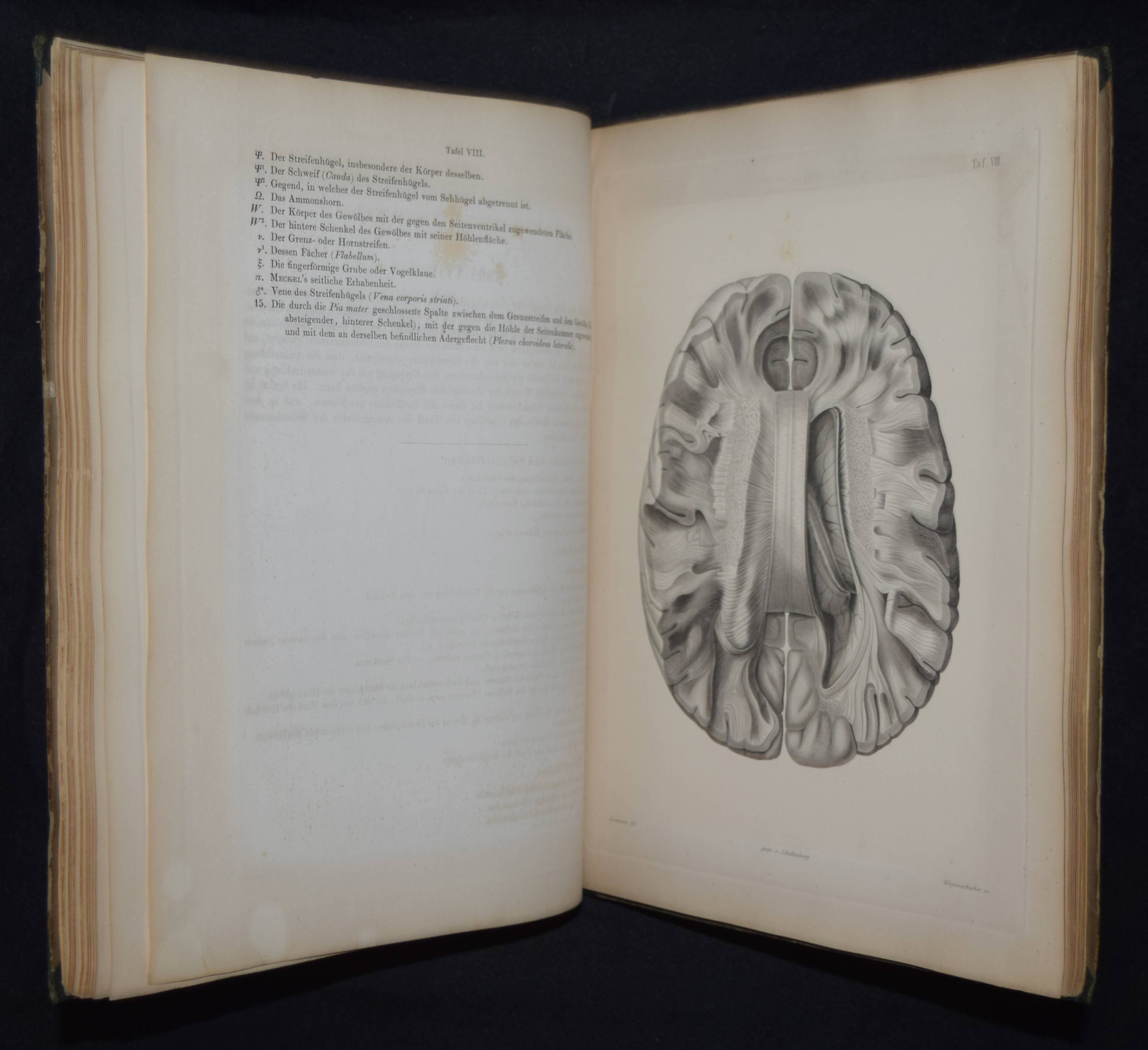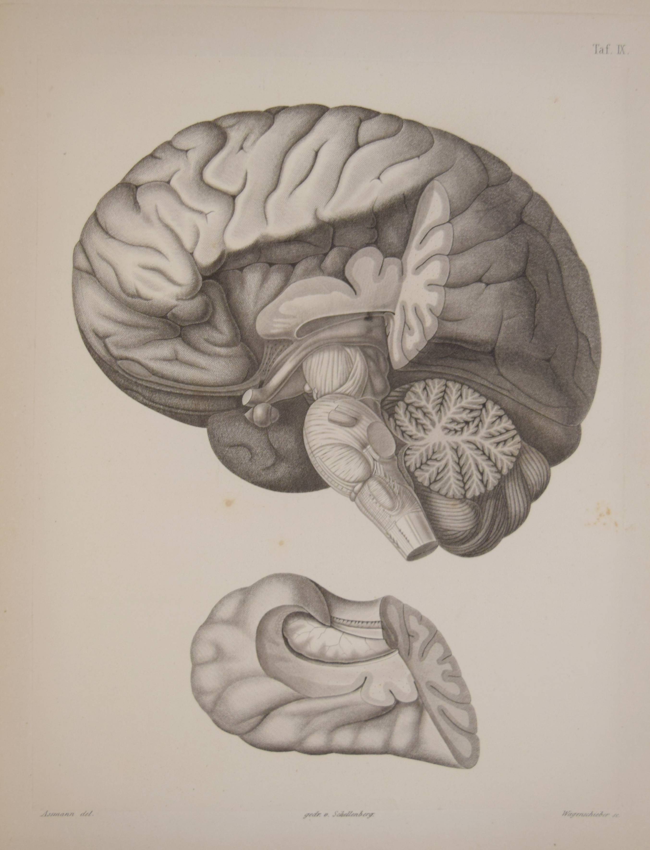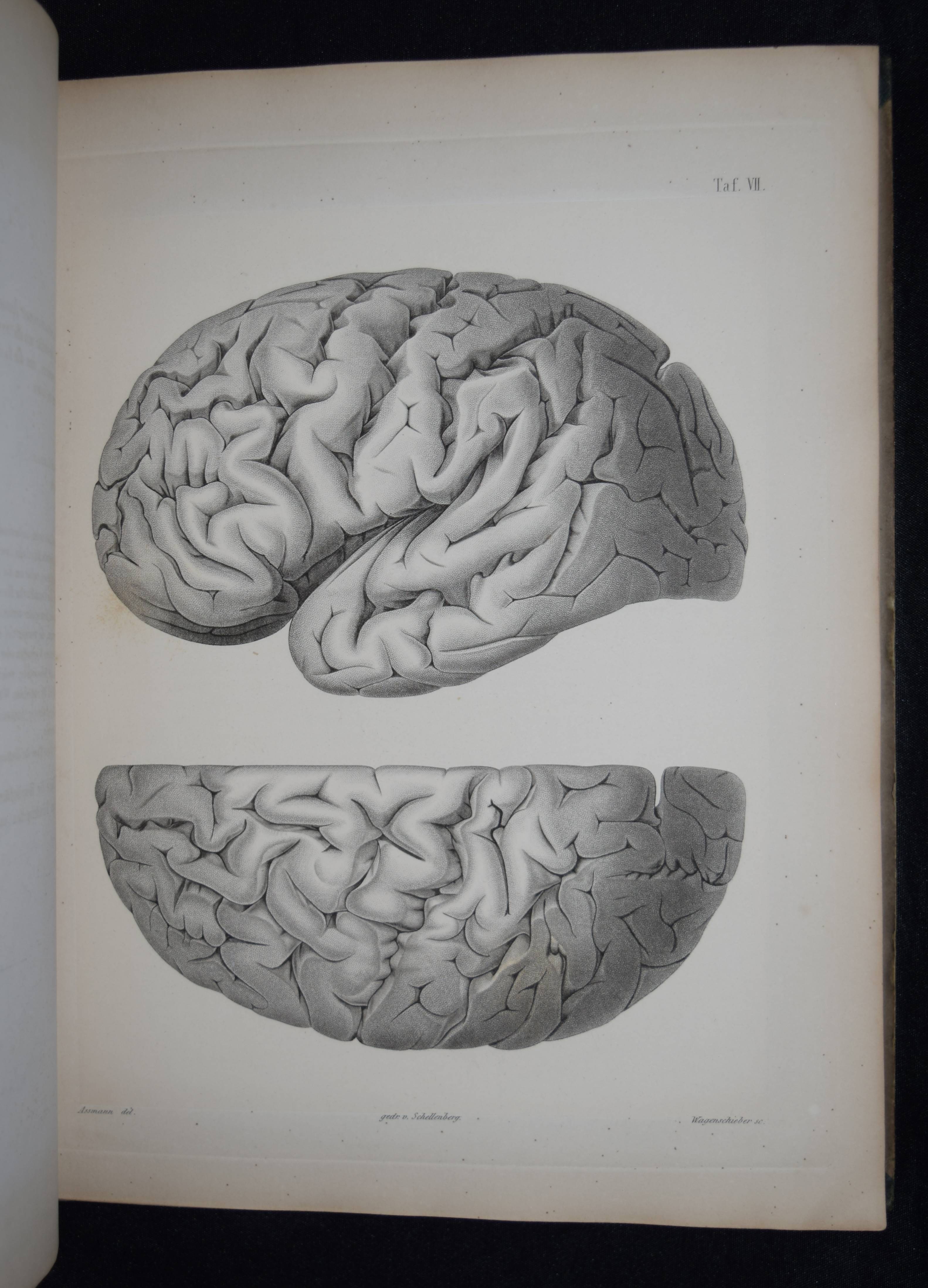 Reichert, C(arl) B(ogislaus). Der Bau des menschlichen Gehirns durch Abbildungen mit erläuerndem Texte dargestellt. Erste Abtheilung (von 2). Leipzig, Wilhelm Engelmann 1859. 4°. VIII, [1] Bl. mit 12 gestoch. Tafeln, [18] Bl. (Beschreibungen) u. 1 mehrfach gefalt. Tabelle. OPbd. mit Deckelschild. Hirsch-Hüb. IV, 752 ff. – Erste Ausgabe des ersten Teils der bedeutenden frühen Anatomie des menschlichen Gehirns. – „R’s Verdienste liegen … auf dem Gebiete der Entwicklungsgeschichte und Histologie, zu deren eifrigsten und erfolgsreichsten Förderern er gezählt werden muss“ (Hirsch-Hübotter). – Einband angestaubt, etwas berieben und fleckig, St.a.T., Textblätter teils stockfleckig, die Tafeln nur im Rand etwas angestaubt, gutes Exemplar.