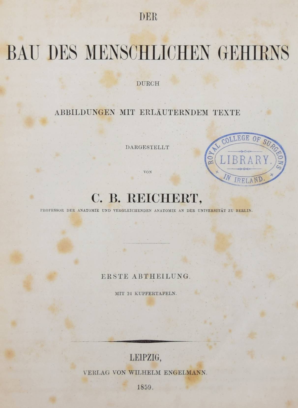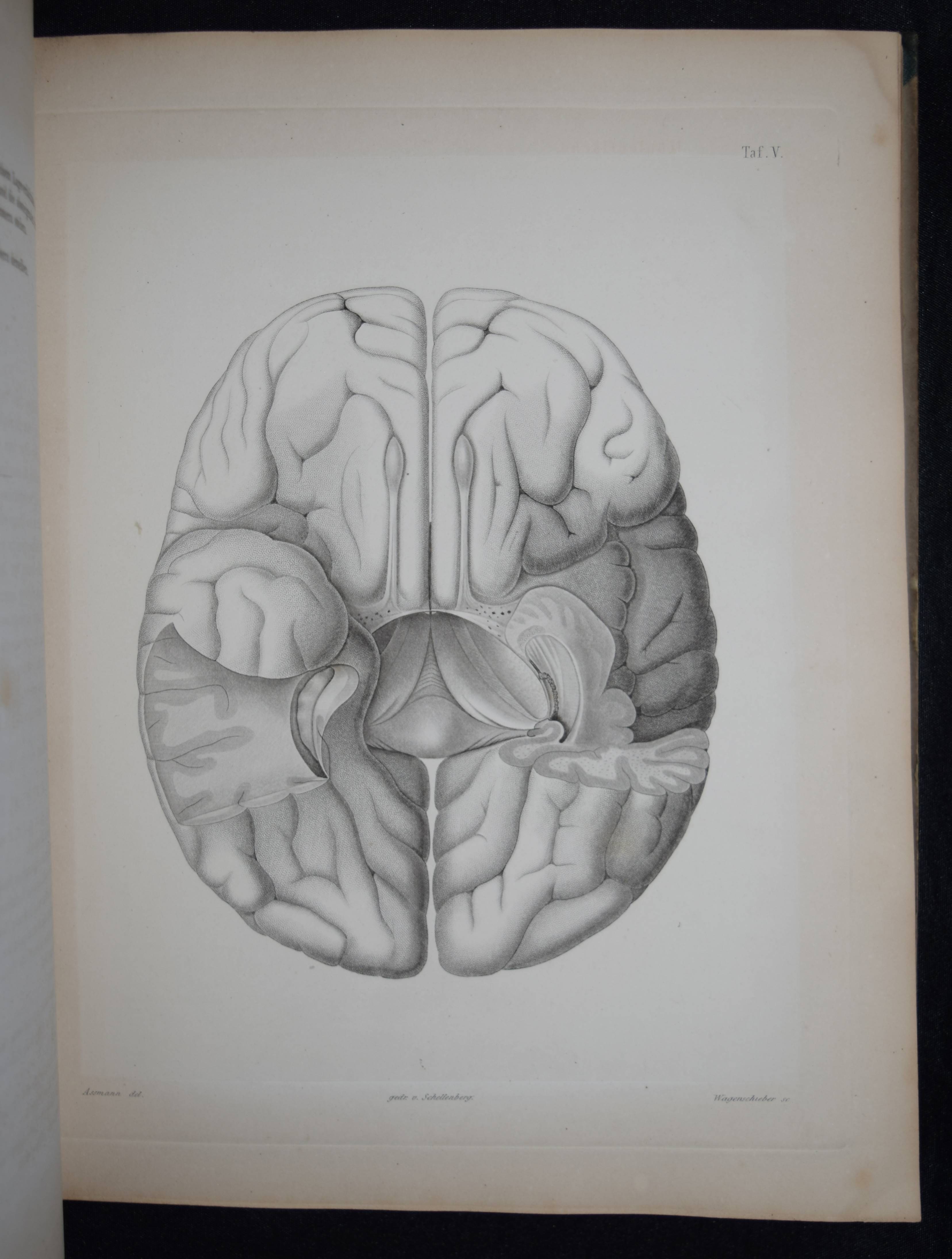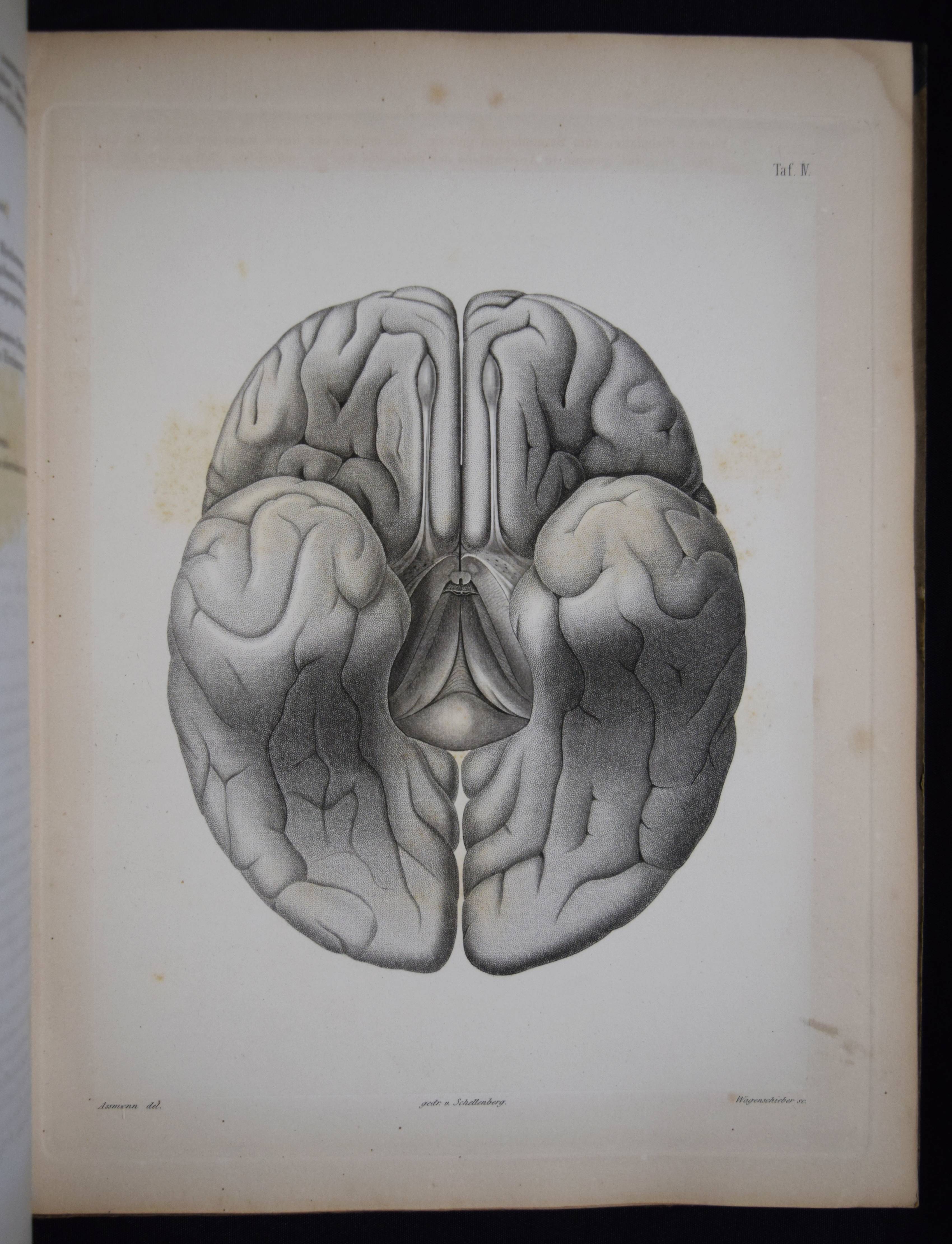 Reichert, C(arl) B(ogislaus). Der Bau des menschlichen Gehirns durch Abbildungen mit erläuerndem Texte dargestellt. Erste Abtheilung (von 2). Leipzig, Wilhelm Engelmann 1859. 4°. VIII, [1] Bl. mit 12 gestoch. Tafeln, [18] Bl. (Beschreibungen) u. 1 mehrfach gefalt. Tabelle. OPbd. mit Deckelschild. Hirsch-Hüb. IV, 752 ff. – Erste Ausgabe des ersten Teils der bedeutenden frühen Anatomie des menschlichen Gehirns. – „R’s Verdienste liegen … auf dem Gebiete der Entwicklungsgeschichte und Histologie, zu deren eifrigsten und erfolgsreichsten Förderern er gezählt werden muss“ (Hirsch-Hübotter). – Einband angestaubt, etwas berieben und fleckig, St.a.T., Textblätter teils stockfleckig, die Tafeln nur im Rand etwas angestaubt, gutes Exemplar.