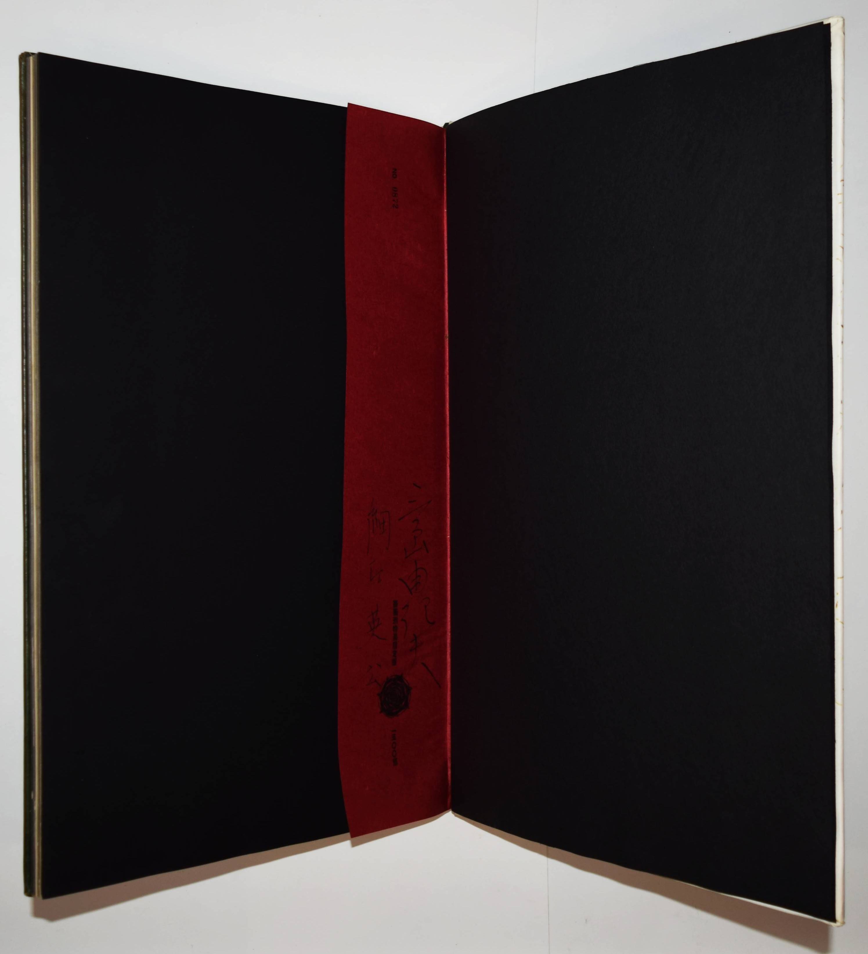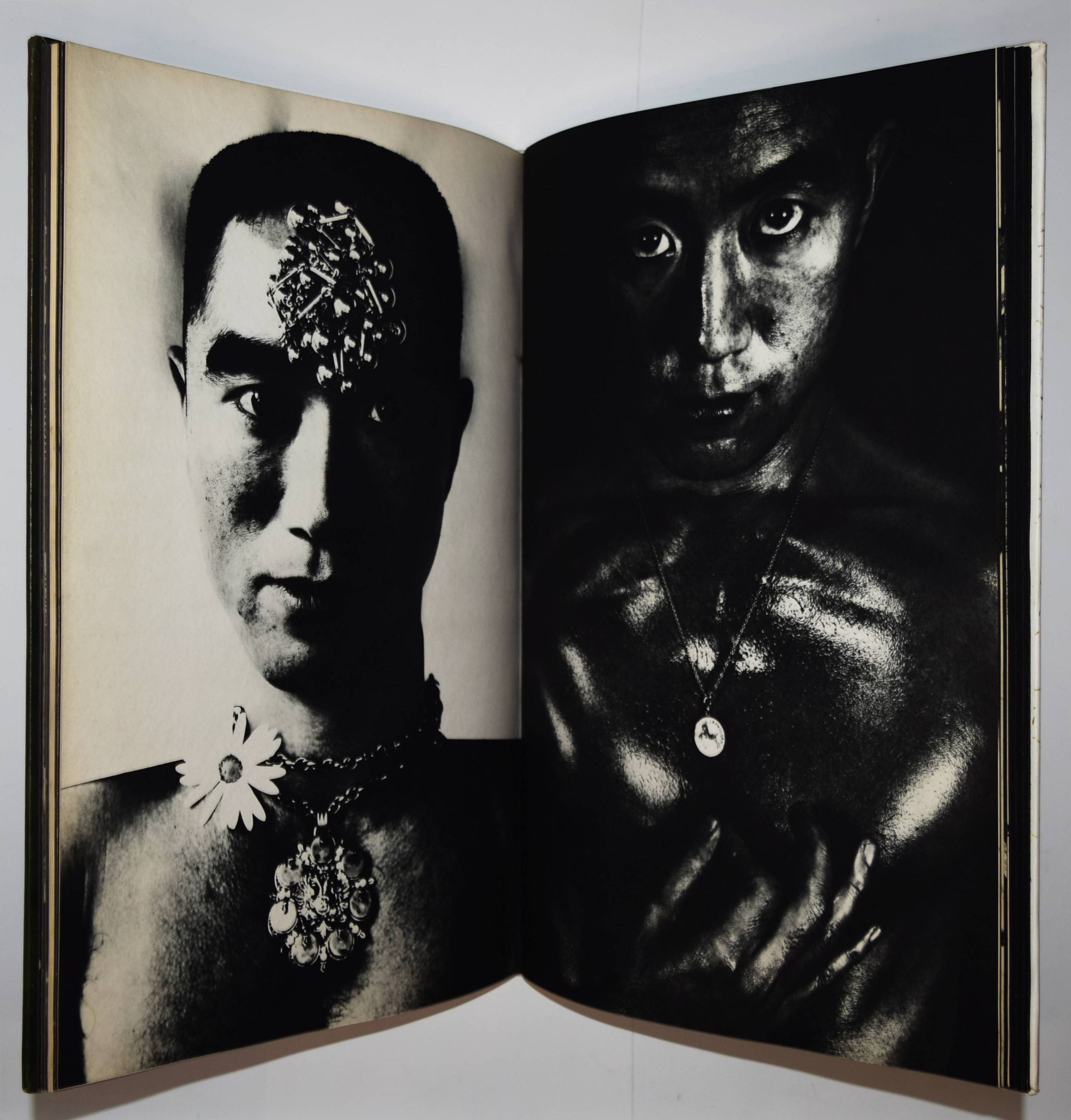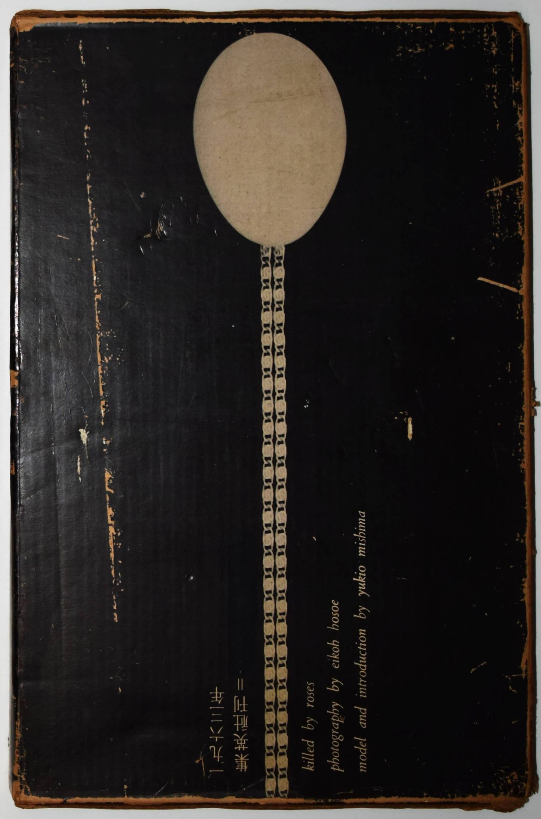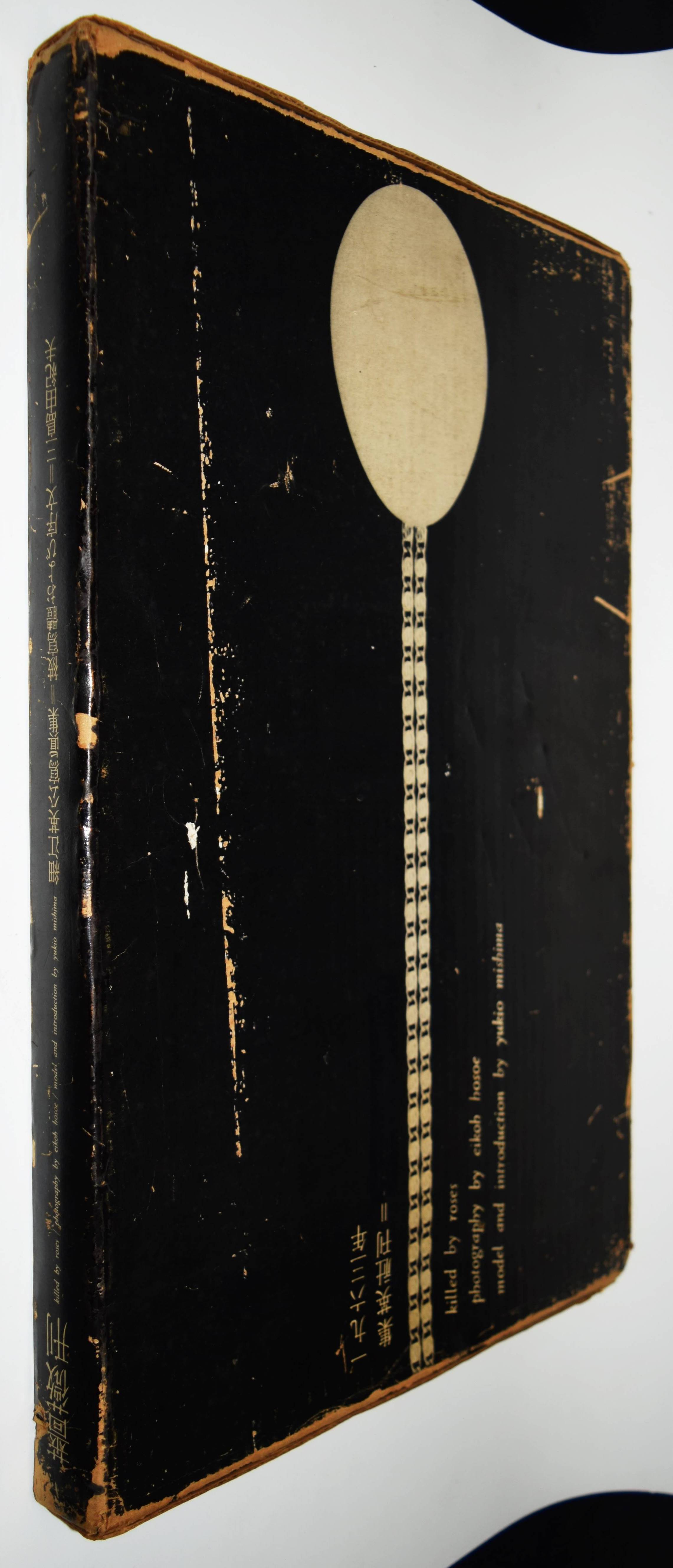| Hosoe, Eikoh. Barakei Sguei-sha. (Killed by roses). (Introduction by Yukio Mishima. Design by Kohei Sugiura). Tokyo, Shueisha (1963). Folio (42 x 27 cm.). [104] S. mit 43 Tafeln in Sheet-fed gravure. Illustr. Orig.-Leinenband mit Klarsichtschutzumschlag in illustr. Pappkassette. Auer 422. Heiting/Kaneko 368 f., 279. The Open Book 194 f. Parr/Badger I, 280 f. (mit mehreren Abb.). Roth, The Book of 101 Books 164 ff. – Erste Ausgabe, das wohl wichtigste japanische Fotobuch der 60er Jahre. – Von E. Hosoe und Y. Mishima im Impressum signiert. Eines von 1500 num. Exemlaren. – „Eikoh Hosoe’s first edition of Killed By Roses is so splendidly packaged that just opening it is a plearure – and the seduction doesn’t stop there. Within a black-and-white cardboard case printed an both sides with photos of carved pendants in thick chains and a fine shower of text is a glossy color cover featuring a photogram of symbolic elements plucked from Hosoe’s hallucinatory narrative, the title superimposed in classical Greek lettering. … The photos that make up the body of the book are inky, sometimes high-constrast gravures that bleed right to the edge of the page and often extend across the entire open spread, given extra impact to images that are already quite arresting. Even if the subject of Hosoe’s photographs weren’t zje author Yushi Mishima, the book would be remarkable for its humid mix of eroticism and myth, queer kitsch and high art“ (A. Roth). – „Both Japanese editions of Barakei (Killed by Roses) are significant, not only because of the remarkable collaboration between Eikoh Hosoe and Yukio Mishima, but also because they were designed by the two most influential Japanese graphic designers of the postwar years – the first edition by Kohei Sugiura and the second by Tadanori Yokoo. Each is an original working of the material in its own right, and the second, one of the most complex bookworks ever made, also memorializes a definingmoment in Japanese culture. … In his preface to the first edition, Mishima was equally disingenous: ‚One day without warning, Eikoh Hosoe appeared before me, and transported me bodily to a strange world.‘ That world, he continued, was ‚abnormal, warped, sarcastic, grotesque, savage, and promiscuous‘. Mishima allowed Hosoe unprecedented directorial freedom, but as in other such close collaborations between photographer and subject, just who had the ultimate control is open to question. What emerged was a series of extraordinary theatrical tableaux – Japanese surrealism meets Italien mannerism – that certainly contributed to the iconicity of Mishima, the samurai saviour of the country’s soul. Hosoe’s images were baroque, kitsch, frequently sadomasochistic, disturbingly narcissistic and clearly homoerotic, despite the presence of women in a number of the pictures“ (Parr/Badger). – Die Kassette teils stärker berieben, der Acetat-Schutzumschlag am Kapital etwas eingerissen, gutes Exemplar.