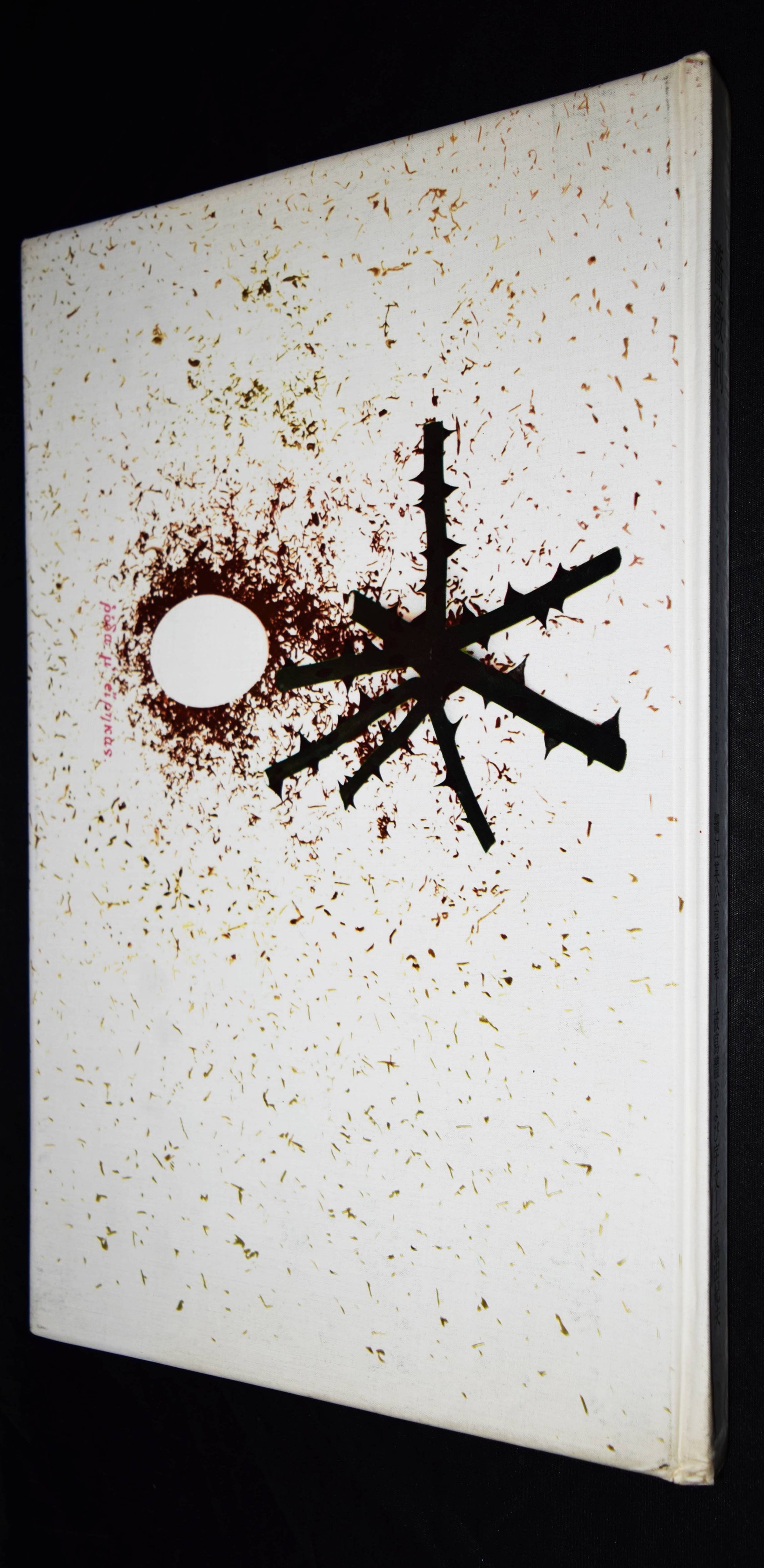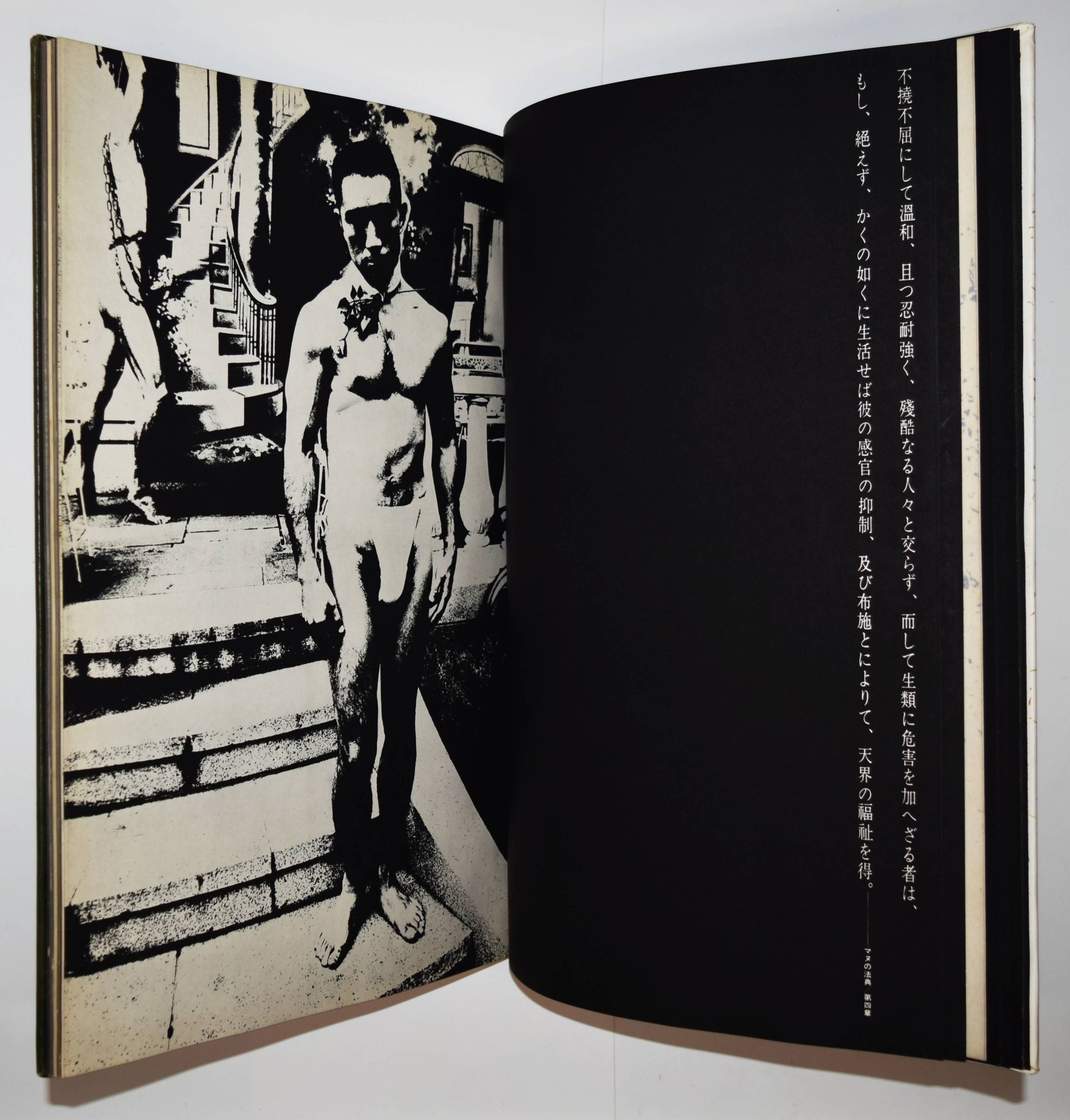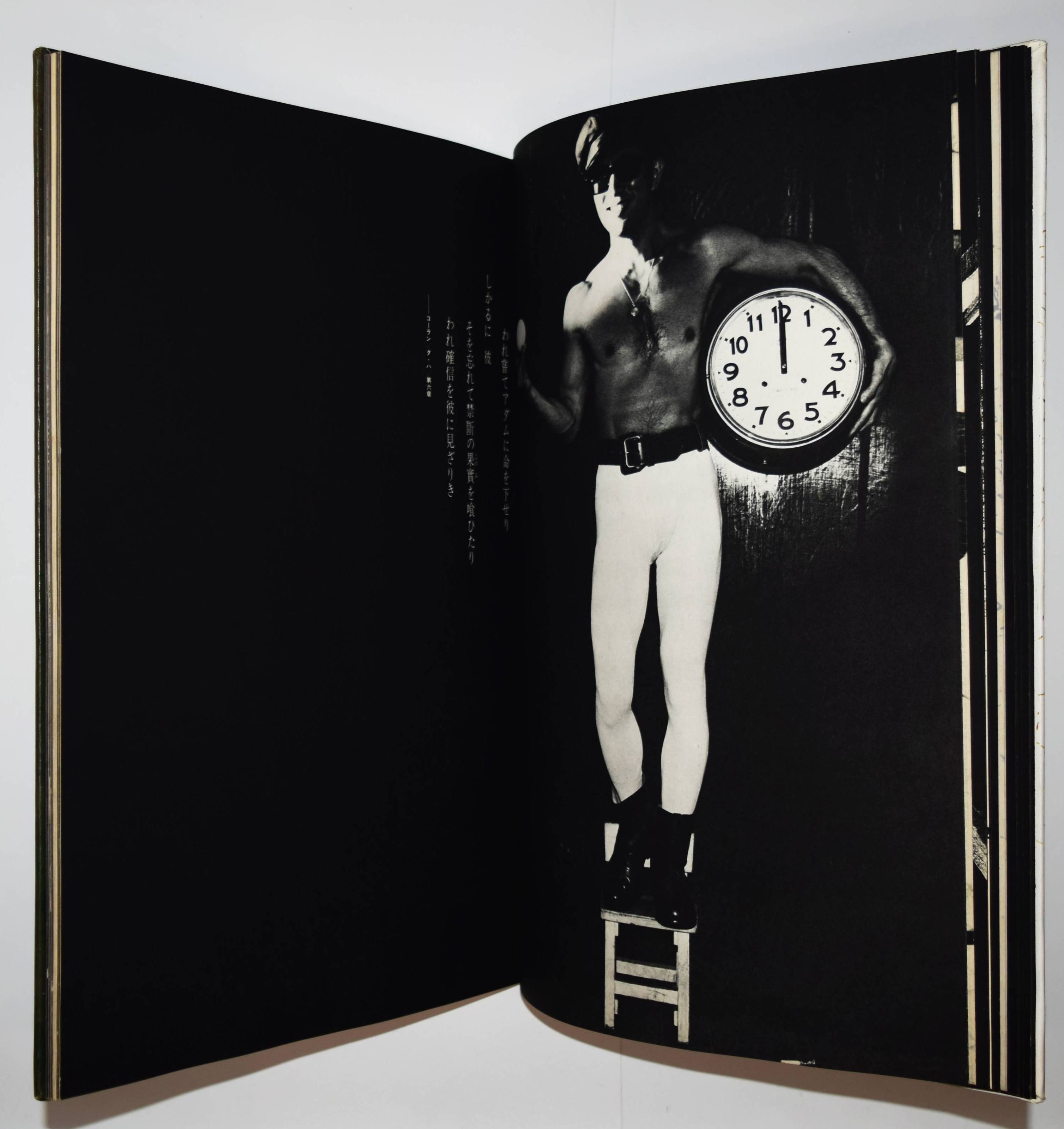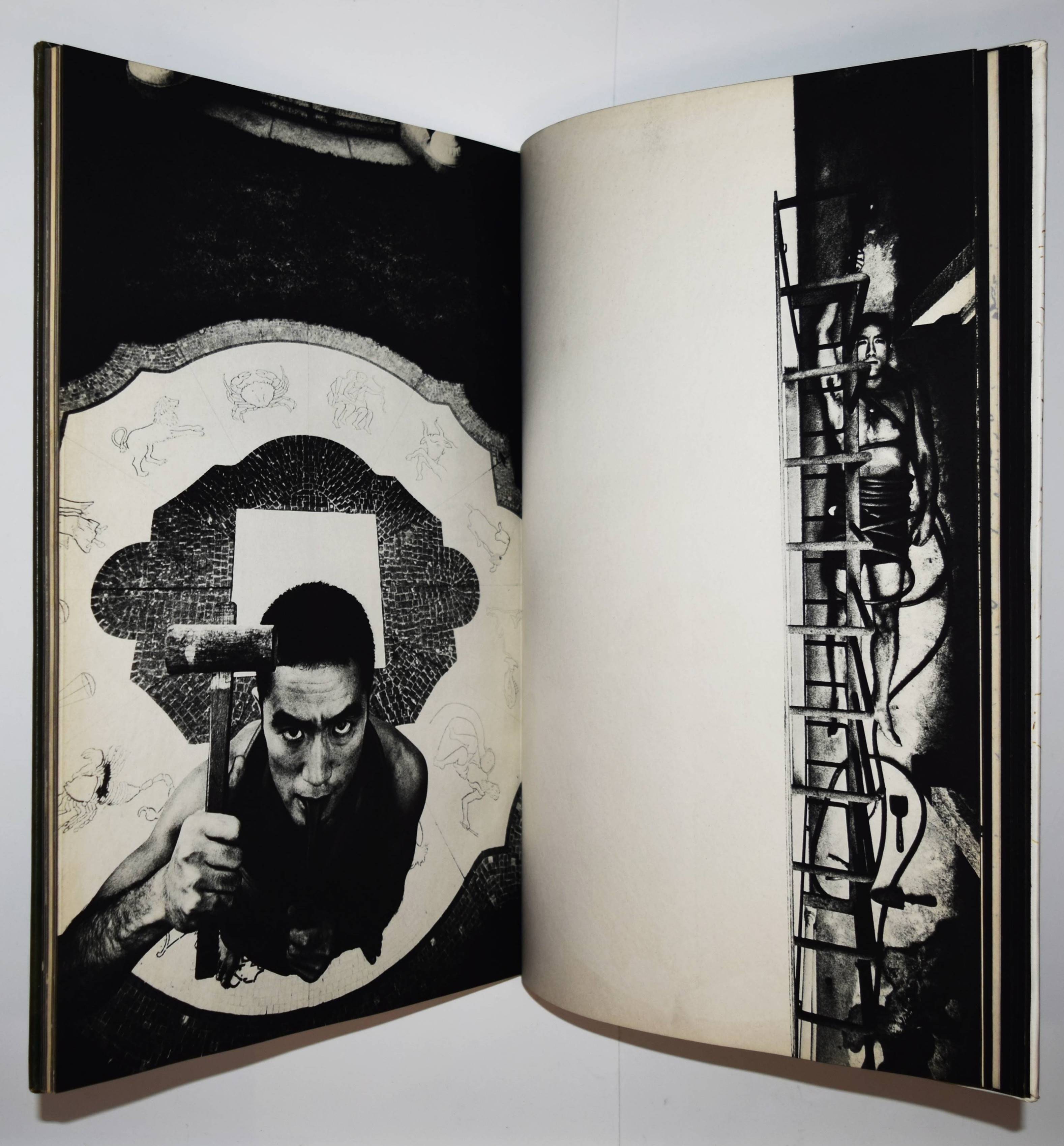| Hosoe, Eikoh. Barakei Sguei-sha. (Killed by roses). (Introduction by Yukio Mishima. Design by Kohei Sugiura). Tokyo, Shueisha (1963). Folio (42 x 27 cm.). [104] S. mit 43 Tafeln in Sheet-fed gravure. Illustr. Orig.-Leinenband mit Klarsichtschutzumschlag in illustr. Pappkassette. Auer 422. Heiting/Kaneko 368 f., 279. The Open Book 194 f. Parr/Badger I, 280 f. (mit mehreren Abb.). Roth, The Book of 101 Books 164 ff. – Erste Ausgabe, das wohl wichtigste japanische Fotobuch der 60er Jahre. – Von E. Hosoe und Y. Mishima im Impressum signiert. Eines von 1500 num. Exemlaren. – „Eikoh Hosoe’s first edition of Killed By Roses is so splendidly packaged that just opening it is a plearure – and the seduction doesn’t stop there. Within a black-and-white cardboard case printed an both sides with photos of carved pendants in thick chains and a fine shower of text is a glossy color cover featuring a photogram of symbolic elements plucked from Hosoe’s hallucinatory narrative, the title superimposed in classical Greek lettering. … The photos that make up the body of the book are inky, sometimes high-constrast gravures that bleed right to the edge of the page and often extend across the entire open spread, given extra impact to images that are already quite arresting. Even if the subject of Hosoe’s photographs weren’t zje author Yushi Mishima, the book would be remarkable for its humid mix of eroticism and myth, queer kitsch and high art“ (A. Roth). – „Both Japanese editions of Barakei (Killed by Roses) are significant, not only because of the remarkable collaboration between Eikoh Hosoe and Yukio Mishima, but also because they were designed by the two most influential Japanese graphic designers of the postwar years – the first edition by Kohei Sugiura and the second by Tadanori Yokoo. Each is an original working of the material in its own right, and the second, one of the most complex bookworks ever made, also memorializes a definingmoment in Japanese culture. … In his preface to the first edition, Mishima was equally disingenous: ‚One day without warning, Eikoh Hosoe appeared before me, and transported me bodily to a strange world.‘ That world, he continued, was ‚abnormal, warped, sarcastic, grotesque, savage, and promiscuous‘. Mishima allowed Hosoe unprecedented directorial freedom, but as in other such close collaborations between photographer and subject, just who had the ultimate control is open to question. What emerged was a series of extraordinary theatrical tableaux – Japanese surrealism meets Italien mannerism – that certainly contributed to the iconicity of Mishima, the samurai saviour of the country’s soul. Hosoe’s images were baroque, kitsch, frequently sadomasochistic, disturbingly narcissistic and clearly homoerotic, despite the presence of women in a number of the pictures“ (Parr/Badger). – Die Kassette teils stärker berieben, der Acetat-Schutzumschlag am Kapital etwas eingerissen, gutes Exemplar.