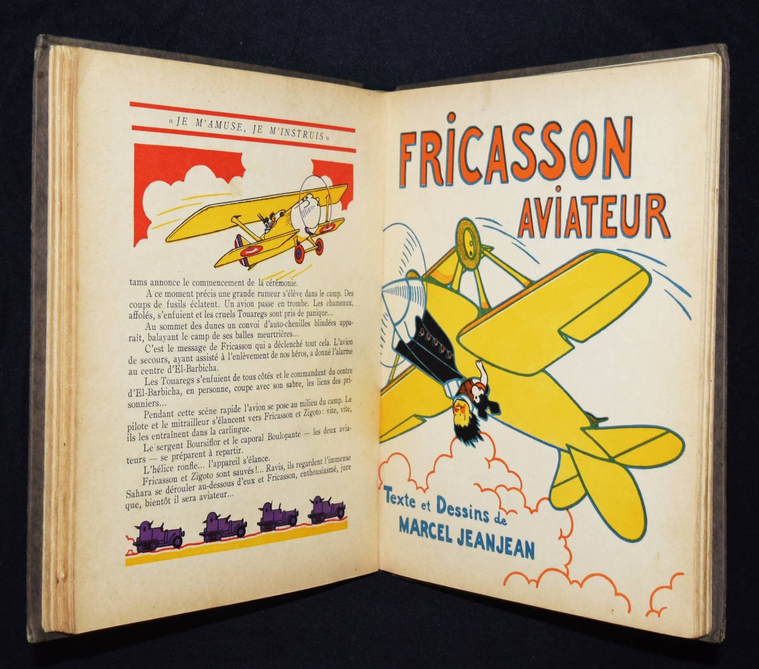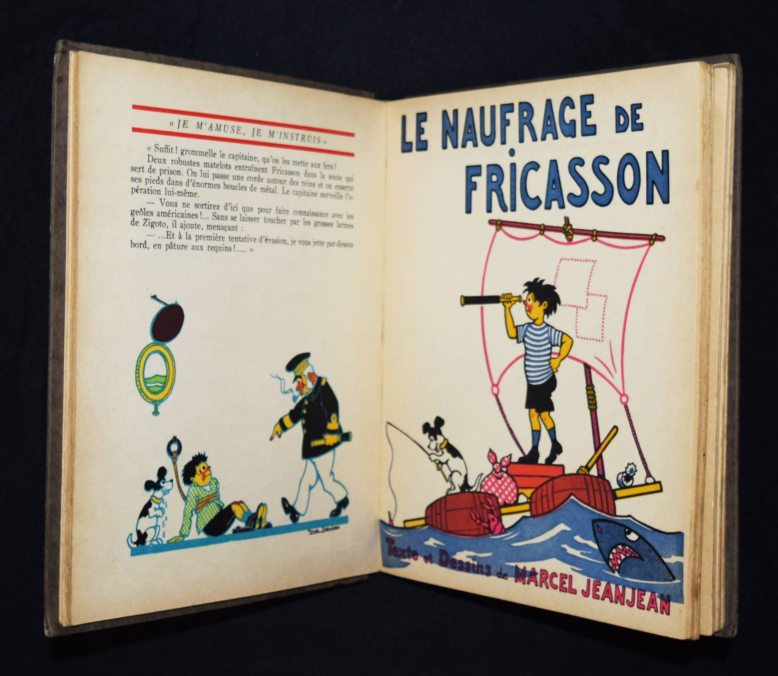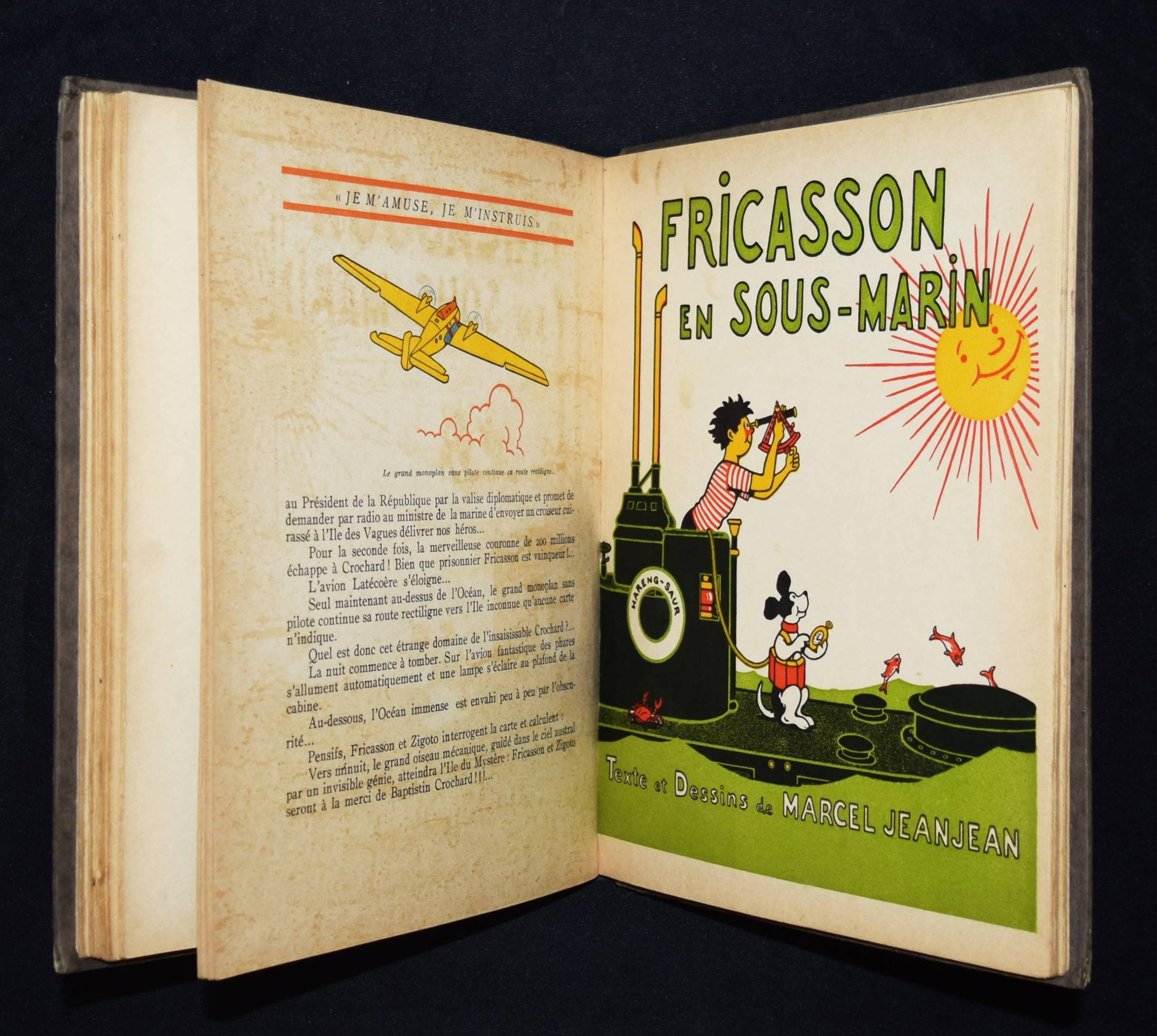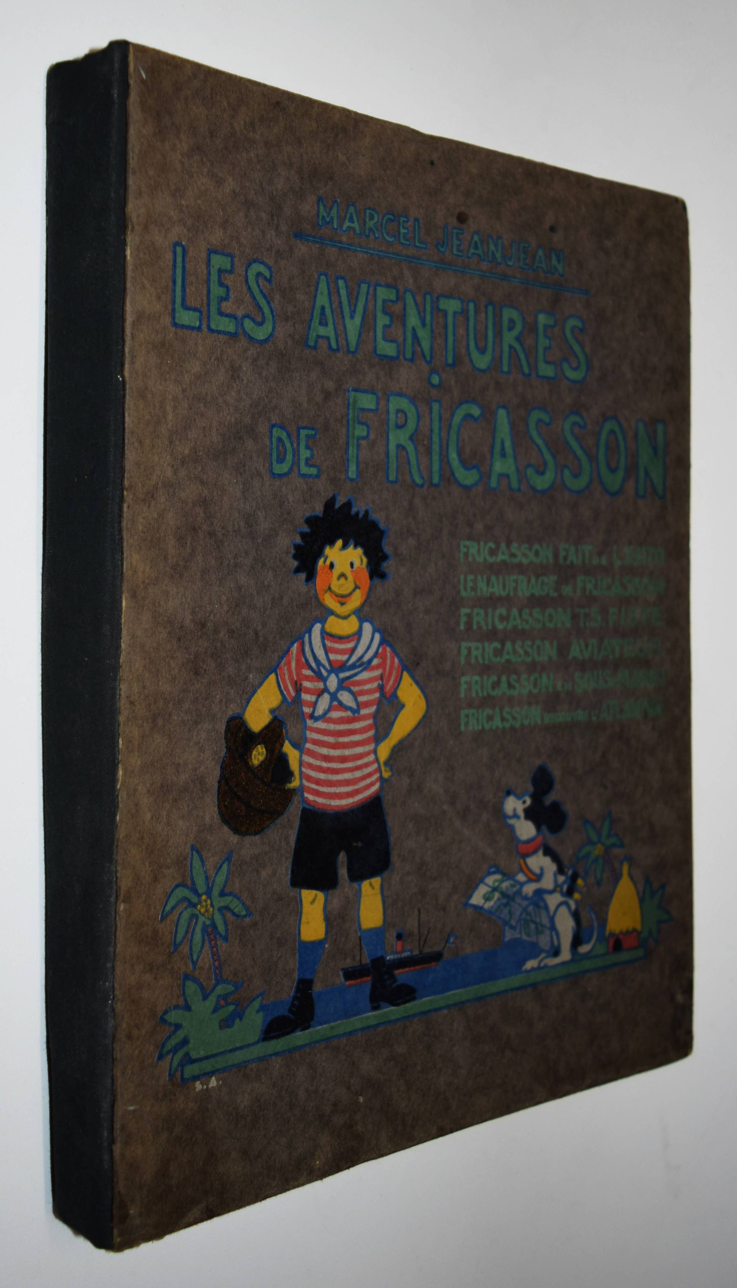 Jeanjean, Marcel (Joseph). Les aventures de Fricasson. Fricasson fait de l’auto. – Le naufrage de Fricasson. – Fricasson T. S. Fiste. – Ficasson aviateur. – Fricasson en sous-marin. – Fricasson decouvre l’Atlantide. 6 Teile in 1 Band. Paris, Union Latine d’Editions o. J. (1925). 4°. [108] S. mit farblithogr. Illustrationen. Farbig illustr. OHln. Erste Ausgabe des Sammelbandes; 1926 erschienen „Les Nouvelles aventures de Fricasson“ mit weiteren sechs Geschichten. – In Frankreich sehr erfolgreiche Bilderbücher des franz. Illustrators, Gebrauchsgraphikers und Piloten M. J. Jeanjean (1893-1973). Die Abenteuer eines jungen Weltenbummlers mit seinem Hund erschienen vier Jahre vor Hergés Tim und Struppi. Außerdem wird die Vorliebe des Künstlers für Flugzeuge und Maschinen (Luftschiffe, Panzer, Schiffe etc.) deutlich. – Sehr gutes sauberes Exemplar.