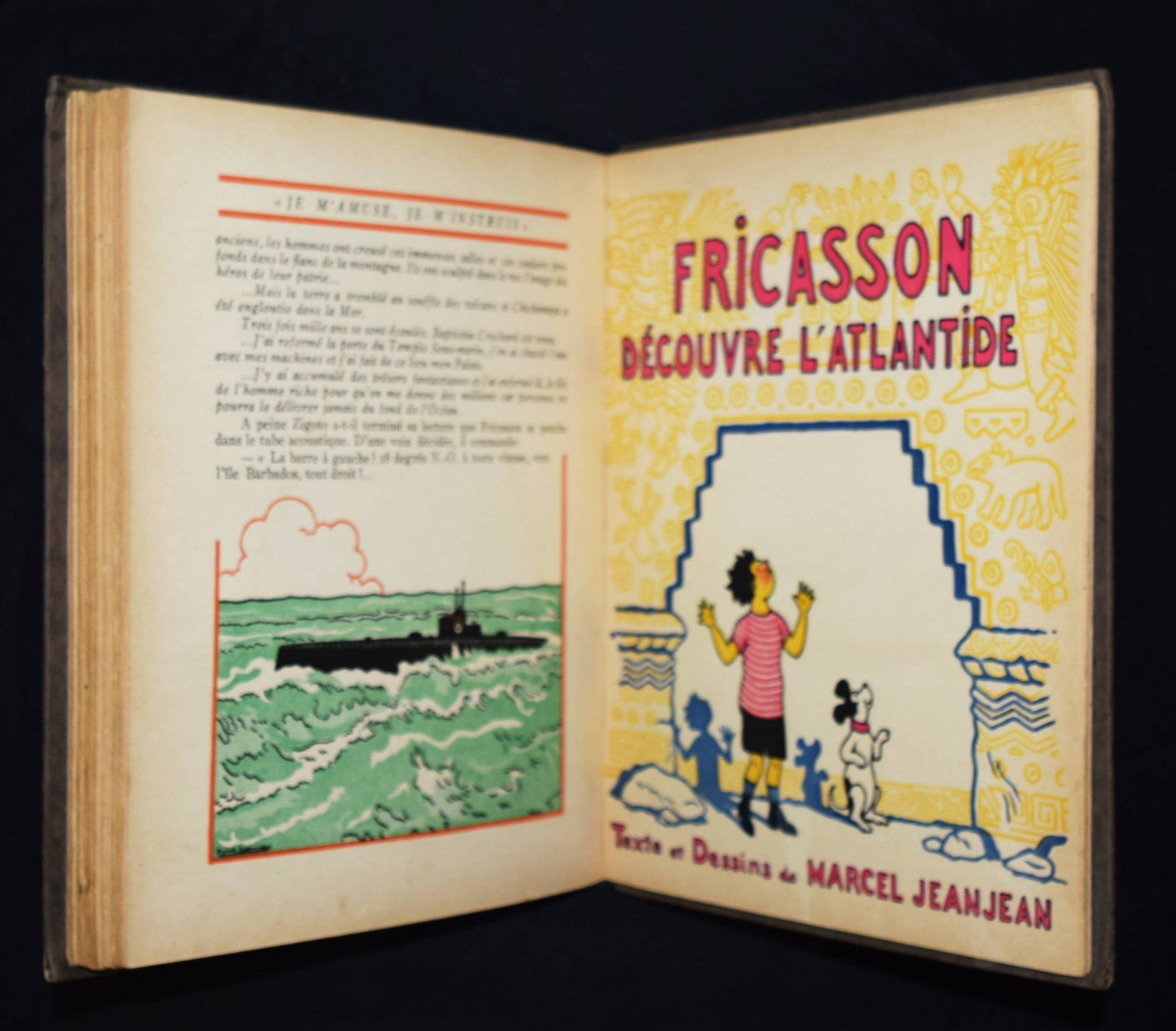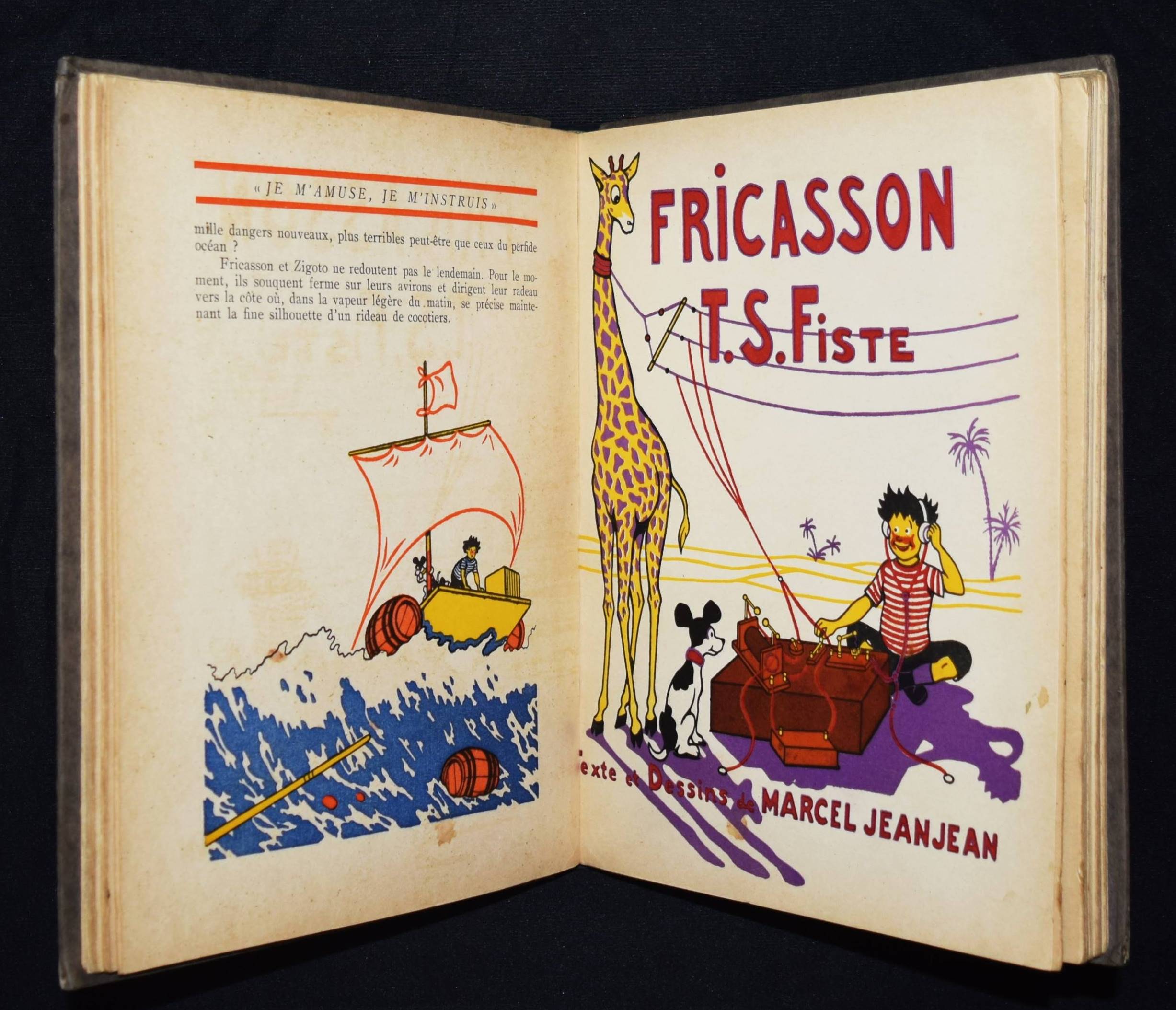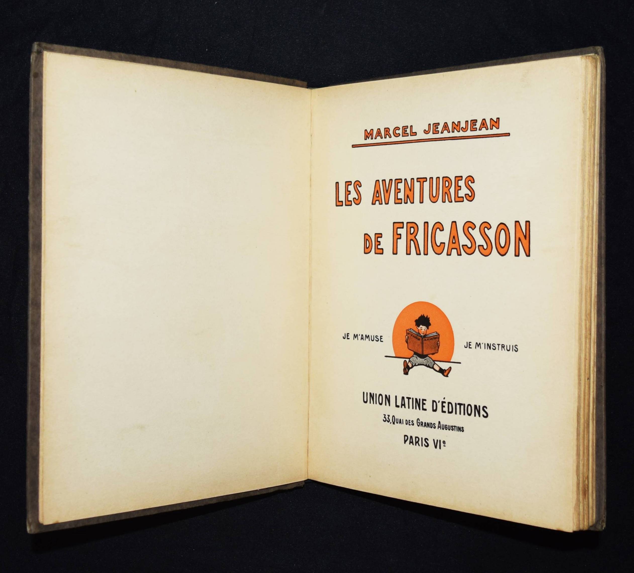 Jeanjean, Marcel (Joseph). Les aventures de Fricasson. Fricasson fait de l’auto. – Le naufrage de Fricasson. – Fricasson T. S. Fiste. – Ficasson aviateur. – Fricasson en sous-marin. – Fricasson decouvre l’Atlantide. 6 Teile in 1 Band. Paris, Union Latine d’Editions o. J. (1925). 4°. [108] S. mit farblithogr. Illustrationen. Farbig illustr. OHln. Erste Ausgabe des Sammelbandes; 1926 erschienen „Les Nouvelles aventures de Fricasson“ mit weiteren sechs Geschichten. – In Frankreich sehr erfolgreiche Bilderbücher des franz. Illustrators, Gebrauchsgraphikers und Piloten M. J. Jeanjean (1893-1973). Die Abenteuer eines jungen Weltenbummlers mit seinem Hund erschienen vier Jahre vor Hergés Tim und Struppi. Außerdem wird die Vorliebe des Künstlers für Flugzeuge und Maschinen (Luftschiffe, Panzer, Schiffe etc.) deutlich. – Sehr gutes sauberes Exemplar.