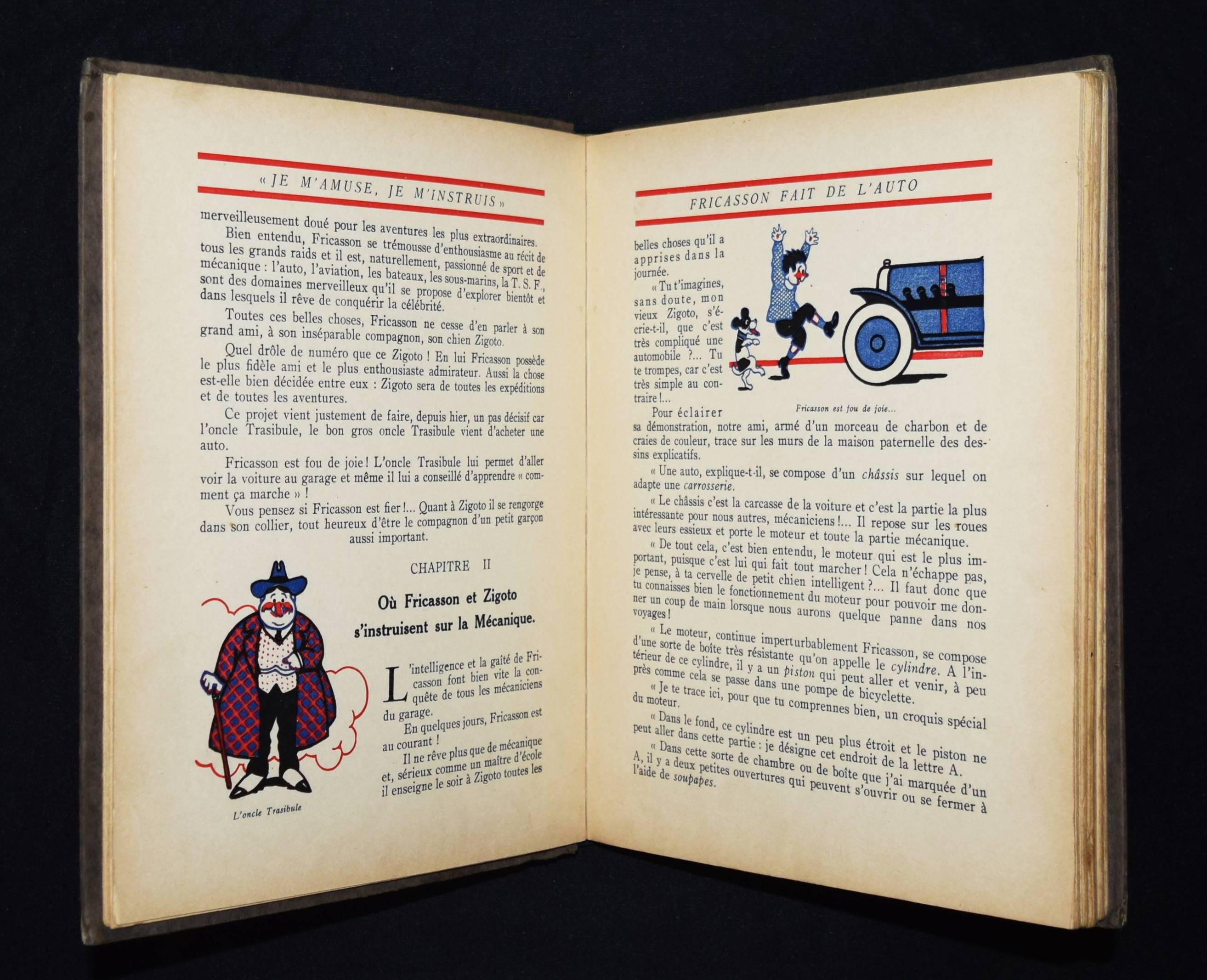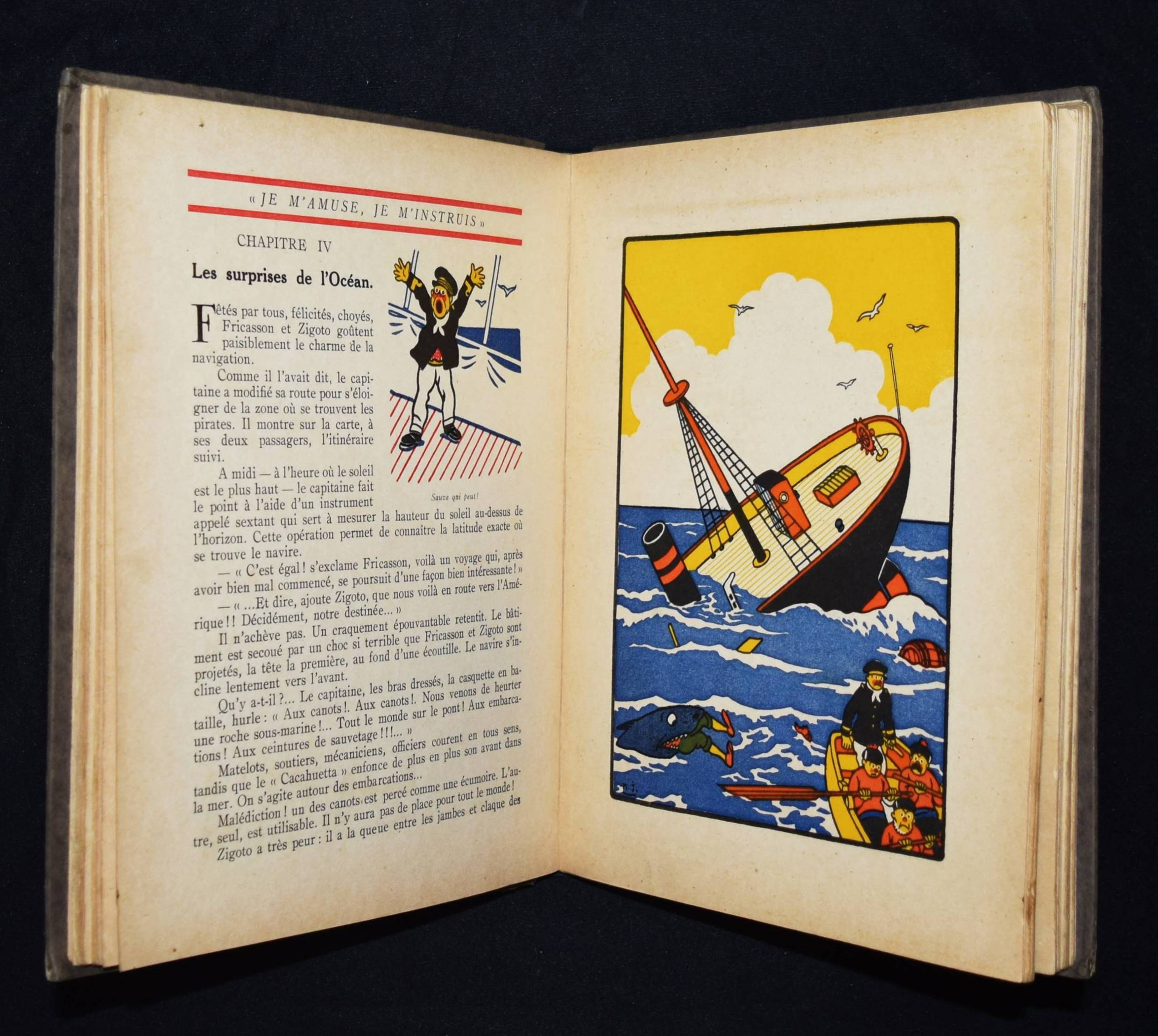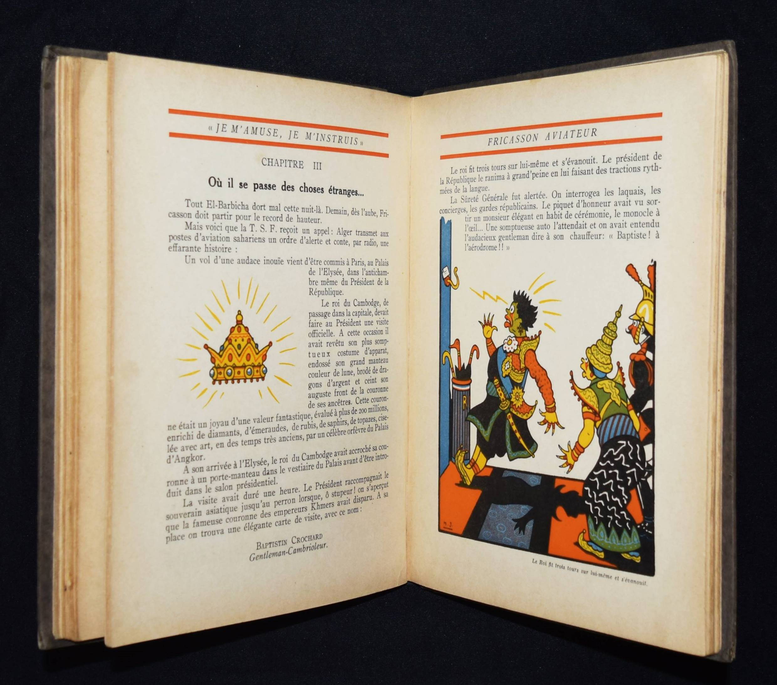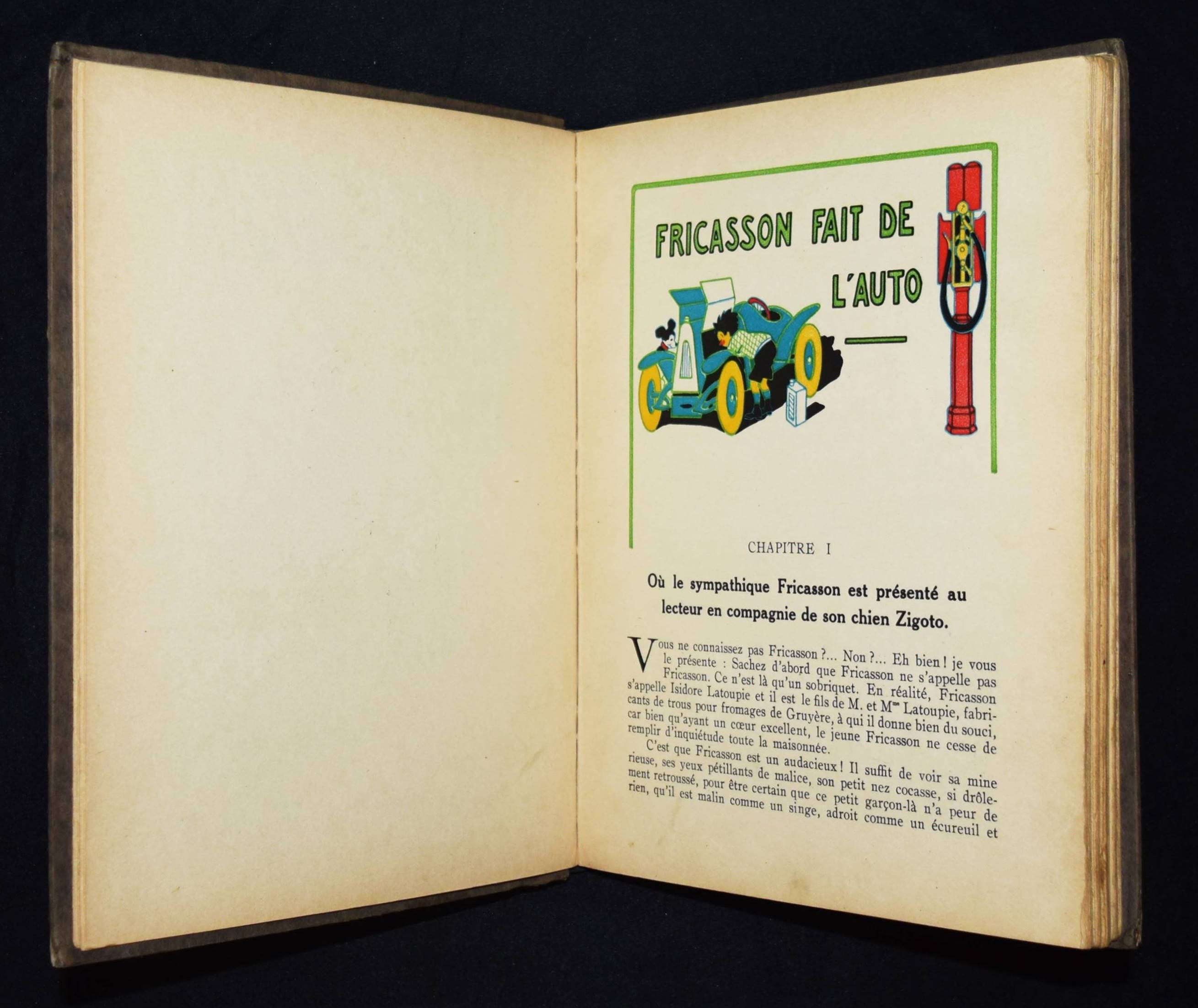 Jeanjean, Marcel (Joseph). Les aventures de Fricasson. Fricasson fait de l’auto. – Le naufrage de Fricasson. – Fricasson T. S. Fiste. – Ficasson aviateur. – Fricasson en sous-marin. – Fricasson decouvre l’Atlantide. 6 Teile in 1 Band. Paris, Union Latine d’Editions o. J. (1925). 4°. [108] S. mit farblithogr. Illustrationen. Farbig illustr. OHln. Erste Ausgabe des Sammelbandes; 1926 erschienen „Les Nouvelles aventures de Fricasson“ mit weiteren sechs Geschichten. – In Frankreich sehr erfolgreiche Bilderbücher des franz. Illustrators, Gebrauchsgraphikers und Piloten M. J. Jeanjean (1893-1973). Die Abenteuer eines jungen Weltenbummlers mit seinem Hund erschienen vier Jahre vor Hergés Tim und Struppi. Außerdem wird die Vorliebe des Künstlers für Flugzeuge und Maschinen (Luftschiffe, Panzer, Schiffe etc.) deutlich. – Sehr gutes sauberes Exemplar.