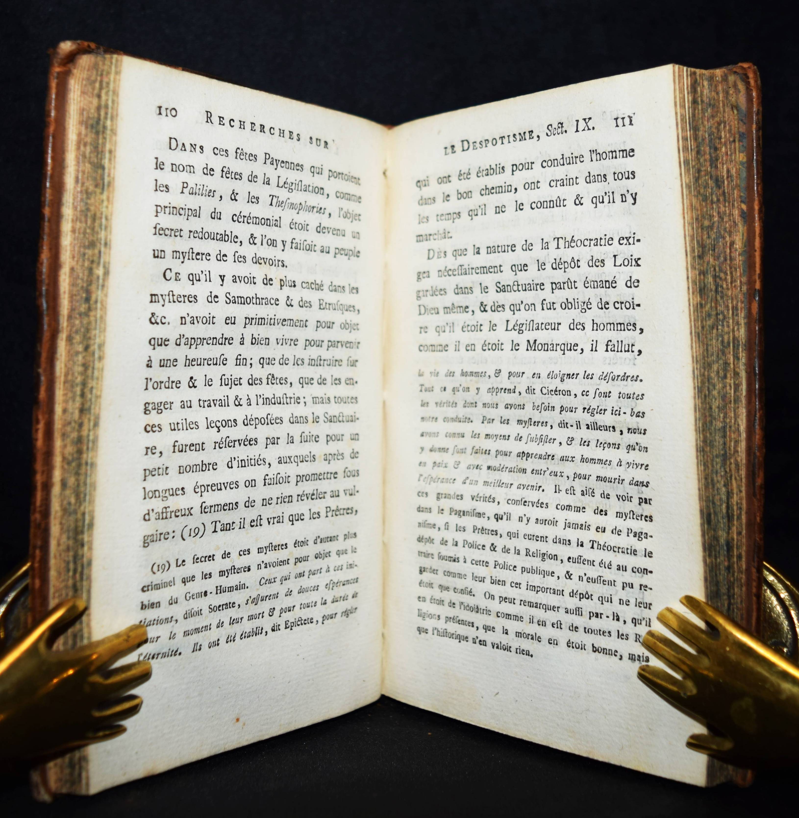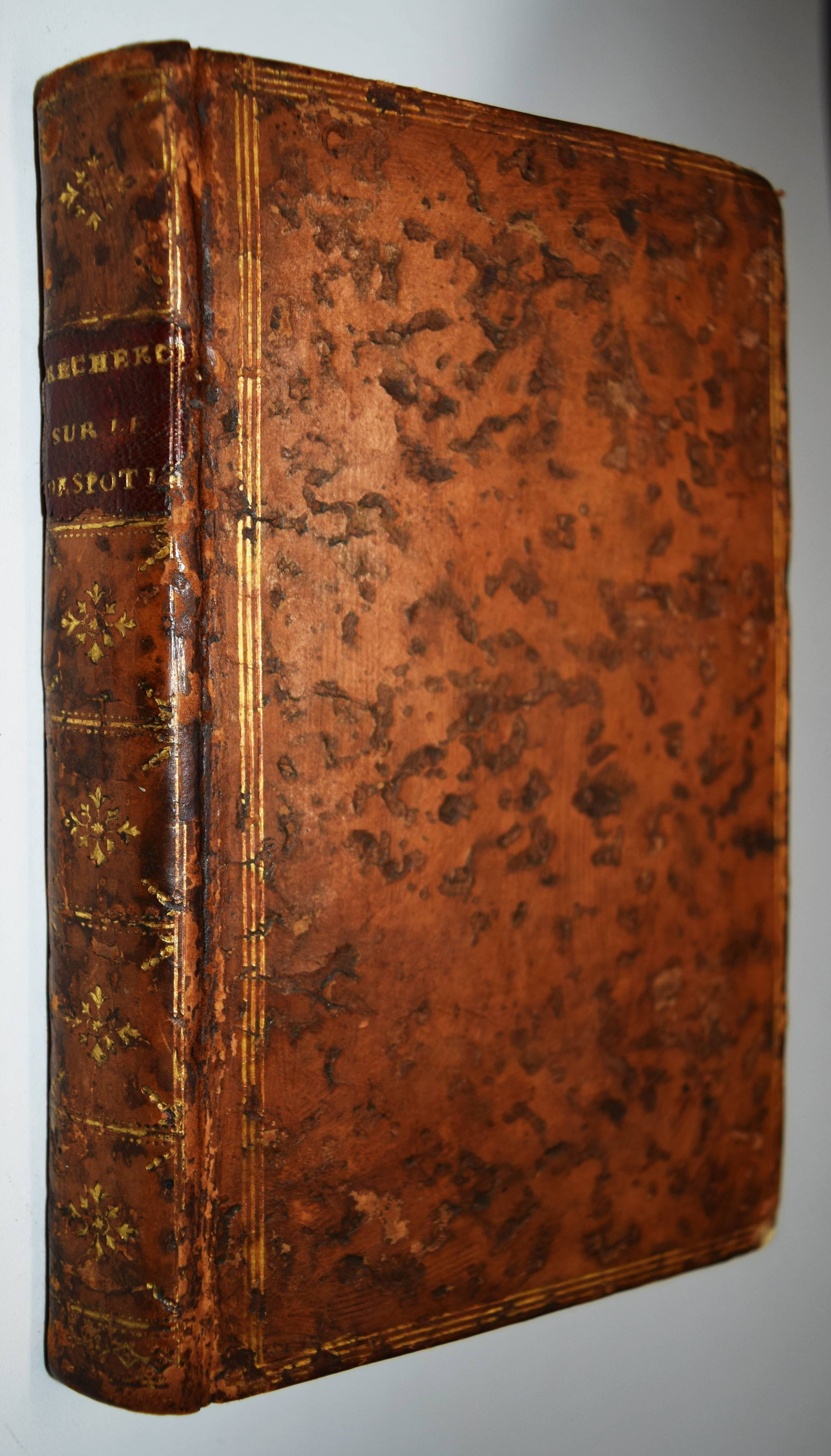 | (Boulanger, Nicolas Antoine, Pseud. Mr. B.I.D.P.E.C.). Recherches sur l’origine du despotisme oriental. ouvrage posthume. (Editée par Paul Henri Thiry d’Holbach). O. O. u. Dr. (Amsterdam ?) 1777. Kl.-8°. [4] Bl., 287 S. Ldr. d. Zt. mit goldgepr. Rückenschild u. floraler Rückenverg. Vgl. Cioranesci, 18e siècle 13420. Caillet 1532. Goldsmiths 9926. Higgs 2850. – Zuerst 1761 in Genf erschienenen politischen Abhandlung, welche zuerst als Einführung und Erläuterung von Monsquieus „De l’esprit des lois“ gedacht war. – „Les ‚Recherches‘ int été attribuées à Boulanger dès leur parution, le rôle d’Holbach et de ses amis se réduisant à celui d’éditeur et peut-être d’adapteur. Les initiales qui apparaissent dans les titres des éditions de 1761 et 1762 désignent clairement l’auteur et ses fonctions: B-oulanger I-ngénieur D-es P-onts et C-haussées“ (J. Vercruysse, Bibliographie descriptive des écrits du baron d’Holbach). – Rücken, Gelenke und Kanten etwas berieben, gutes dekorativ gebundenes Exemplar.