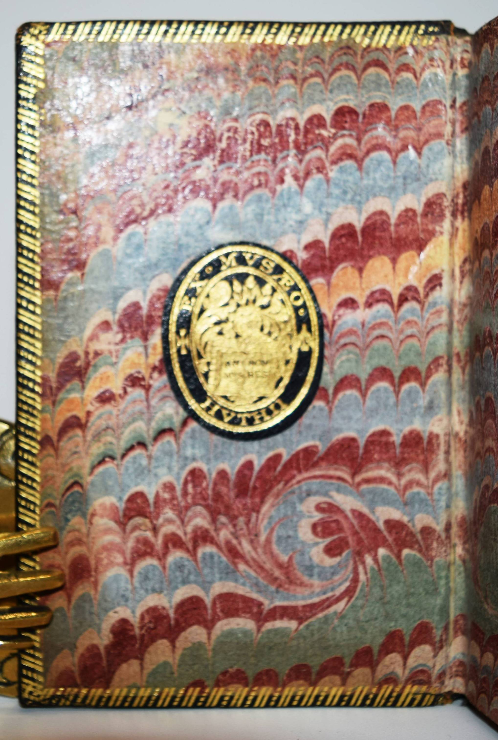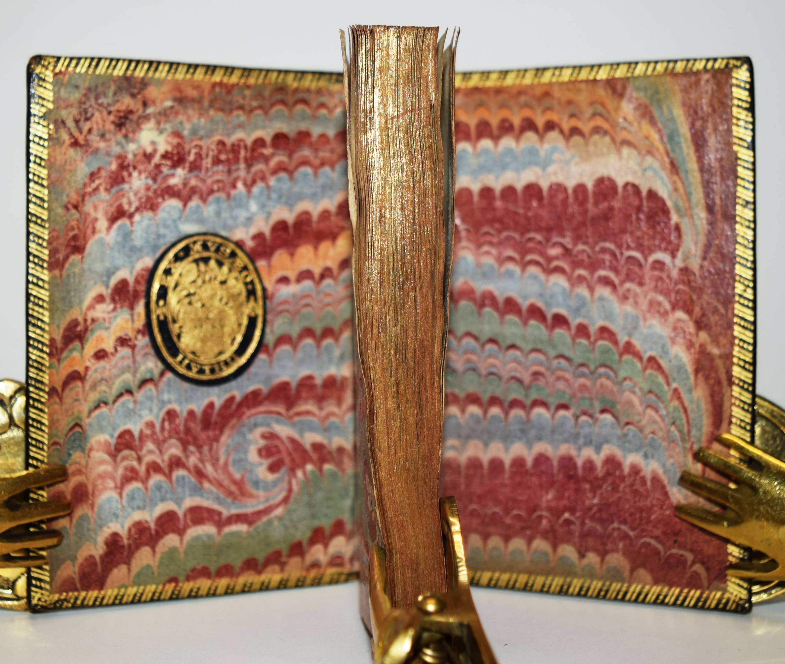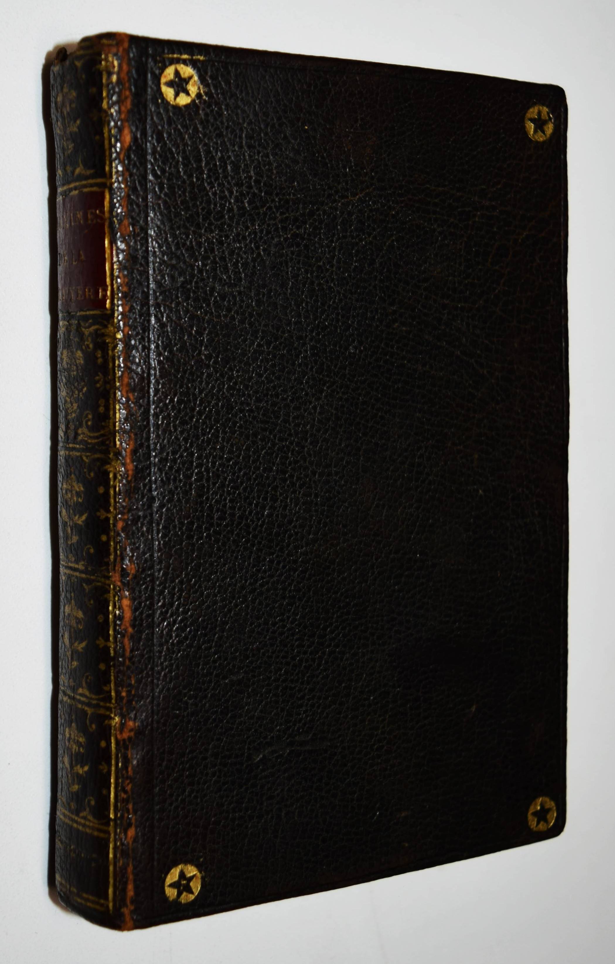 La Bruyère, (Jean de). Maximes et réflexions morales. Paris, Imprimerie de Monsieur 1781. 12° (12,5 x 8,5 cm.). LX, 195 S. Schwarzer Ldr. d. Zt. mit goldgepr. Rückenschild, reicher floraler Rückenverg., 4 goldgepr. Vignetten in den Ecken der Deckel, Innenkantenverg. u. Goldschnitt. Schön gedruckte Taschenausgabe der Aphorismen des bedeutenden franz. Ethikers J. de la Bruyère (1645-1696), welcher „lehrte, daß der Egoismus die Quelle unserer Handlungen sei“ (W. Ziegenfuss). – Gelenke gering berieben, goldgepr. Wappen-Exlibris in schwarzem Leder, sehr schönes prachtvoll gebundenes Exemplar aus einer Schloß-Bibliothek.