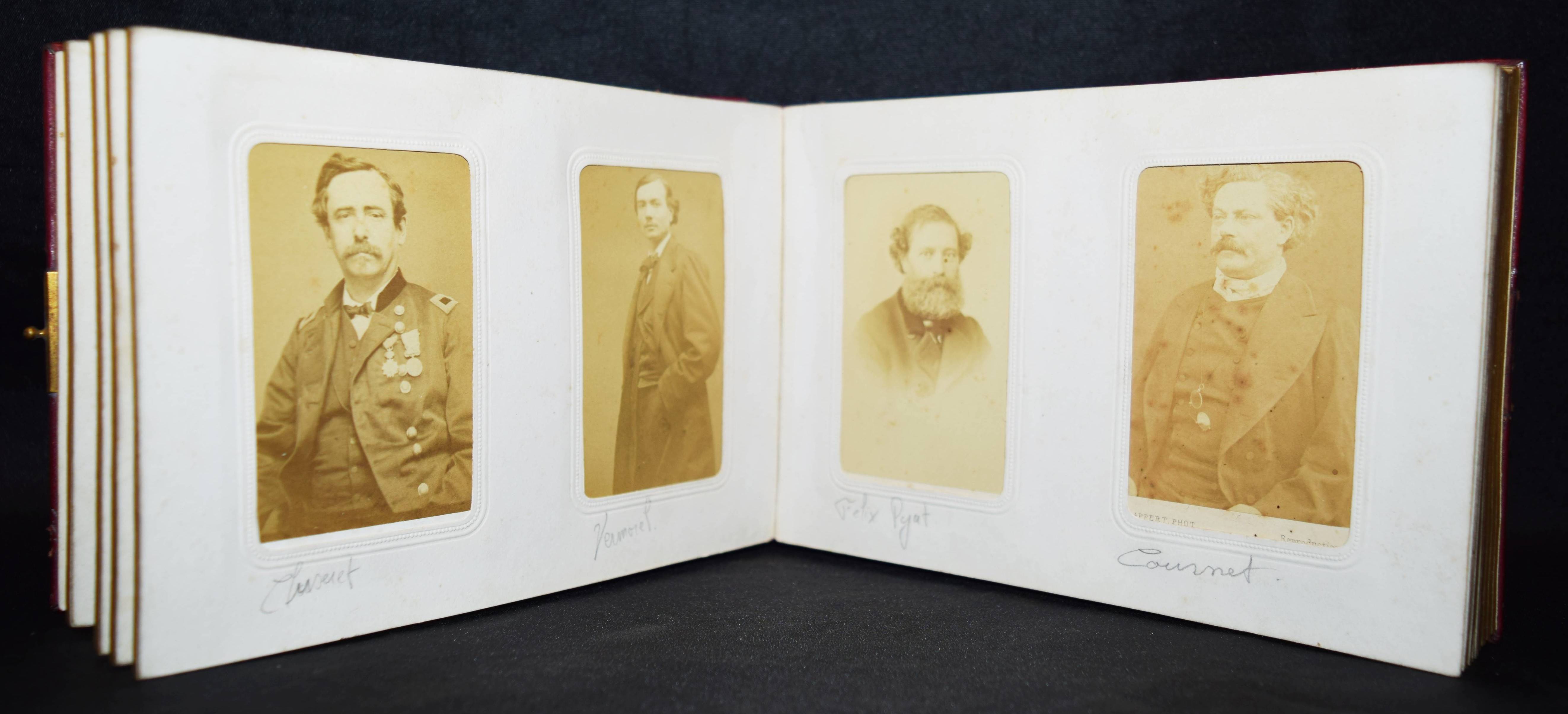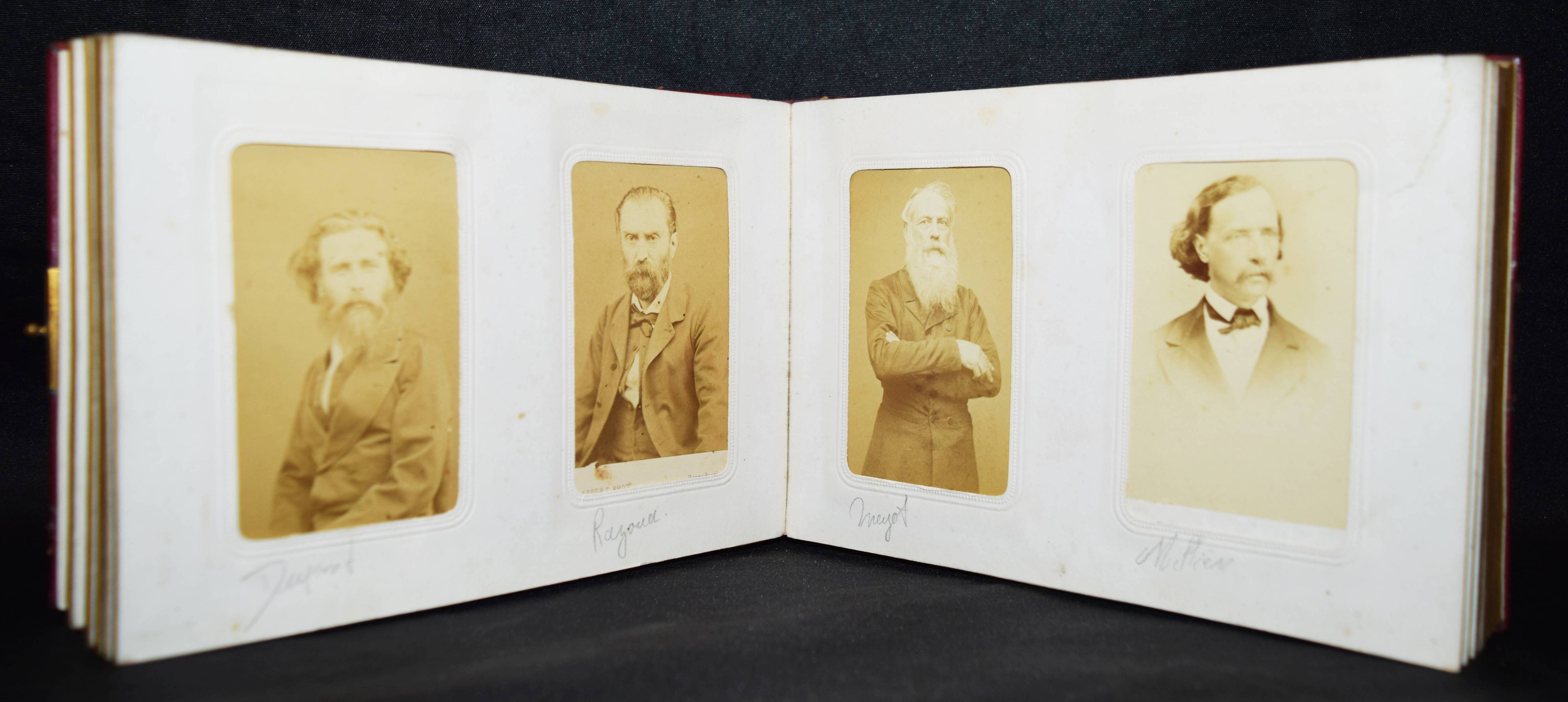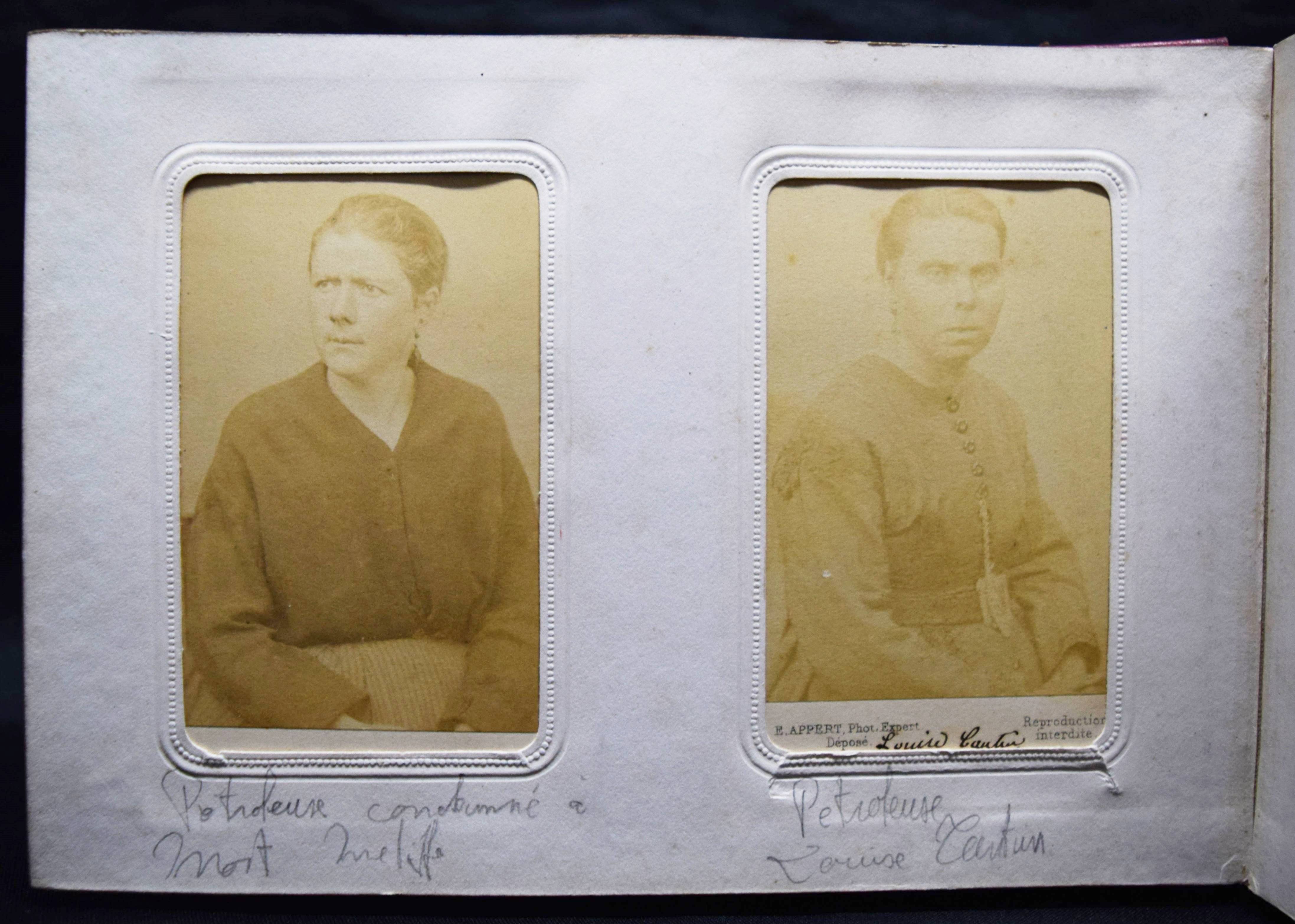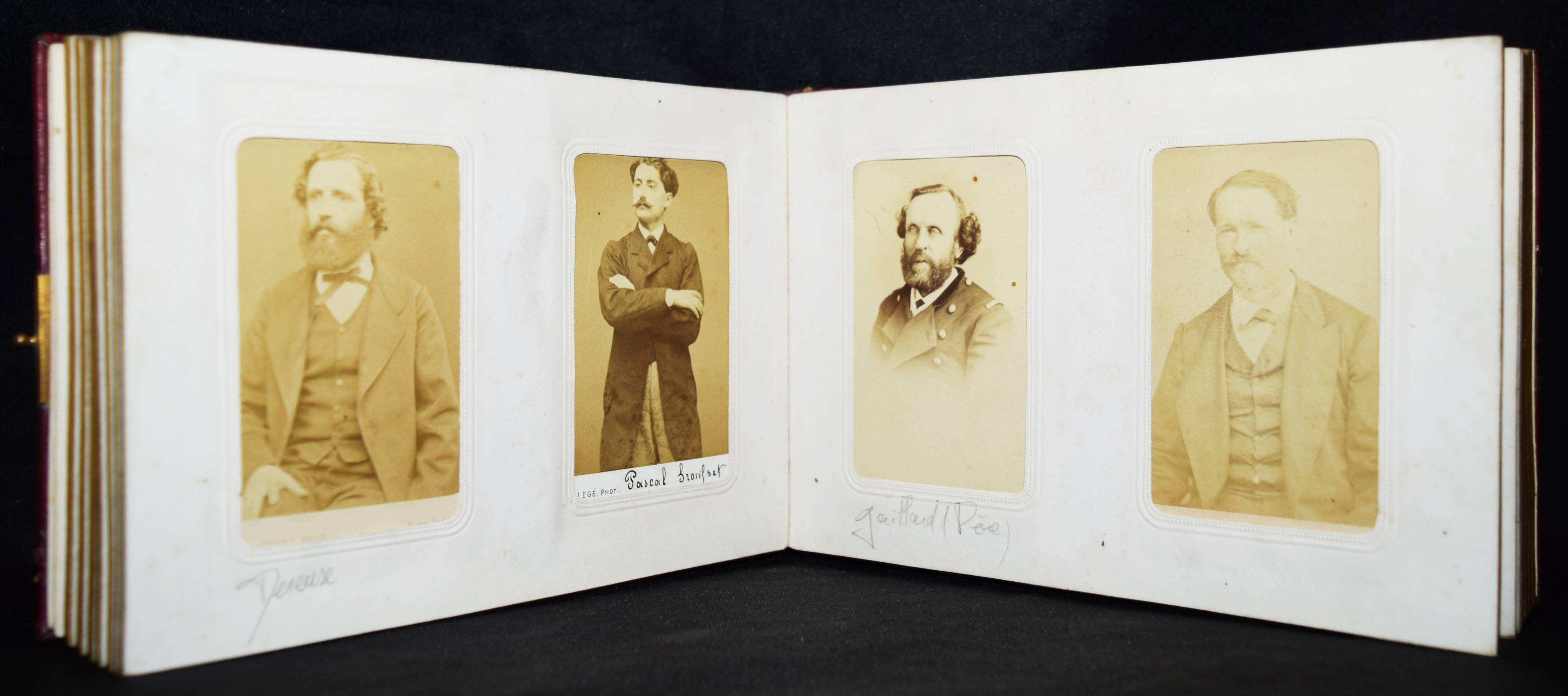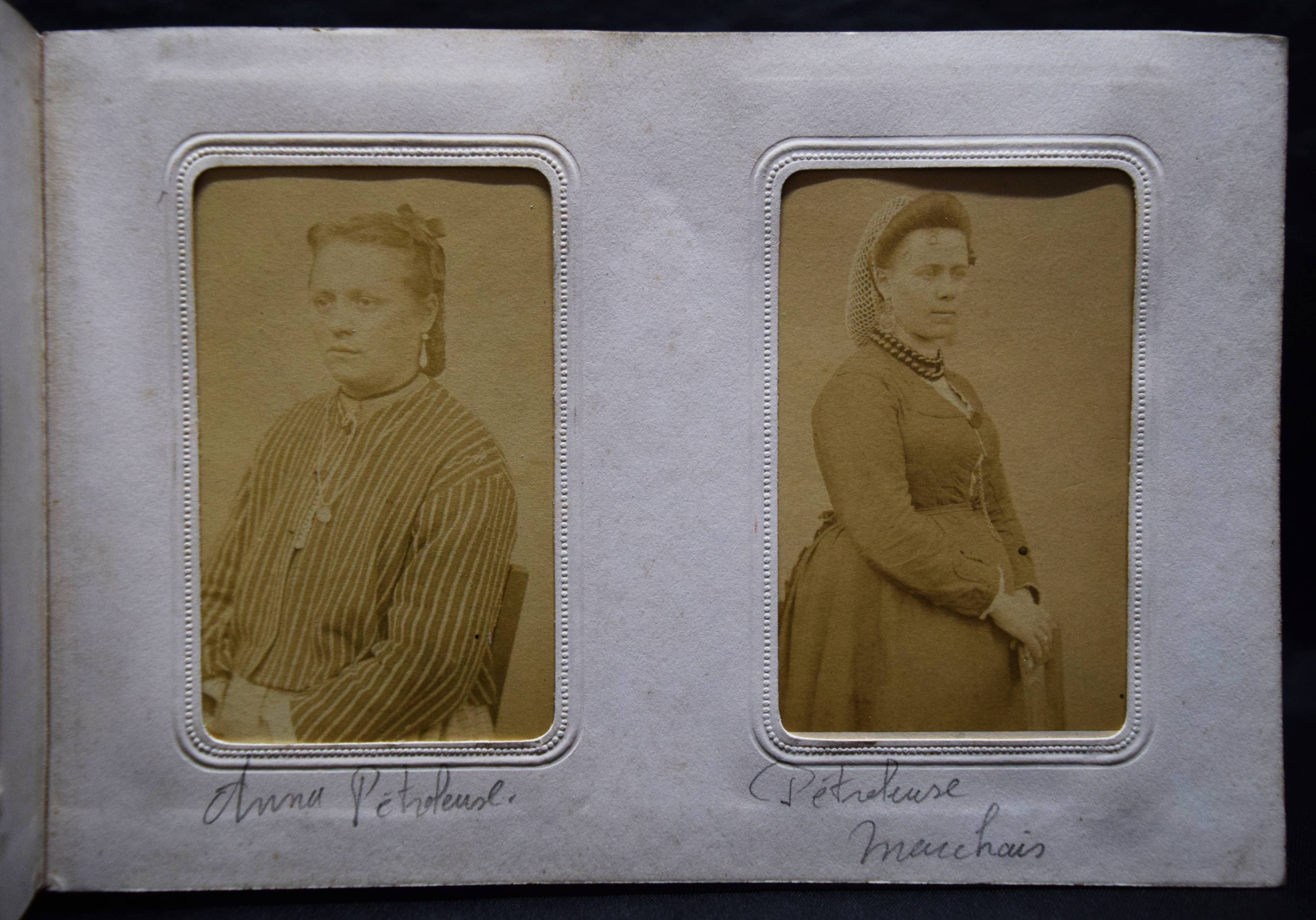 Pariser Kommune – Appert, Eugène u.a. Album mit 51 Orig.-Photographien (Albumin-Abzüge). Meist Porträts von Akteuren der Pariser Kommune und des Deutsch-Französischen Krieges. Paris ca. 1871. Quer-8° (13 x 18,5 cm.). Weinrotes blindgepr. OLdr. mit Goldschnitt. Meist mit Bleistift auf dem Kartonblatt oder auf dem Trägerkarton verso bezeichnet, teils auch recto in Tinte. – Besonders interessant durch 13 Porträts von Eugène Appert (1830-1891), die Frauen auf der Seite der Kommune zeigen, meist sogenannte „pétroleuses“, denen vorgeworfen wurden, während der Kämpfe in Paris Gebäude in Brand gesteckt zu haben. – „After the rebellion, Appert took the portraits of hundreds of the individual communards while imprisoned in jail. He was not assigned this job by the authorities, but took the initiative upon himself to do this, which also happened to have a commercial motive. Indeed, his photographs where eagerly puchased and reproduced once and again. The police also benefited from his images by including them in their card indexes“ (Hannavy 55). – Enthält eine Fotografie der berühmten Louise Michel (1830-1905), „maitresse de Ferré“,außerdem u. a. Hortense David, Clara Fournier, Marie Leroy, „maitresse d’Urbain“ (2 verschiedene Fotografien), Eulalie Papavoine, Elisabeth Retiffe, „condemnée à mort“ und „Anna pétroleuse“ (d. i. Léontine Suetens). Unter den männlichen Abgebildeten sind u.a. Fotografien der Kommunarden Frédéric Cournet, Napoléon Gaillard, Charles Ferdinand Gambon, Félix Pyat und Auguste Vermorel enthalten, außerdem Porträts der Generäle Louis d’Aurelle de Paladines und Félix Charles Douay und des Admirals Louis Pierre Alexis Pothuau. 5 Fotografien zeigen teils zerstörte Gebäude (eines „Maison Miller“, Rue St. Denis lose beiliegend). Außerdem 9 Fotografien nach Gemälden oder Lithographien. – Einband etwas angestaubt, berieben und fleckig, Messingschließe fehlt, Unterlagekartons stellenw. etwas fleckig, Fotografien kaum, Einstecktaschen vereinzelt etwas eingerissen. – Dazu: Edith Thomas. Les „Pétroleuses“. Paris, Gallimard (1963). 288 S., 4 Bl. Illustr. OKart.