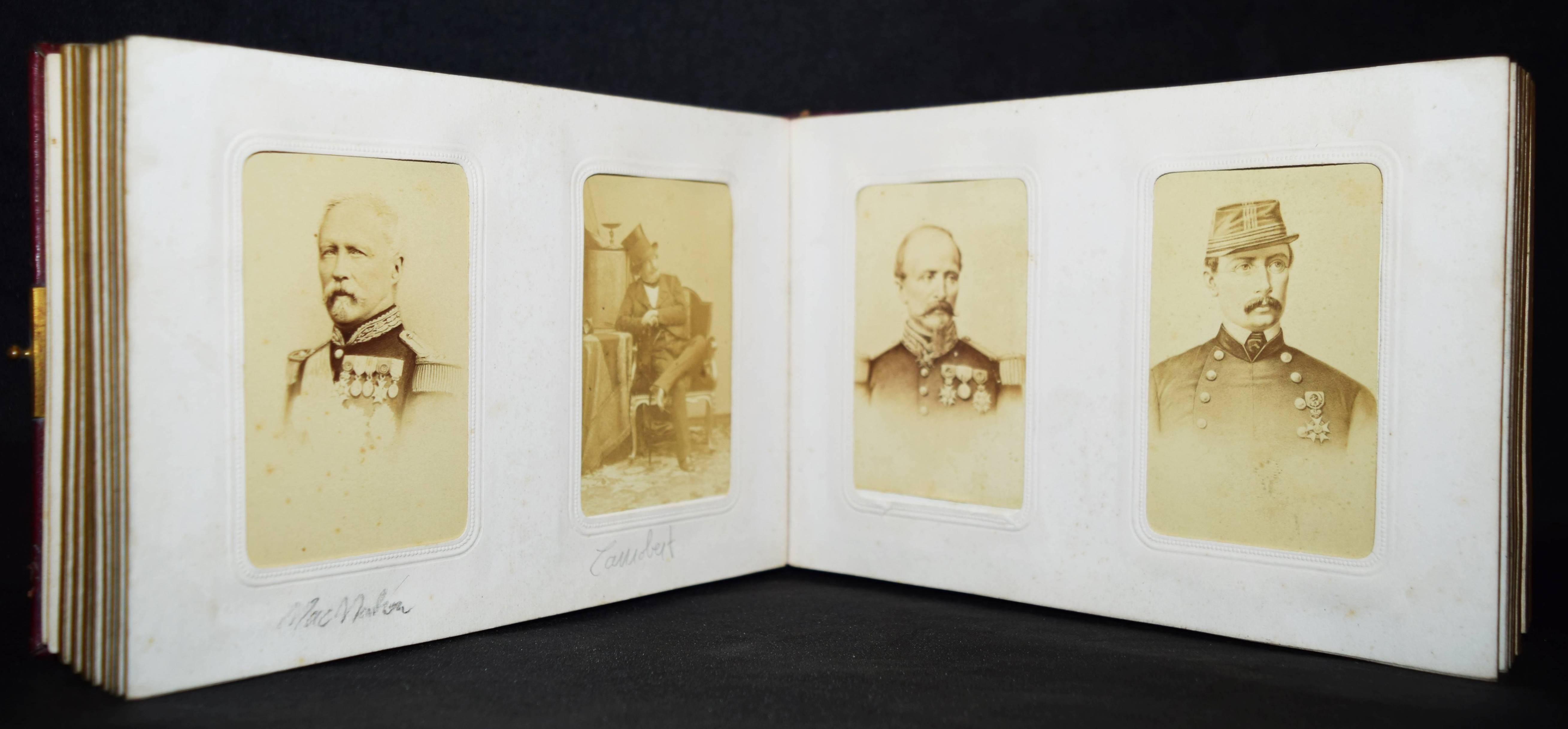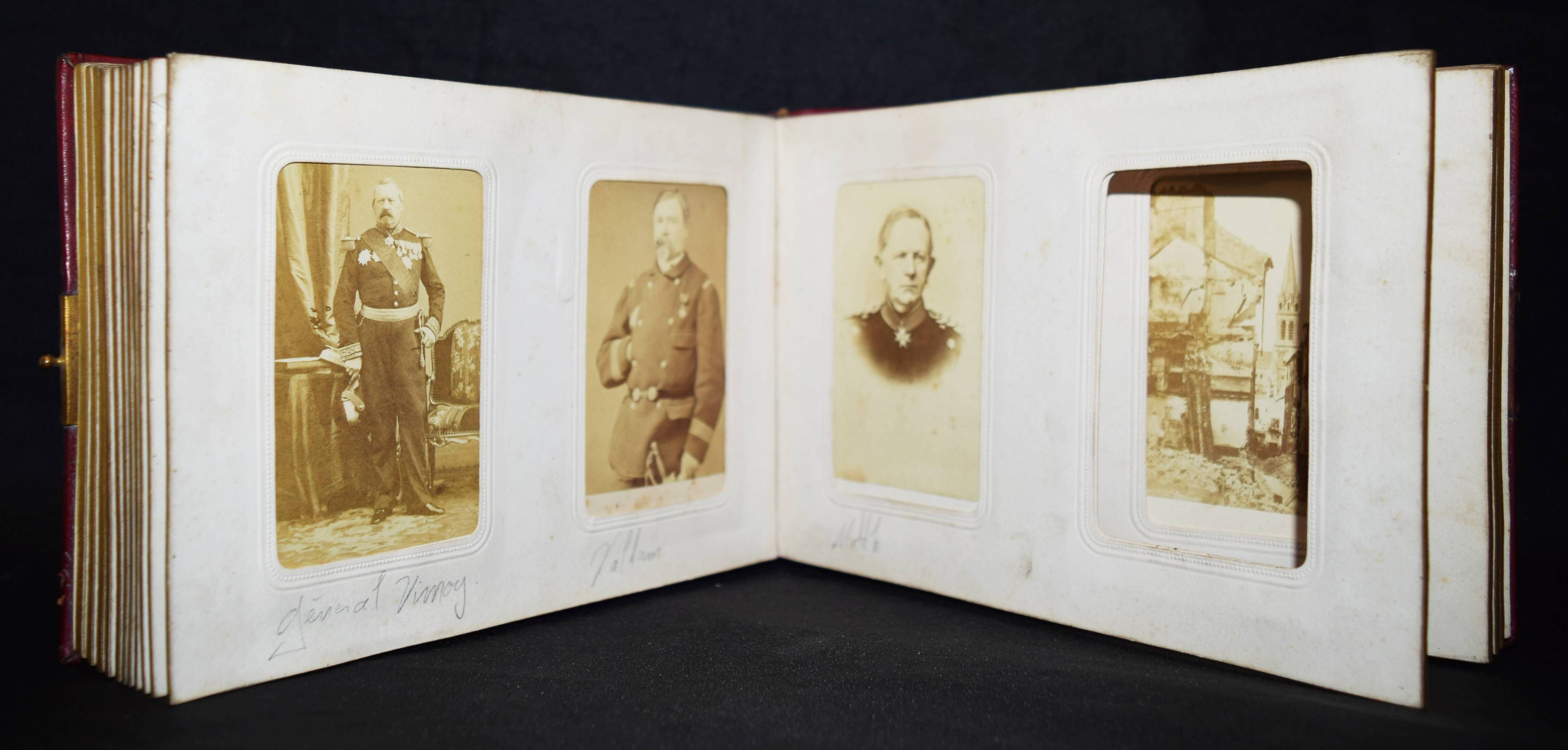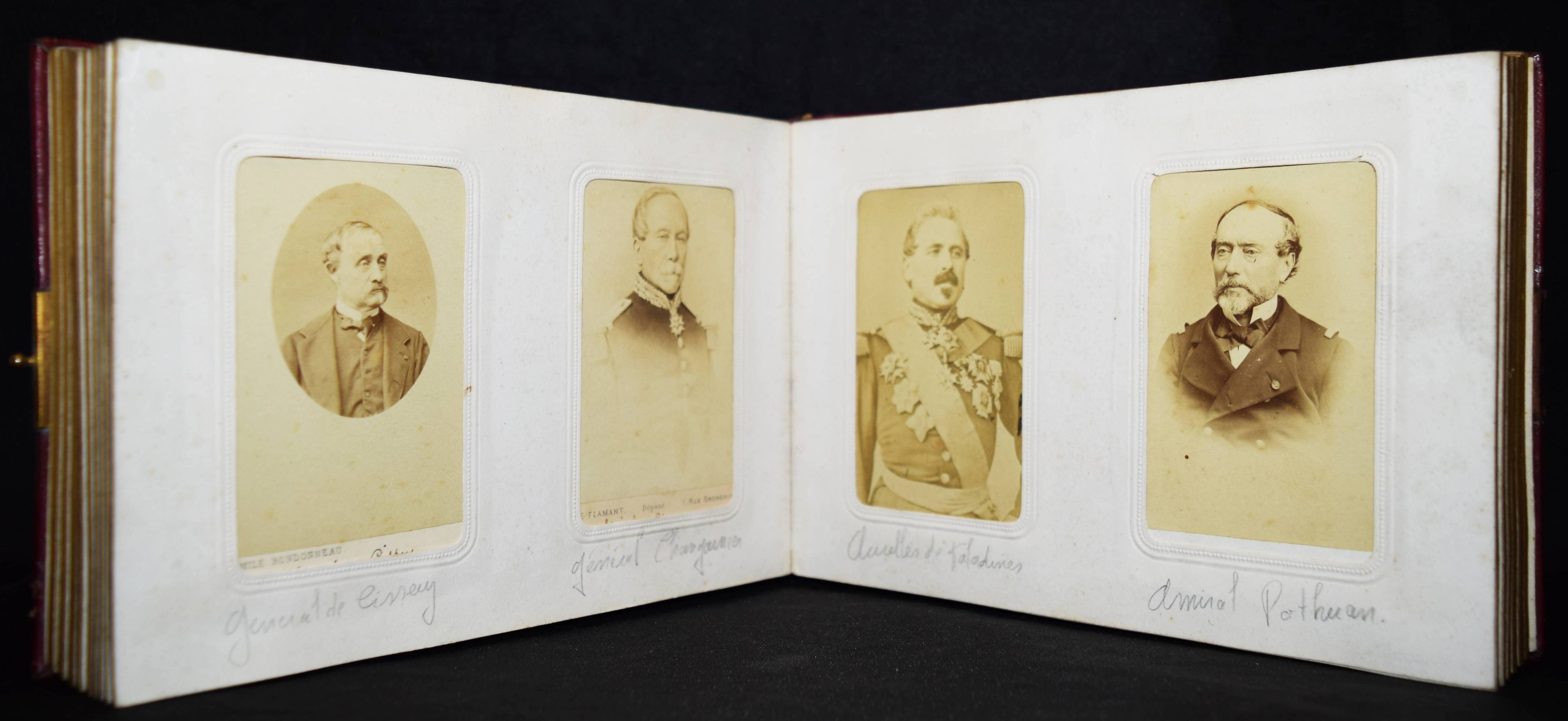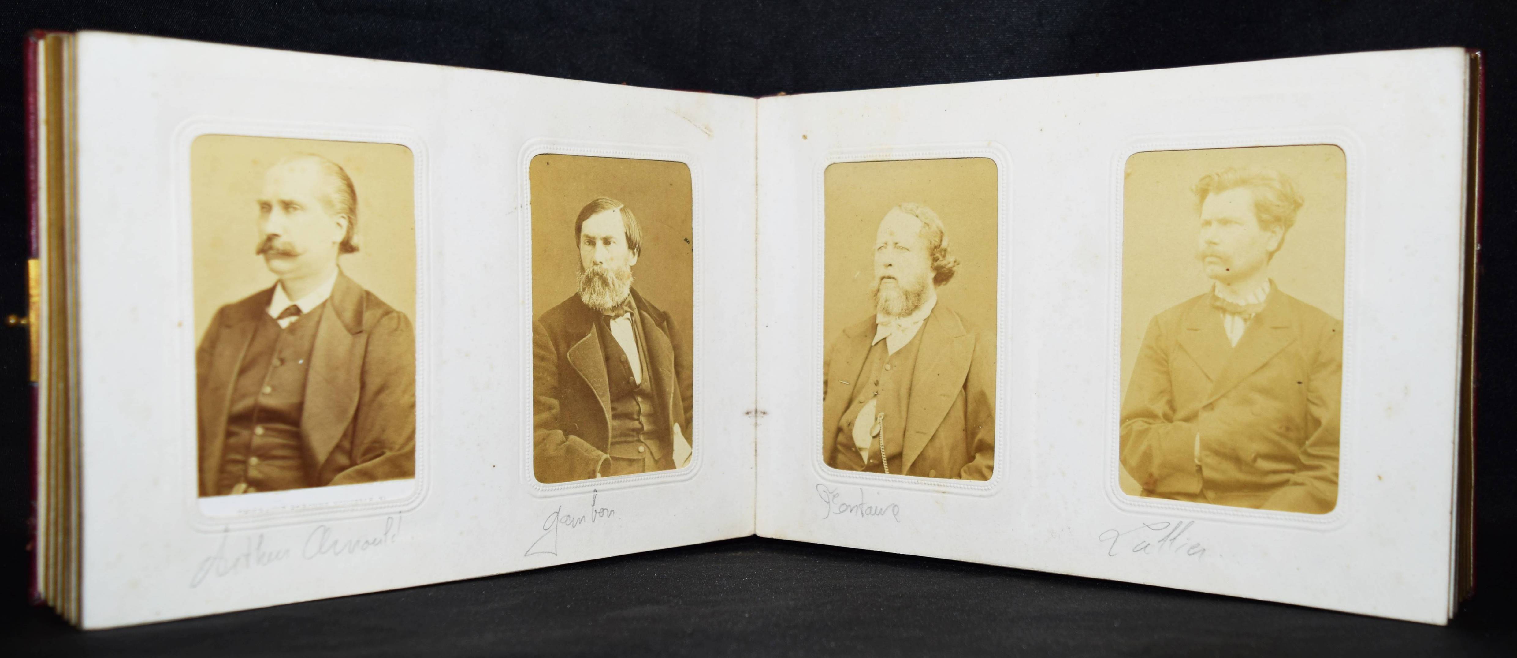 Pariser Kommune – Appert, Eugène u.a. Album mit 51 Orig.-Photographien (Albumin-Abzüge). Meist Porträts von Akteuren der Pariser Kommune und des Deutsch-Französischen Krieges. Paris ca. 1871. Quer-8° (13 x 18,5 cm.). Weinrotes blindgepr. OLdr. mit Goldschnitt. Meist mit Bleistift auf dem Kartonblatt oder auf dem Trägerkarton verso bezeichnet, teils auch recto in Tinte. – Besonders interessant durch 13 Porträts von Eugène Appert (1830-1891), die Frauen auf der Seite der Kommune zeigen, meist sogenannte „pétroleuses“, denen vorgeworfen wurden, während der Kämpfe in Paris Gebäude in Brand gesteckt zu haben. – „After the rebellion, Appert took the portraits of hundreds of the individual communards while imprisoned in jail. He was not assigned this job by the authorities, but took the initiative upon himself to do this, which also happened to have a commercial motive. Indeed, his photographs where eagerly puchased and reproduced once and again. The police also benefited from his images by including them in their card indexes“ (Hannavy 55). – Enthält eine Fotografie der berühmten Louise Michel (1830-1905), „maitresse de Ferré“,außerdem u. a. Hortense David, Clara Fournier, Marie Leroy, „maitresse d’Urbain“ (2 verschiedene Fotografien), Eulalie Papavoine, Elisabeth Retiffe, „condemnée à mort“ und „Anna pétroleuse“ (d. i. Léontine Suetens). Unter den männlichen Abgebildeten sind u.a. Fotografien der Kommunarden Frédéric Cournet, Napoléon Gaillard, Charles Ferdinand Gambon, Félix Pyat und Auguste Vermorel enthalten, außerdem Porträts der Generäle Louis d’Aurelle de Paladines und Félix Charles Douay und des Admirals Louis Pierre Alexis Pothuau. 5 Fotografien zeigen teils zerstörte Gebäude (eines „Maison Miller“, Rue St. Denis lose beiliegend). Außerdem 9 Fotografien nach Gemälden oder Lithographien. – Einband etwas angestaubt, berieben und fleckig, Messingschließe fehlt, Unterlagekartons stellenw. etwas fleckig, Fotografien kaum, Einstecktaschen vereinzelt etwas eingerissen. – Dazu: Edith Thomas. Les „Pétroleuses“. Paris, Gallimard (1963). 288 S., 4 Bl. Illustr. OKart.