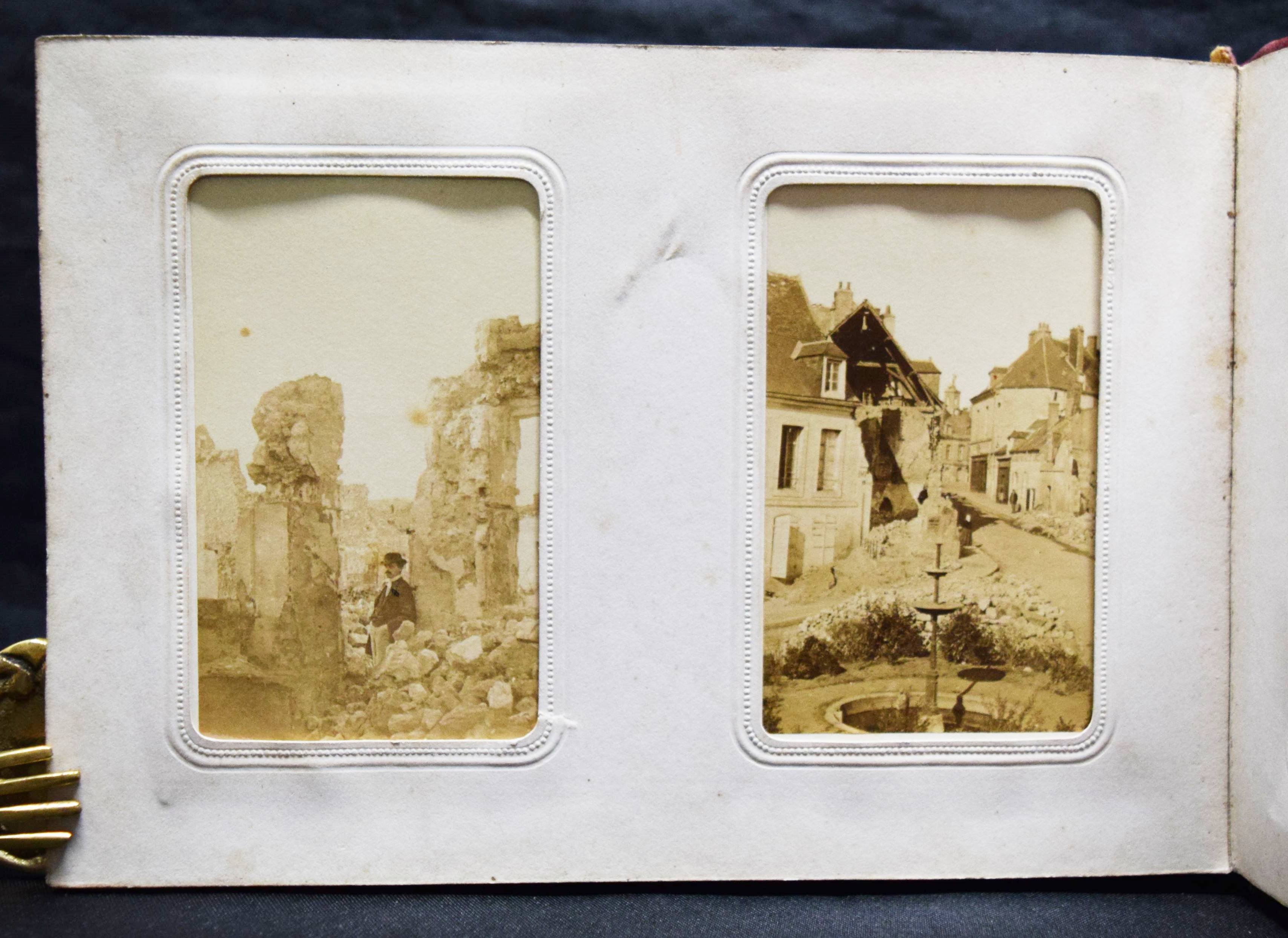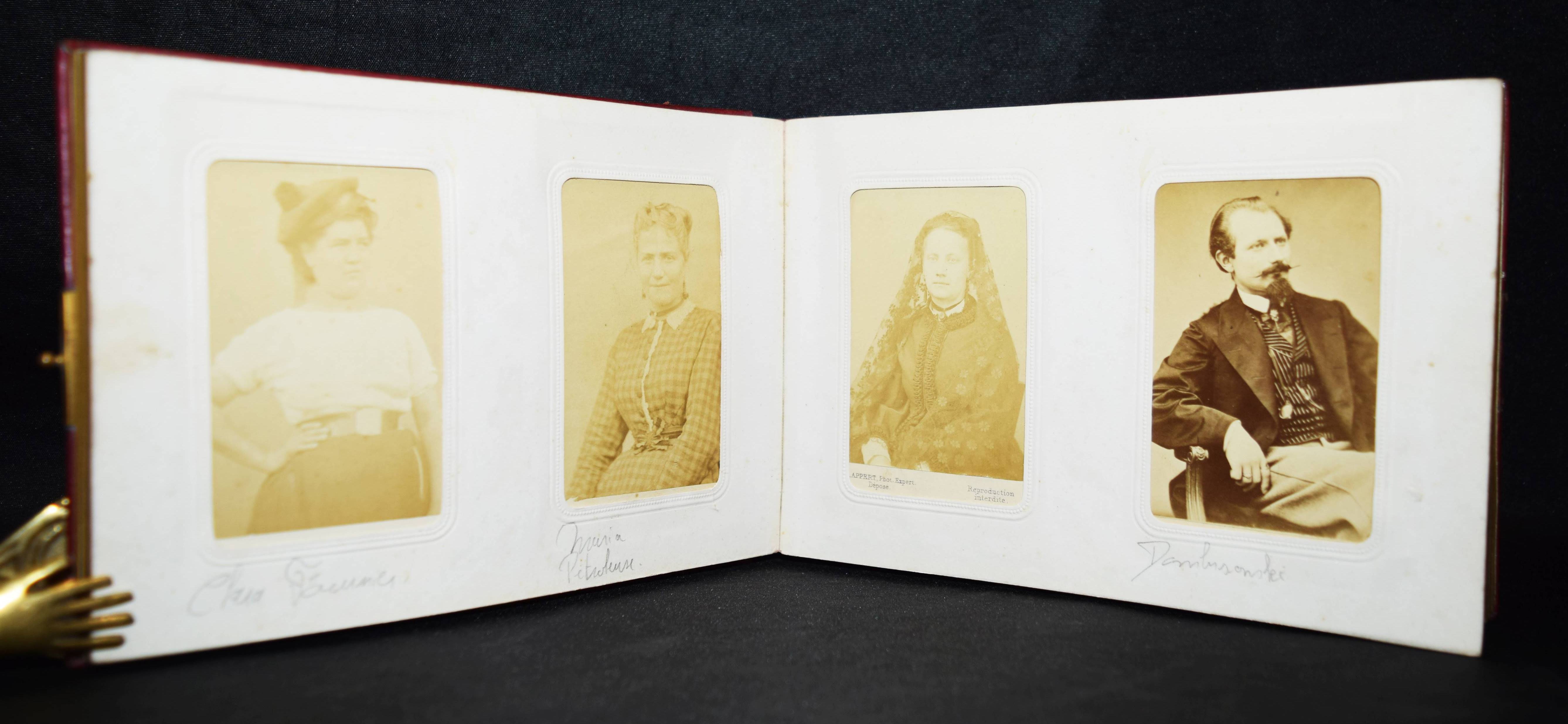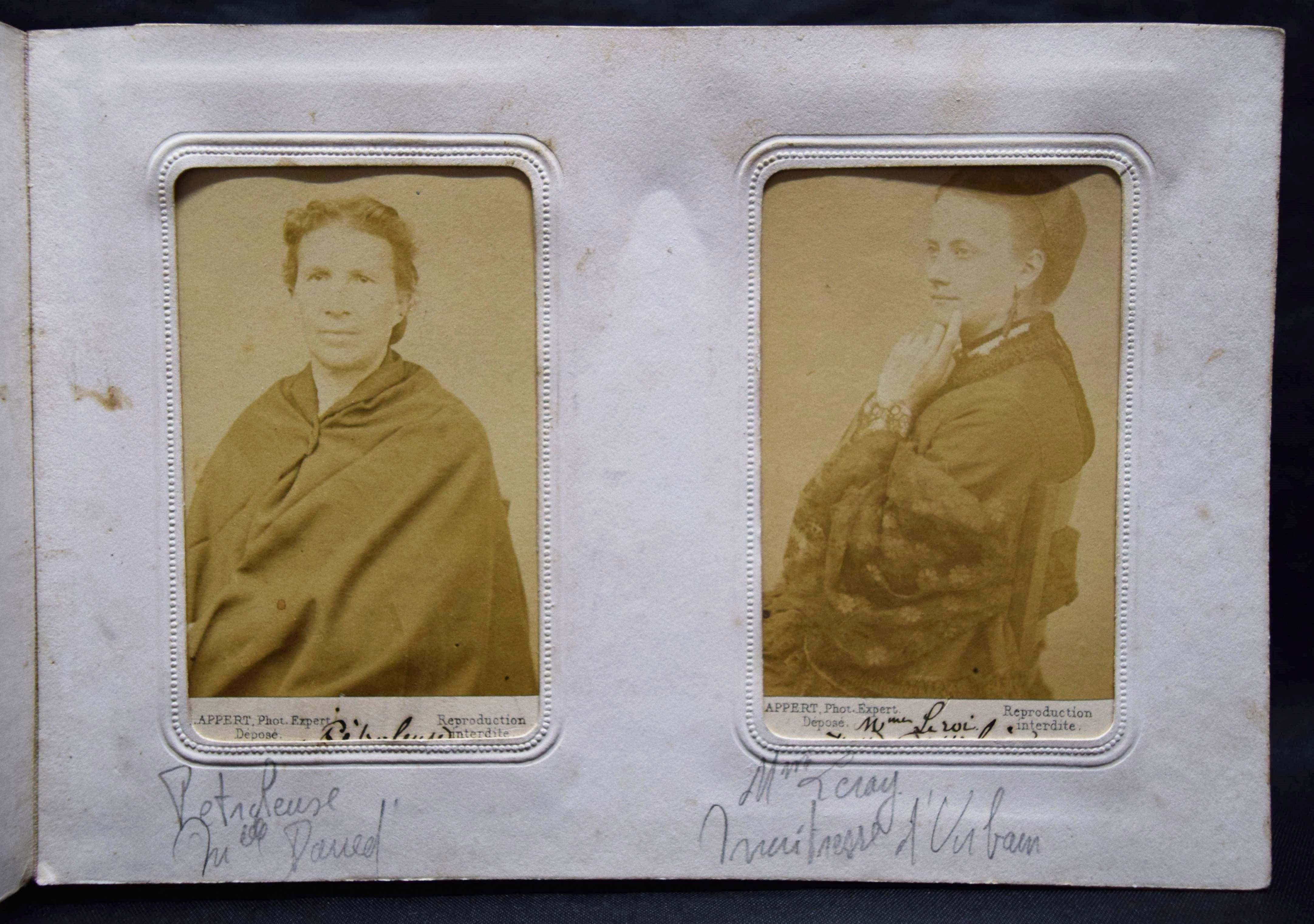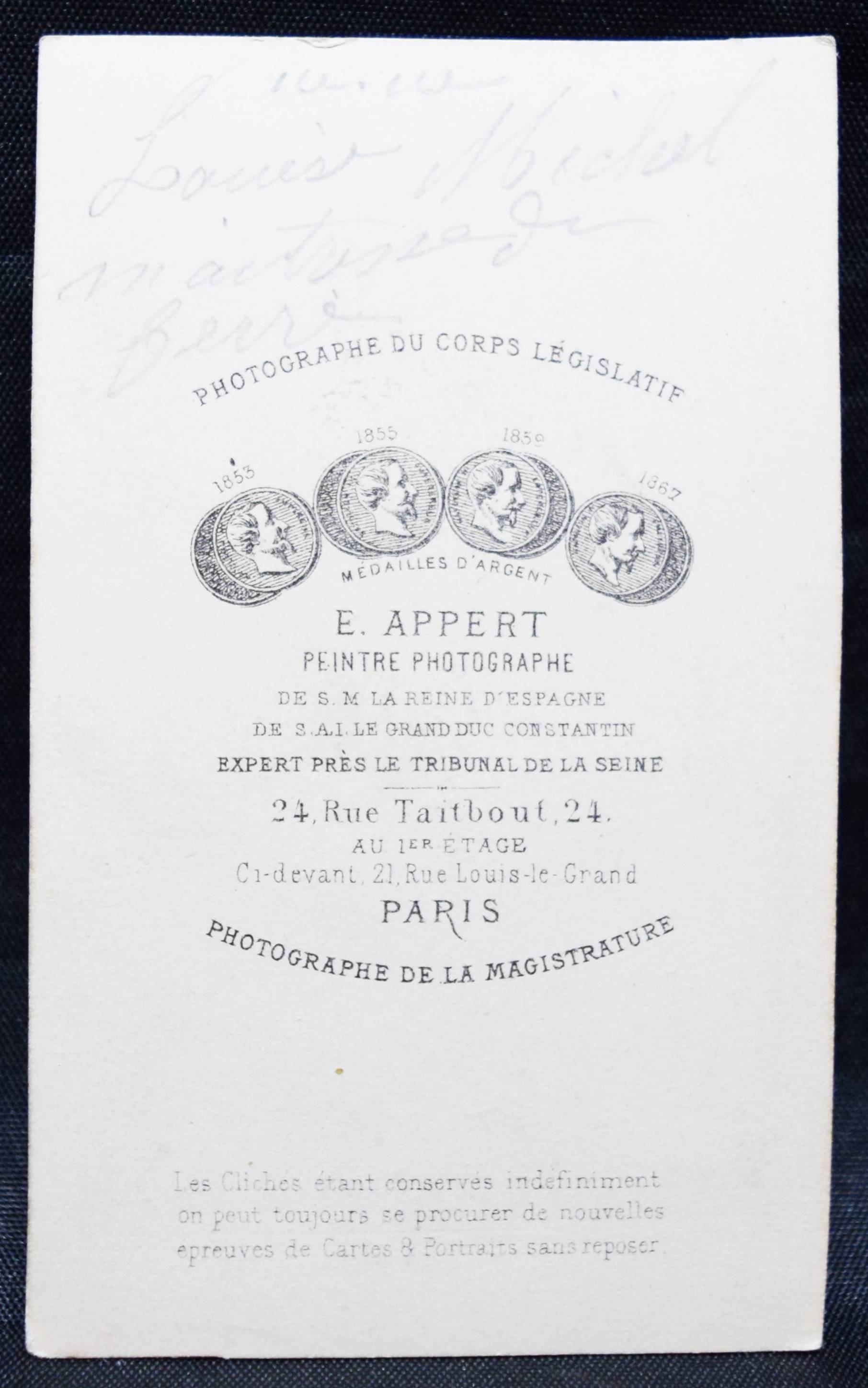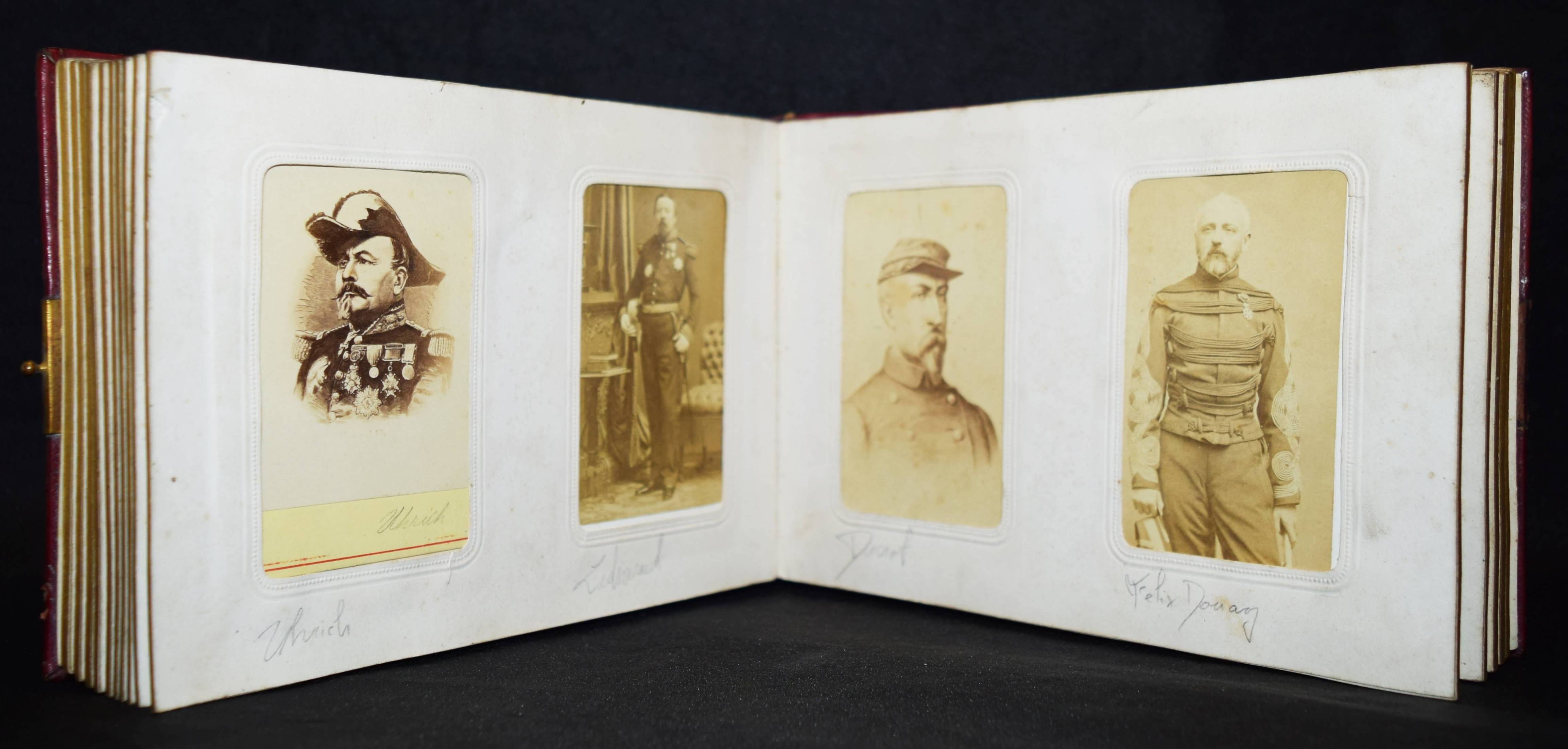 Pariser Kommune – Appert, Eugène u.a. Album mit 51 Orig.-Photographien (Albumin-Abzüge). Meist Porträts von Akteuren der Pariser Kommune und des Deutsch-Französischen Krieges. Paris ca. 1871. Quer-8° (13 x 18,5 cm.). Weinrotes blindgepr. OLdr. mit Goldschnitt. Meist mit Bleistift auf dem Kartonblatt oder auf dem Trägerkarton verso bezeichnet, teils auch recto in Tinte. – Besonders interessant durch 13 Porträts von Eugène Appert (1830-1891), die Frauen auf der Seite der Kommune zeigen, meist sogenannte „pétroleuses“, denen vorgeworfen wurden, während der Kämpfe in Paris Gebäude in Brand gesteckt zu haben. – „After the rebellion, Appert took the portraits of hundreds of the individual communards while imprisoned in jail. He was not assigned this job by the authorities, but took the initiative upon himself to do this, which also happened to have a commercial motive. Indeed, his photographs where eagerly puchased and reproduced once and again. The police also benefited from his images by including them in their card indexes“ (Hannavy 55). – Enthält eine Fotografie der berühmten Louise Michel (1830-1905), „maitresse de Ferré“,außerdem u. a. Hortense David, Clara Fournier, Marie Leroy, „maitresse d’Urbain“ (2 verschiedene Fotografien), Eulalie Papavoine, Elisabeth Retiffe, „condemnée à mort“ und „Anna pétroleuse“ (d. i. Léontine Suetens). Unter den männlichen Abgebildeten sind u.a. Fotografien der Kommunarden Frédéric Cournet, Napoléon Gaillard, Charles Ferdinand Gambon, Félix Pyat und Auguste Vermorel enthalten, außerdem Porträts der Generäle Louis d’Aurelle de Paladines und Félix Charles Douay und des Admirals Louis Pierre Alexis Pothuau. 5 Fotografien zeigen teils zerstörte Gebäude (eines „Maison Miller“, Rue St. Denis lose beiliegend). Außerdem 9 Fotografien nach Gemälden oder Lithographien. – Einband etwas angestaubt, berieben und fleckig, Messingschließe fehlt, Unterlagekartons stellenw. etwas fleckig, Fotografien kaum, Einstecktaschen vereinzelt etwas eingerissen. – Dazu: Edith Thomas. Les „Pétroleuses“. Paris, Gallimard (1963). 288 S., 4 Bl. Illustr. OKart.