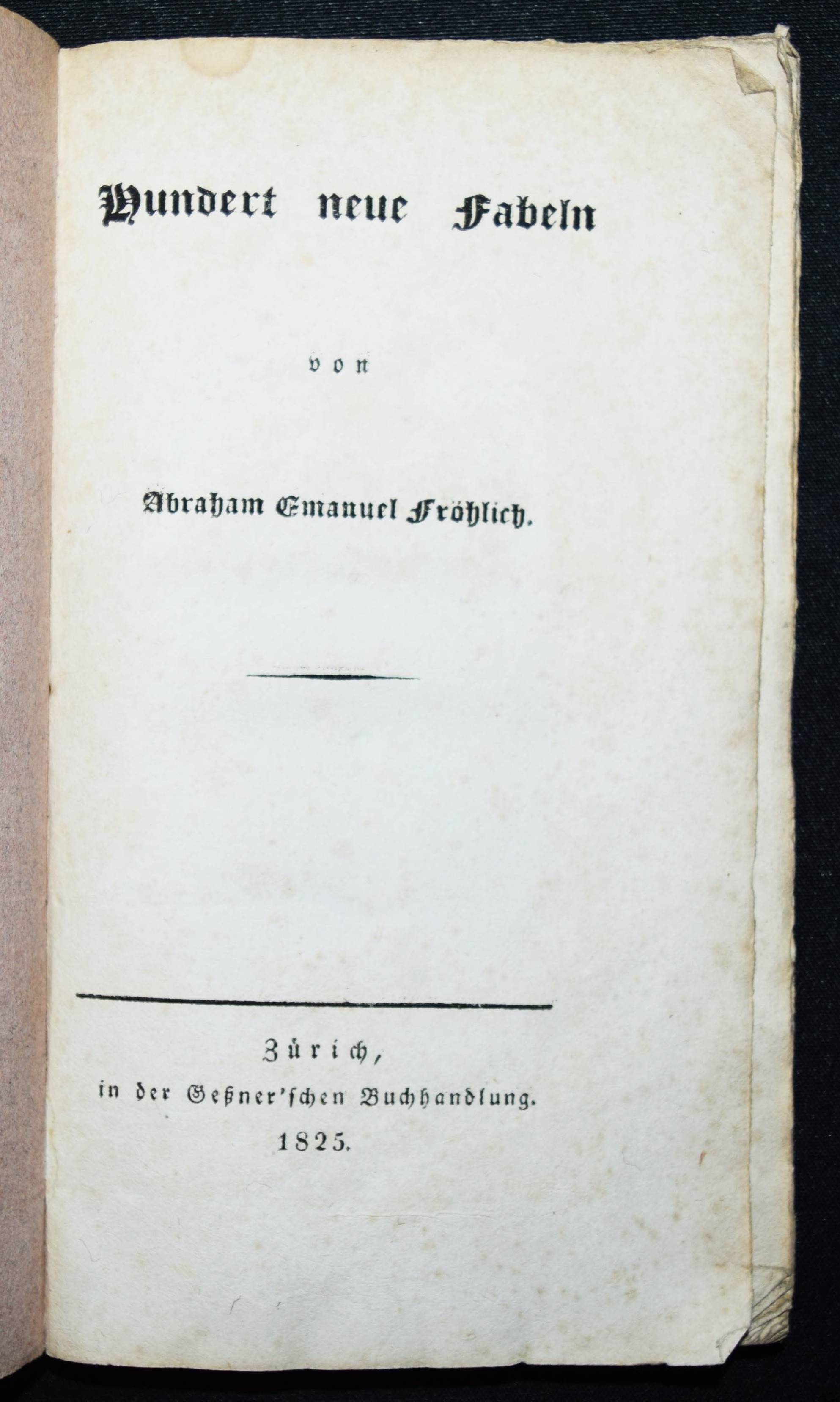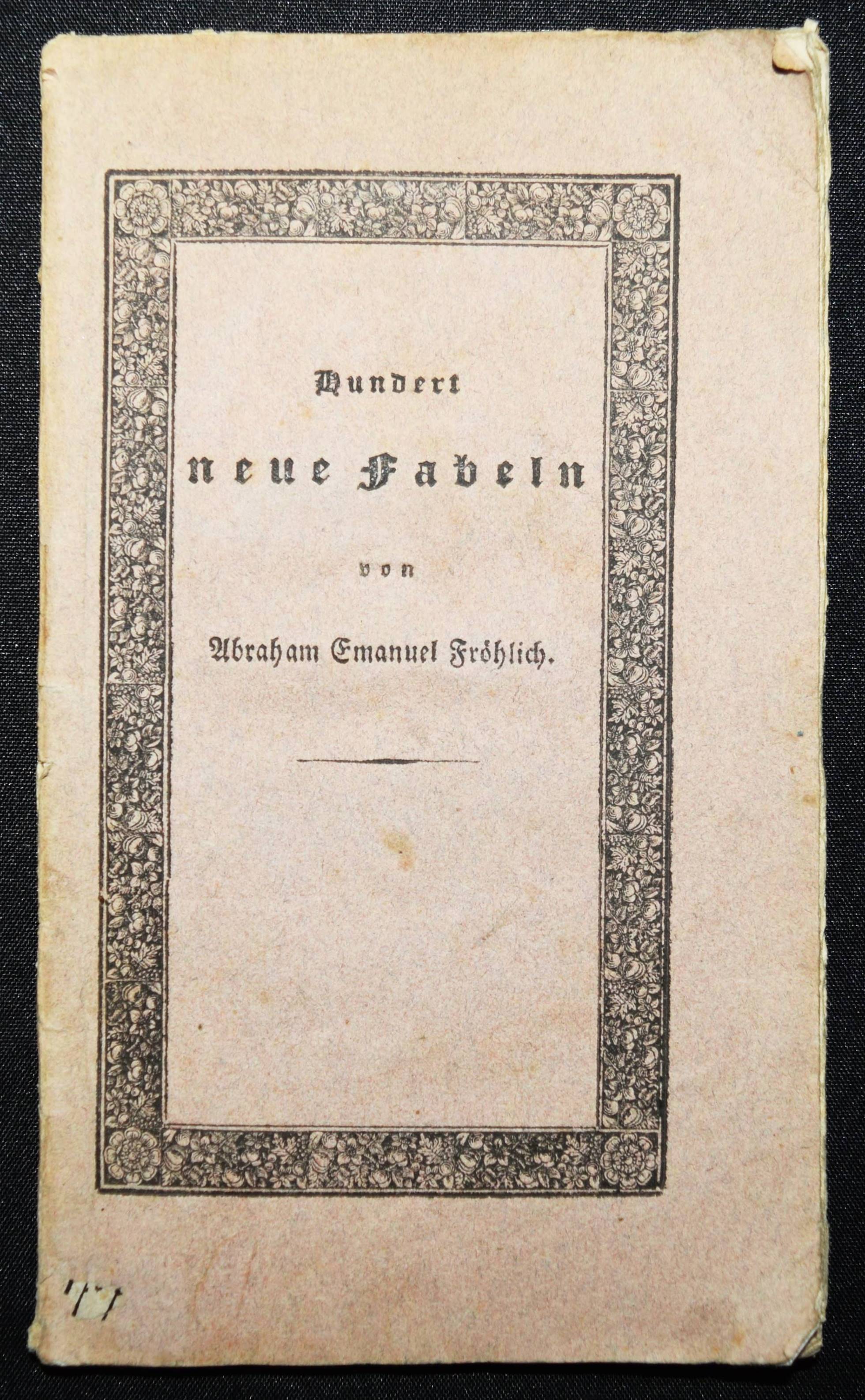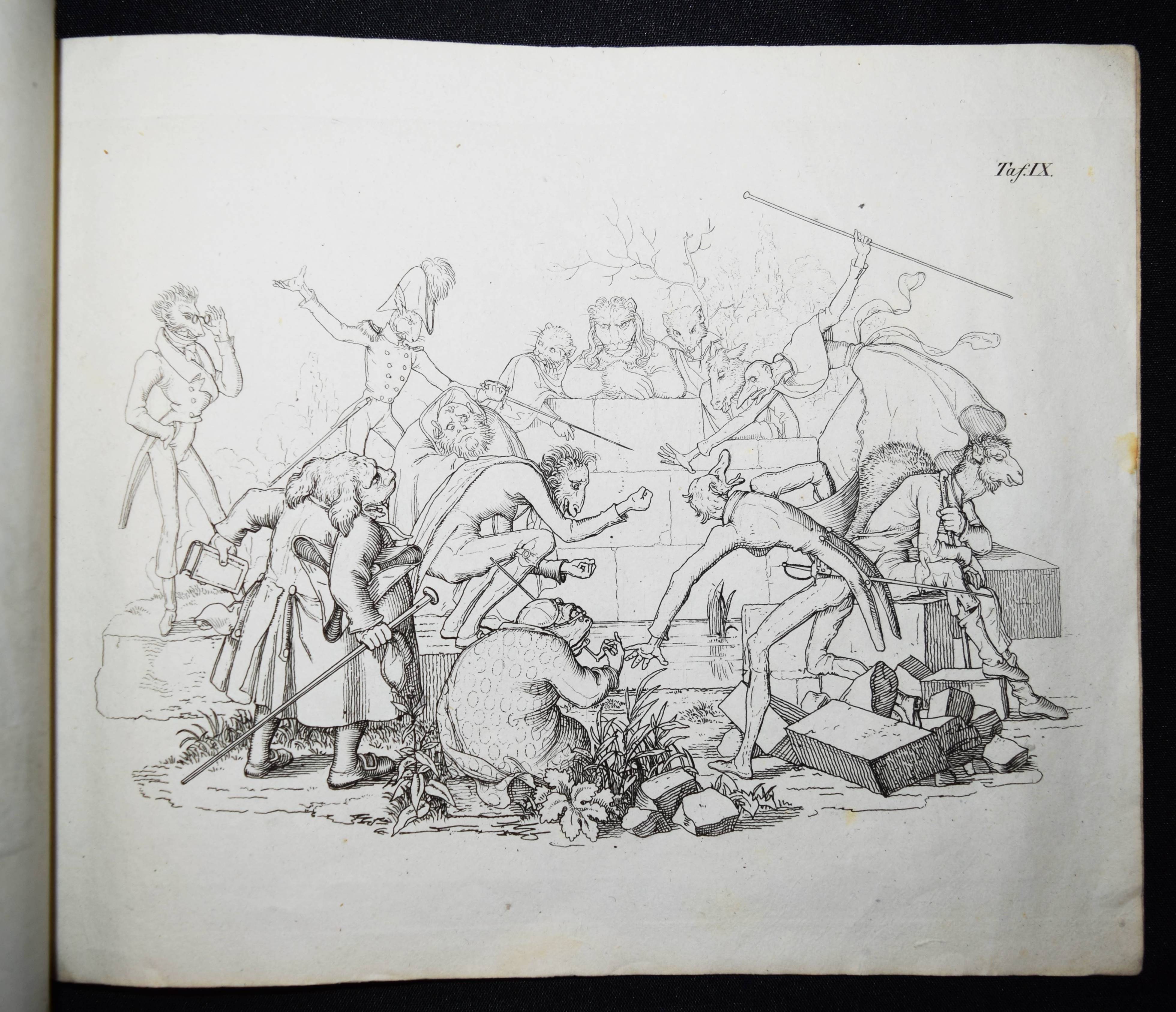 Fröhlich, Abraham Emanuel. Hundert neue Fabeln. (Und): M(artin) Distelli’s Umrisse zu A. E. Fröhlichs Fabeln. 2 Bände. Aarau, Sauerländer 1825 u. (1829). Kl.-8° u. Quer-8°. 104 S.; gestoch. illustr. Titel u. 9 Kupfer-Tafeln. Typogr. OBr. Bodemann 266.1. Rümann 328. – Erste Ausgabe, mit den skurrilen Umrisskupfern von Martin Disteli (1802-1844). – „Frisch nach dem Leben gezeichnet und ohne aufdringliche Hervorhebung der Moral wie um ihrer selbst willen da, begründeten sie mit einem Schlage ihres Dichters Ruf. Eine zweite vermehrte Auflage (1829) begleitete der bekannte Martin Disteli aus Olten mit einem Hefte kecker satirischer Umrisse“ (ADB VIII, 131). – Die Radierungen „entstanden seit ca. 1828… witzig-lebendige, karikierende Darstellungen von Tiergruppen in menschlichen Kostümen bzw. Uniformen und politisch-gesellschaftlich akzentuierten Situationen“ (U. Bodemann). – Umschlag des Textbandes etwas fleckig, Text teils stärker stockfleckig, der Tafelband sauber und sehr gut erhalten.